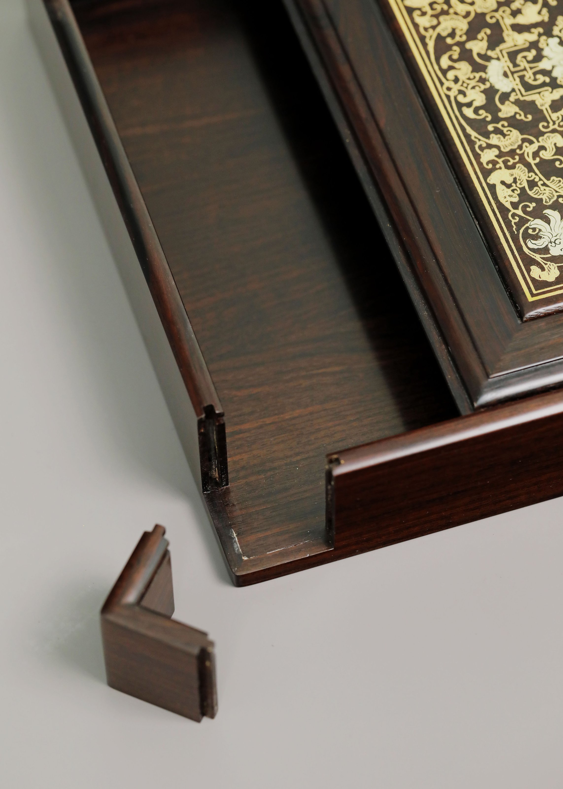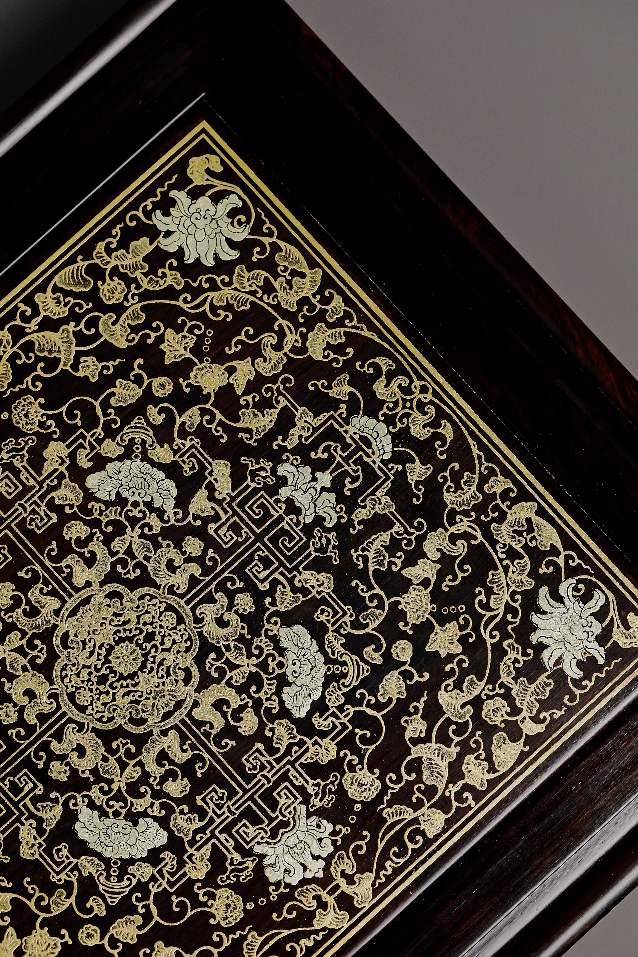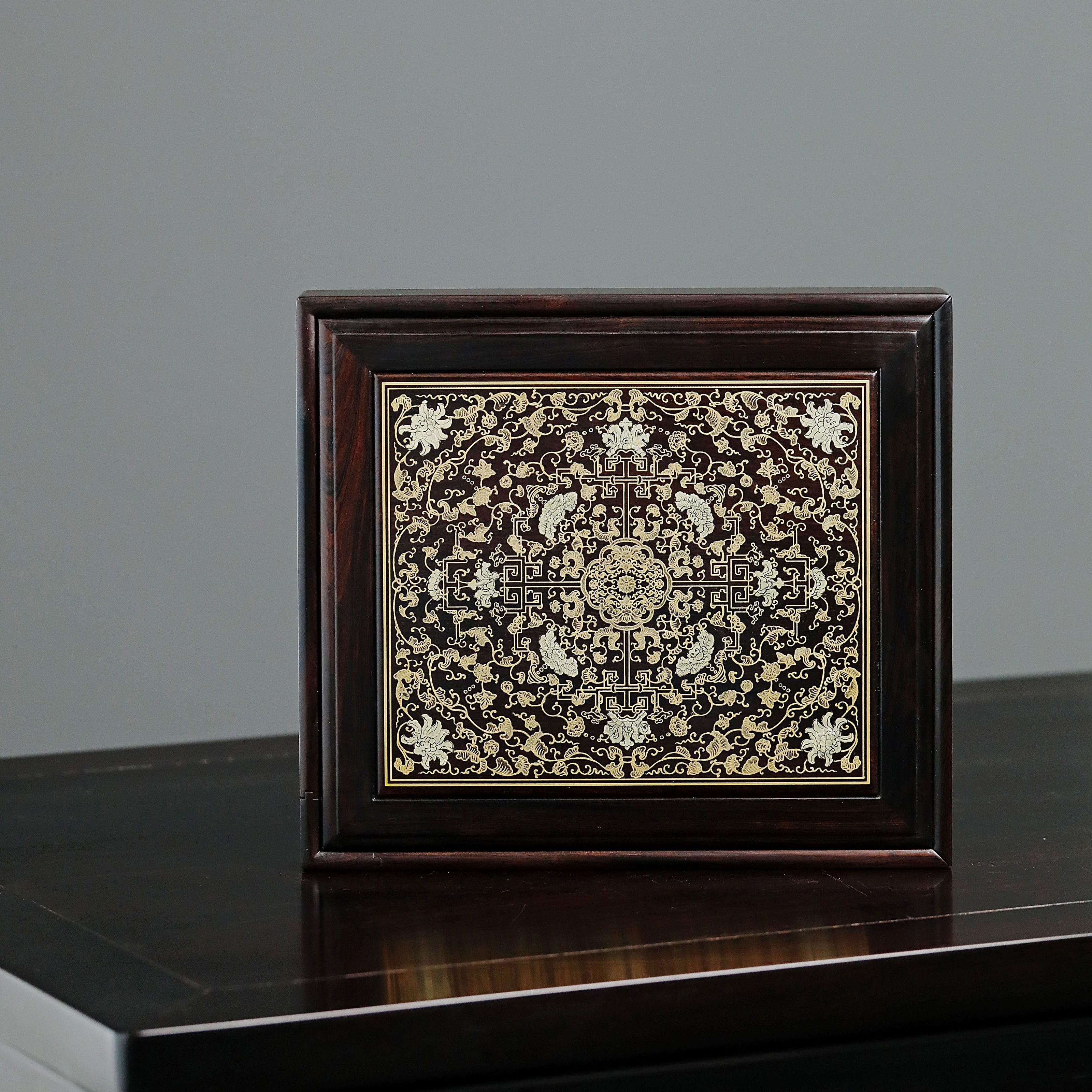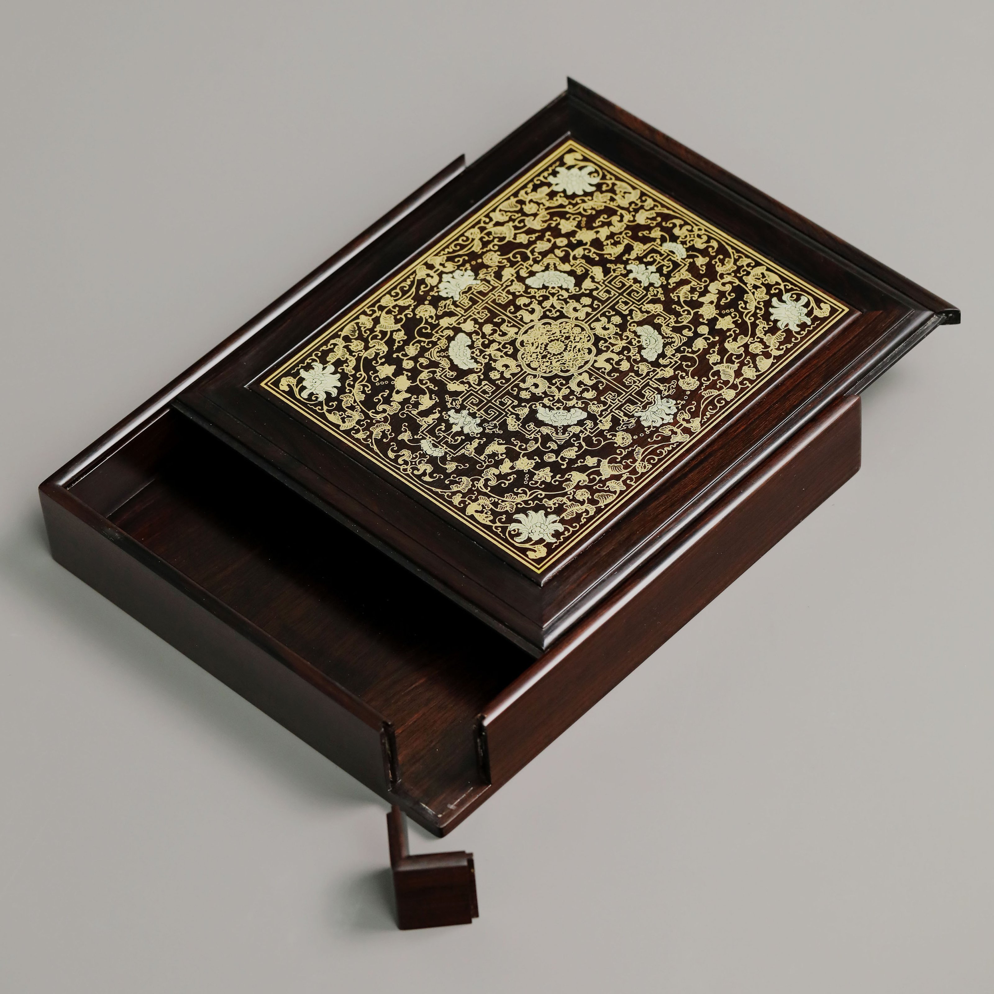 长:26cm 宽:23cm 高:5cm 紫光檀 普洱茶盒抽拉式描金工艺 茶盒规制方形,东非黑黄檀老料制,东非黑黄檀又称紫光檀,色泽沉稳静穆,盖面描金以绘缠枝莲宝相花之精彩图案。整器榫卯结构严谨,盖面可从一侧抽出,转角开口,方便分茶,专设边槽,存放茶刀,设计精妙,匠心之作。