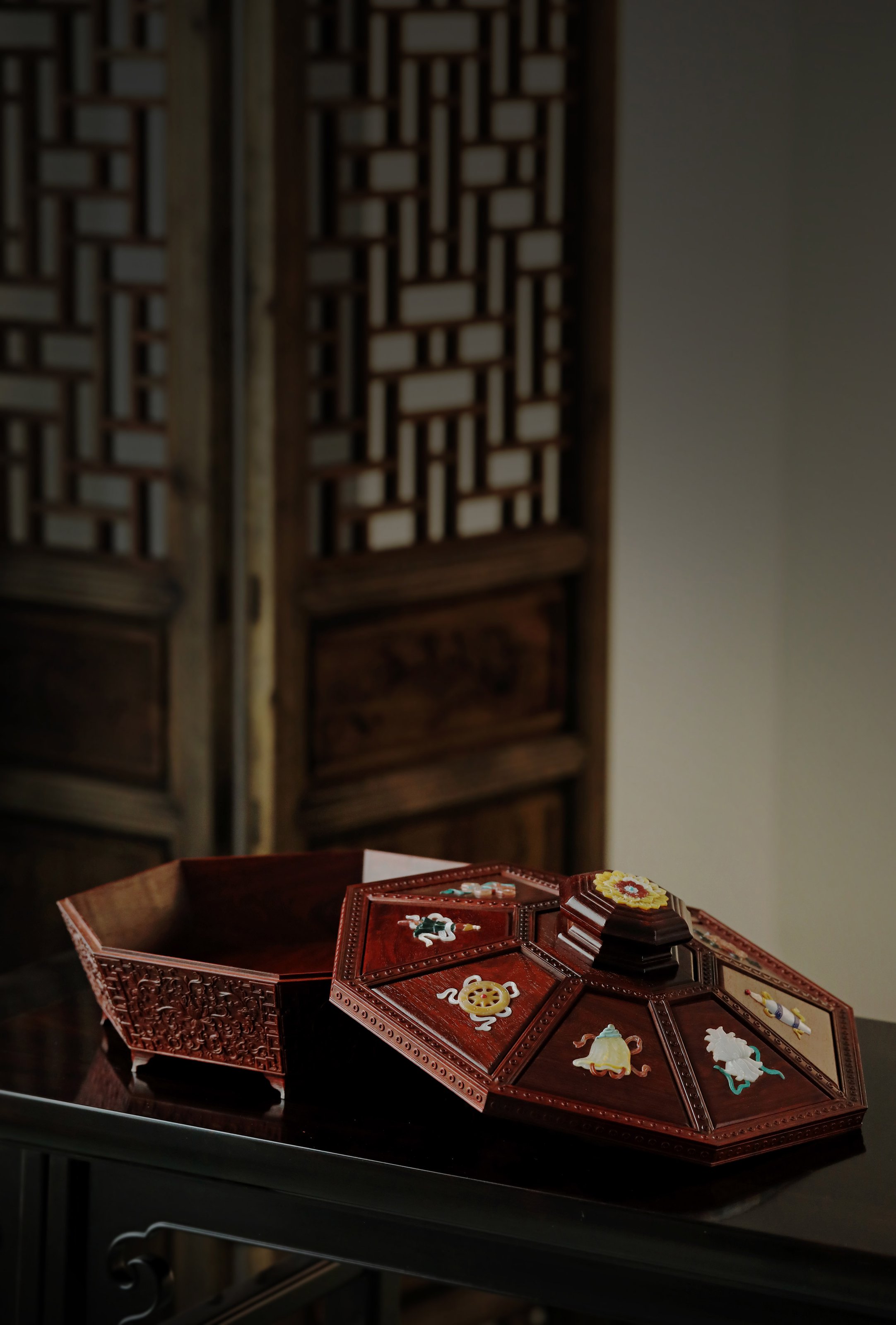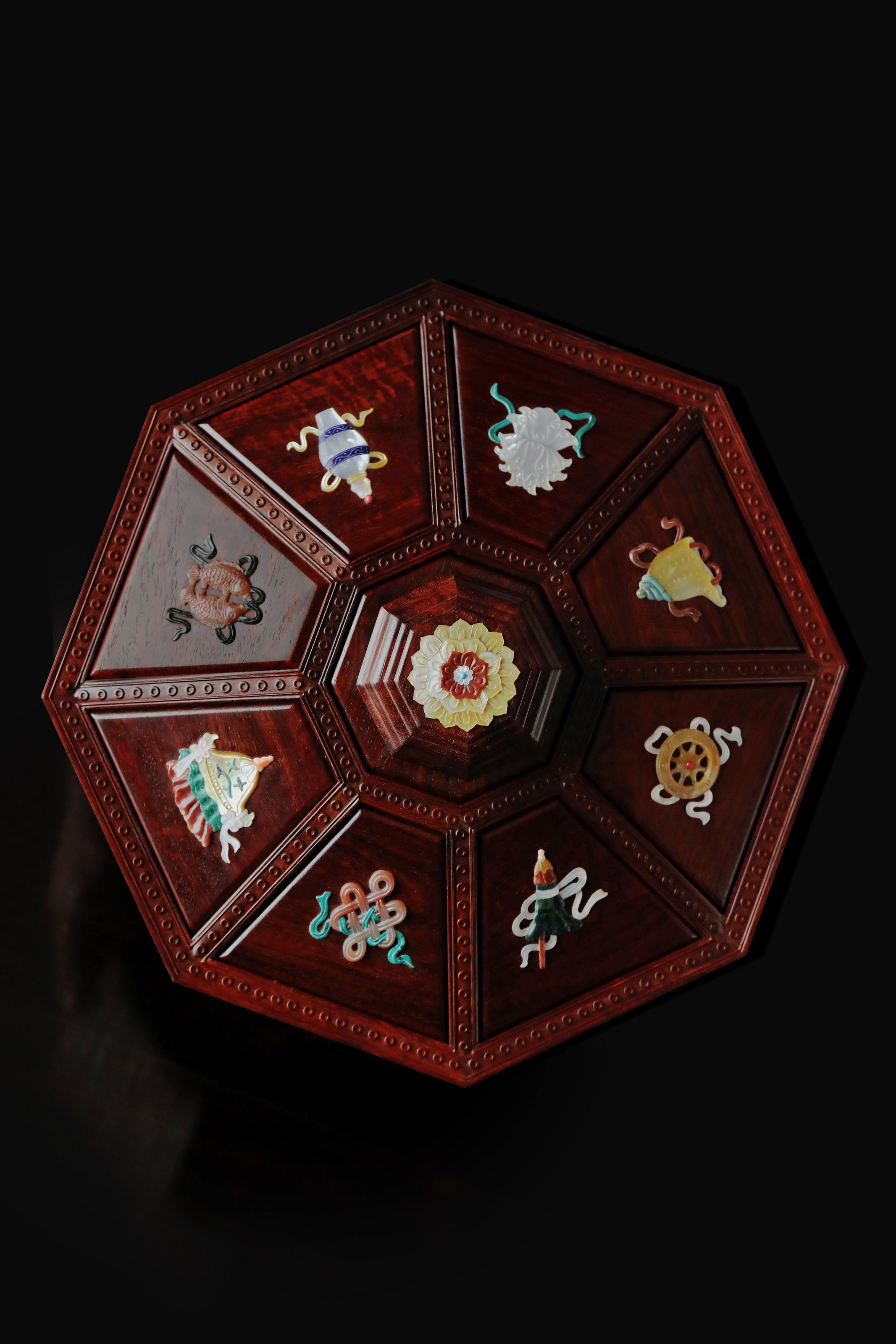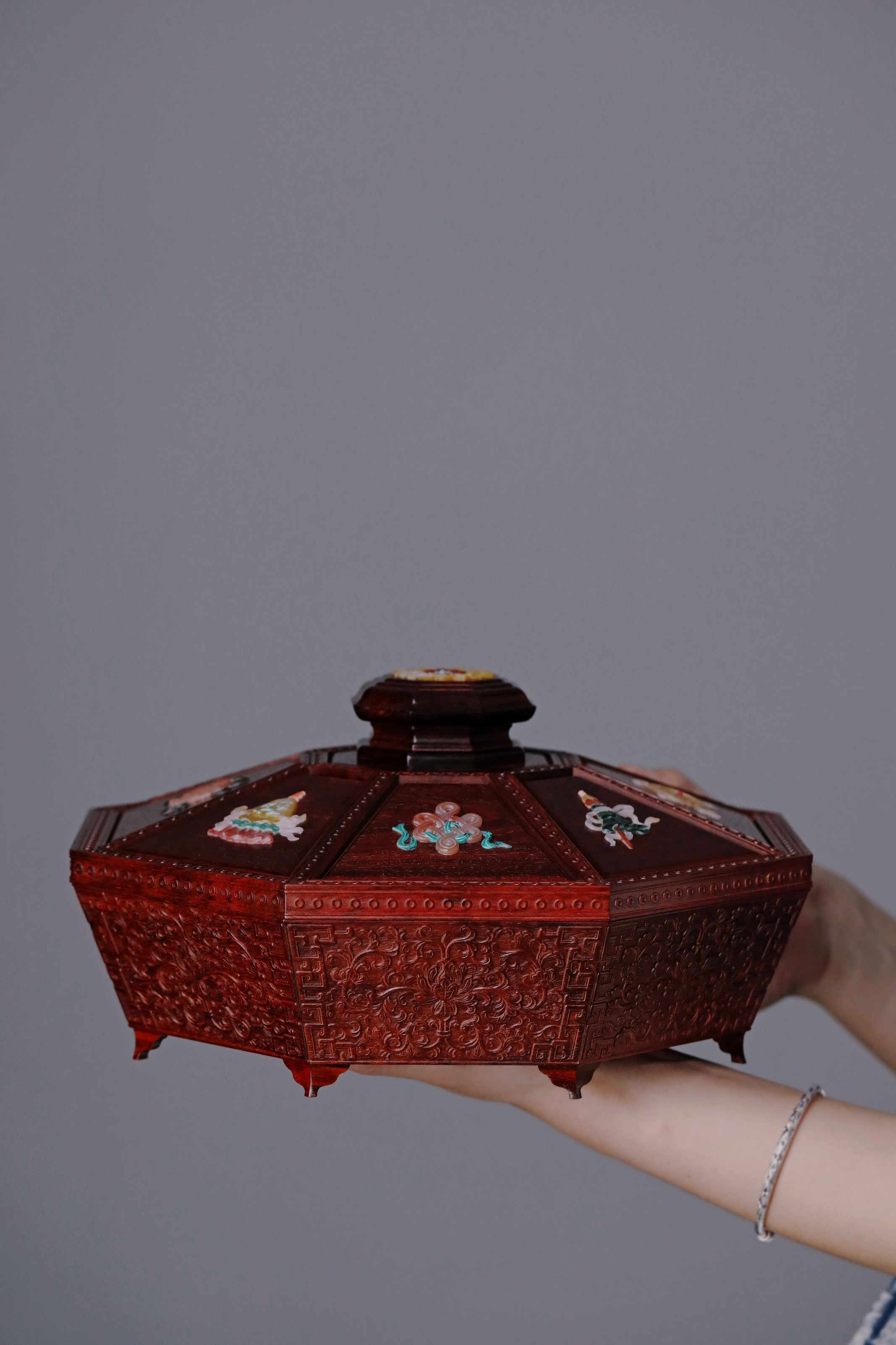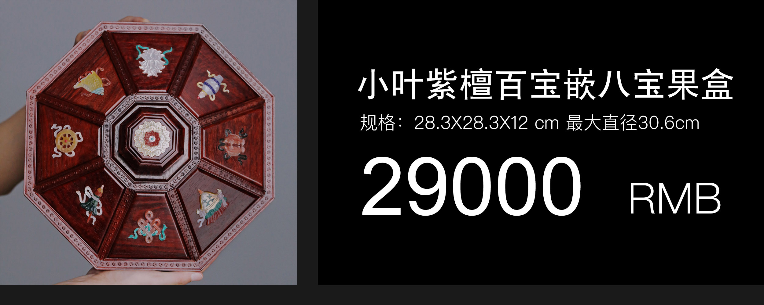 小叶紫檀百宝嵌 八宝果盒 小叶紫檀百宝嵌 八宝果盒 规格:28.3X28.3X12 cm 最大直径30.6cm 盒为八角形,盒盖螺钿八宝吉祥纹样,环绕福寿佳果,色彩斑斓, 绚丽多彩; 身侧满雕西番莲纹,整体纹理寓意多福 多寿 多子,寄愿美好期盼。