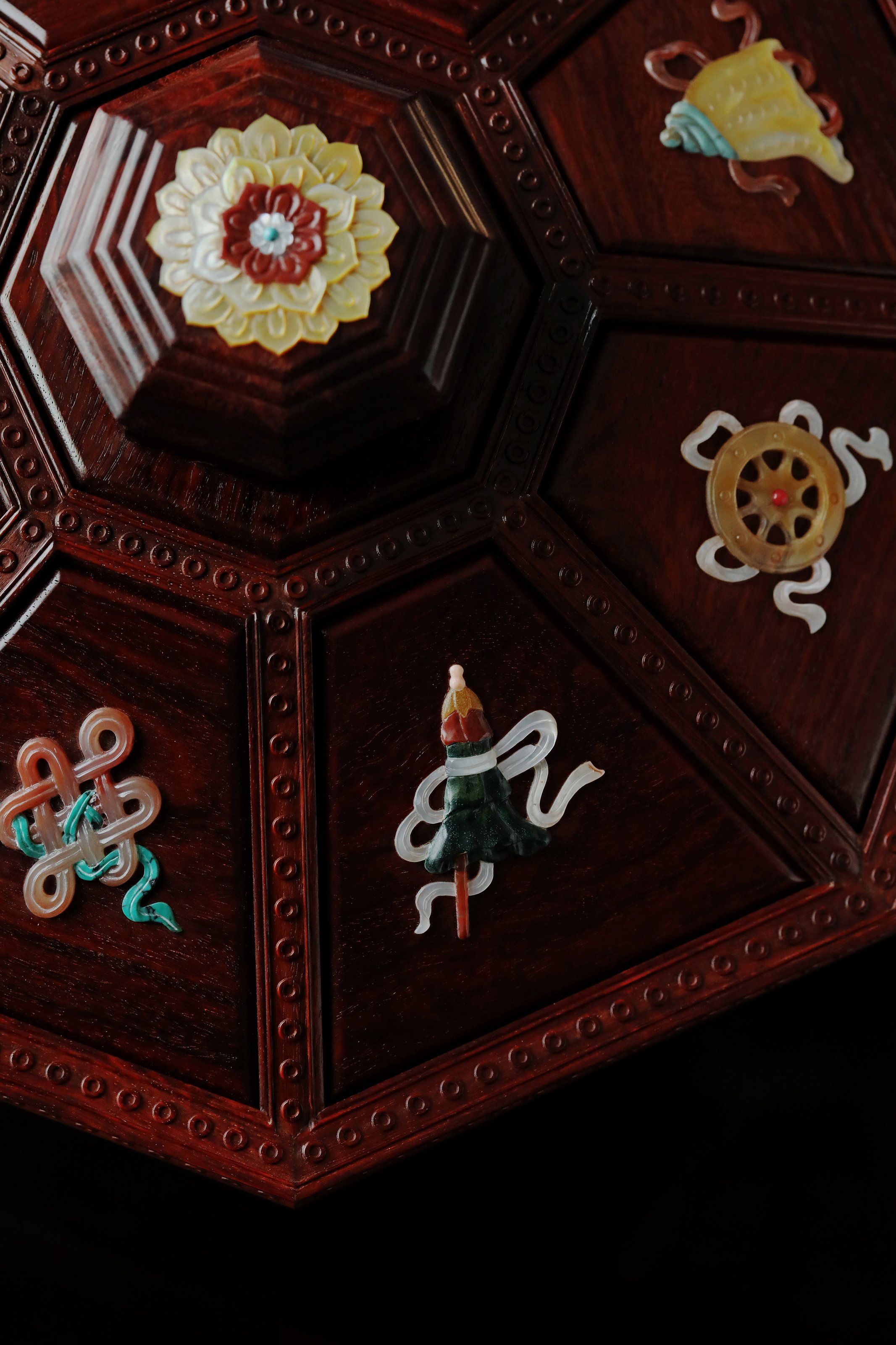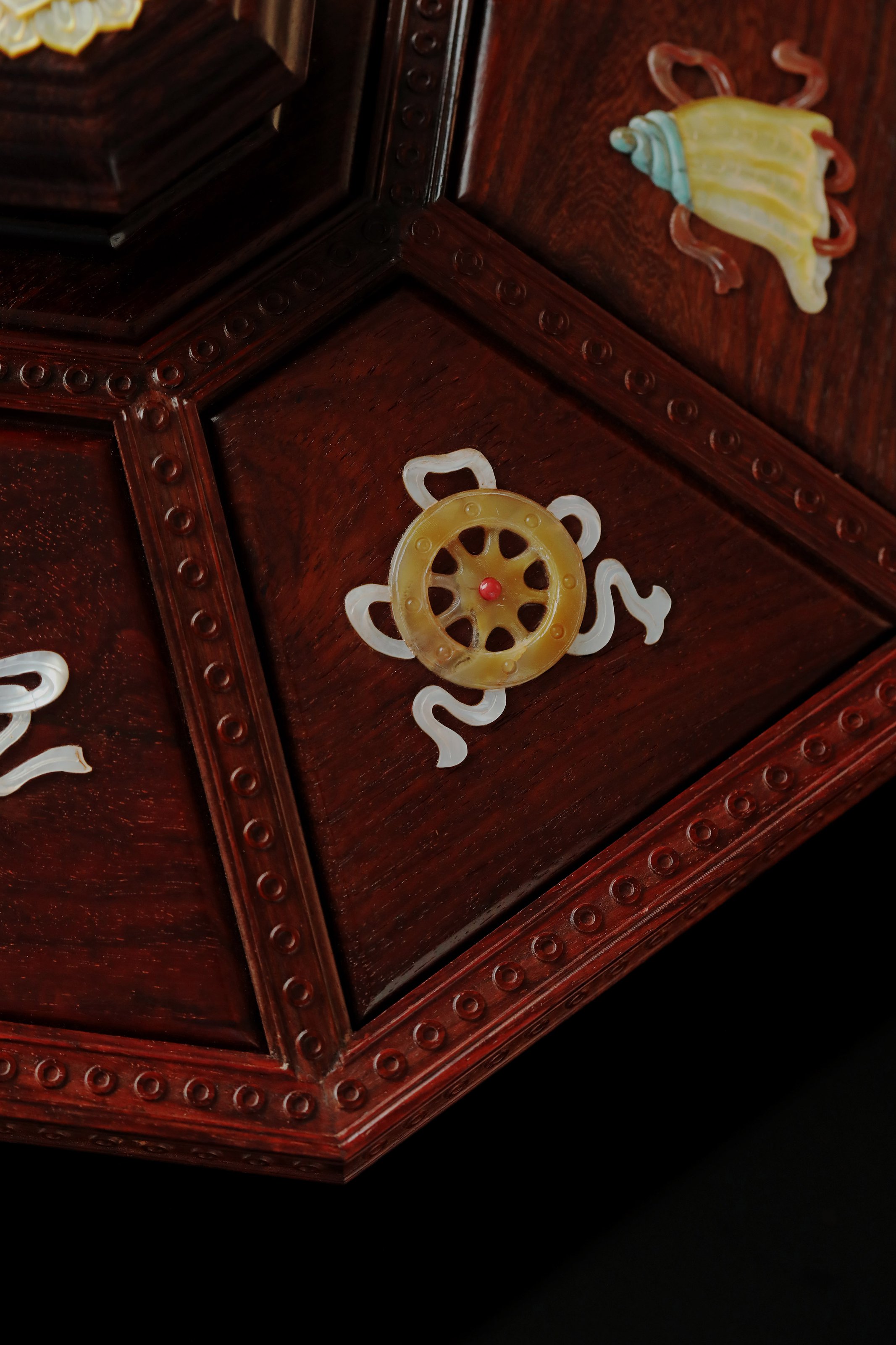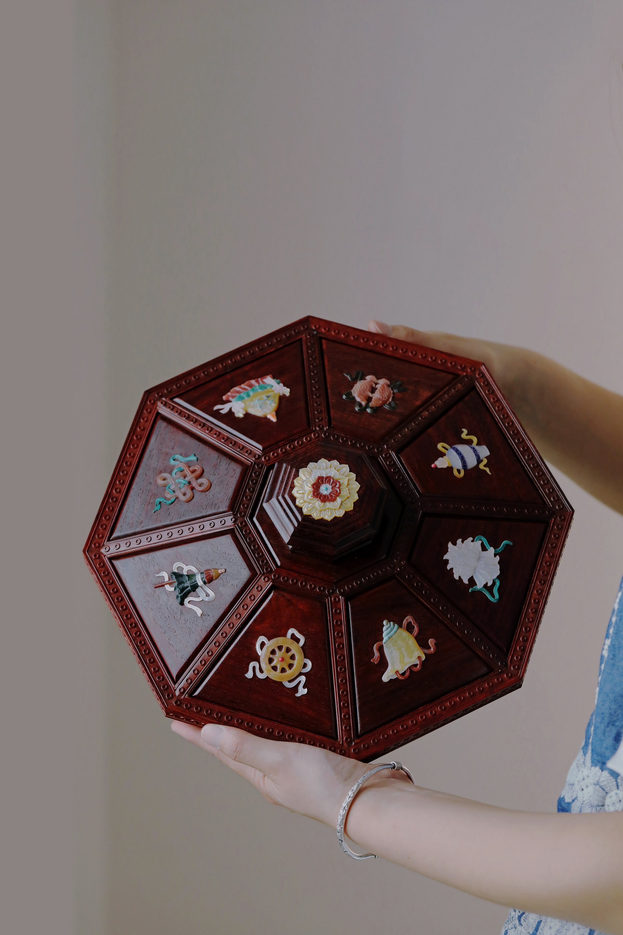 小叶紫檀百宝嵌 八宝果盒 小叶紫檀百宝嵌 八宝果盒 规格:28.3X28.3X12 cm 最大直径30.6cm 盒为八角形,盒盖螺钿八宝吉祥纹样,环绕福寿佳果,色彩斑斓, 绚丽多彩; 身侧满雕西番莲纹,整体纹理寓意多福 多寿 多子,寄愿美好期盼。