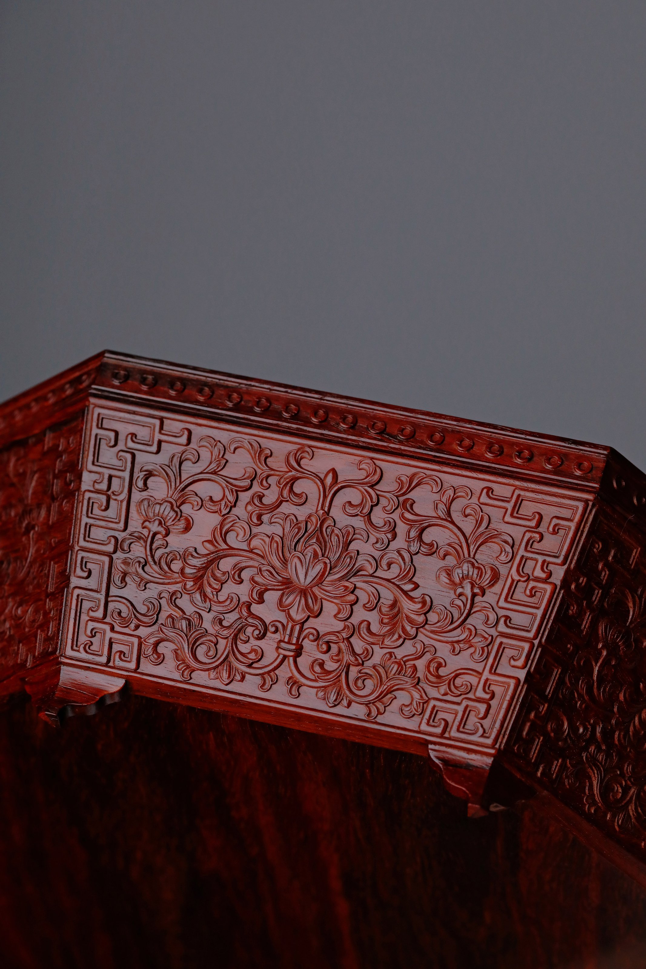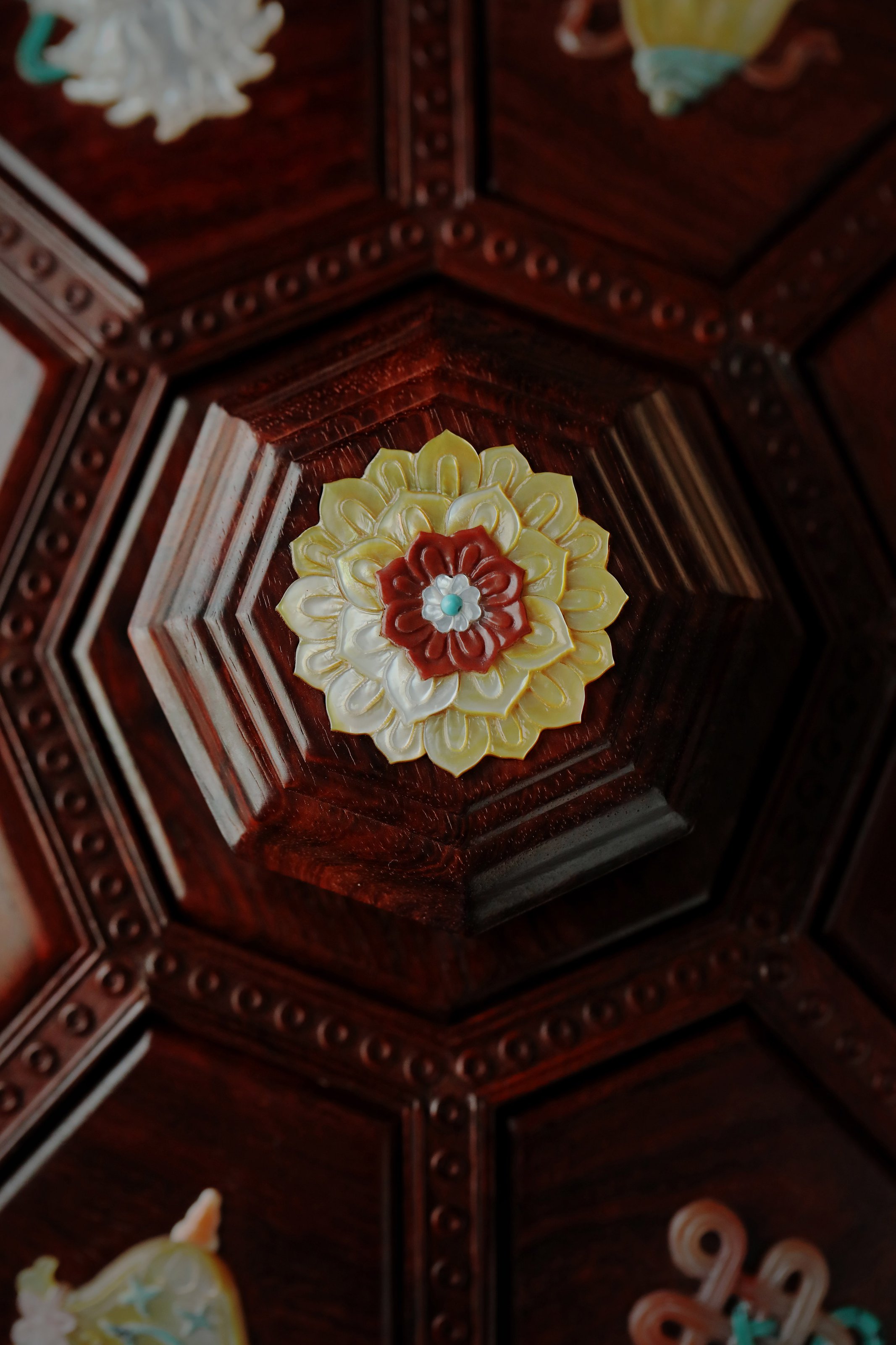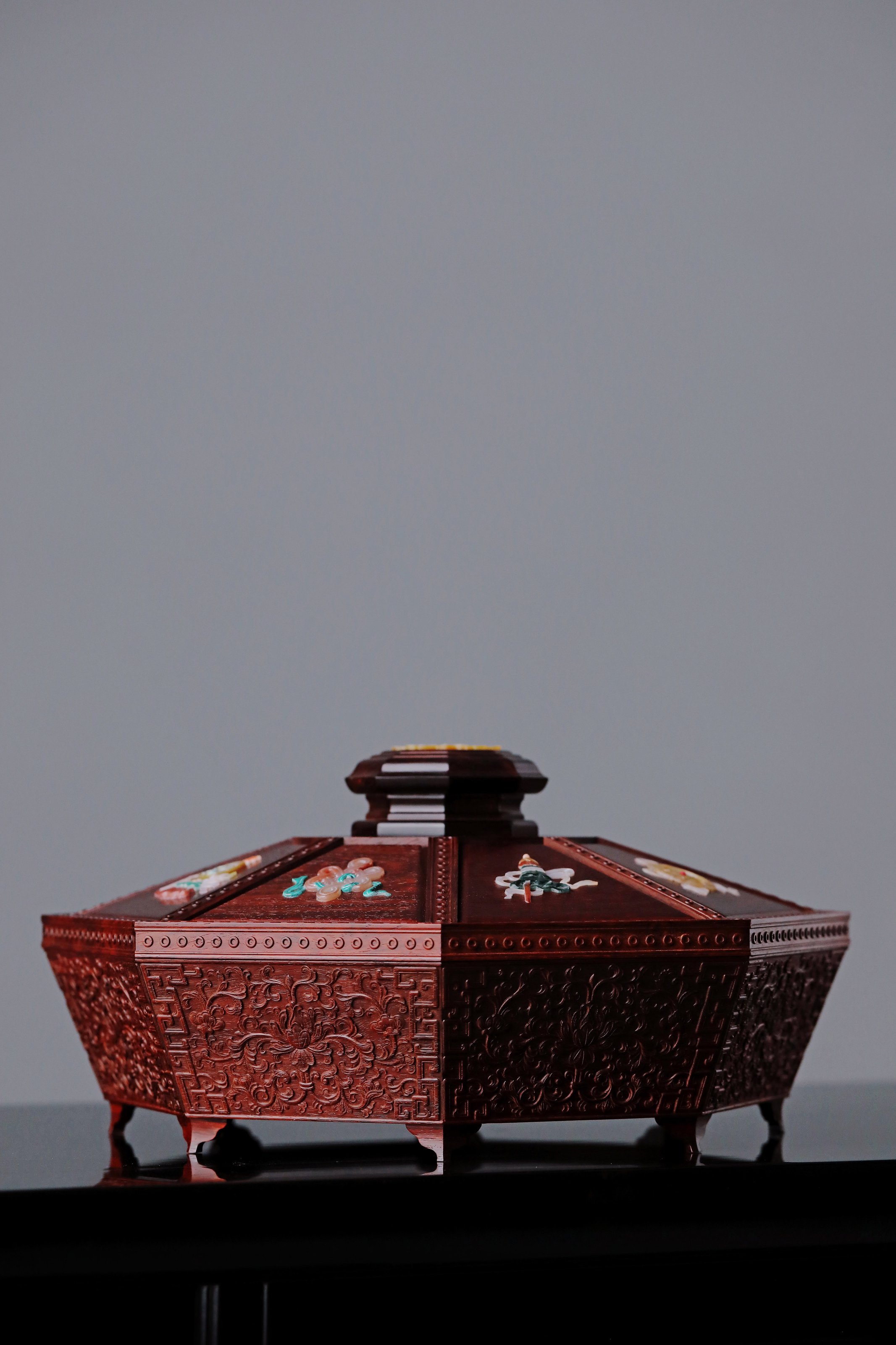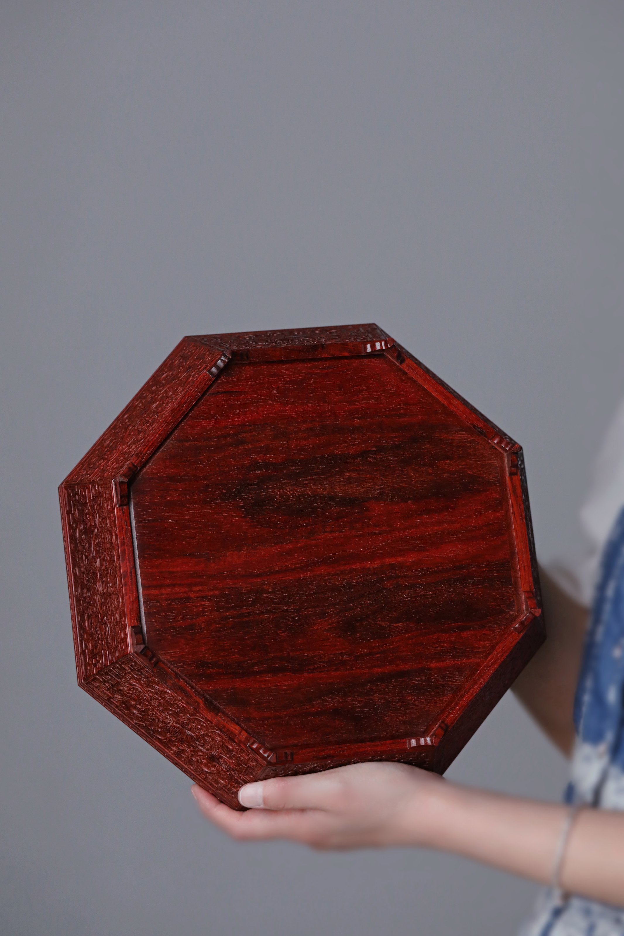 小叶紫檀百宝嵌 八宝果盒 小叶紫檀百宝嵌 八宝果盒 规格:28.3X28.3X12 cm 最大直径30.6cm 盒为八角形,盒盖螺钿八宝吉祥纹样,环绕福寿佳果,色彩斑斓, 绚丽多彩; 身侧满雕西番莲纹,整体纹理寓意多福 多寿 多子,寄愿美好期盼。