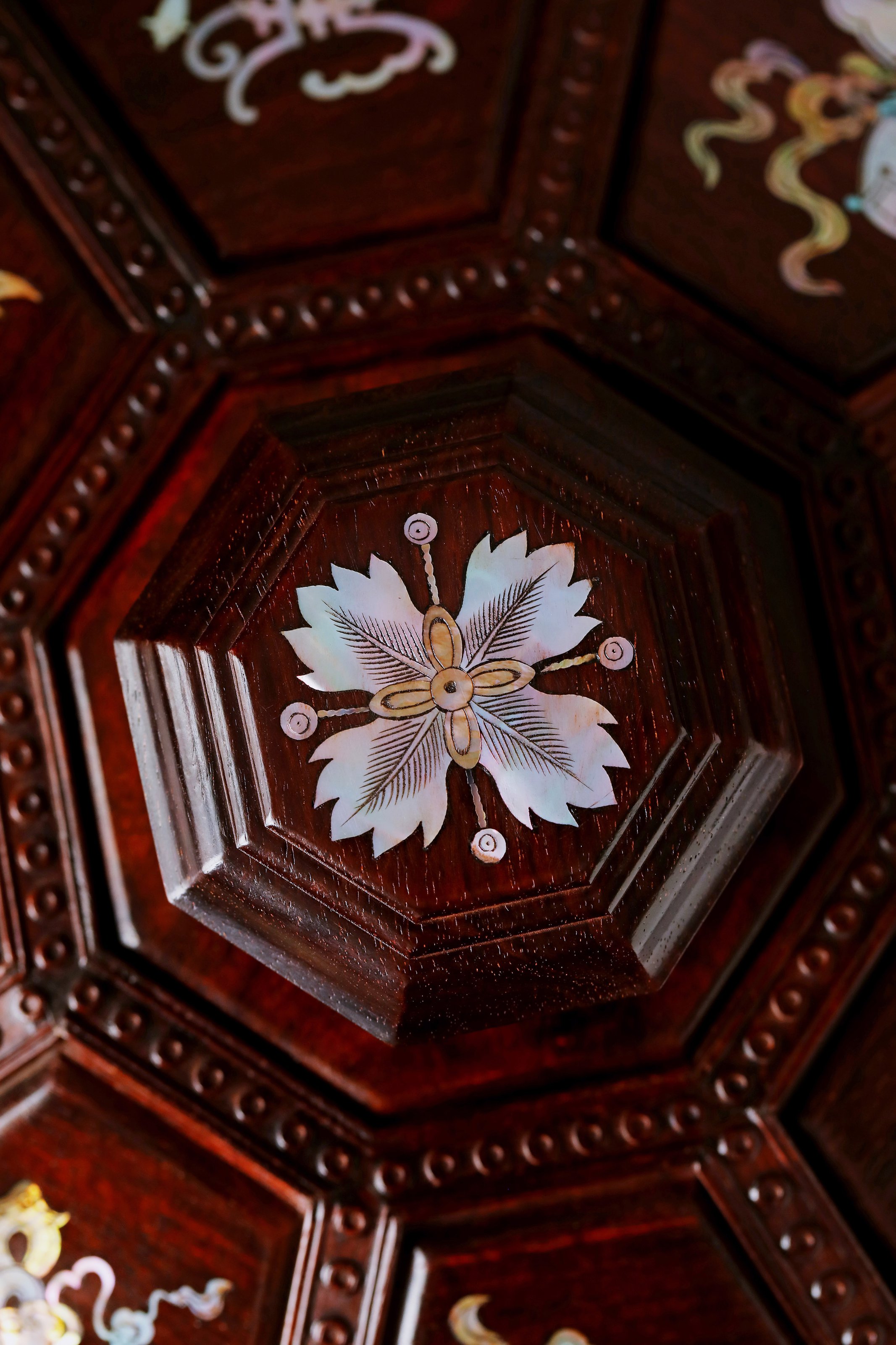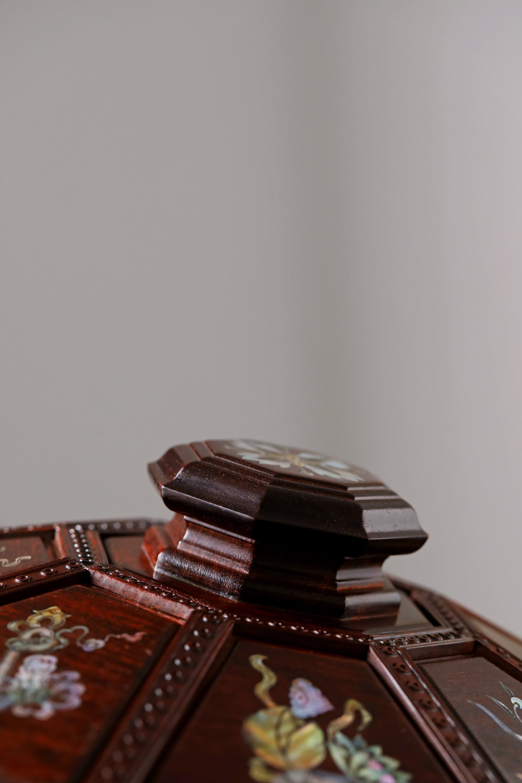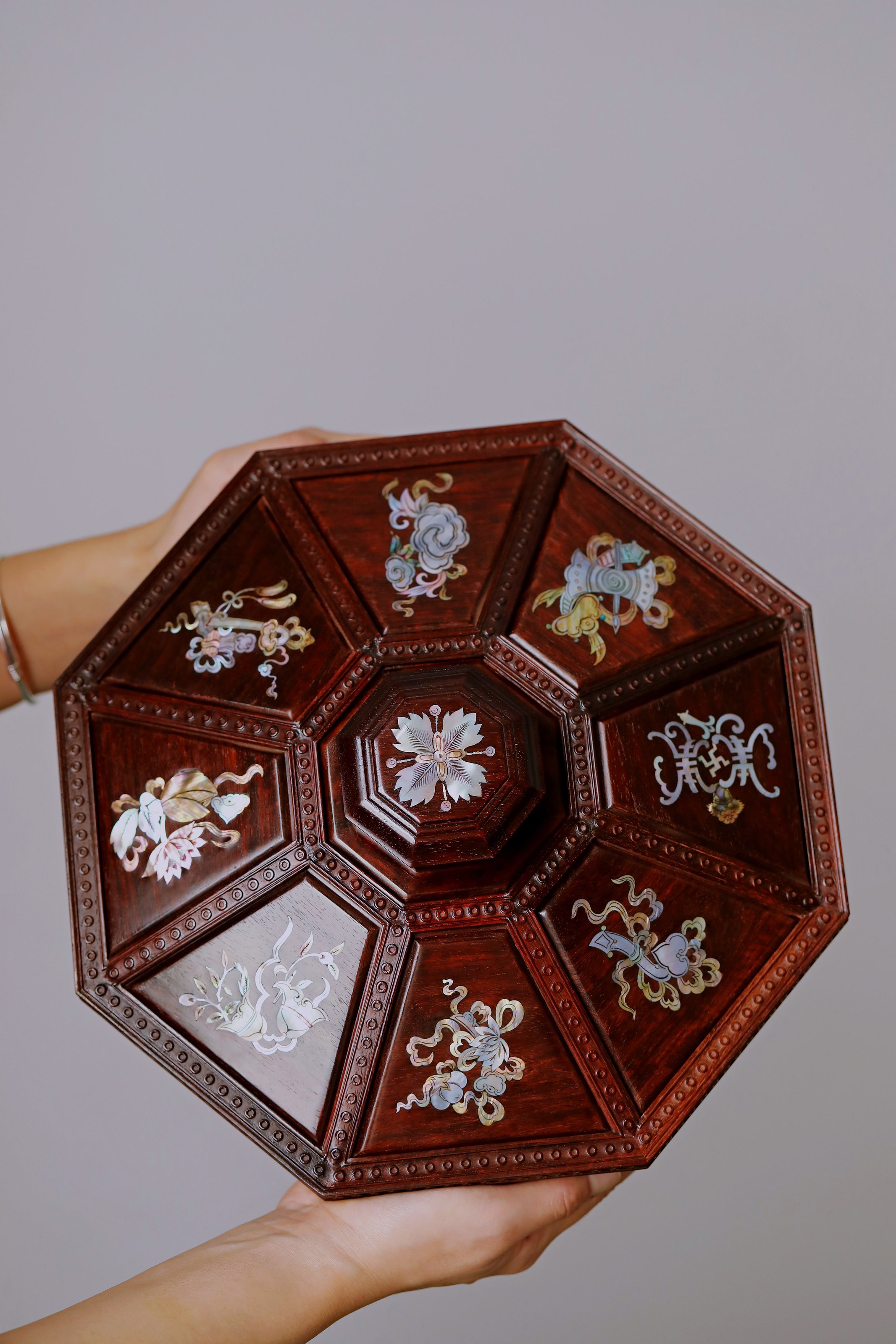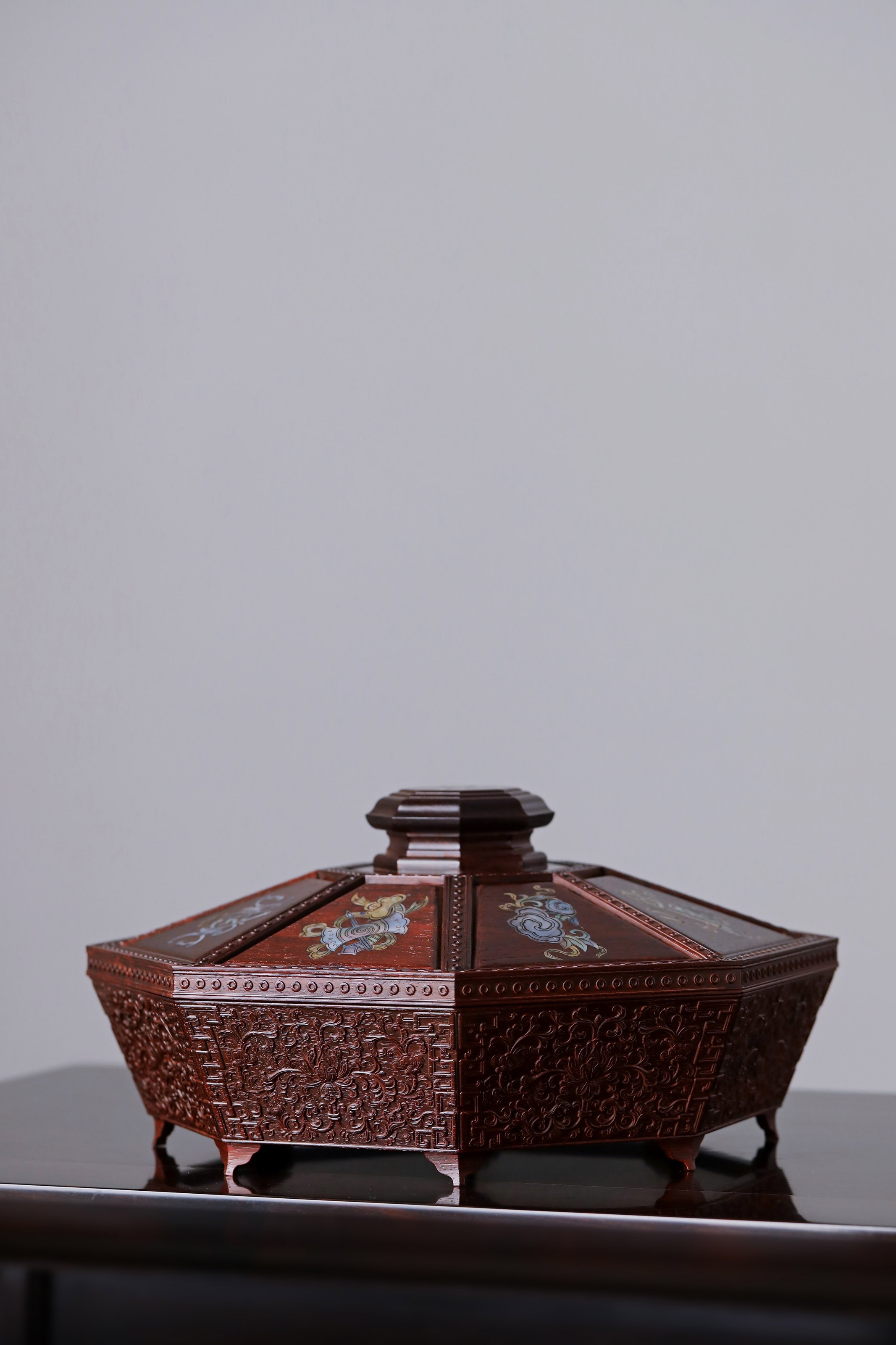 小叶紫檀螺钿八宝果盒 小叶紫檀螺钿八宝果盒 规格:28.3X28.3X12 cm 最大直径30.6cm 盒为八角形,盒盖螺钿八宝吉祥纹样,环绕福寿佳果,色彩斑斓, 绚丽多彩; 身侧满雕西番莲纹,整体纹理寓意多福多 多子,寄愿美好期盼。