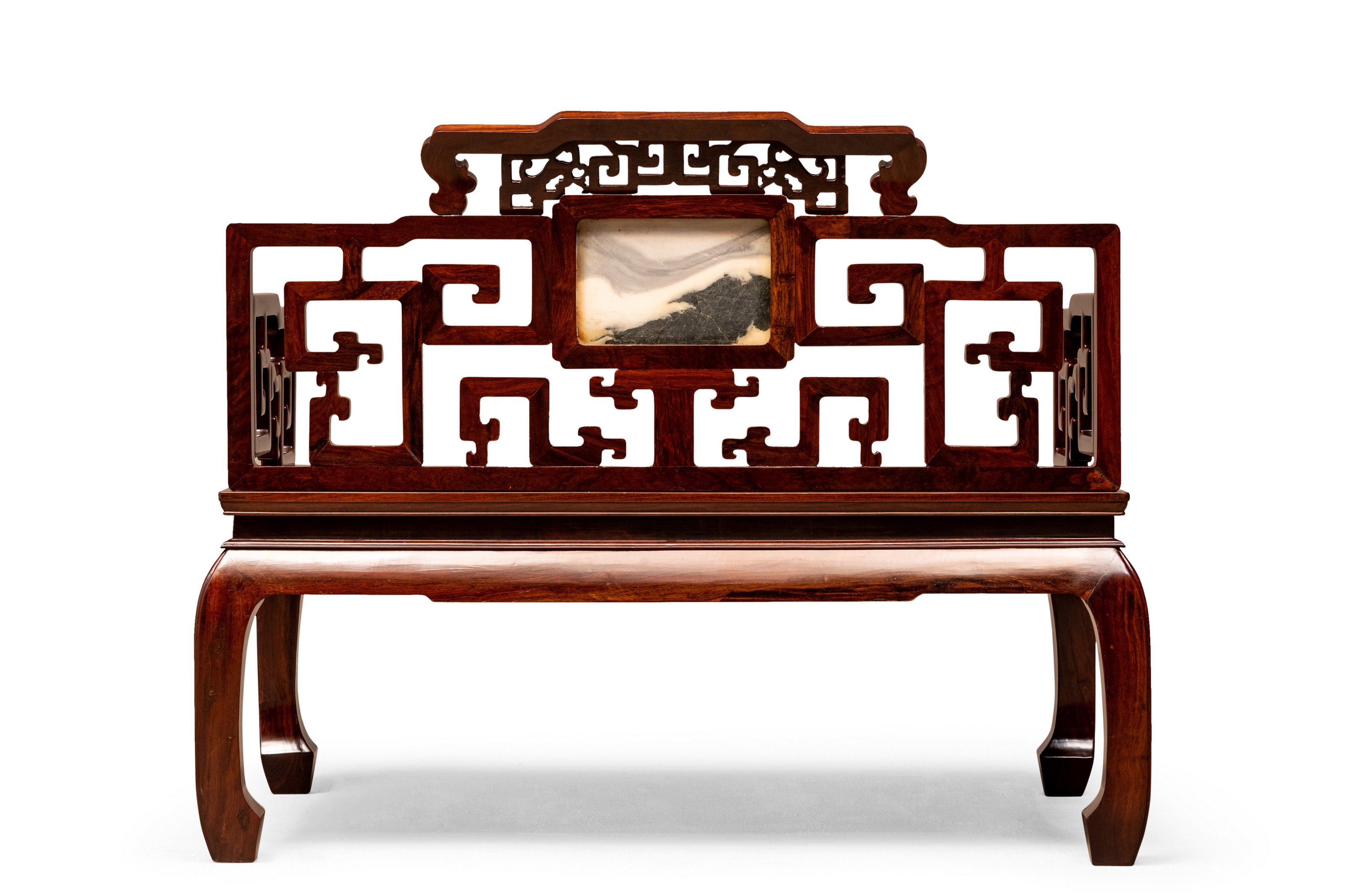 116×60×92cm 黑檀镶理石靠背高束腰鼓腿彭牙宝座 宝座以黑檀制,三屏风式,屏风均以拐子纹攒框而成,中间屏风中部镶嵌大理石,纹理天然美观。座面格角攒边框镶嵌板心,落堂起鼓作,冰盘沿线脚。高束腰,有托腮,马蹄足兜转有力,洼堂肚式牙板上浮雕拐子纹。