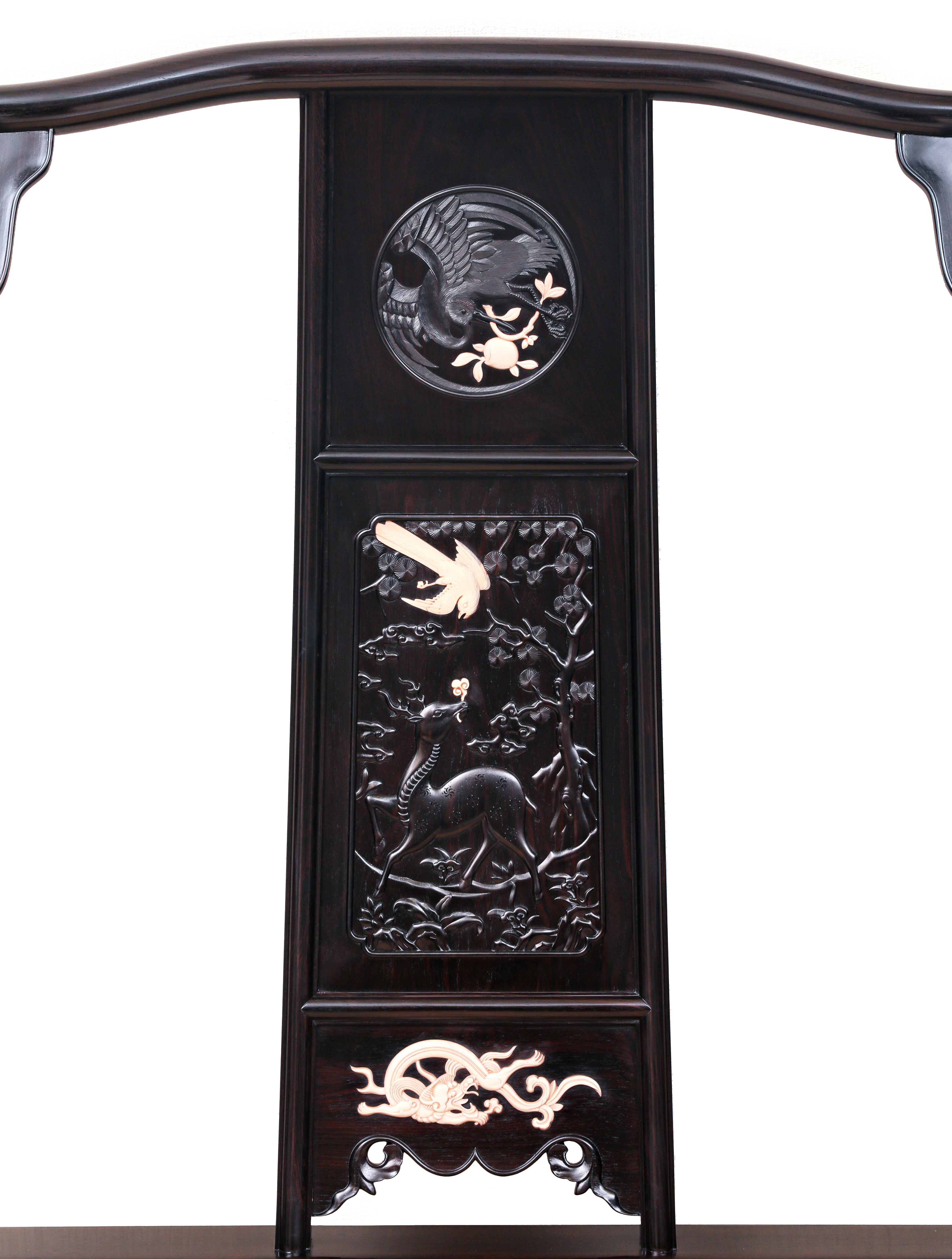 此椅改款自著原器:黄花梨鹤鹿同春四出头官帽椅,收录张金华《维扬明式家具》P88。此把椅子与传统的苏作四出头官帽椅结构造型相同,但是更为精美华丽,背板攒框制成,共分三截,上截纯手工丝翎檀雕仙鹤口衔仙桃于上、中段梅花鹿,喜上眉梢,灵动天成、下截亮脚,螭龙回首,似诉往昔传奇。坐面为藤面编织,此椅突出亮点扶手之间的联邦棍呈宝瓶样式、竹节纹雕其上有着竹报平安之意。座面冰盘沿棱线居中,两侧弧形、为经典苏作的“文武线”之名。前后通根,选料严苛,高规格之作,实乃收藏传世之珍宝。