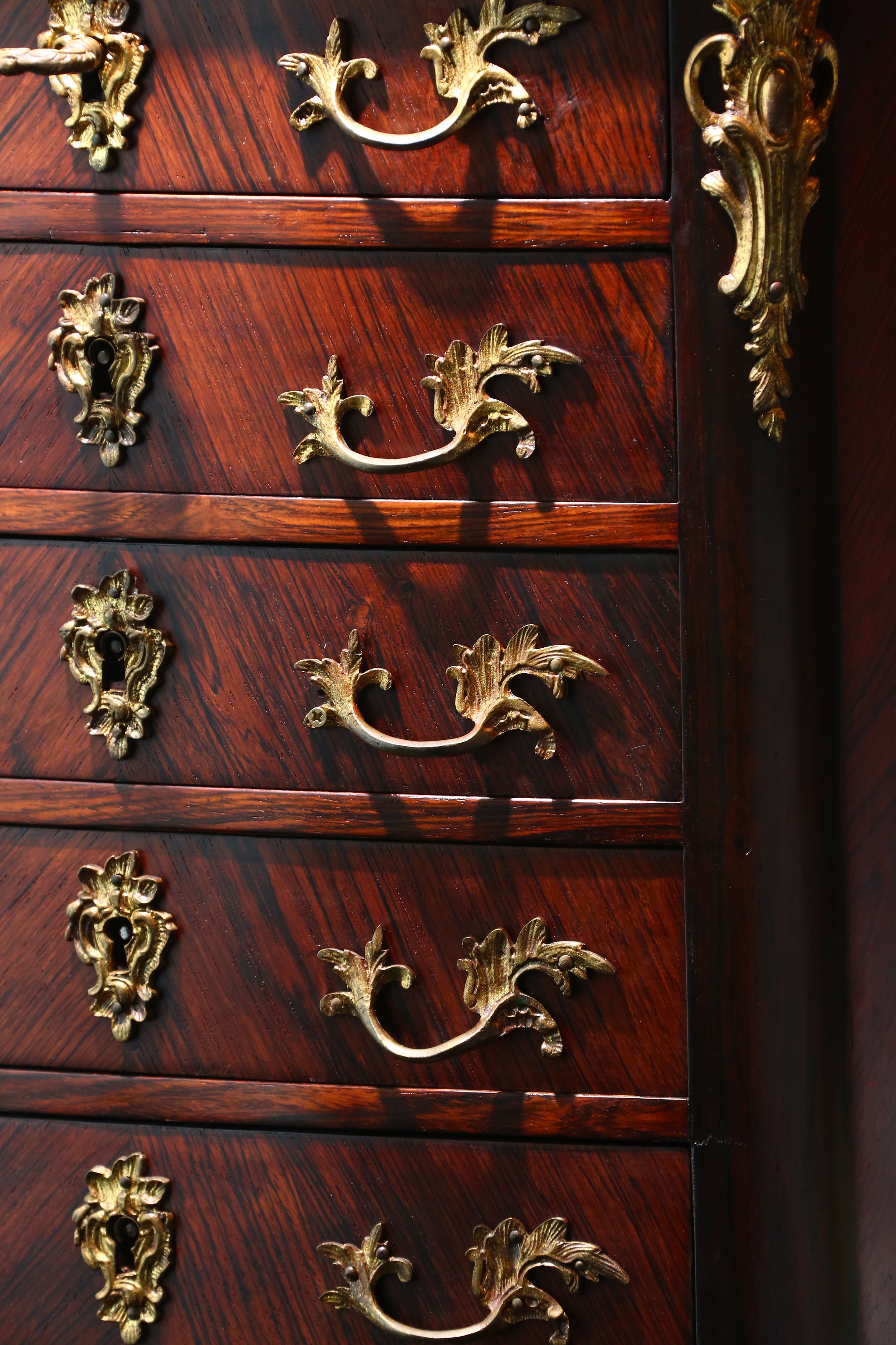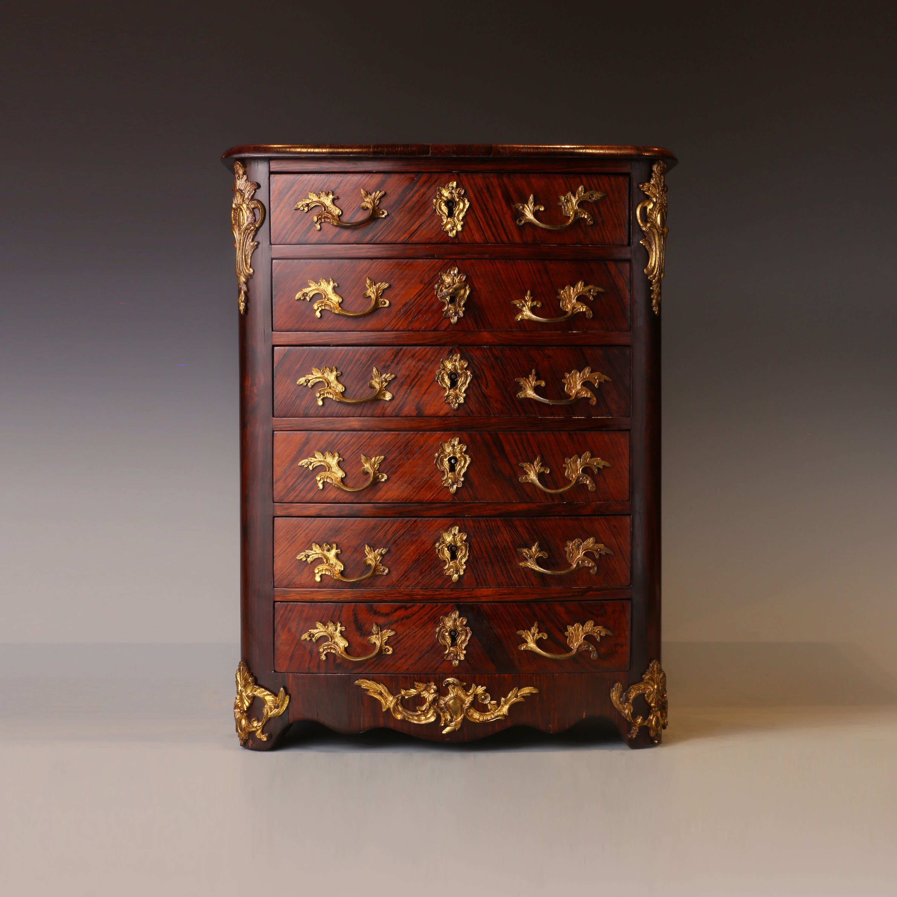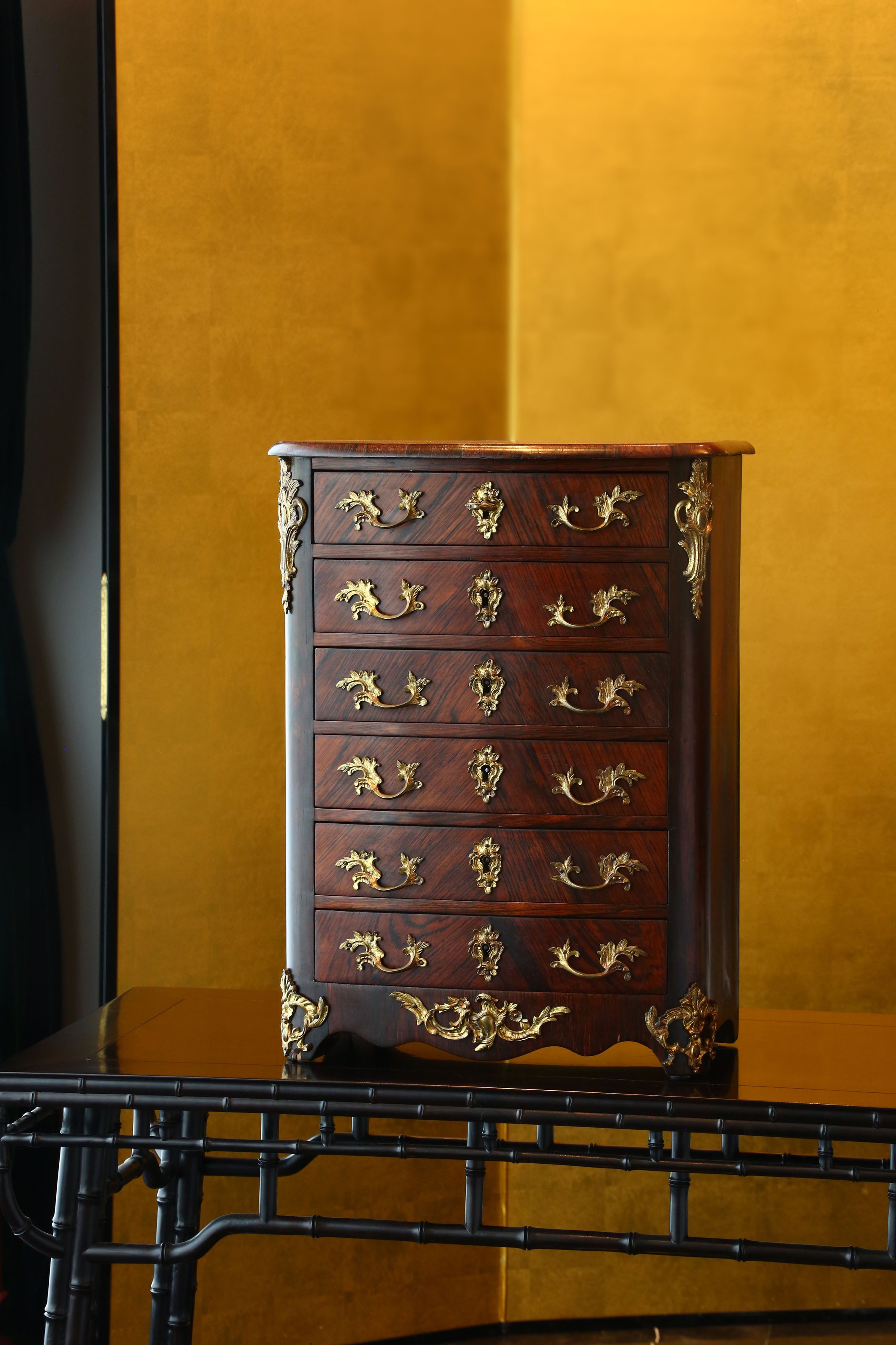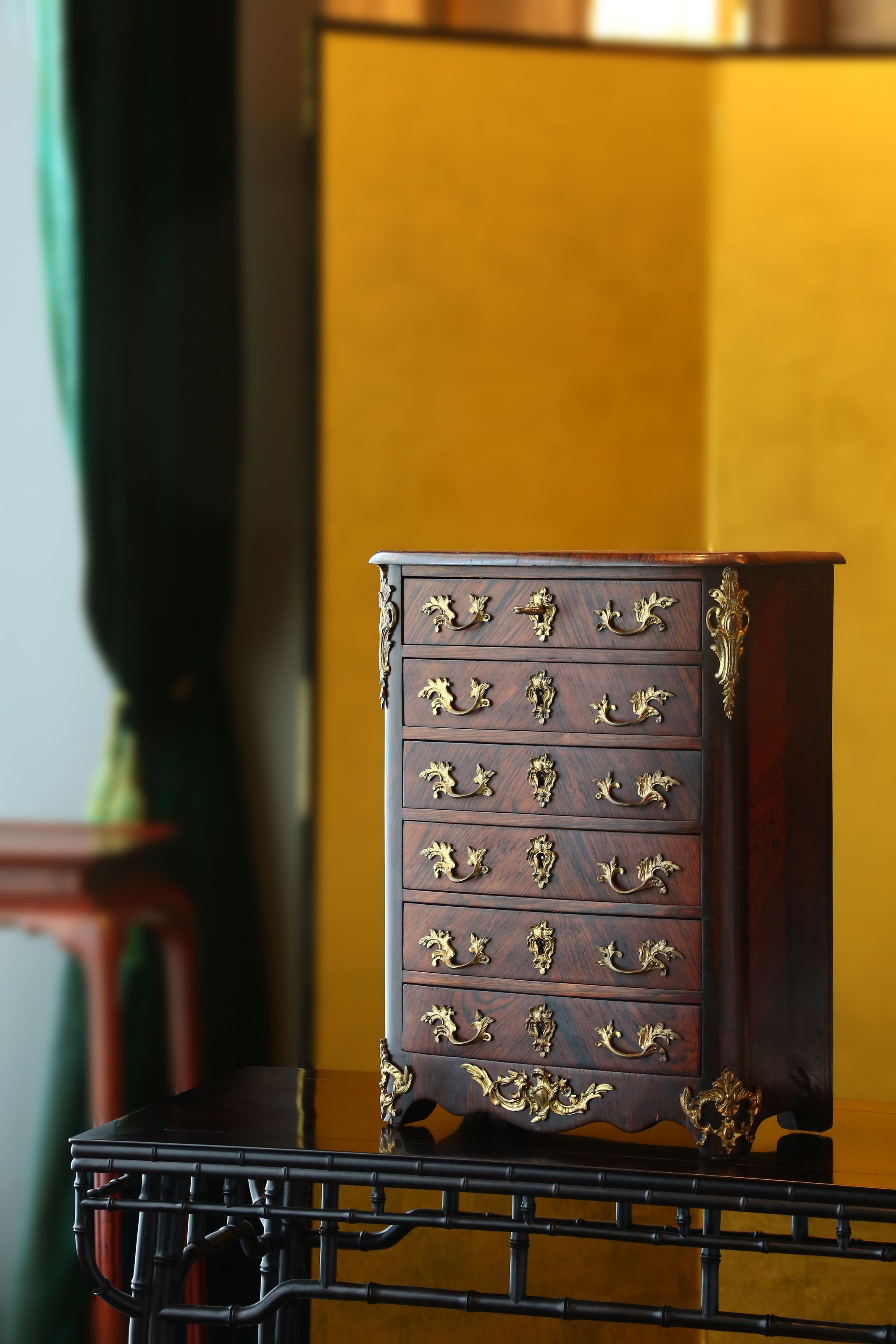 宽:40.5cm厚:23cm高:56cm 18世纪英国六屉柜 柜体色泽红润,木纹清晰美观,起伏有致,包浆厚重。柜顶平整,可陈设小器。平列六屉,抽屉脸上及柜子拐角处,均镶嵌鎏金花叶纹样,尤显精致,雍容华贵。柜腿间为波浪形刀牙板,结构严谨。