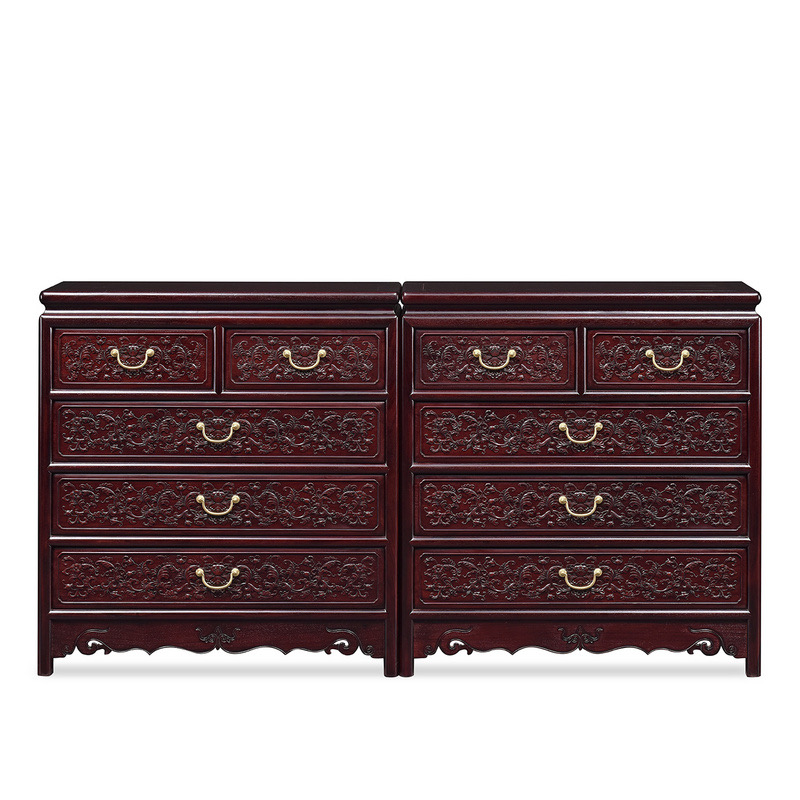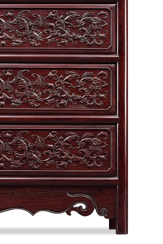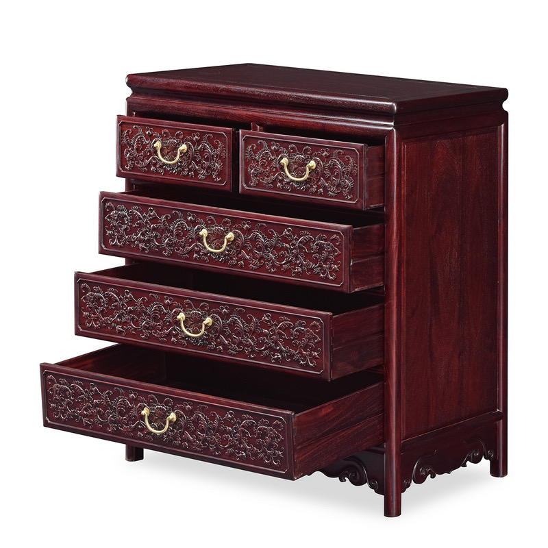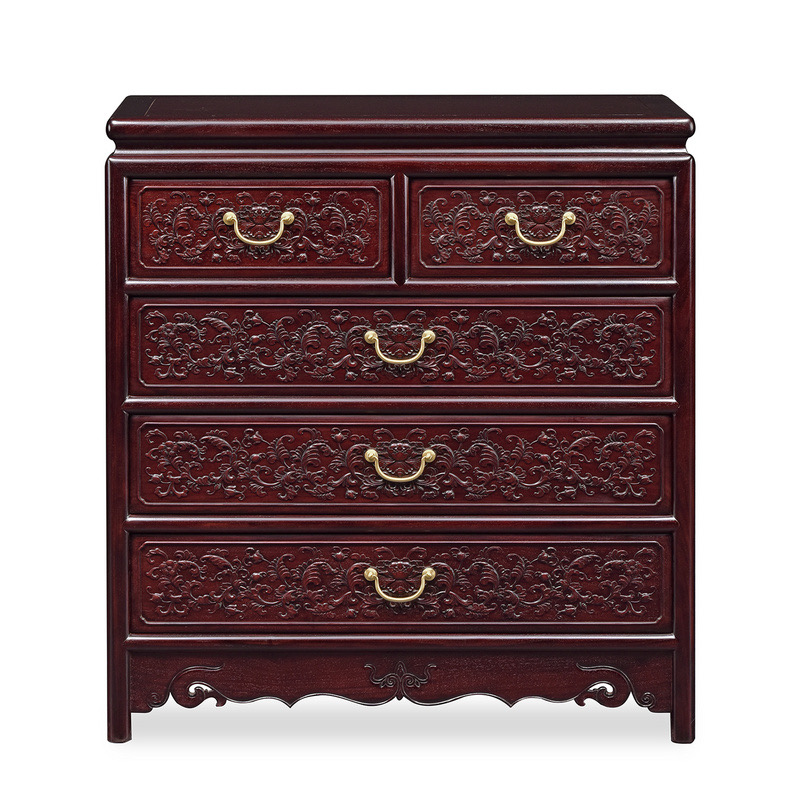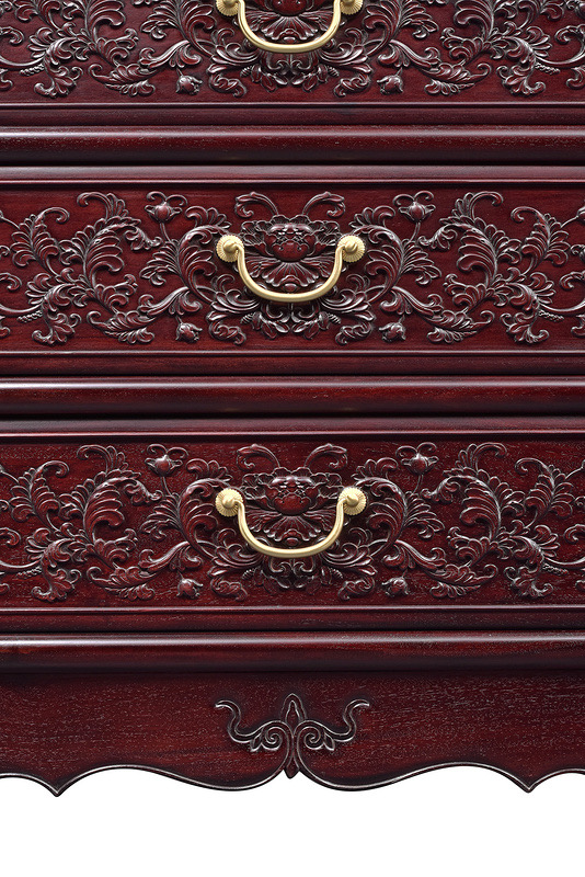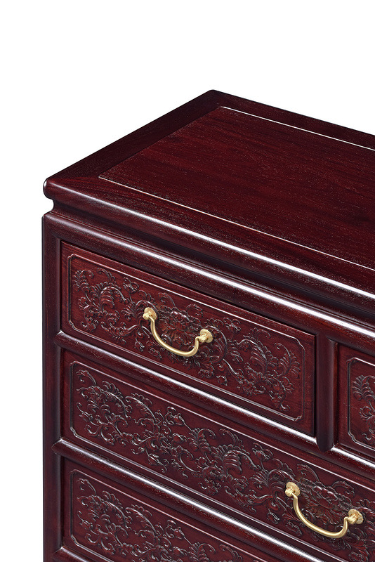 长:93cm 宽:45cm 高:100cm 赞比亚紫檀西番莲五斗柜 高油密材料赞比亚紫檀无拼补,高温干燥,木性实坚,紫檀工艺,手工谨严,精雕细磨,润朗自然,磨光工艺,烫蜡修饰,表里如一,环保美观,循守传统,匠心非凡; 安长方形铜合面页,设活动式闩杆。上下呼应,色泽鲜亮,雕工精细