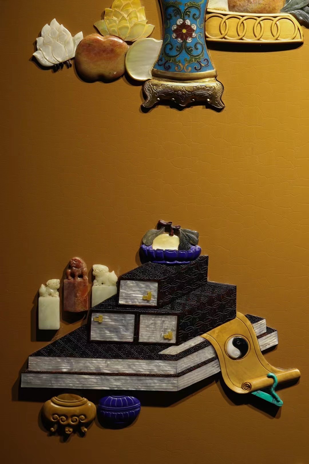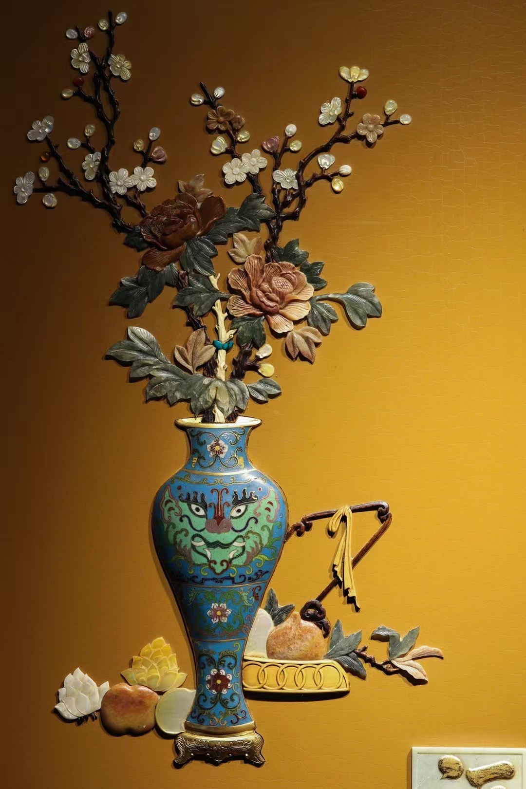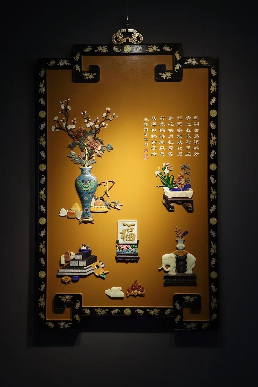 长:120.5cm 宽:76.5cm 厚:3cm (不含挂钩)赞比亚紫檀仿古 百宝嵌挂屏 承循宫廷技艺,嵌以玉石玛瑙、珐琅彩等珍材,作瓶花清供图。整体浓妍华丽,贵而不俗,是为空间陈设佳器。 长120.5cm 宽76.5cm 厚3cm (不含挂钩)