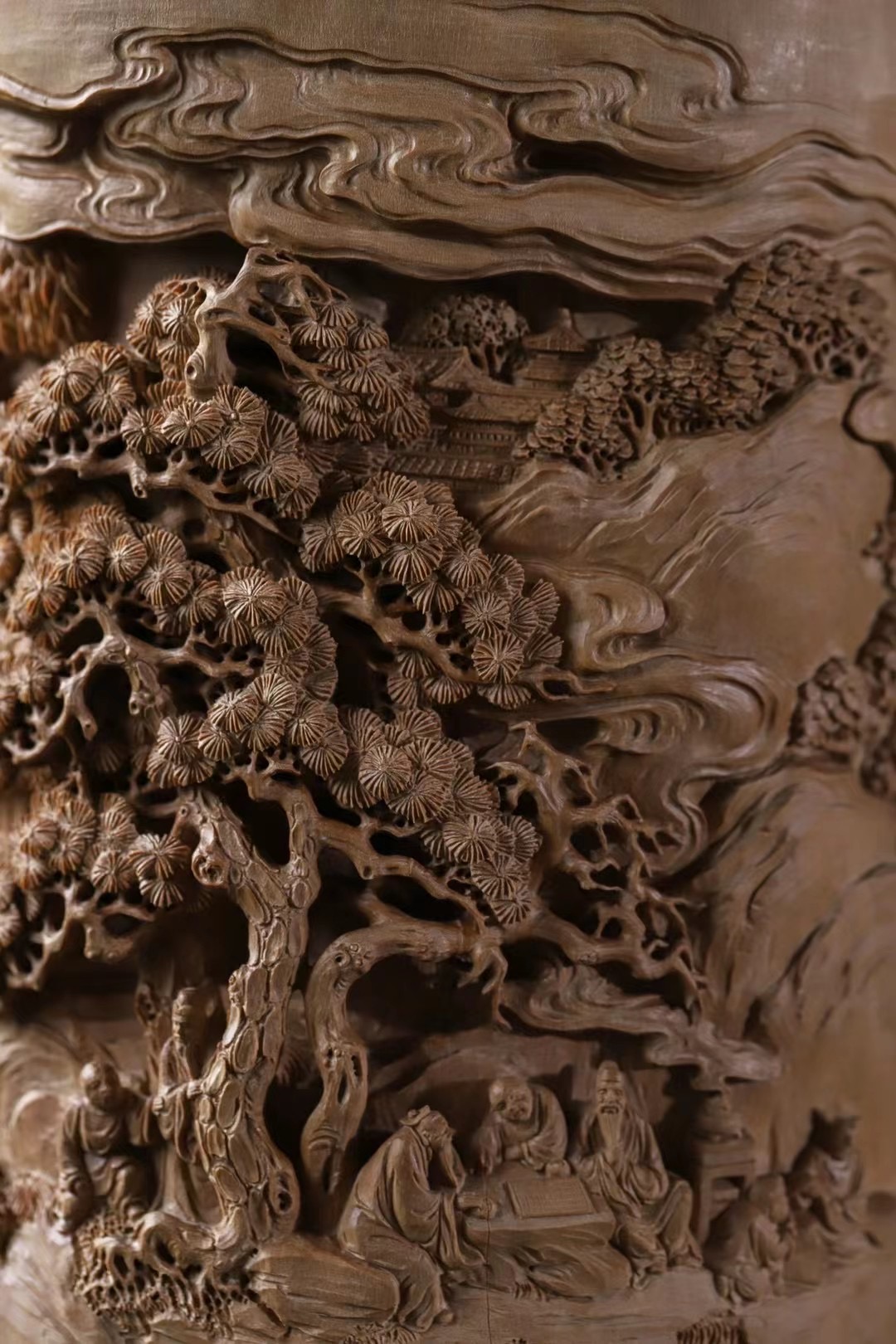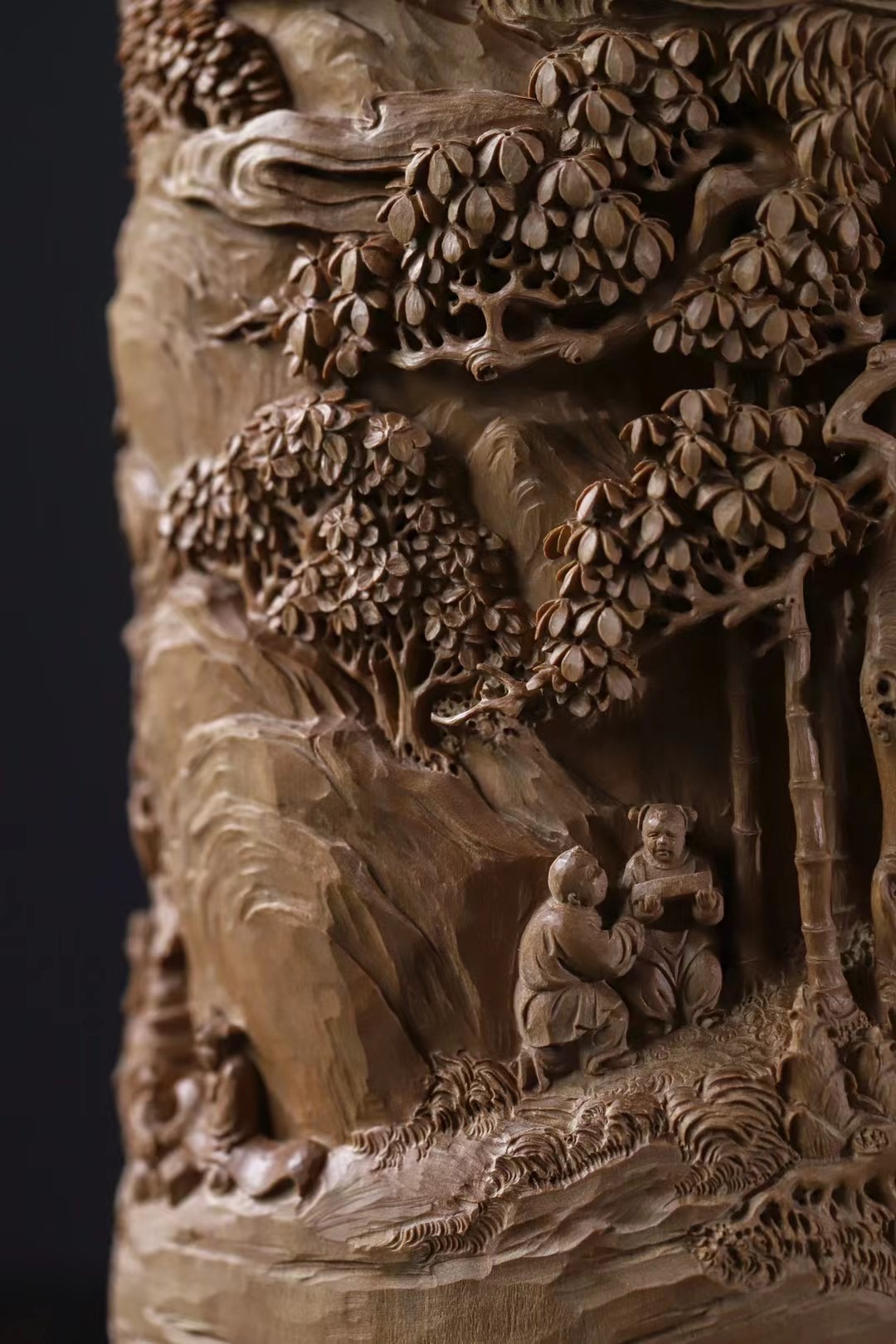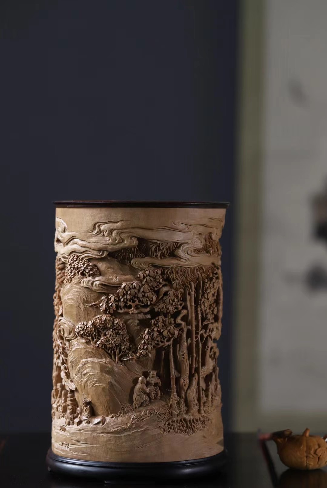 直径16.5cm 高23.3cm 重3260g 老山檀十八学士大笔筒 甄选醇化大材,香韵甘美绵长。雕刻浮镂兼施,刀法灵活,层次丰富,足见功底深厚。辗转而赏,如入其境。 直径16.5cm 高23.3cm 重3260g