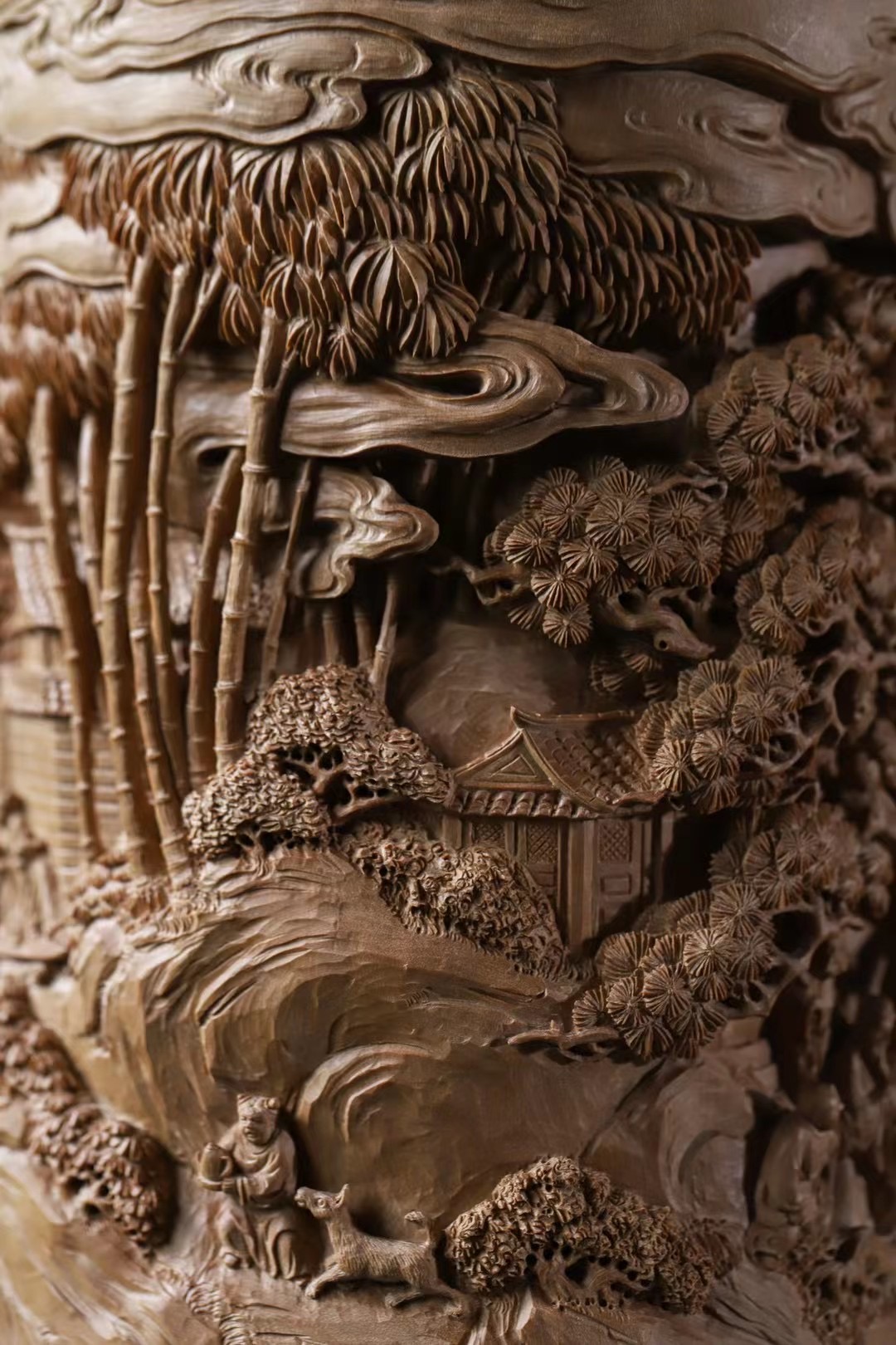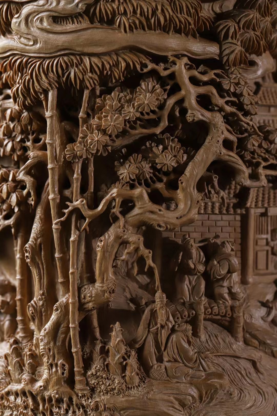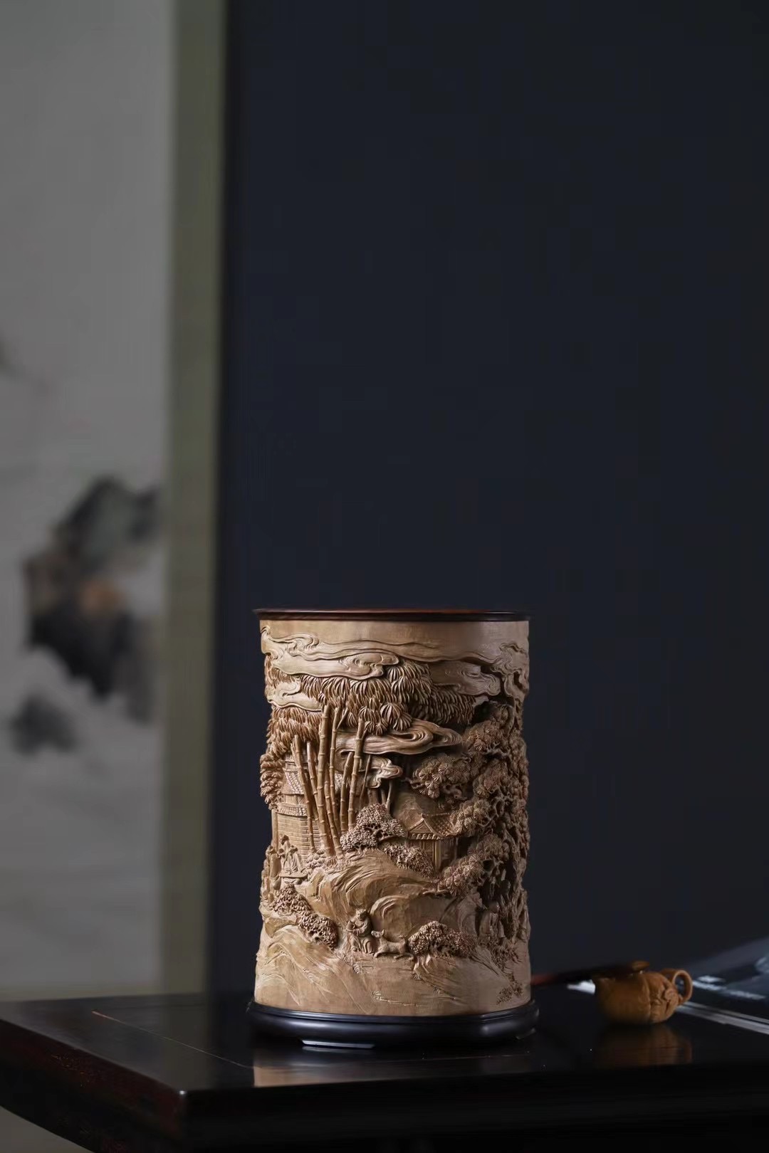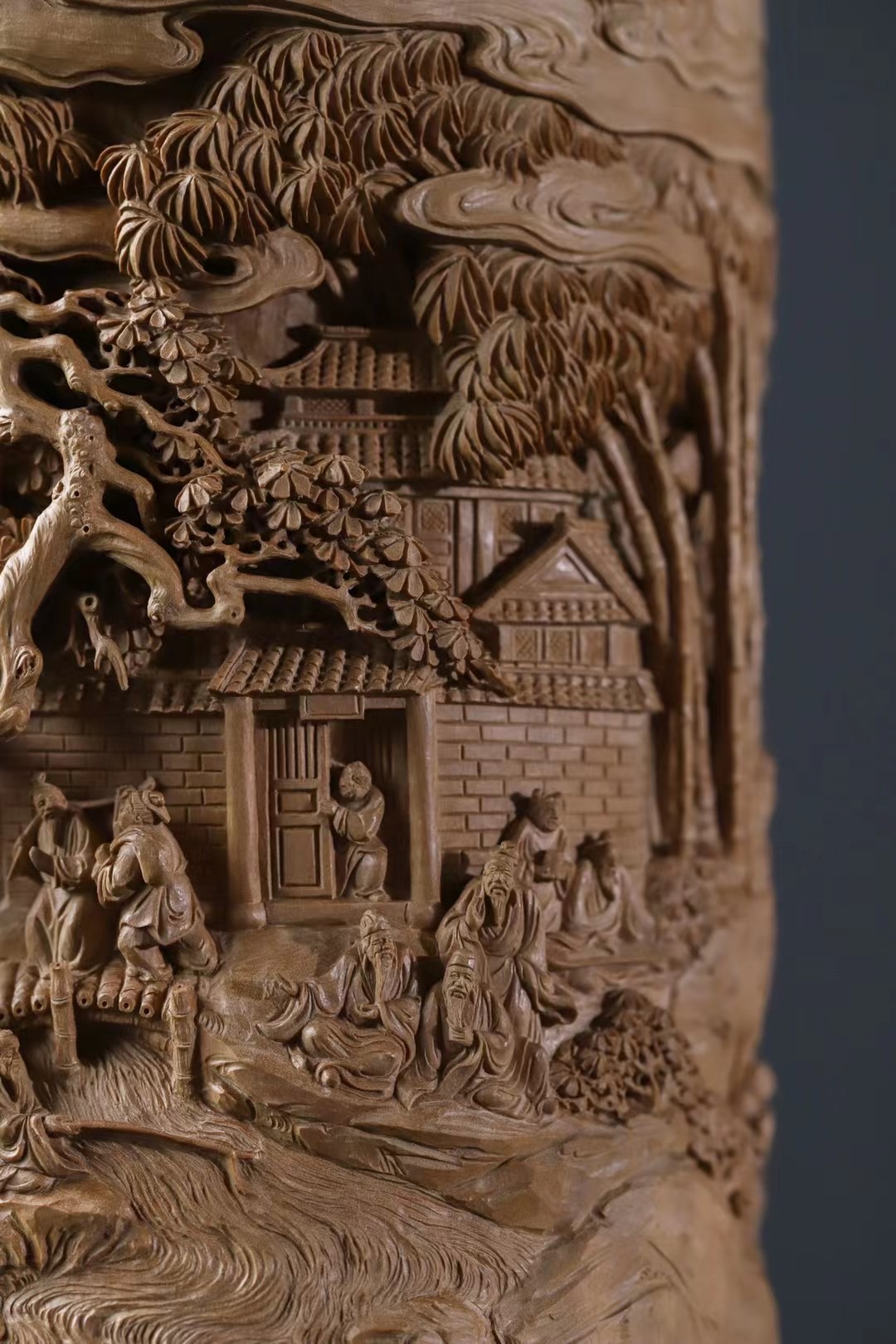 直径16.5cm 高23.3cm 重3260g 老山檀十八学士大笔筒 甄选醇化大材,香韵甘美绵长。雕刻浮镂兼施,刀法灵活,层次丰富,足见功底深厚。辗转而赏,如入其境。 直径16.5cm 高23.3cm 重3260g