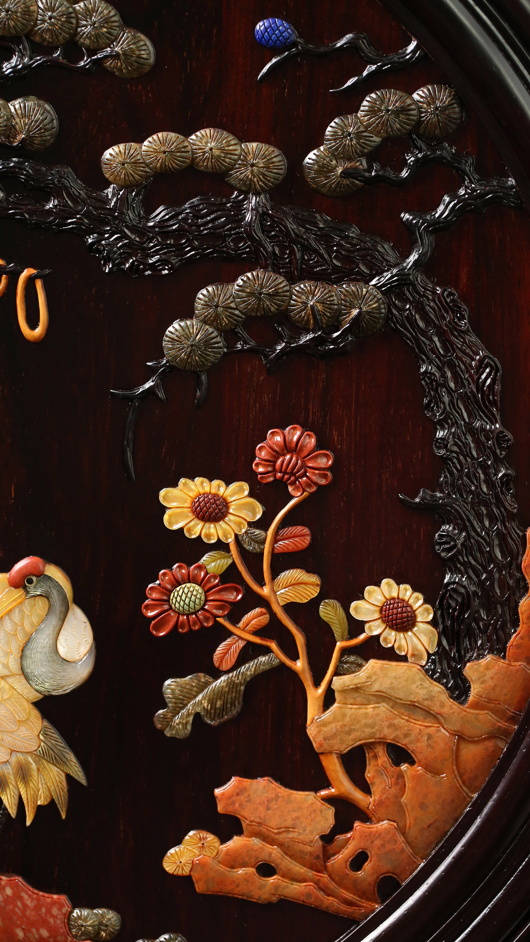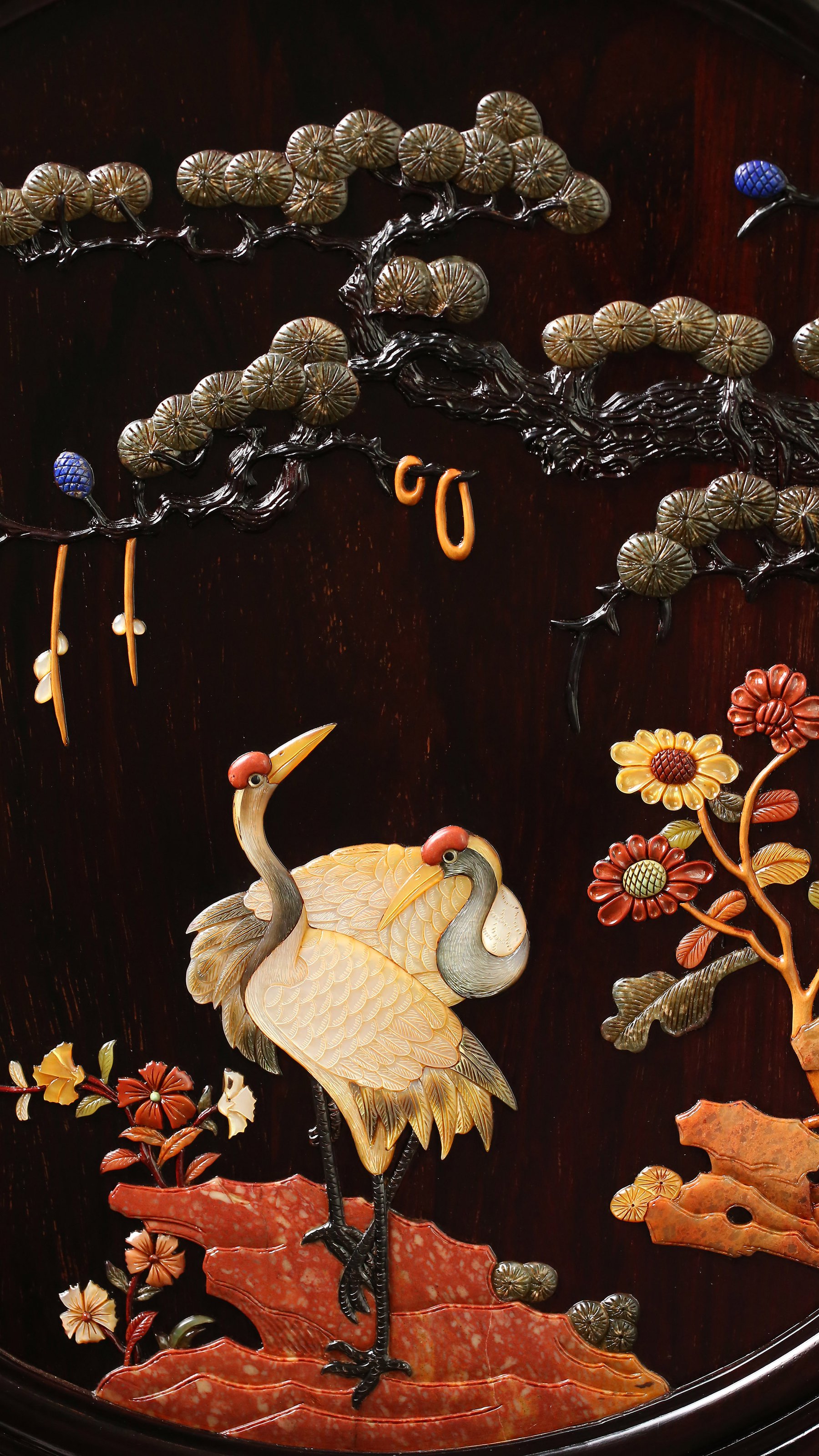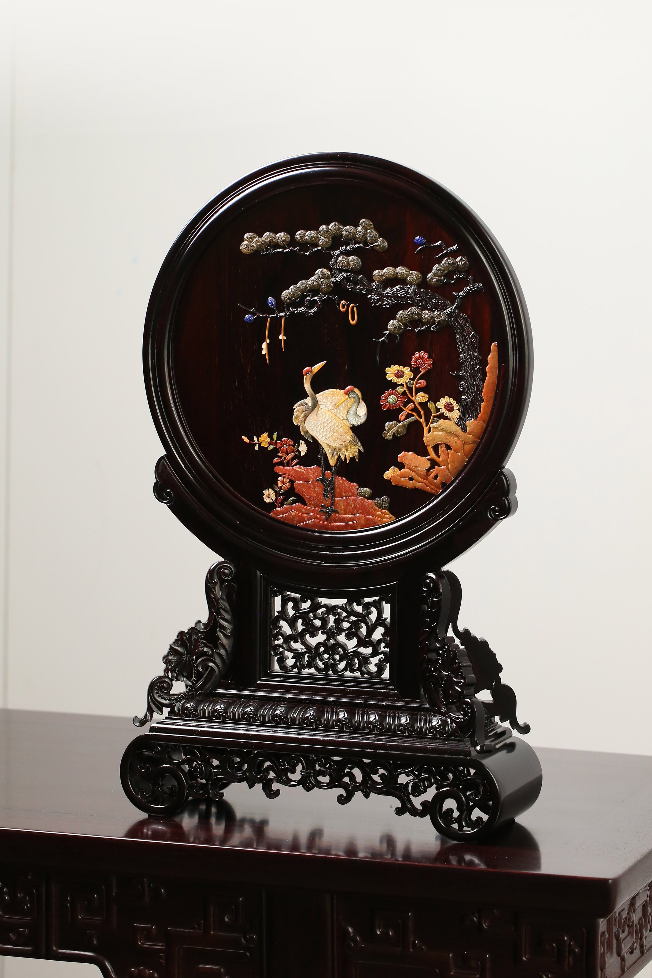 长:37.5cm 宽:13cm 高:61.5cm 大叶紫檀百宝嵌松鹤延年圆形插屏 圆形插屏,形如盈月,屏心以百宝嵌镶嵌松鹤延年图案,寓意鹤鹿同春,吉祥如意。木质为大叶紫檀,满工雕刻,绦环板镂雕卷草纹,其下披覆仰莲纹,底部承卷草纹卷书足,两侧为花叶站牙。插屏综合运用镶嵌、镂雕、浮雕和阴刻等工艺,富丽奢华。