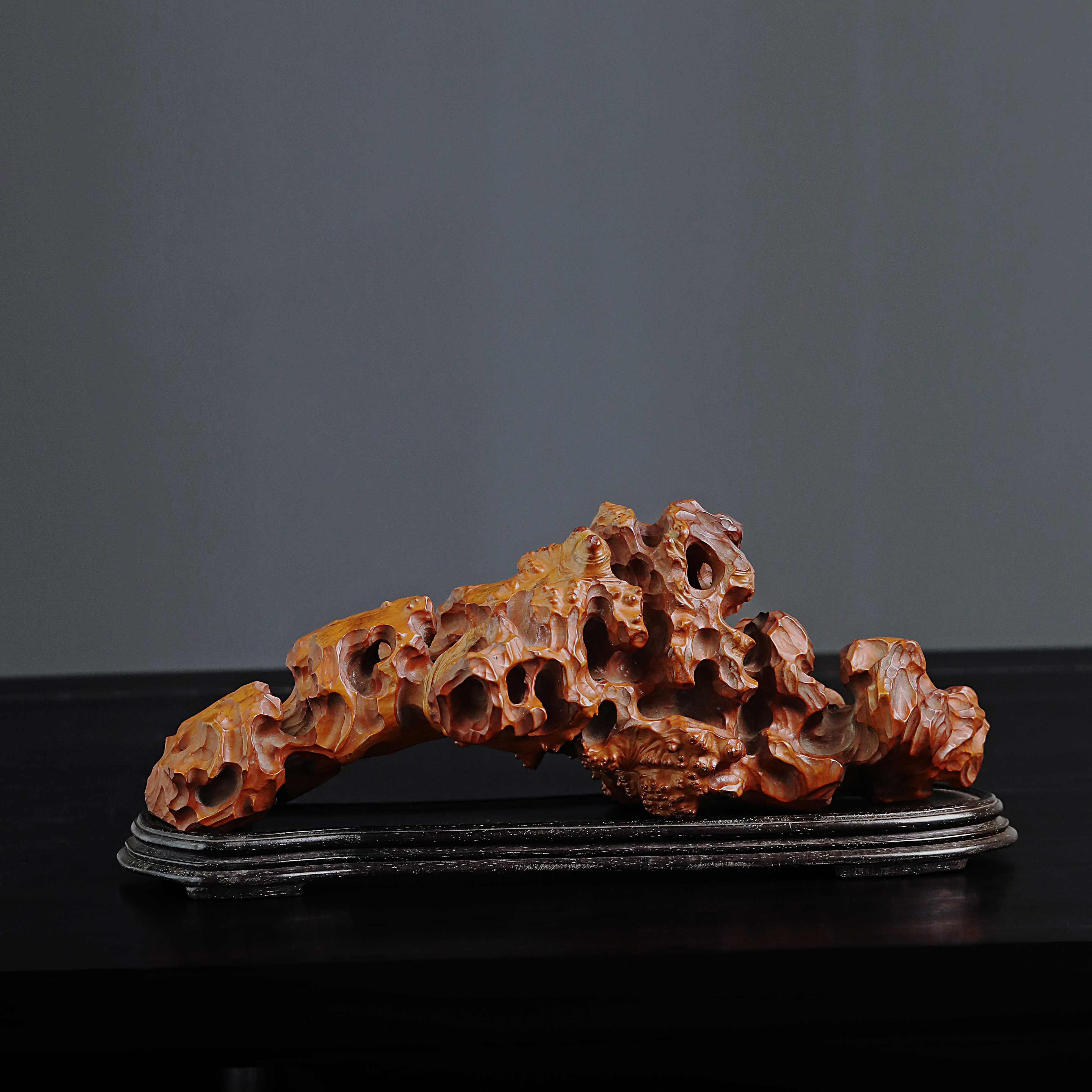 山子以黄杨木雕镂,巧作玲珑洞石形,刻画出太湖石景的孔洞,模拟雅石中“瘦”、“奇”、“怪”、“丑”等特点,古雅朴实,可谓案头精美文玩,既可做笔架,又可兼做摆件之用。承沉穆的底座,相得益彰。
