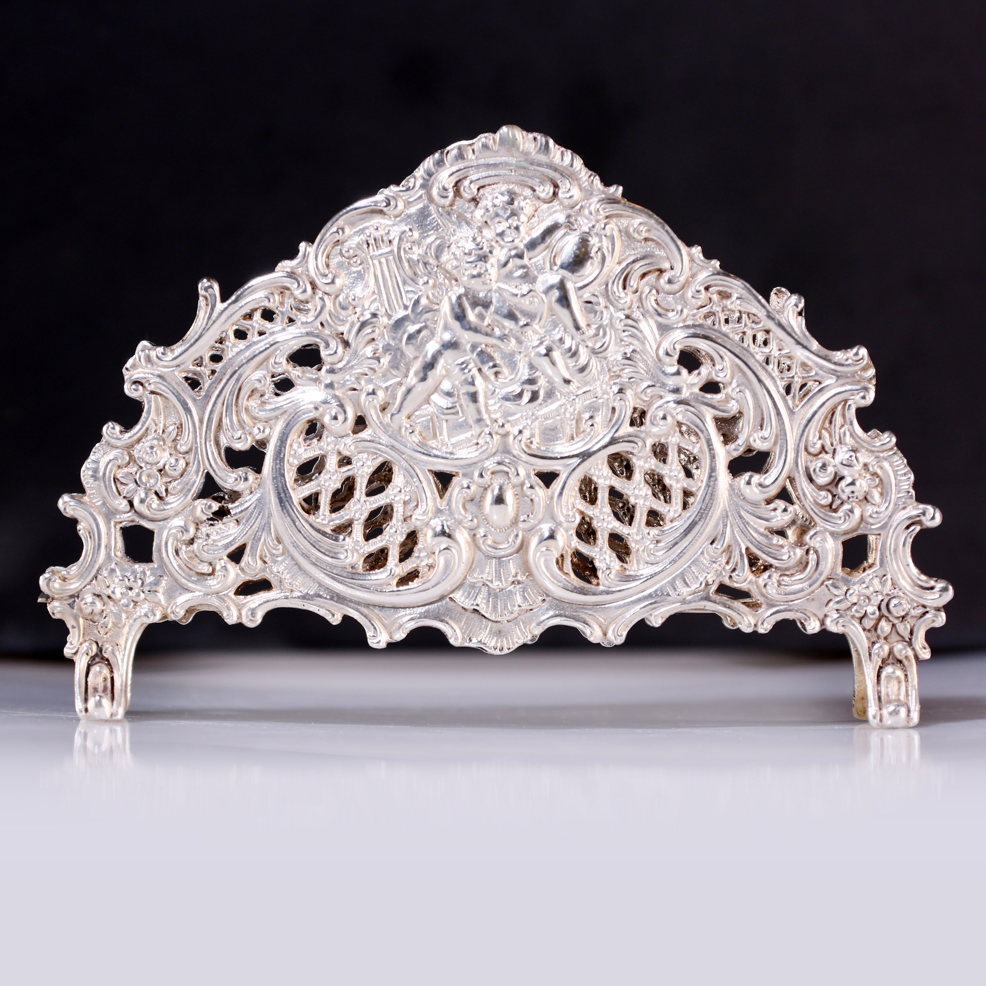 克重:130.5克,长:14.5cm,宽:3cm,高:10.1cm 欧洲古董纯银天使纸巾架 银质纸巾架,两侧纹饰对称,为经典茛苕叶纹,卷曲自然,花团锦簇,中心两位小天使,娇憨可爱,身侧竖琴,表示有音乐相伴,底部四足,有草叶点缀,整架纹饰富丽,华贵奢靡,为欧洲宫廷风格。 底部有微小的徽标。