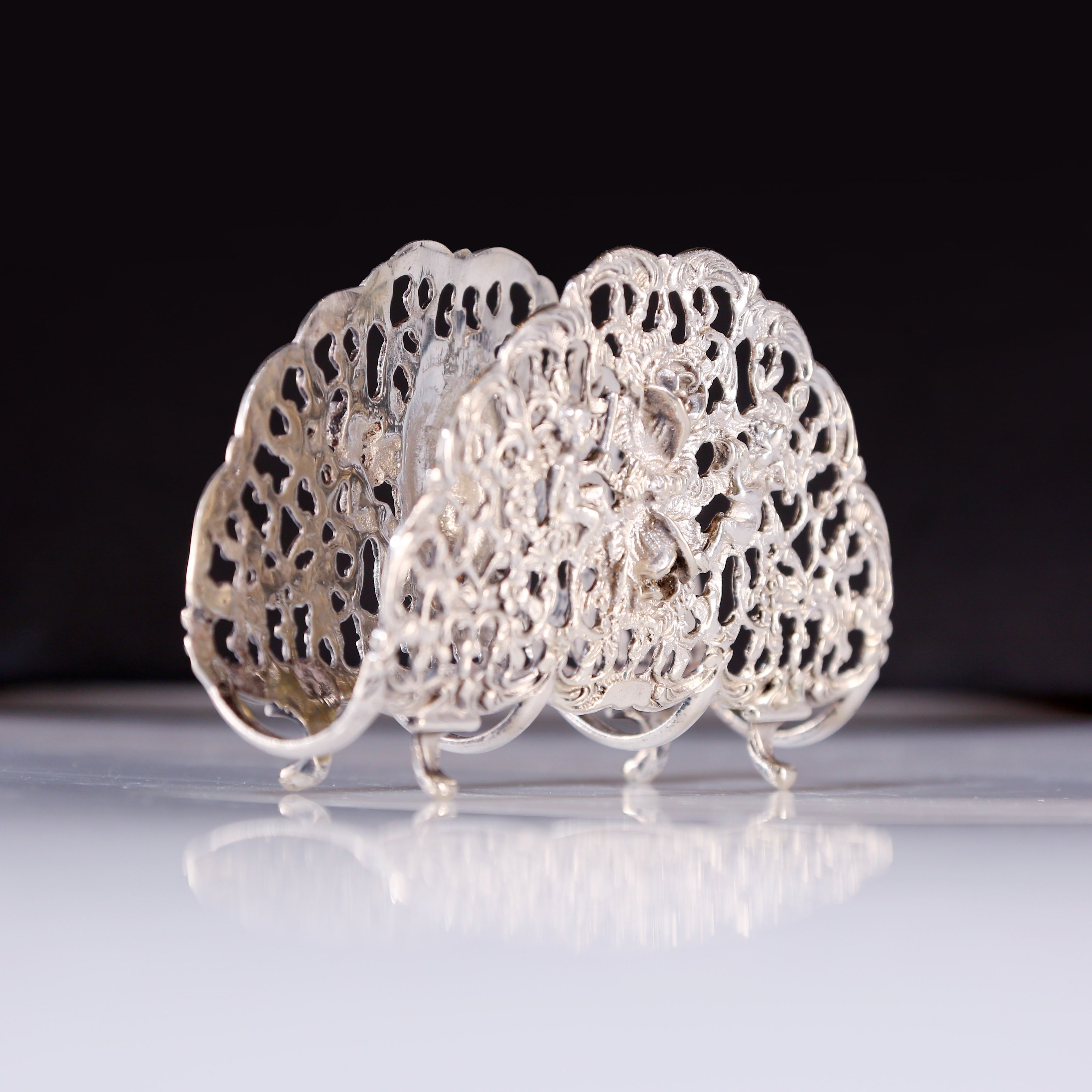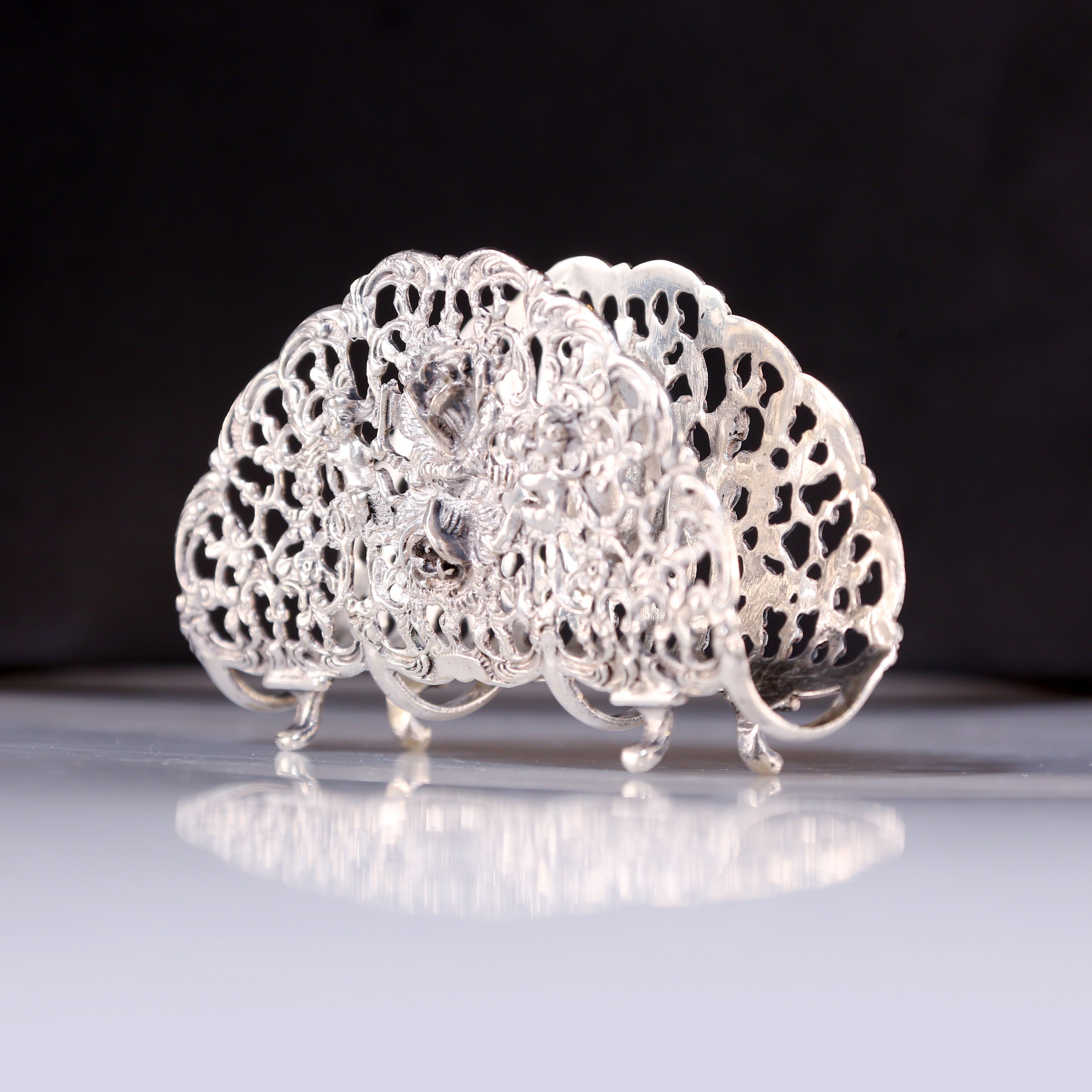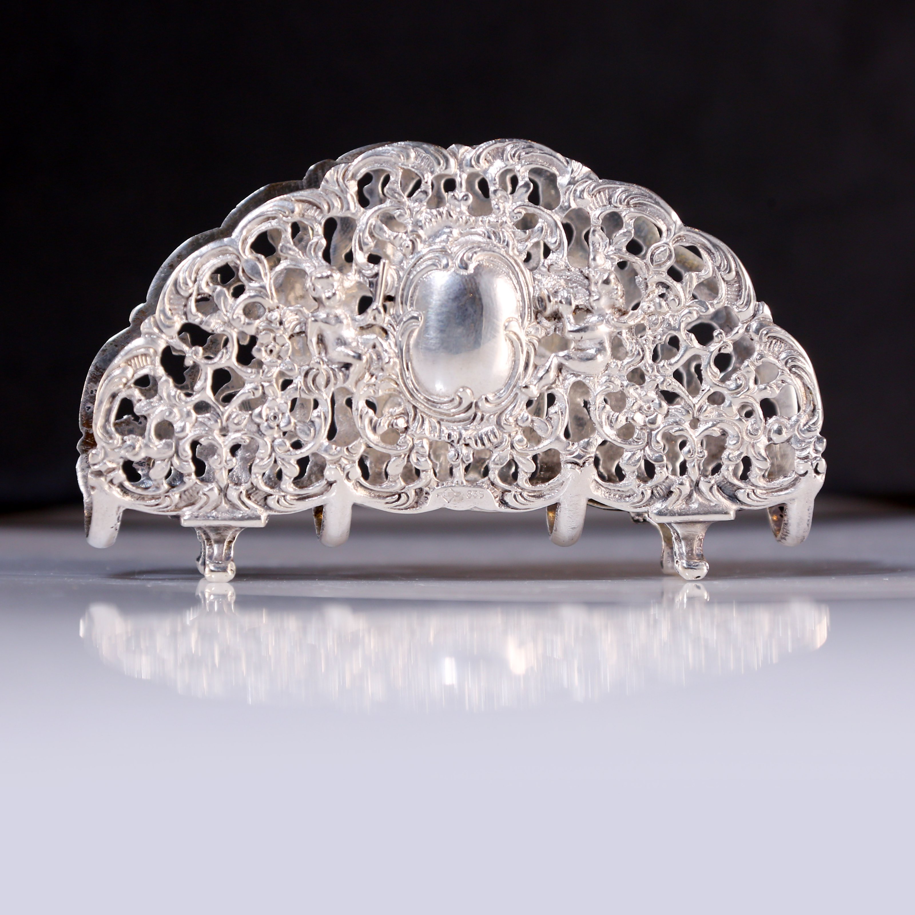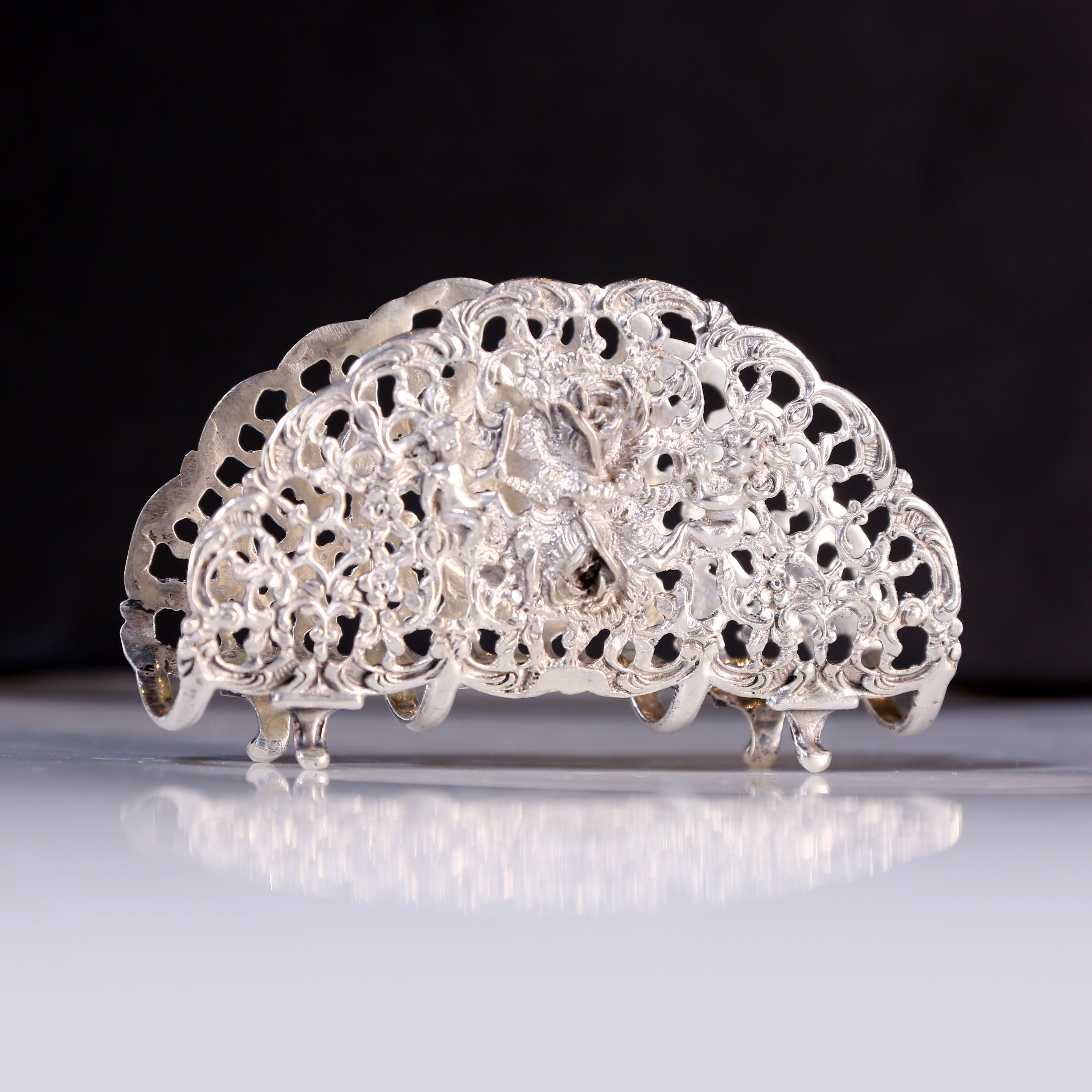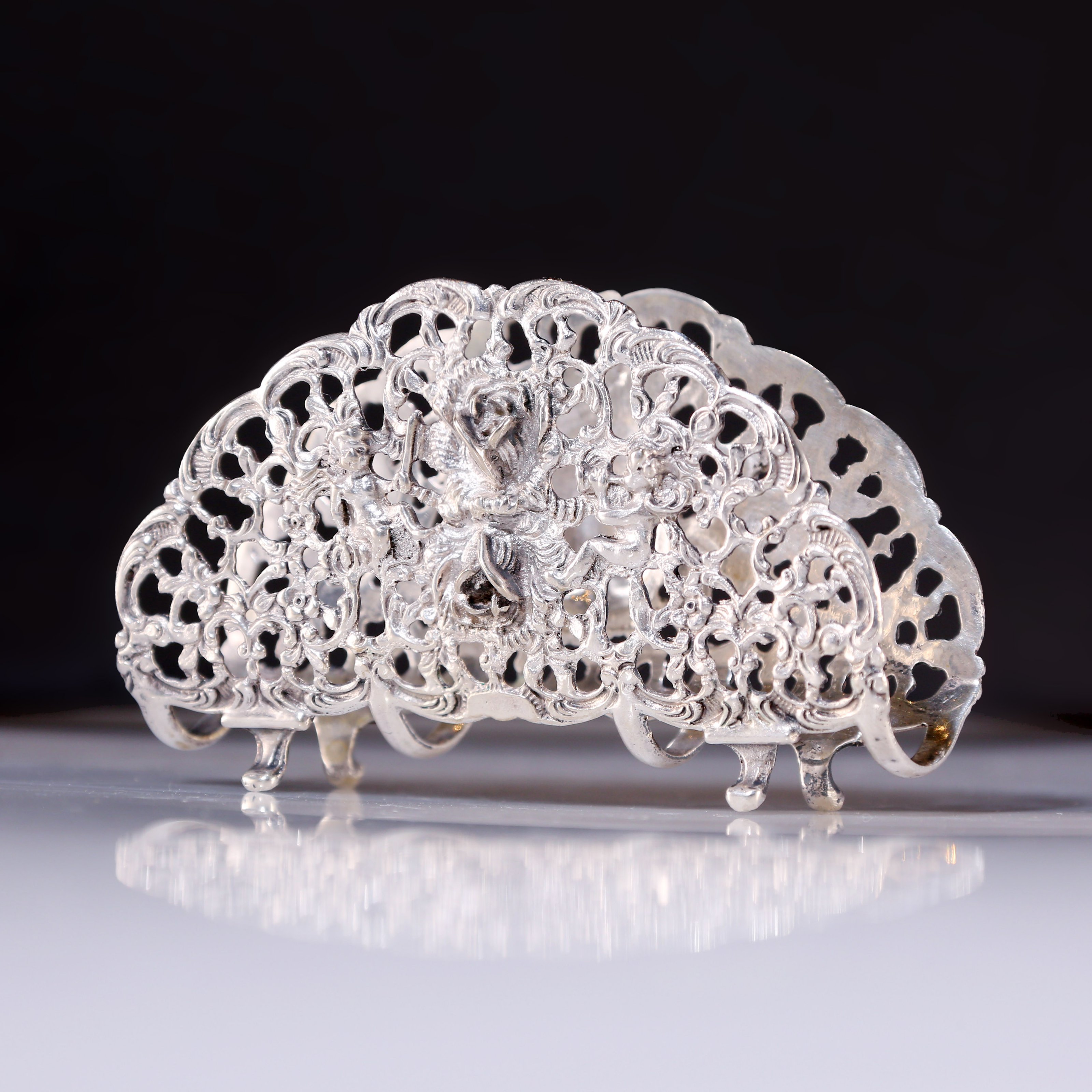克重:43.1克,长:8.6cm,宽:2.3cm,高:5.1cm 欧洲古董小天使纯银玫瑰纸巾架 银质纸巾架,双侧扇形,镂空玫瑰缠枝花卉纹,中央上下两朵盛开的玫瑰花,娇艳欲滴,两侧小天使相伴,俏皮可爱,藤萝卷曲,花团锦绣,生机盎然之景。