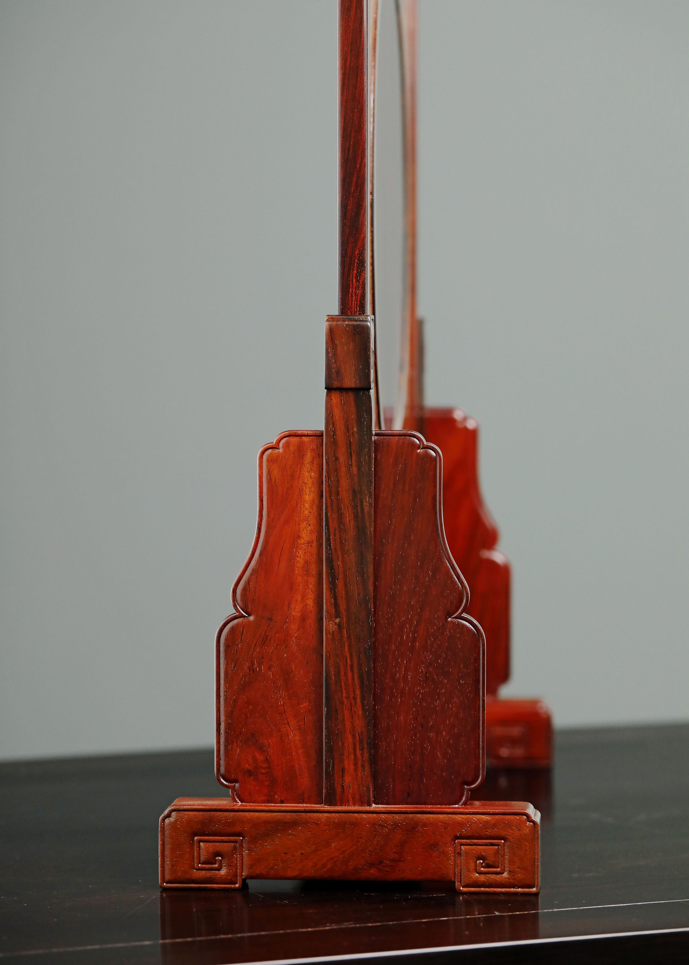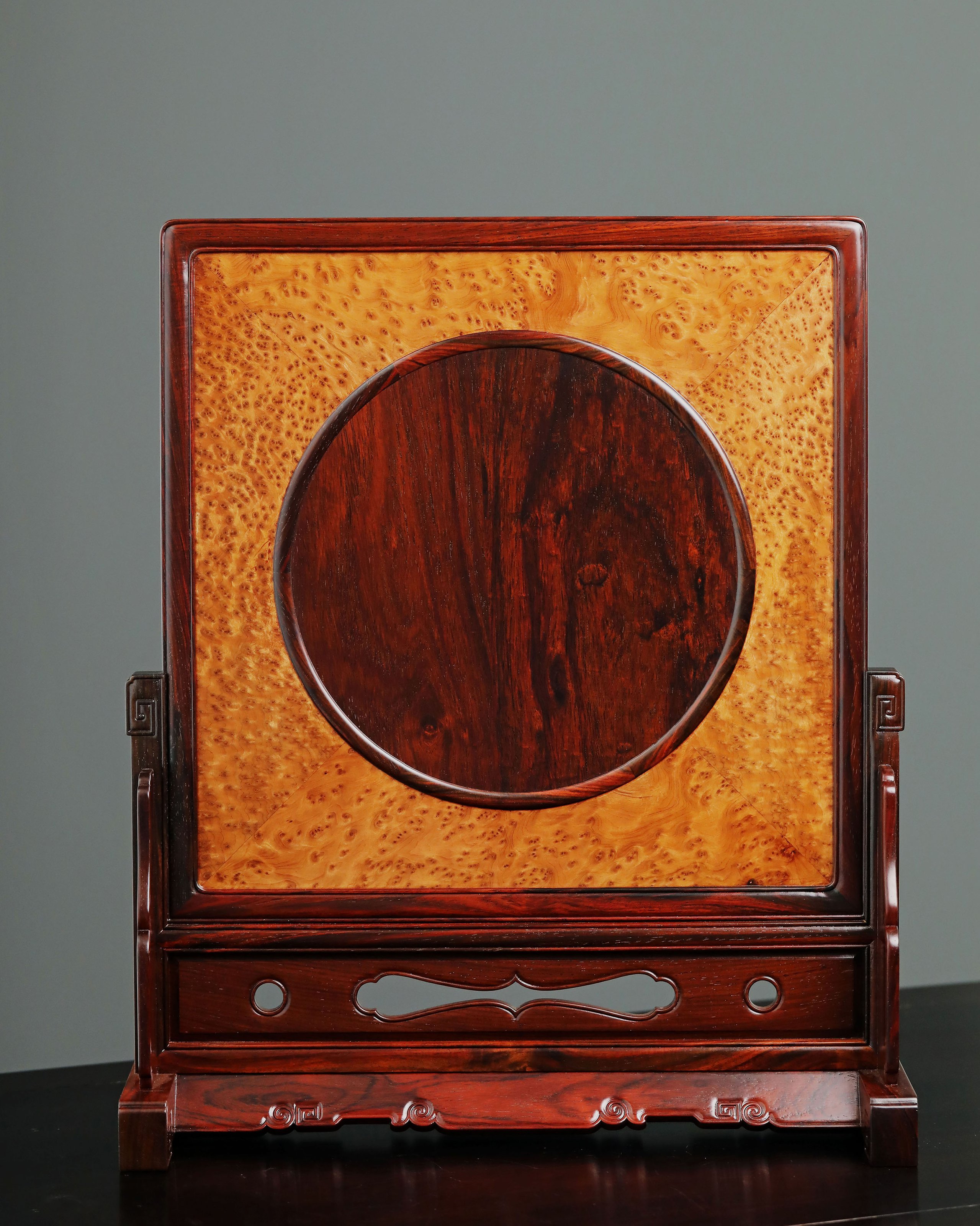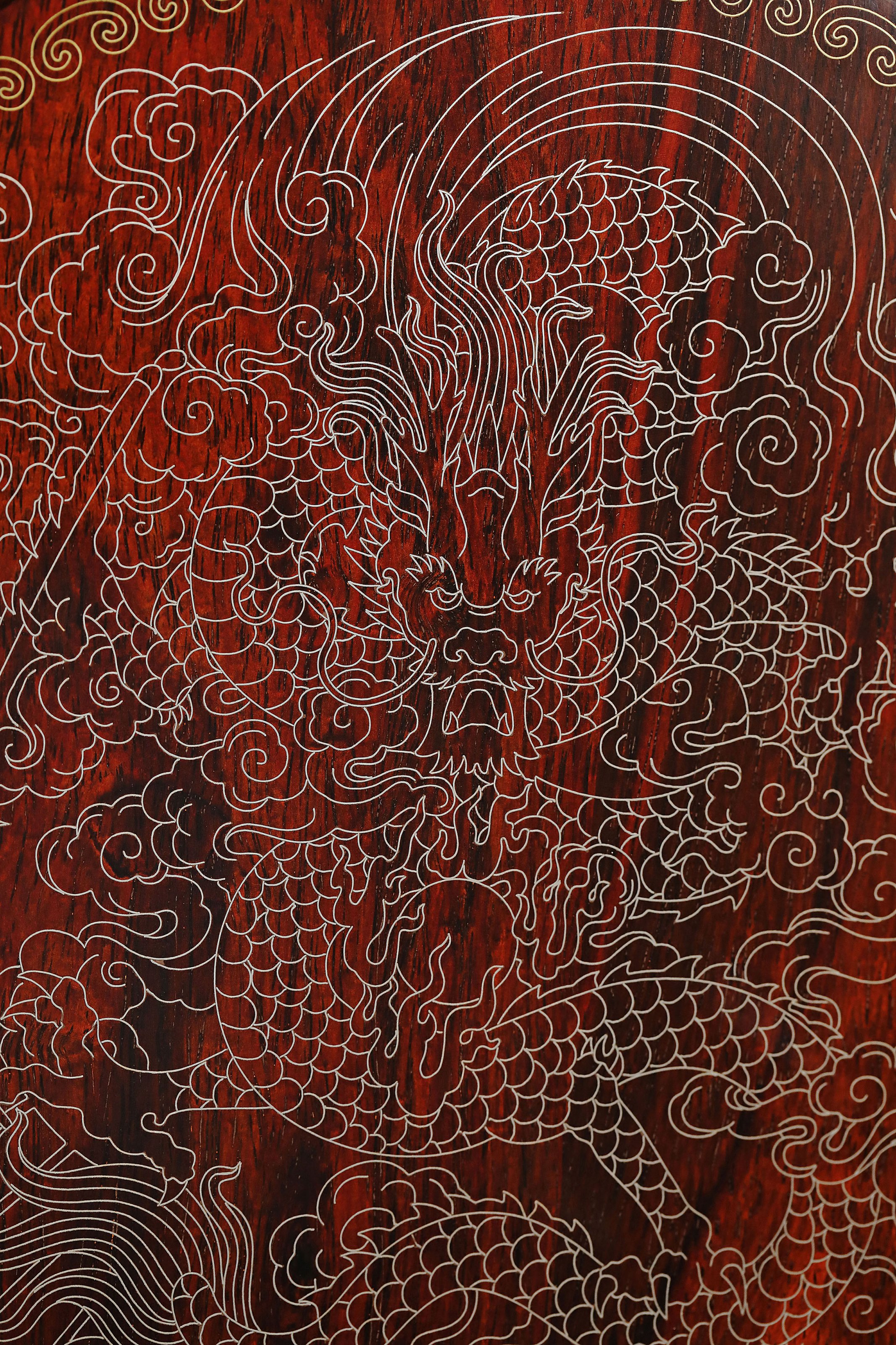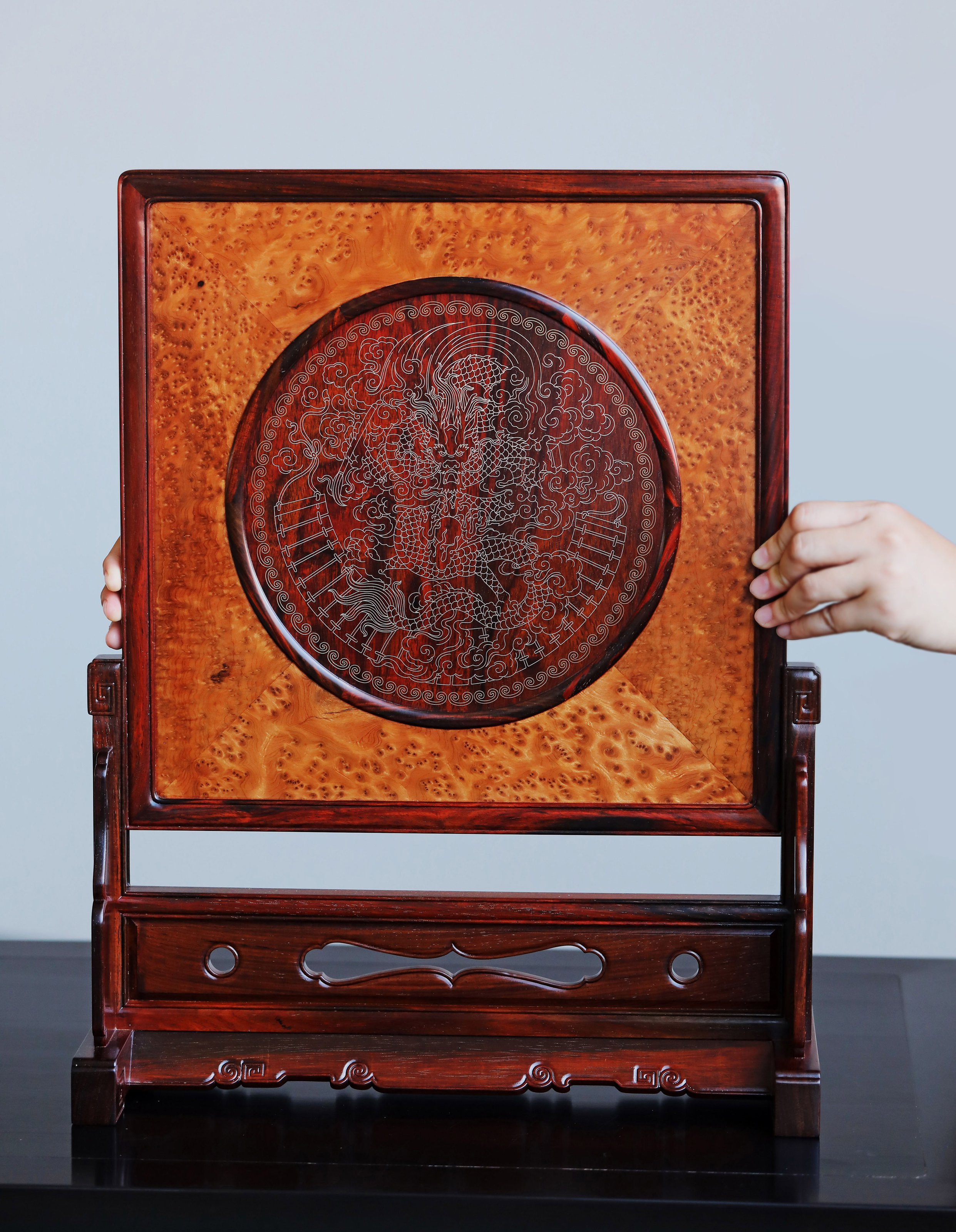 长:40.5cm宽:16.5cm高:48cm 大红酸枝嵌银丝祥龙座屏 大红酸枝制祥龙嵌银丝座屏 非遗镶银丝,紫光檀外框,镶嵌瘤疤料;屏心银丝嵌祥龙图,更涵纳福吉庆寓意。 长:40.5cm宽:16.5 cm高:48cm