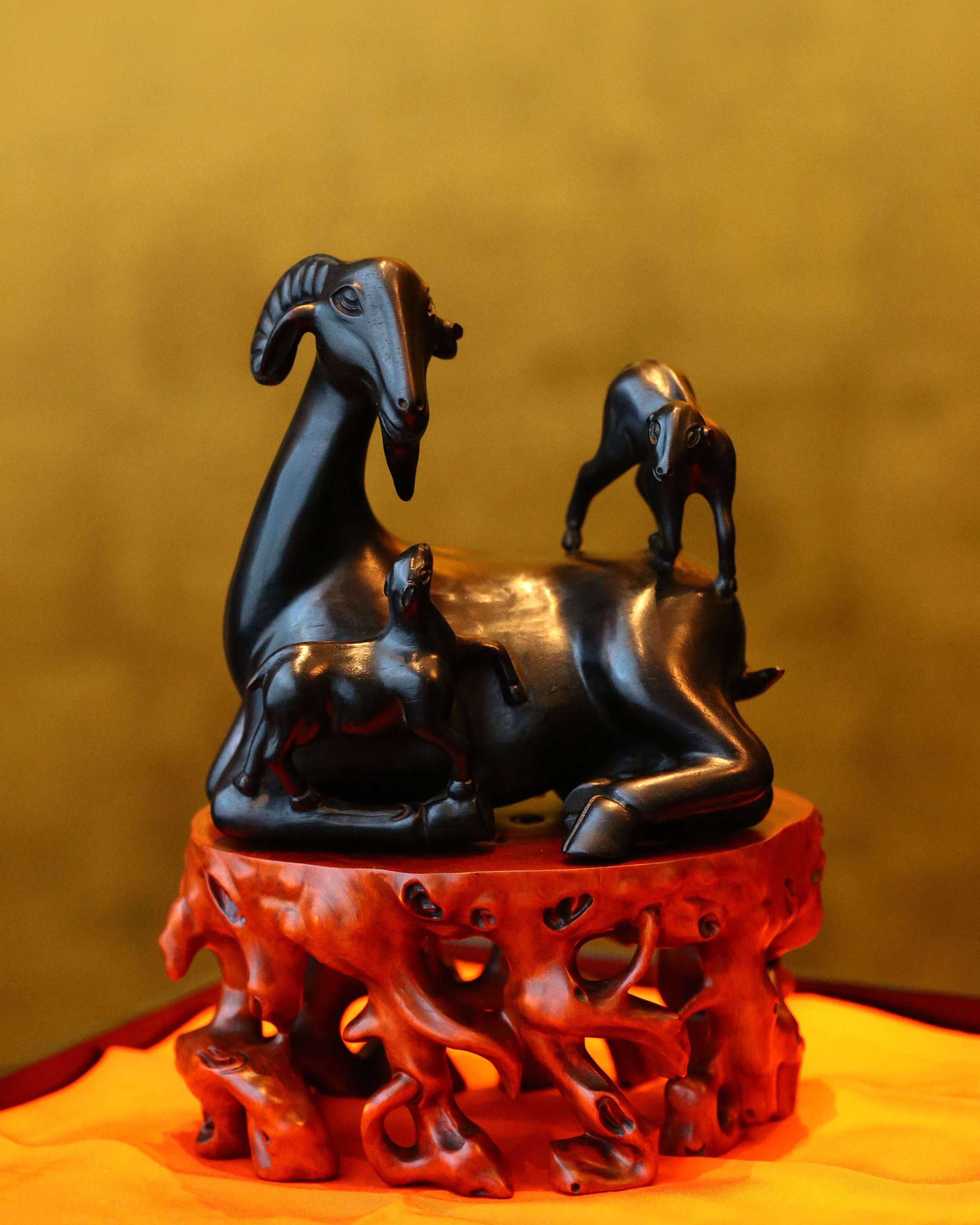 长:14cm 宽:8cm 高:15cm 带座总高:21cm 三阳开泰木雕 圆雕三羊,为子母羊,寓意“三阳开泰”。以紫檀整木圆雕,木质细腻如丝,把握手感极佳,母羊侧卧,两只羔羊围绕身侧,温馨祥和,吉祥美好。底承黄杨木树瘤纹木座,温润的色泽与母子羊所用紫檀的沉穆相得益彰。