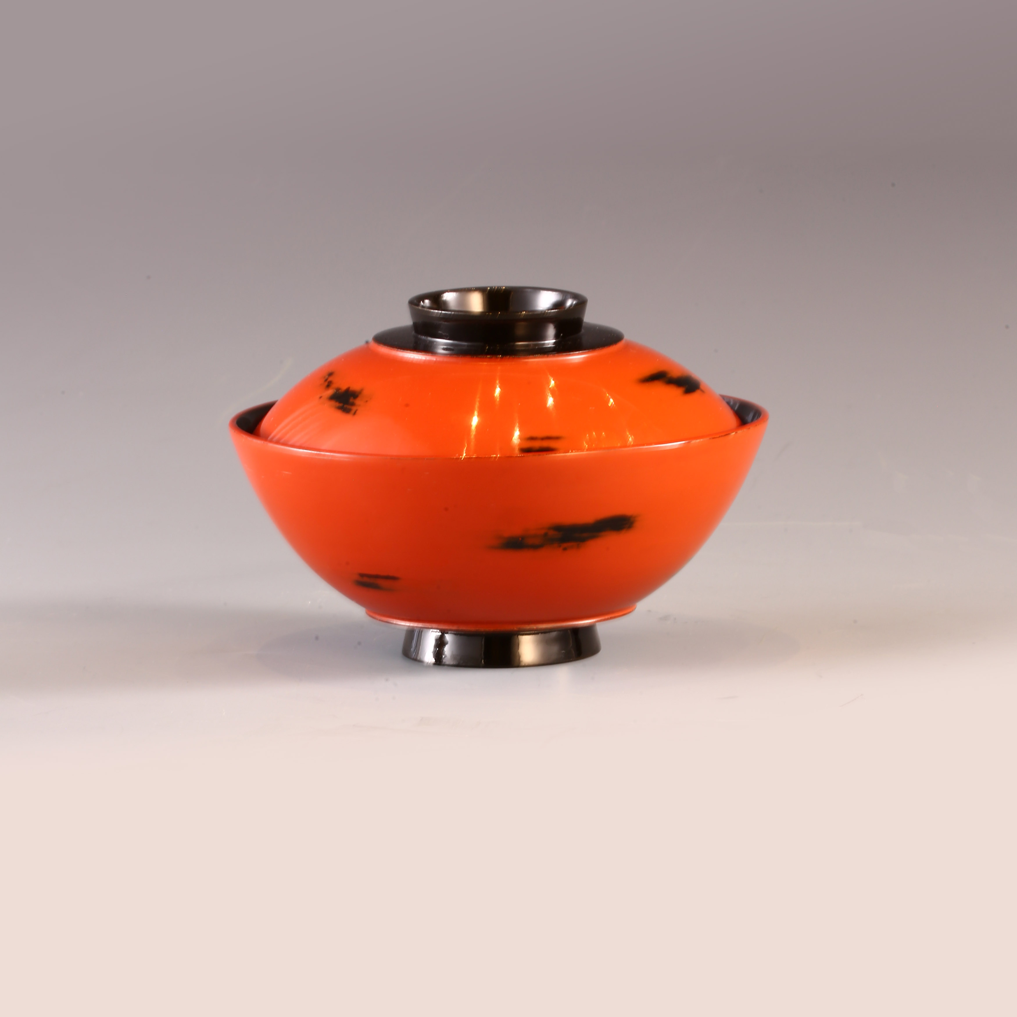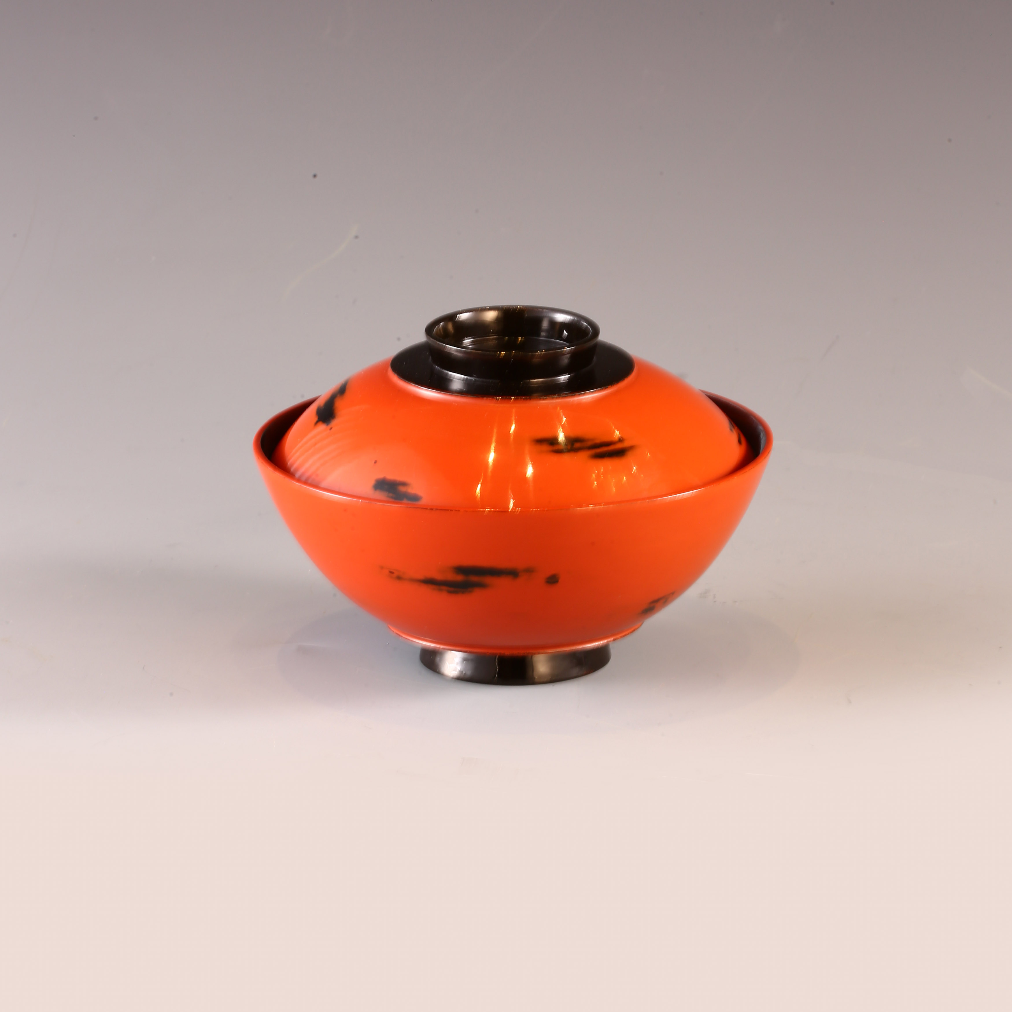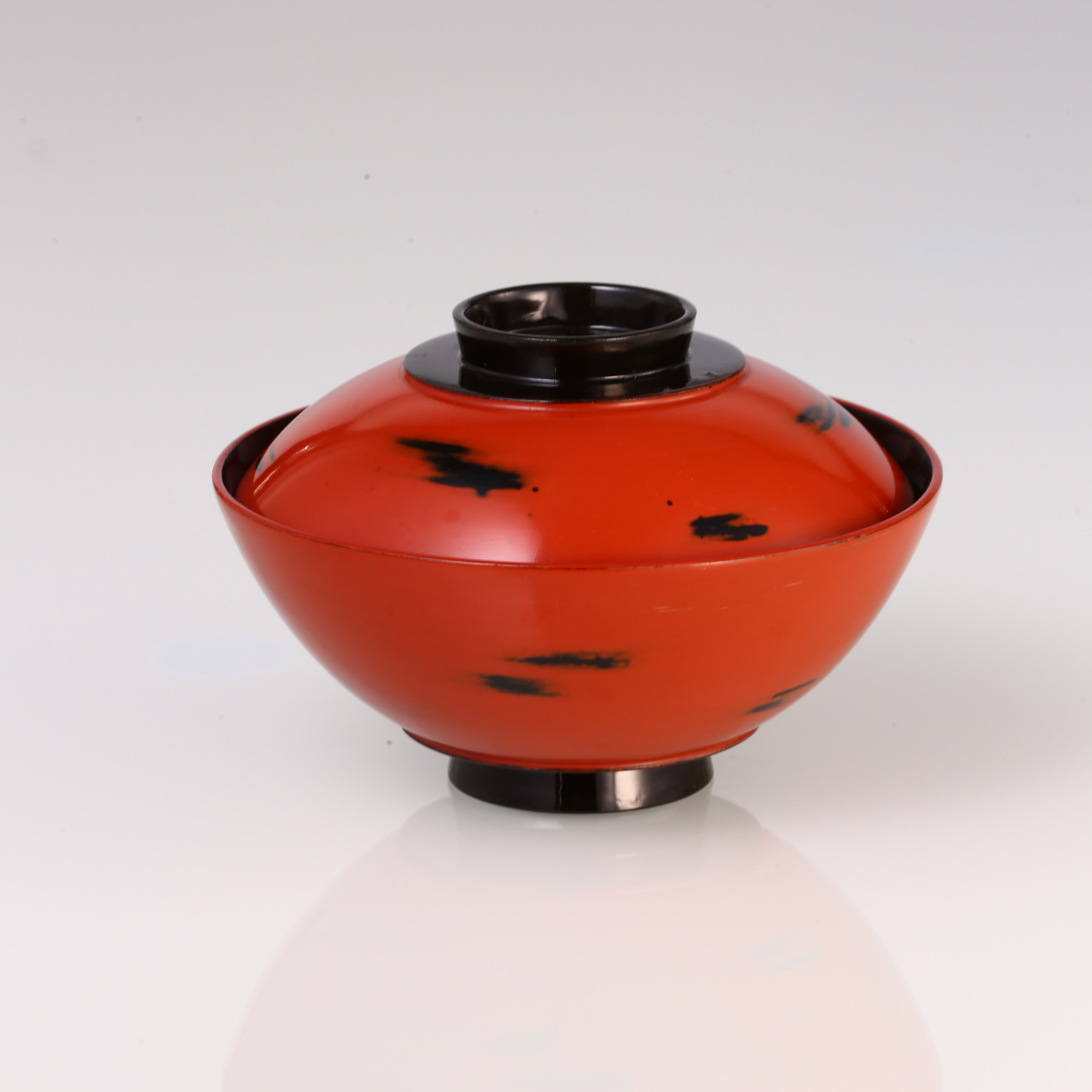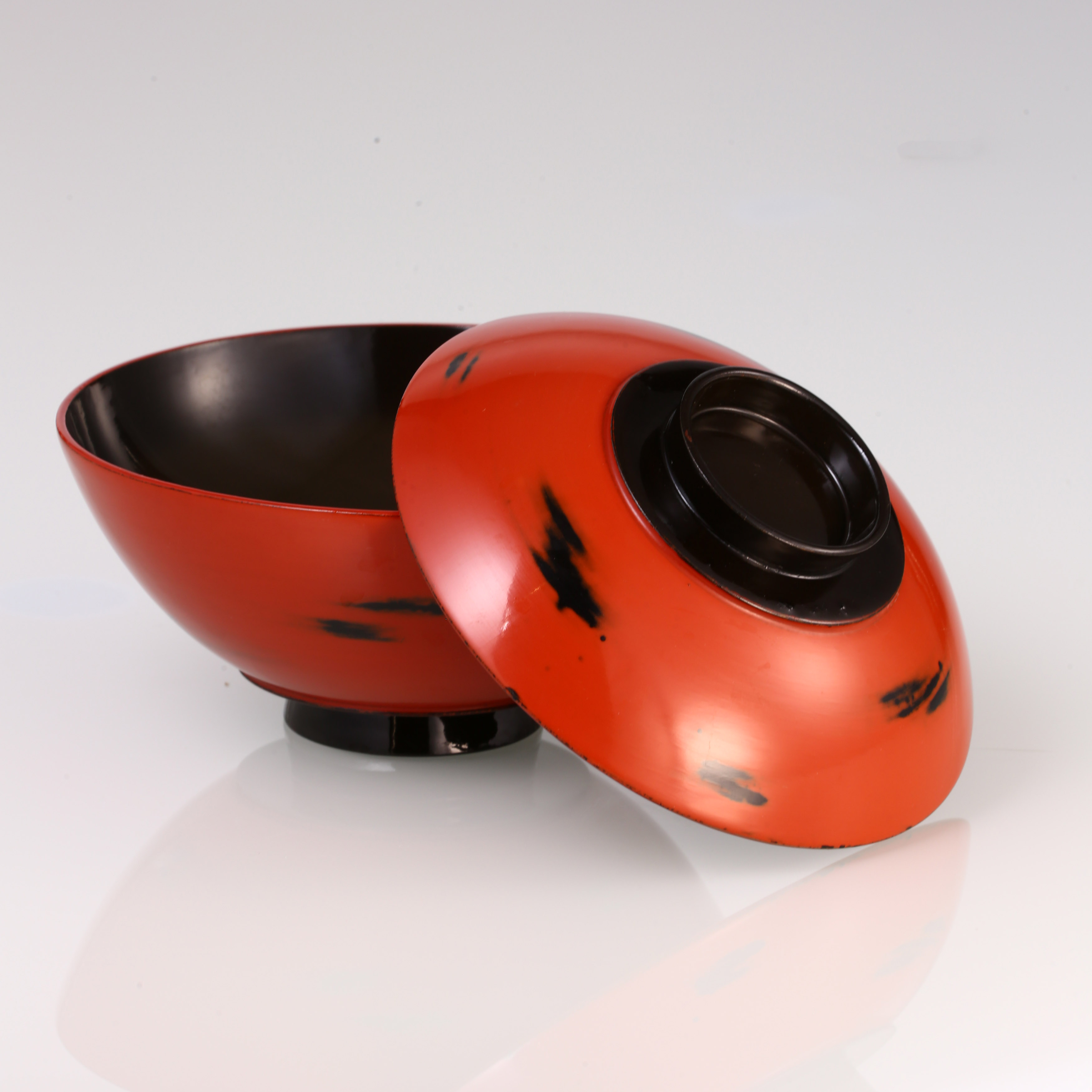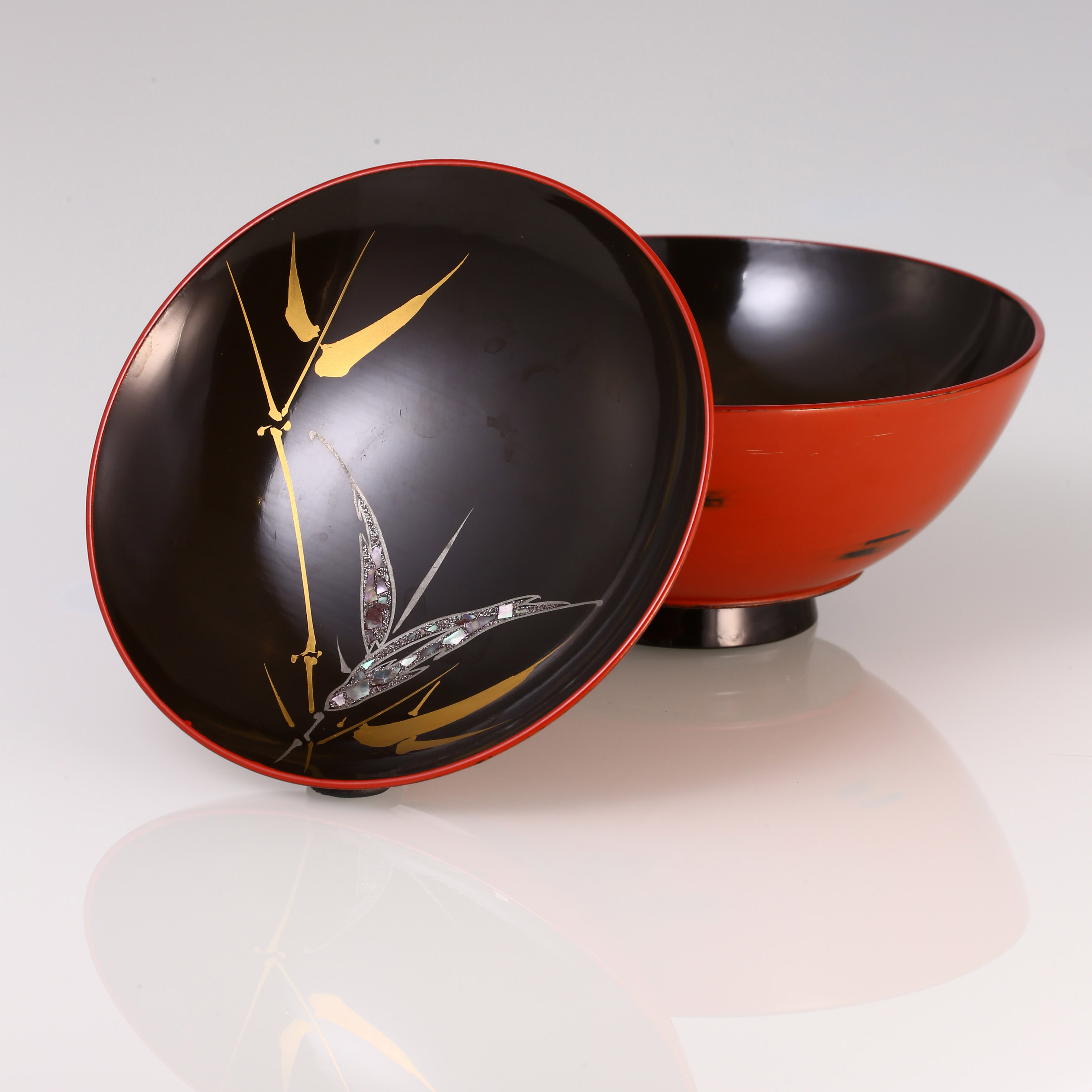 根来塗,内绘描重金嵌螺钿,修竹三片,挥洒飘逸。