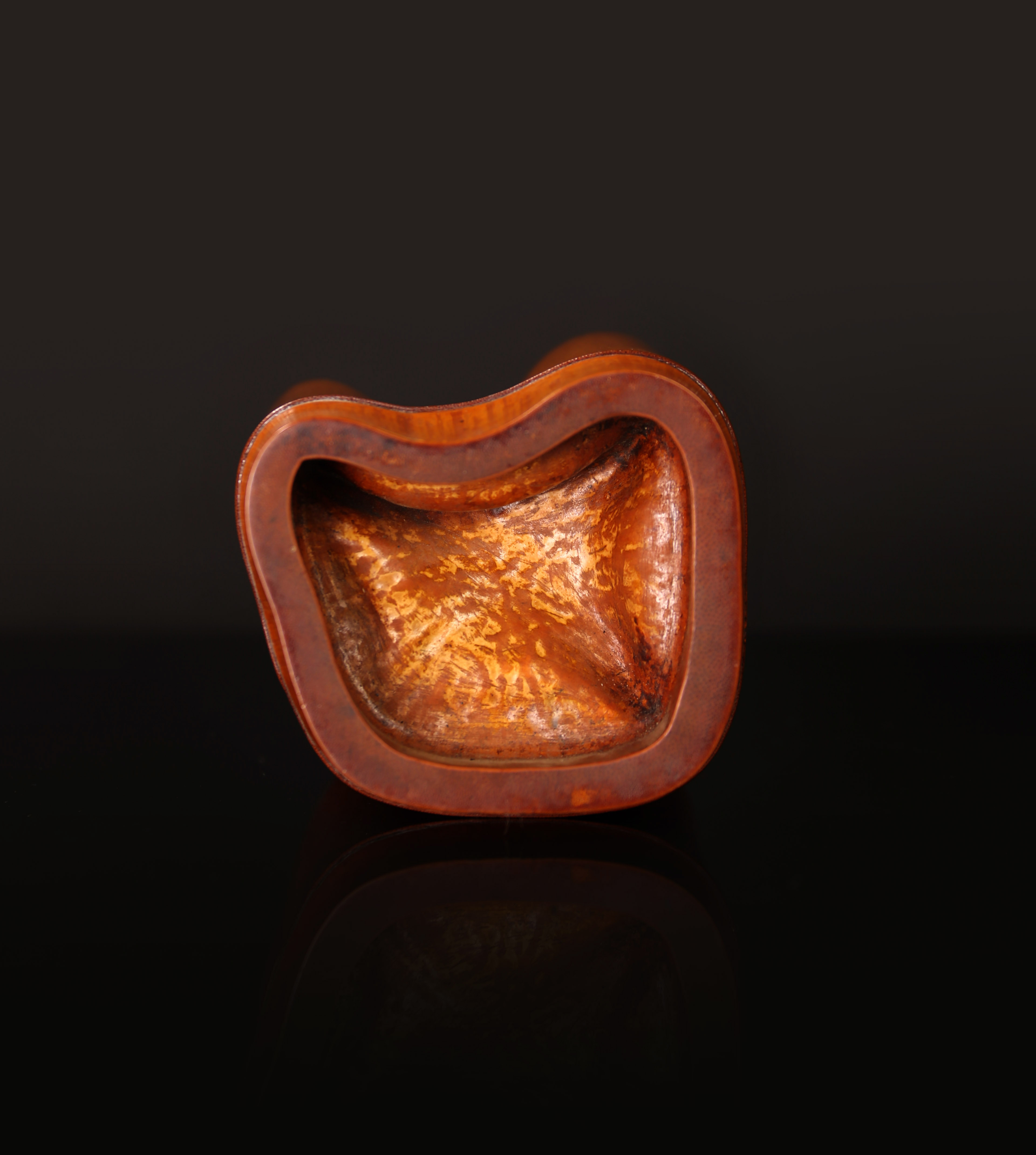 取竹之一节成器,方圆有秩,整器光素,仅底部有一突节,竹质坚韧致密,皮色红润,是为赏心悦目之案上雅器。