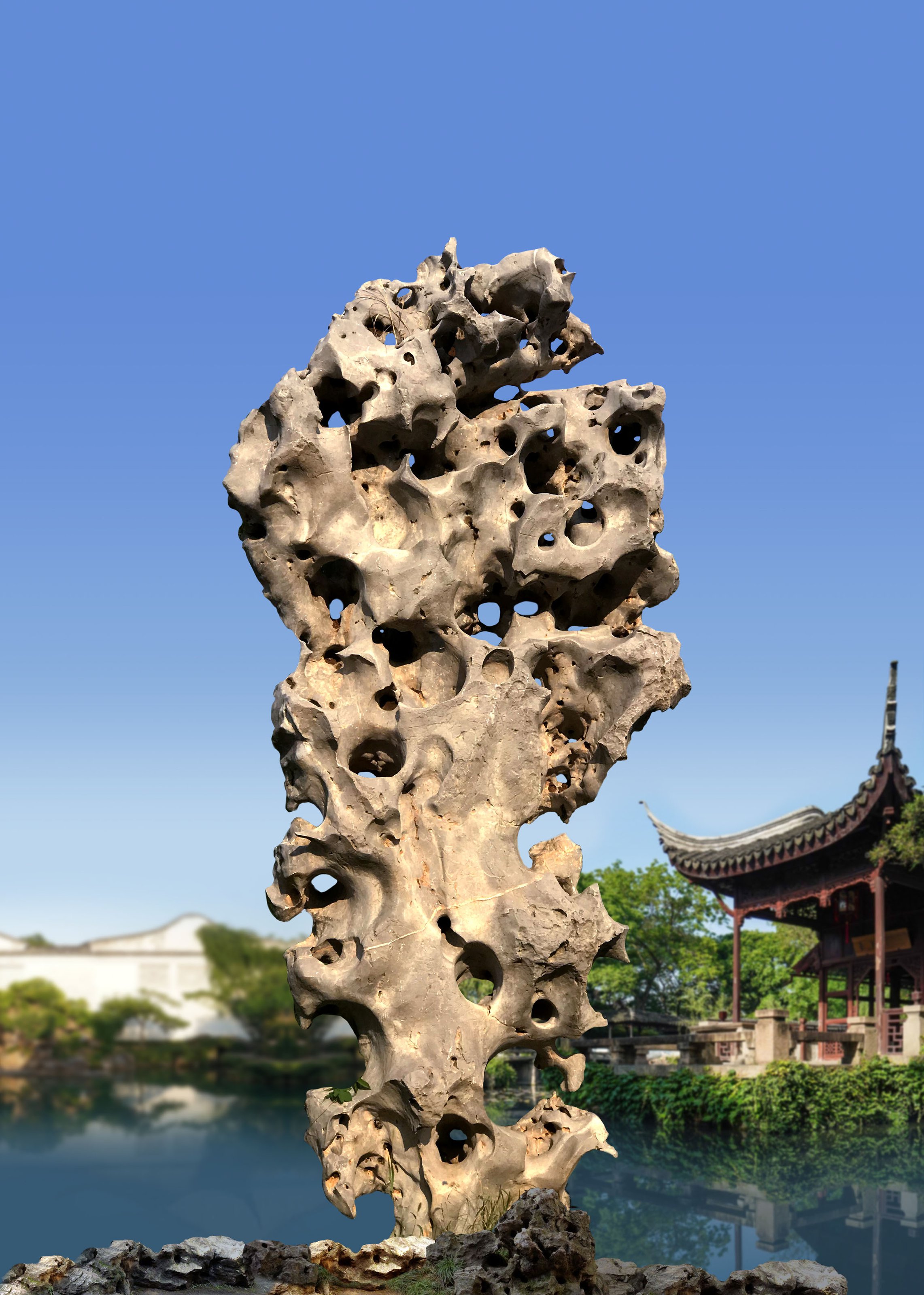 质地细腻缜密,表面突隆嶙峋,孔洞遍布,穿眼层叠贯通,石色白中泛黄,如蹙浪堆雪。