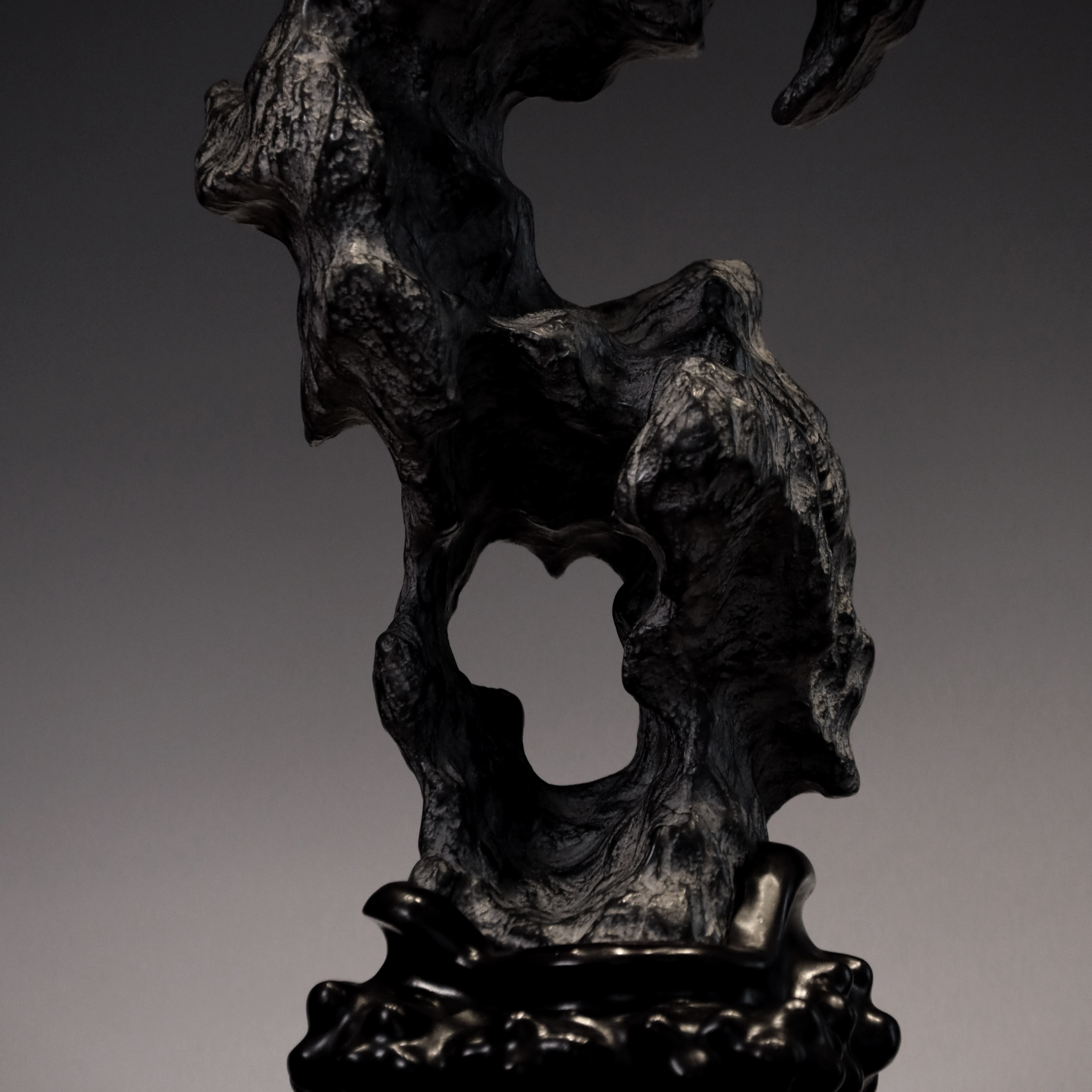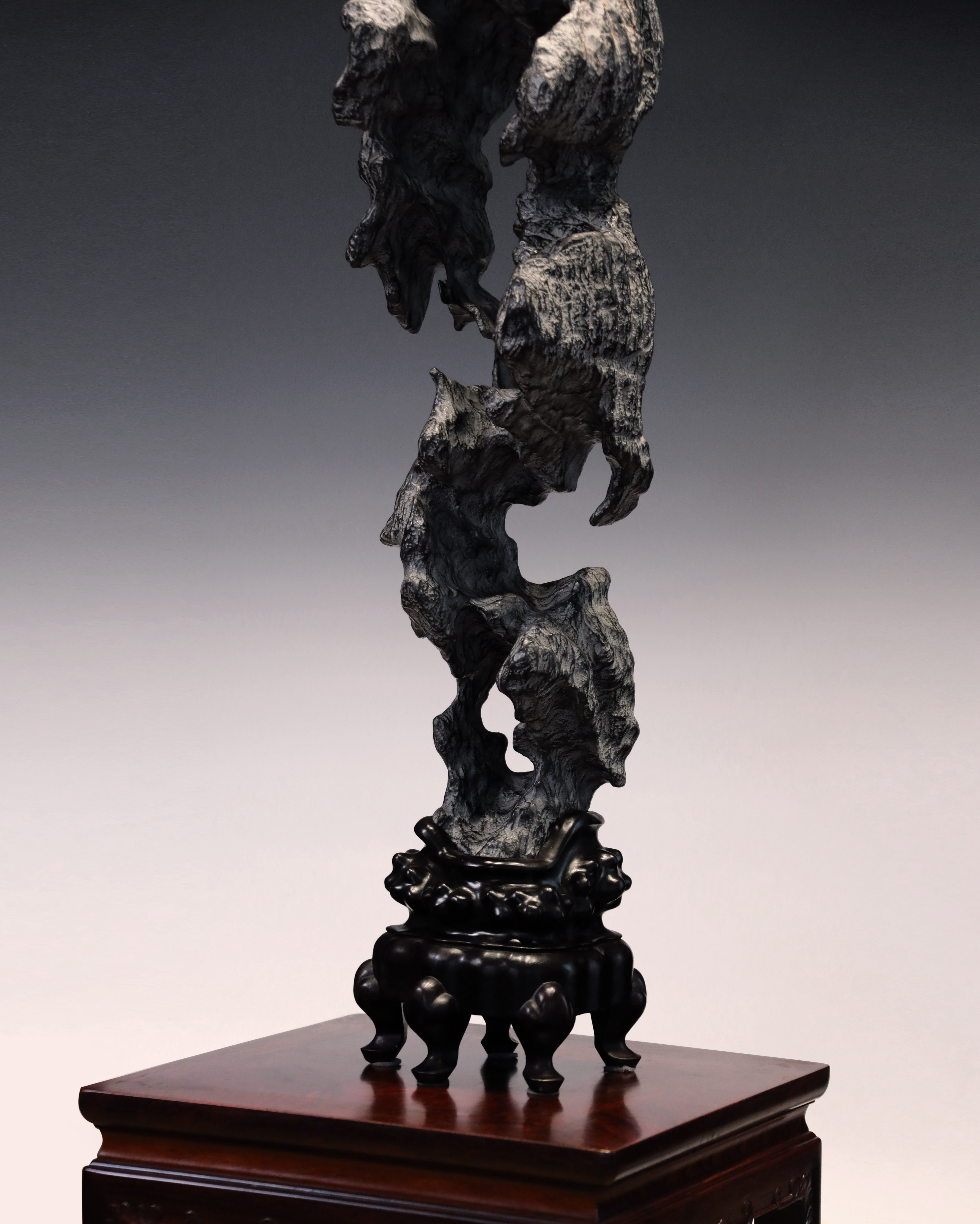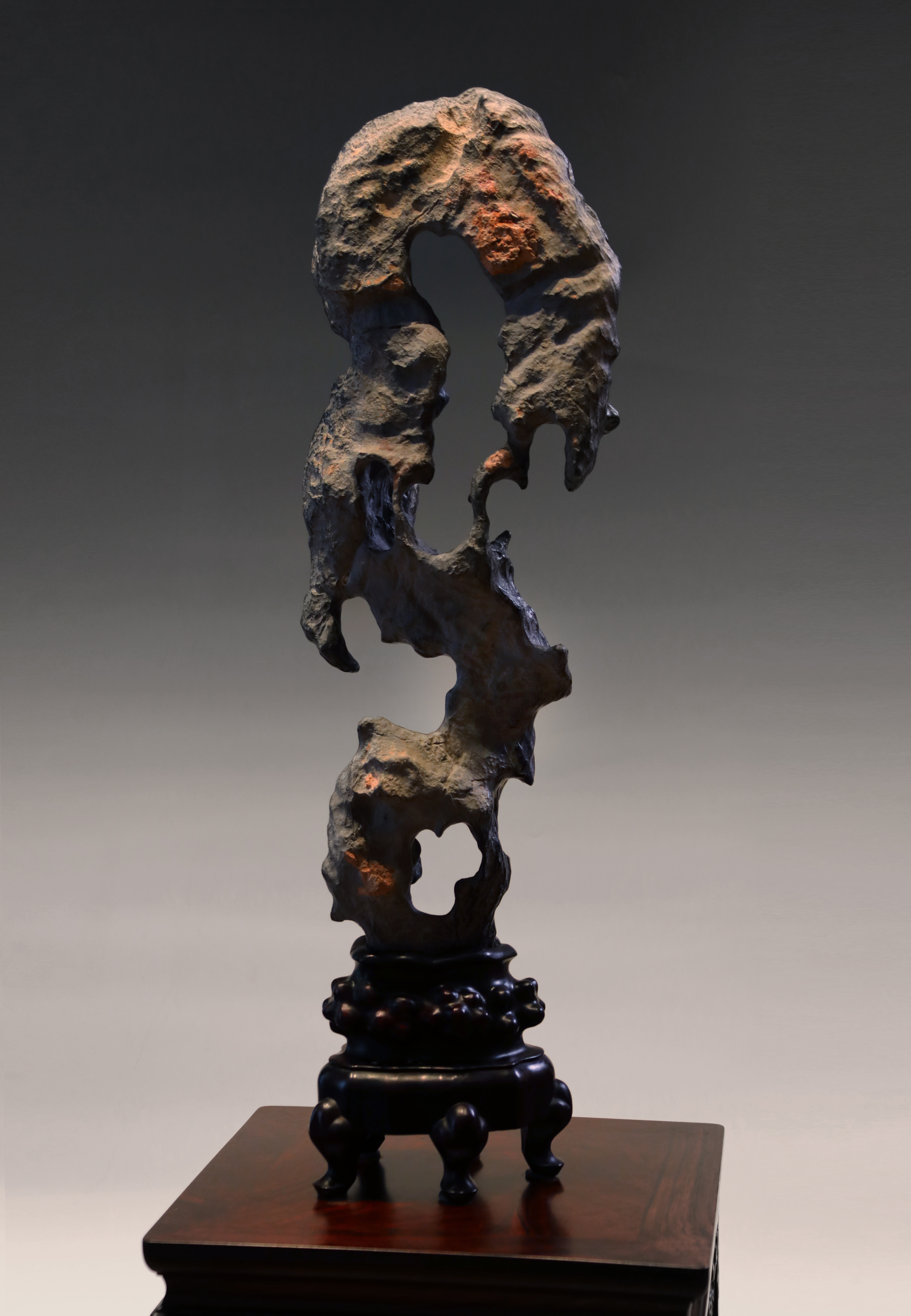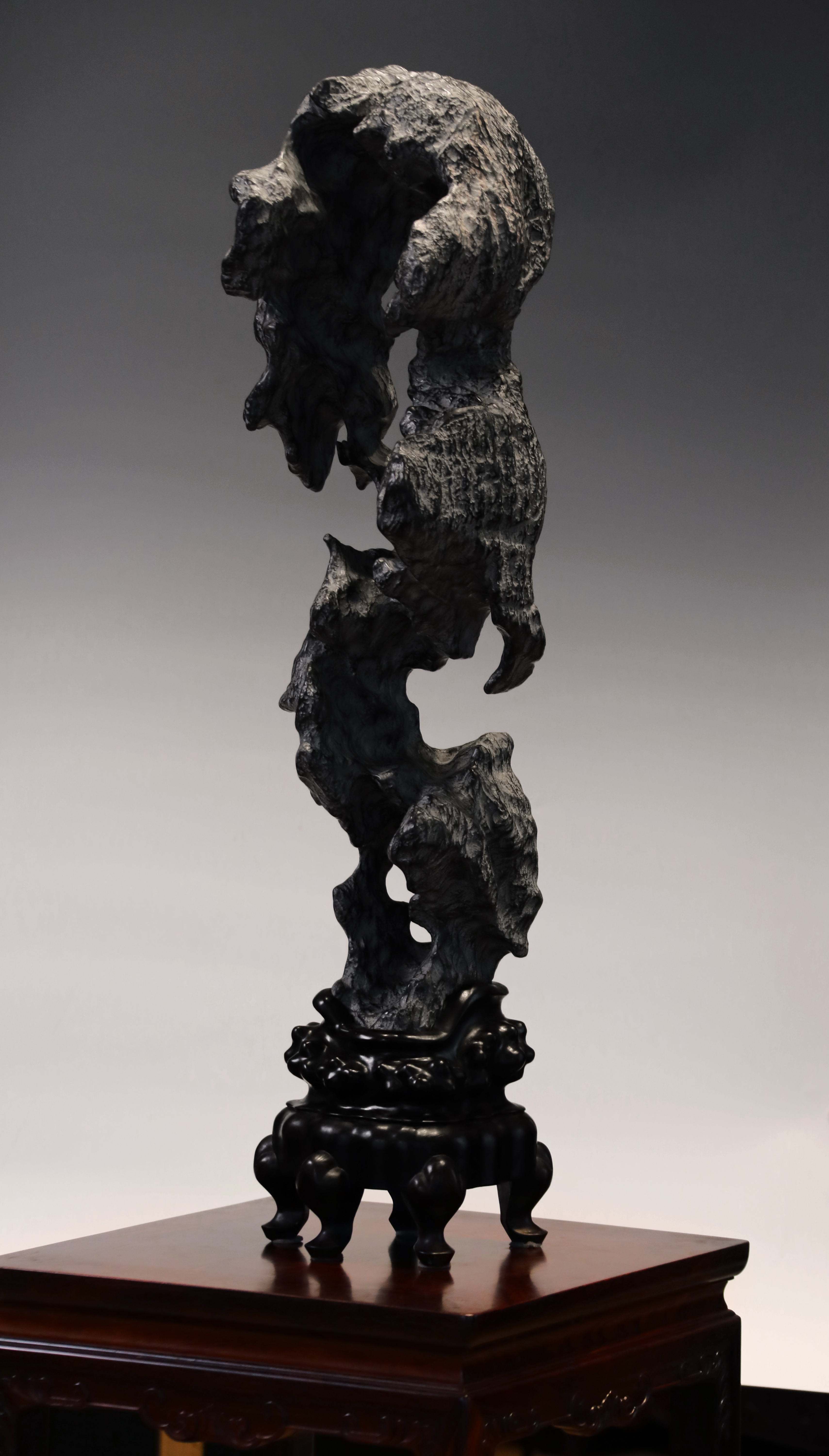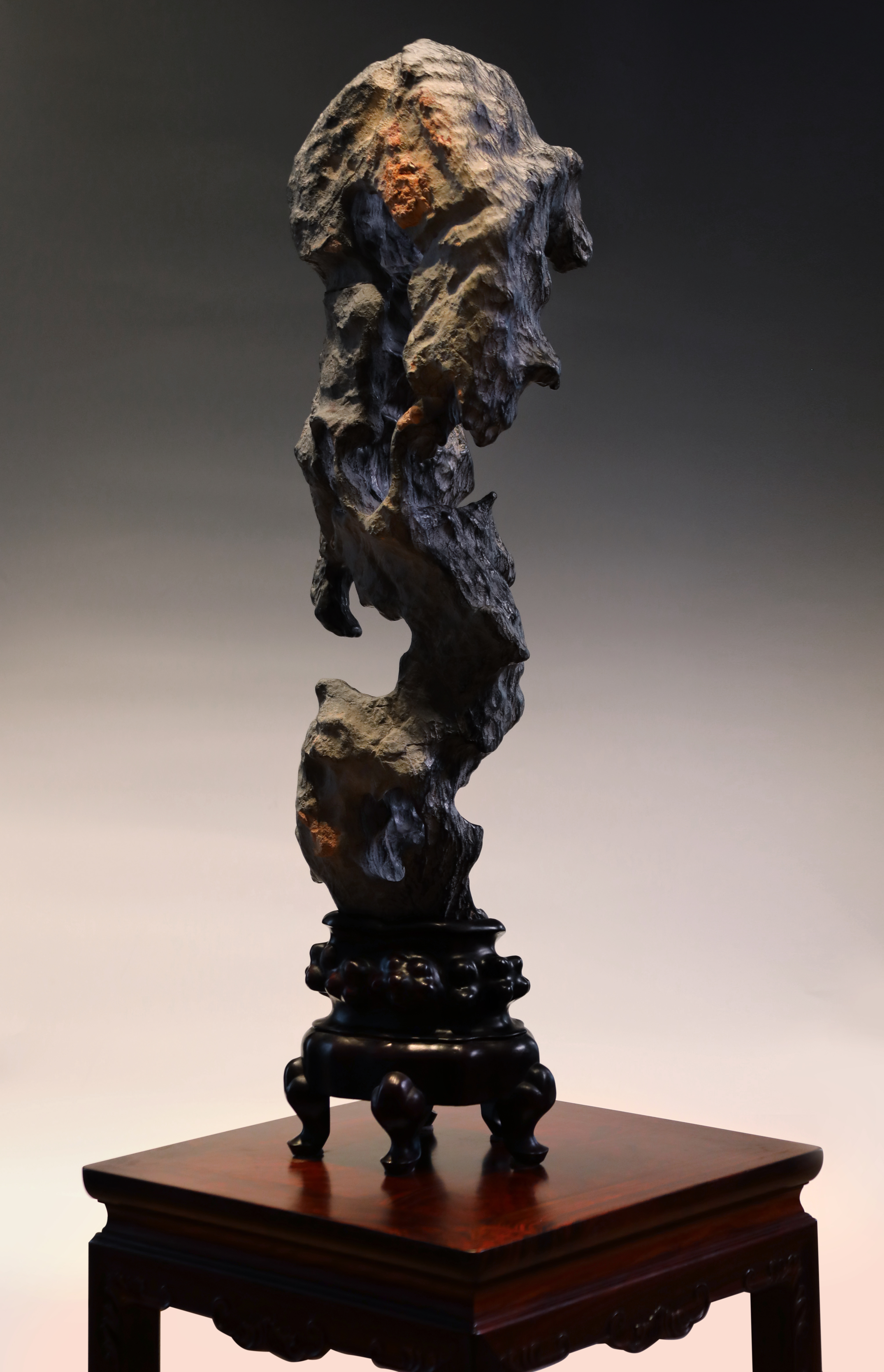 总高:96cm宽:30cm厚度:20cm 出尘———灵璧石供石 灵璧石立峰供石,洞壑窈窕,高耸挺拔,独具凌然之气。崚嶒突兀,沟壑纵横,色如墨玉,质地坚硬,叩之泠泠然。石形秀雅俊逸,疏风漏月之姿,令人遐思。下承红木座托。灵璧石是文房清供,自古为文人所钟爱。