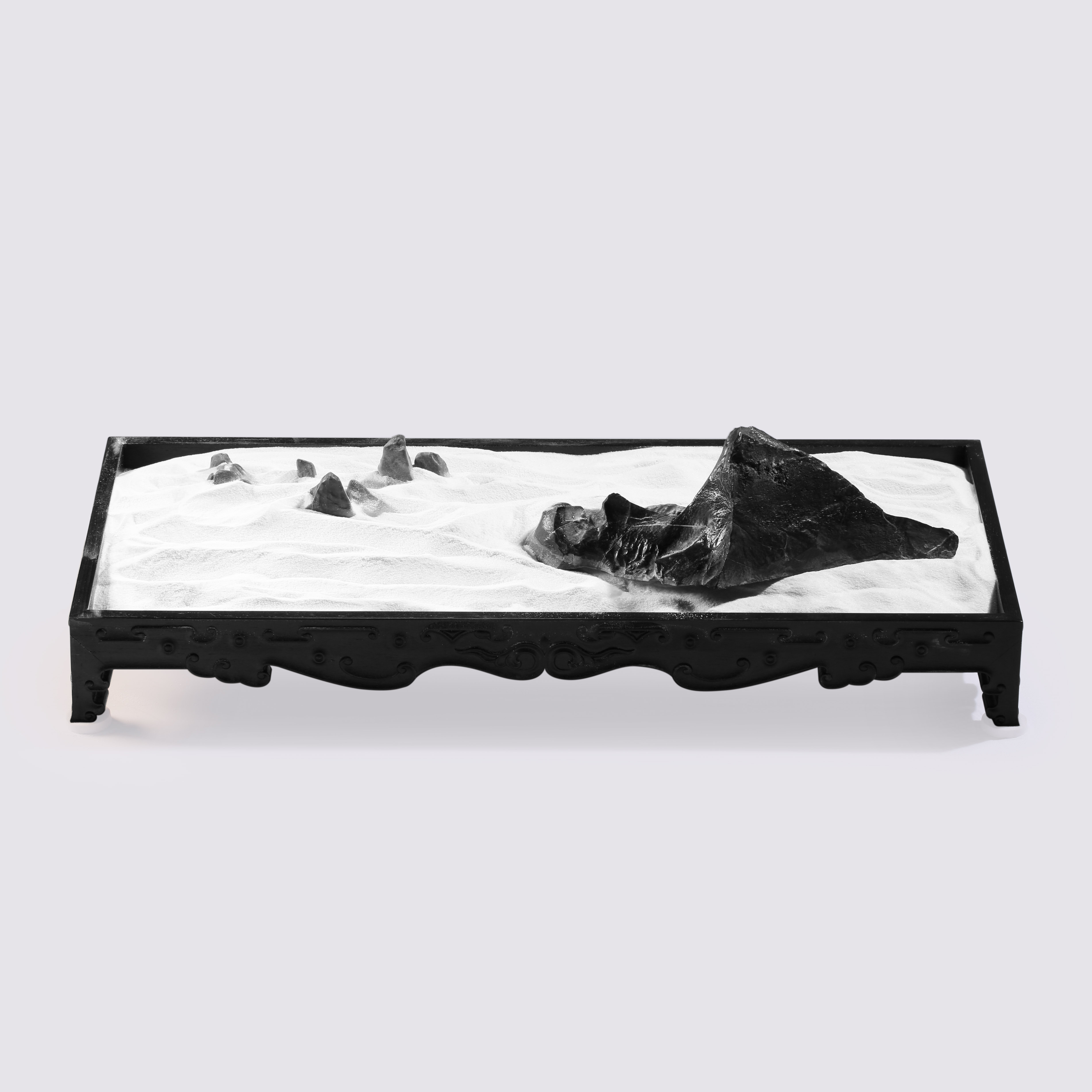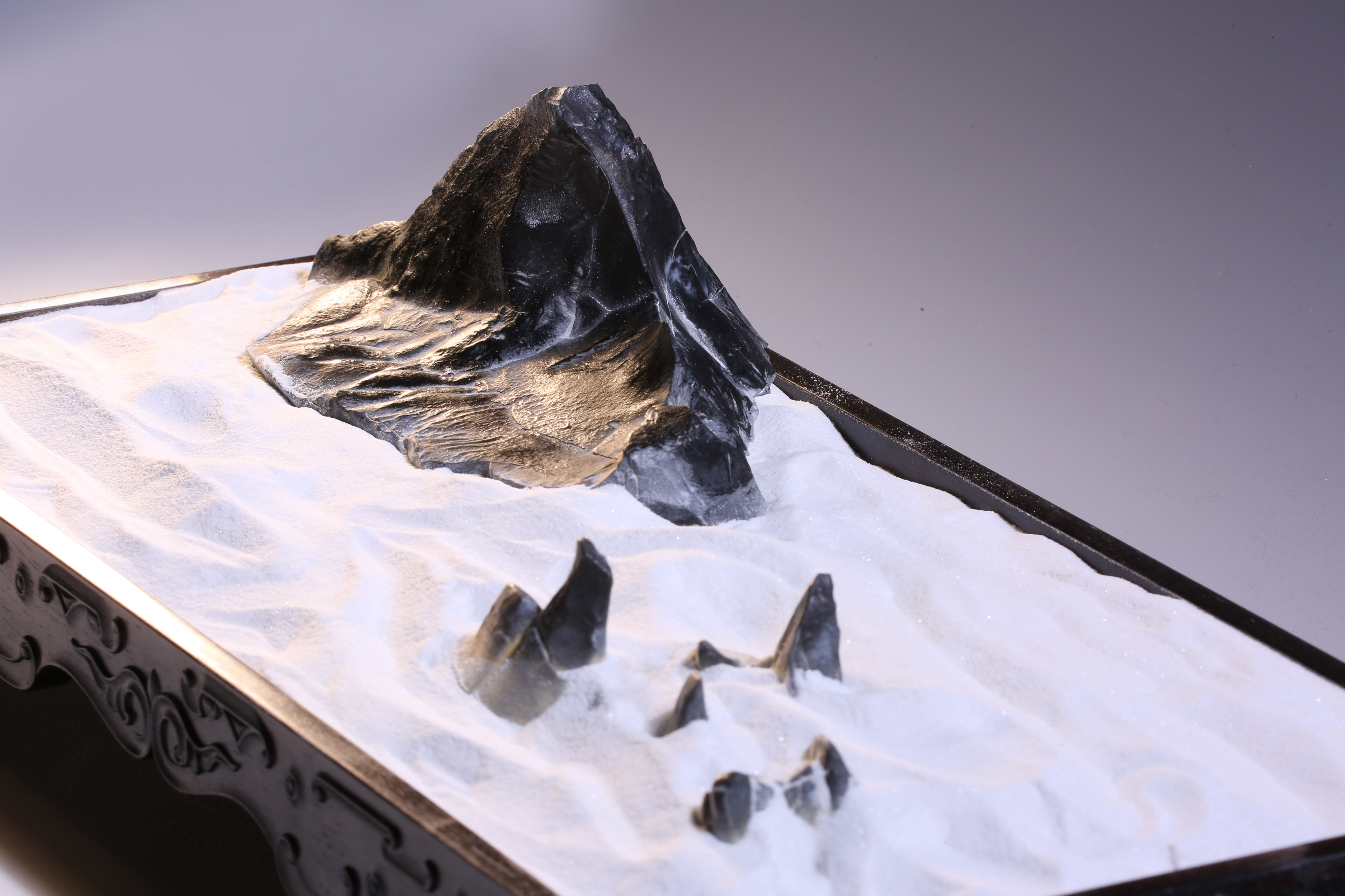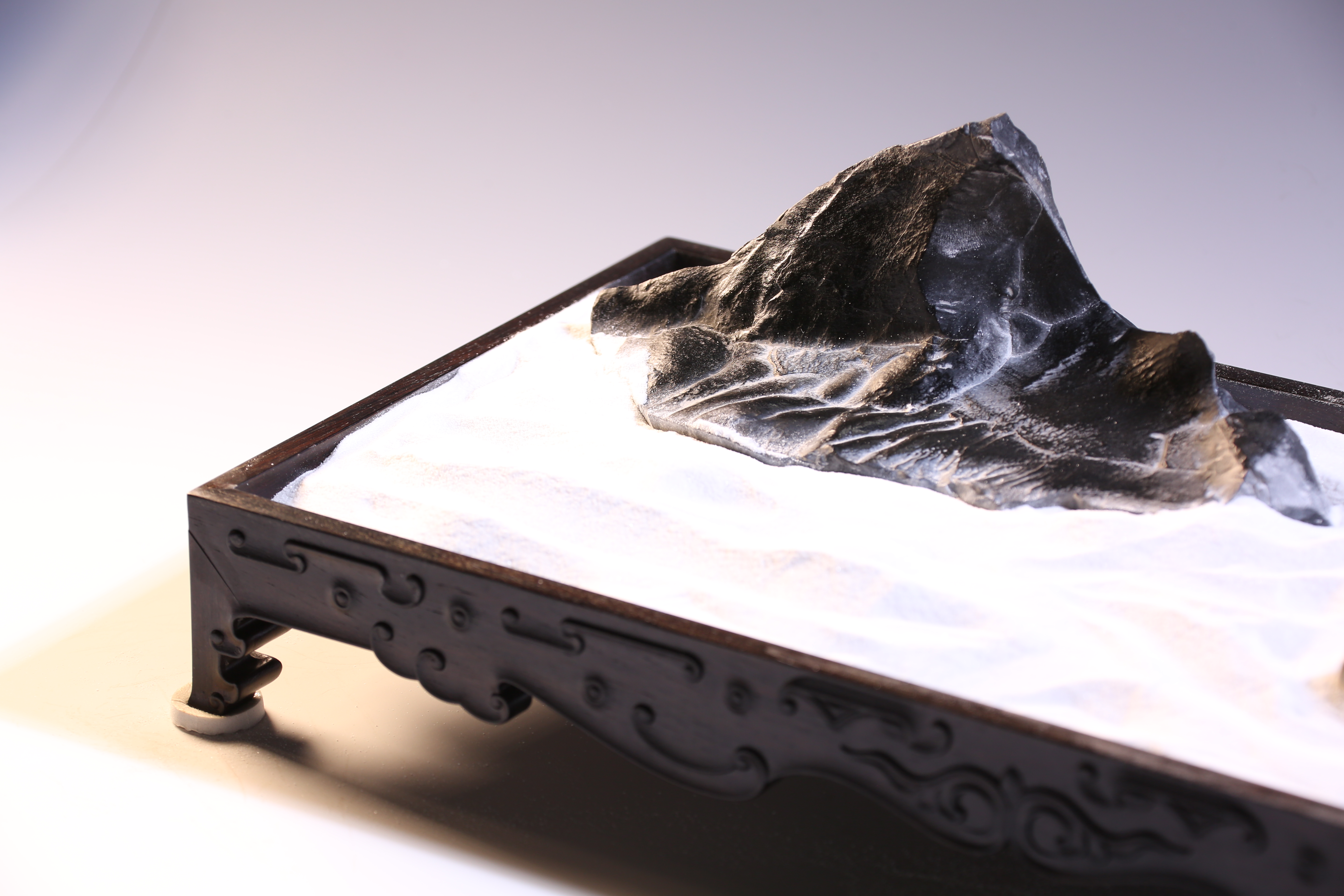 盆长:41.5cm宽:19cm高:5cm石高:7cm 孤峰云天外 灵璧石盆景 玄黑山峰耸立,崖壁料峭,雄浑之势,细白砂仿烟云缥缈,环峰而绕,周缘矮峰仅露峰顶,是谓“孤峰云天外”之意境。专配木质方形承盘,卷云纹,与盆中景致相得益彰。