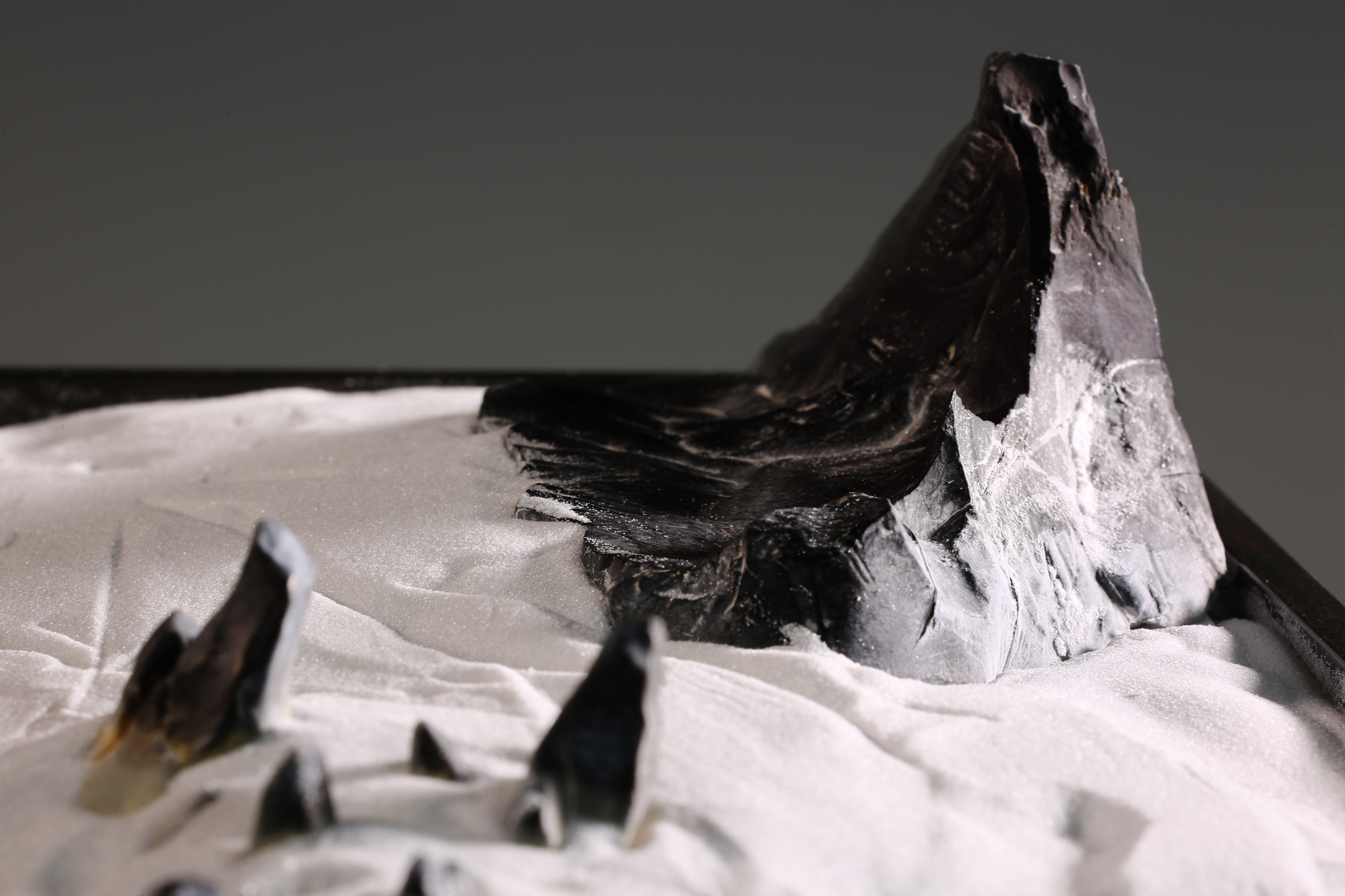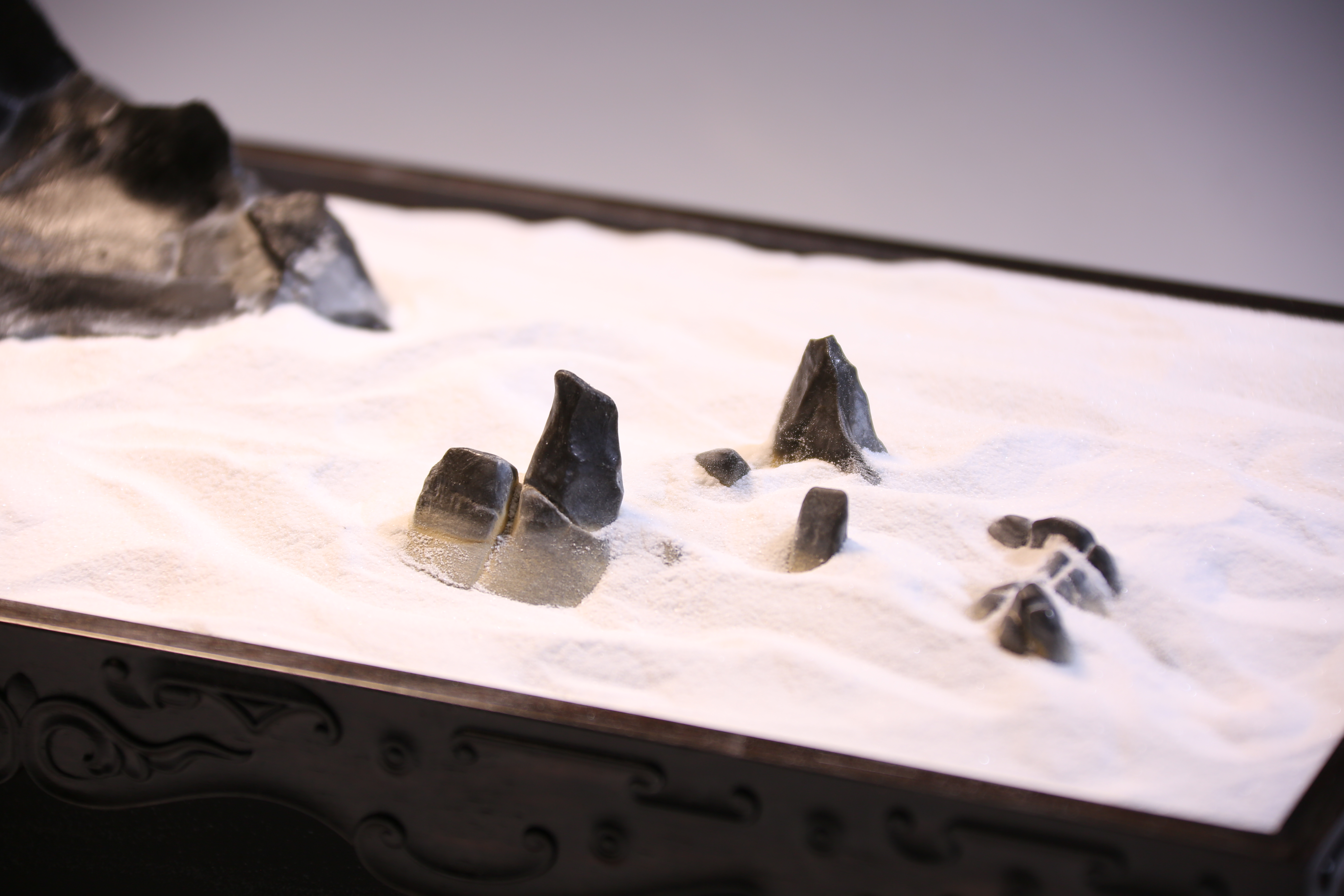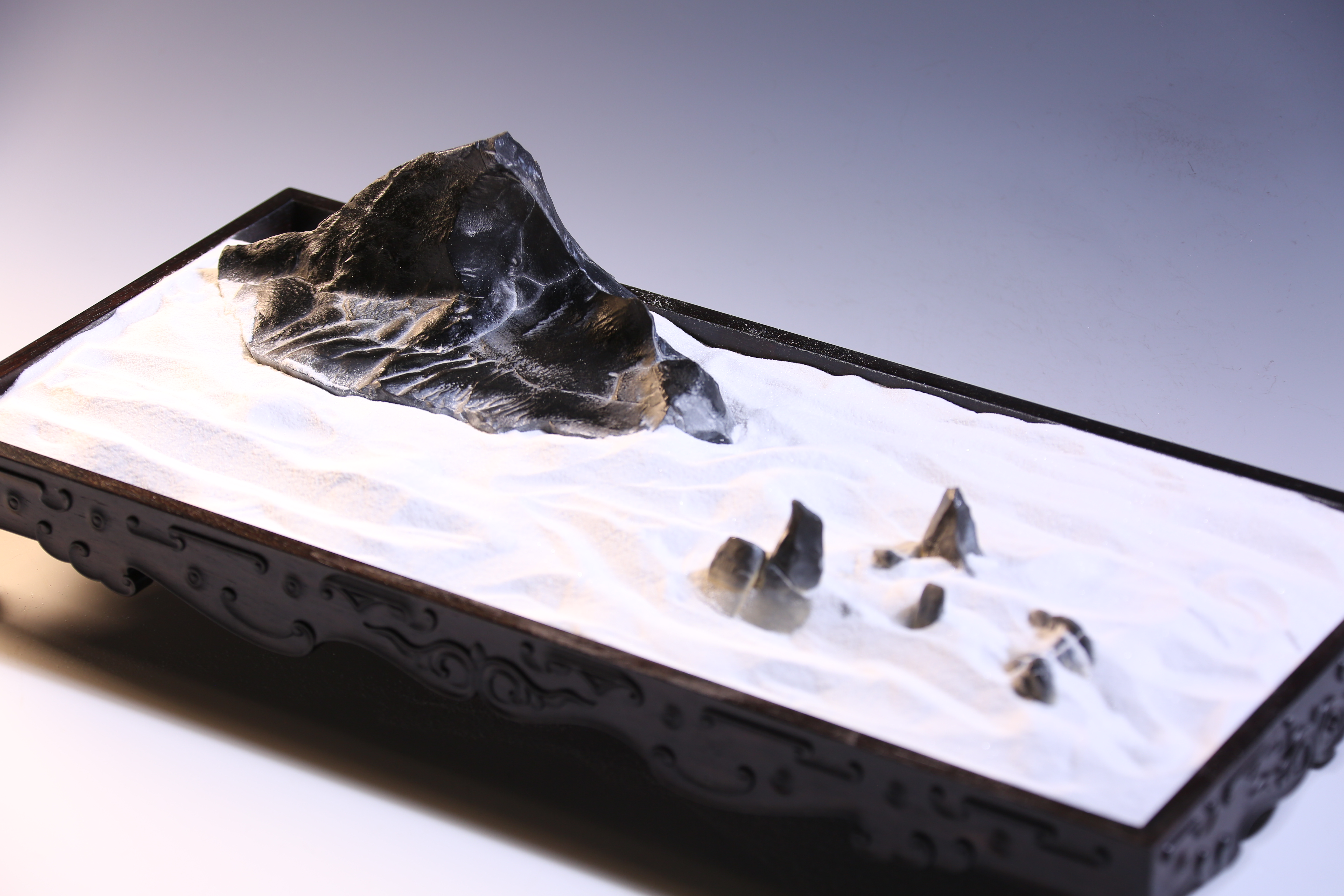 盆长:41.5cm宽:19cm高:5cm石高:7cm 孤峰云天外 灵璧石盆景 玄黑山峰耸立,崖壁料峭,雄浑之势,细白砂仿烟云缥缈,环峰而绕,周缘矮峰仅露峰顶,是谓“孤峰云天外”之意境。专配木质方形承盘,卷云纹,与盆中景致相得益彰。