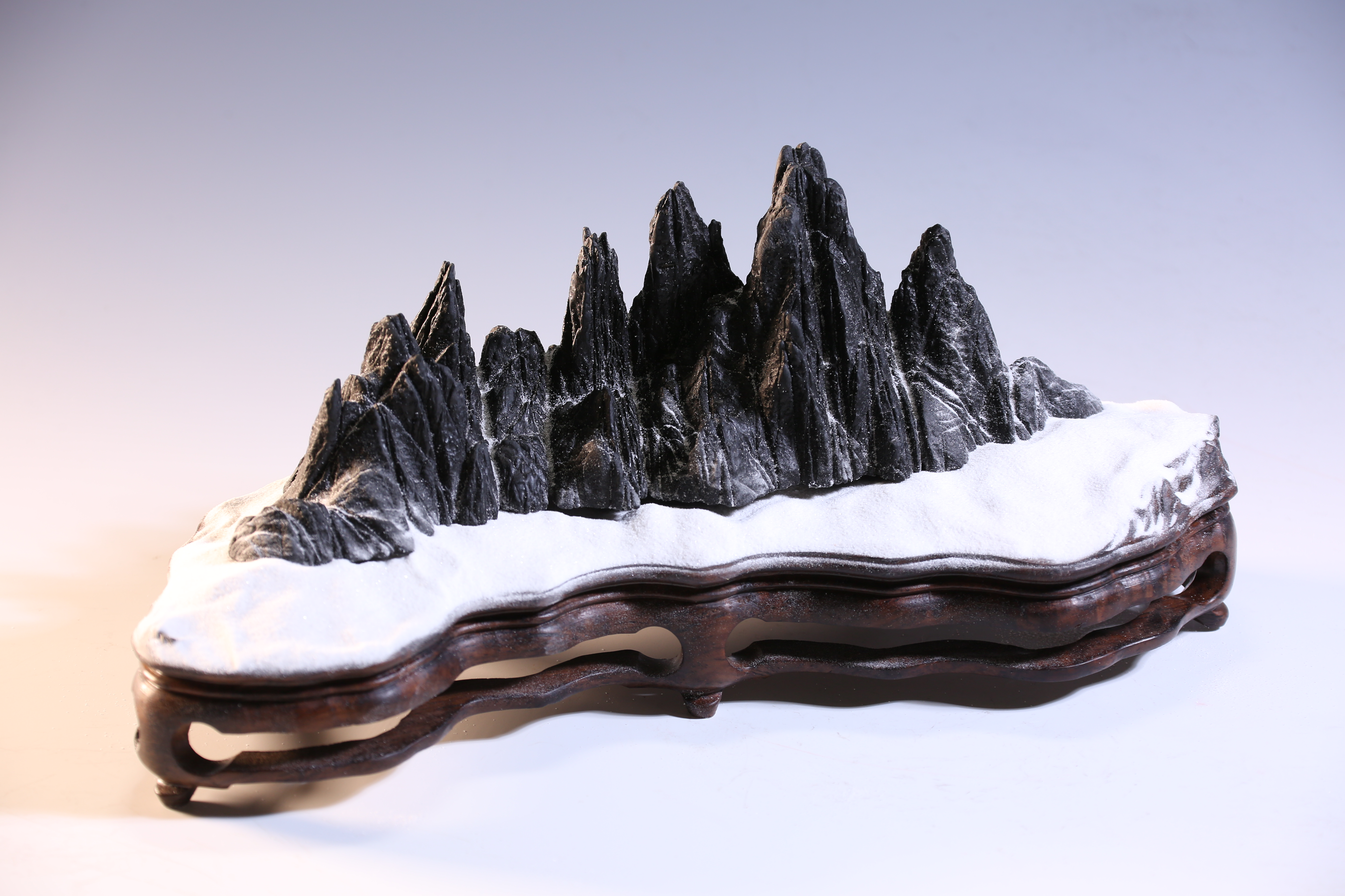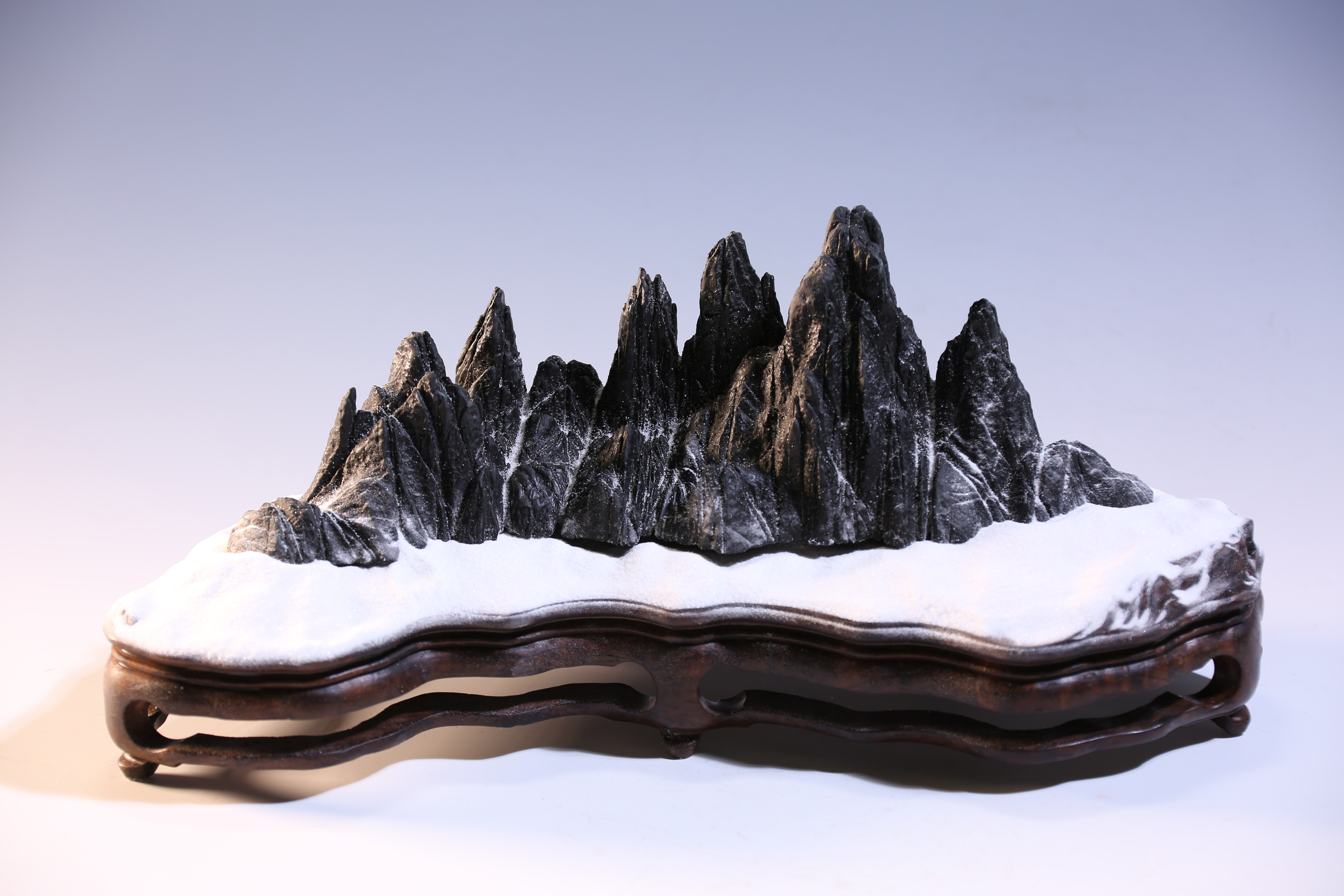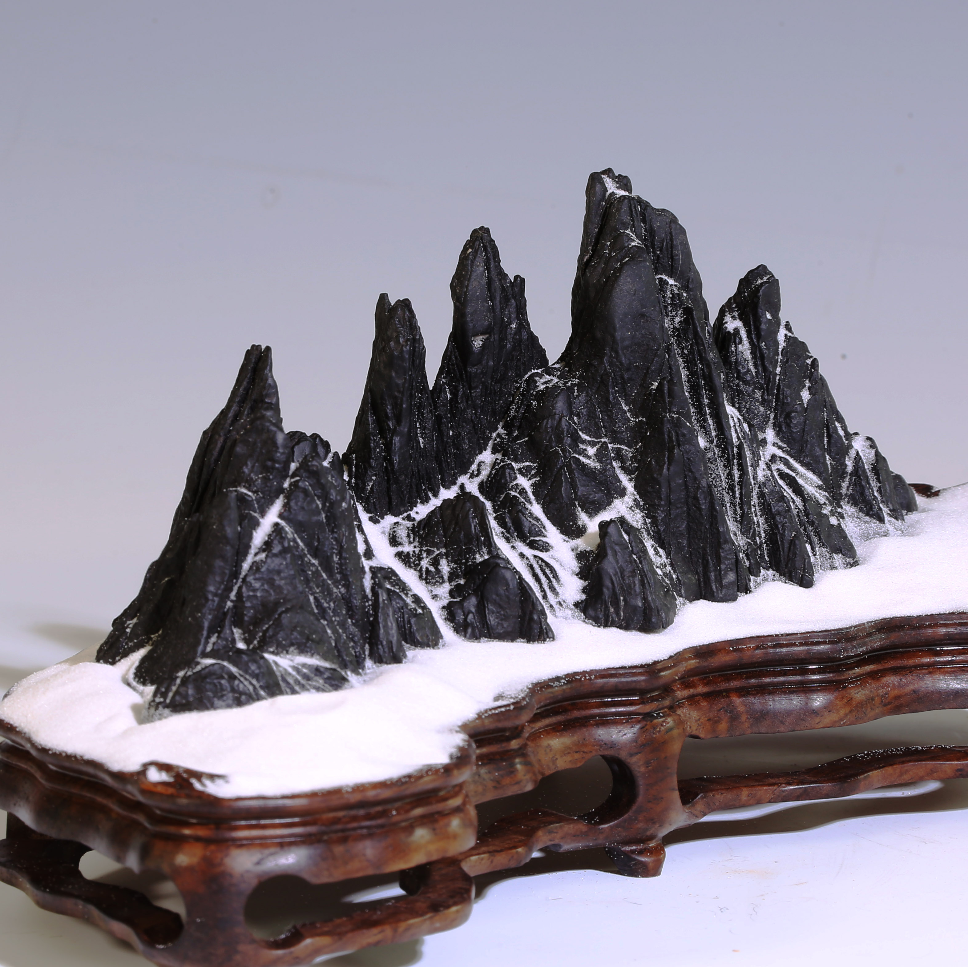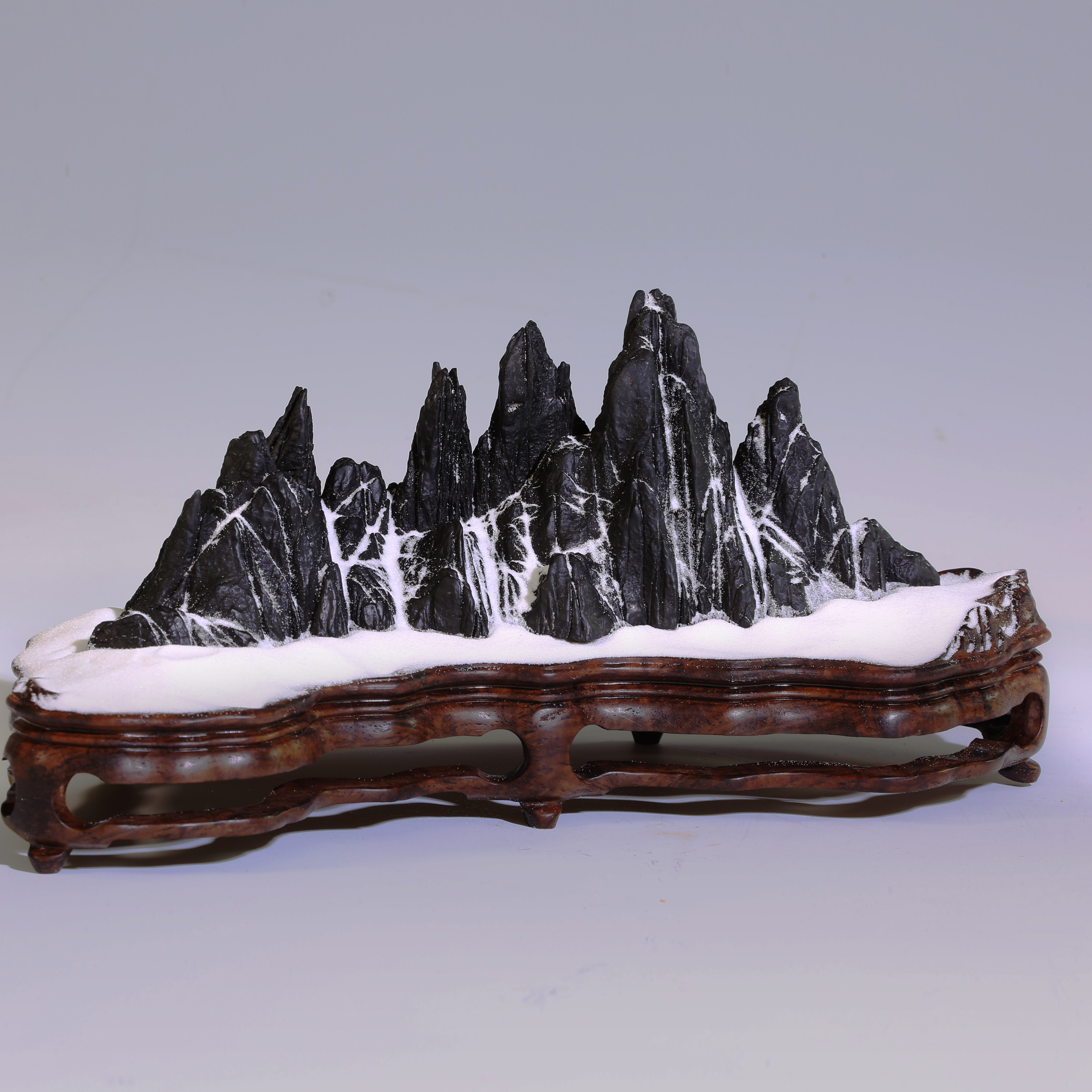 天设地造一方山子,地断裂形成的原底。连峰去天不盈尺,砯崖万壑倚绝壁。水冲幽兰石颜色黝黑、质地细润,抚之表浆如玉,平添高雅之趣。