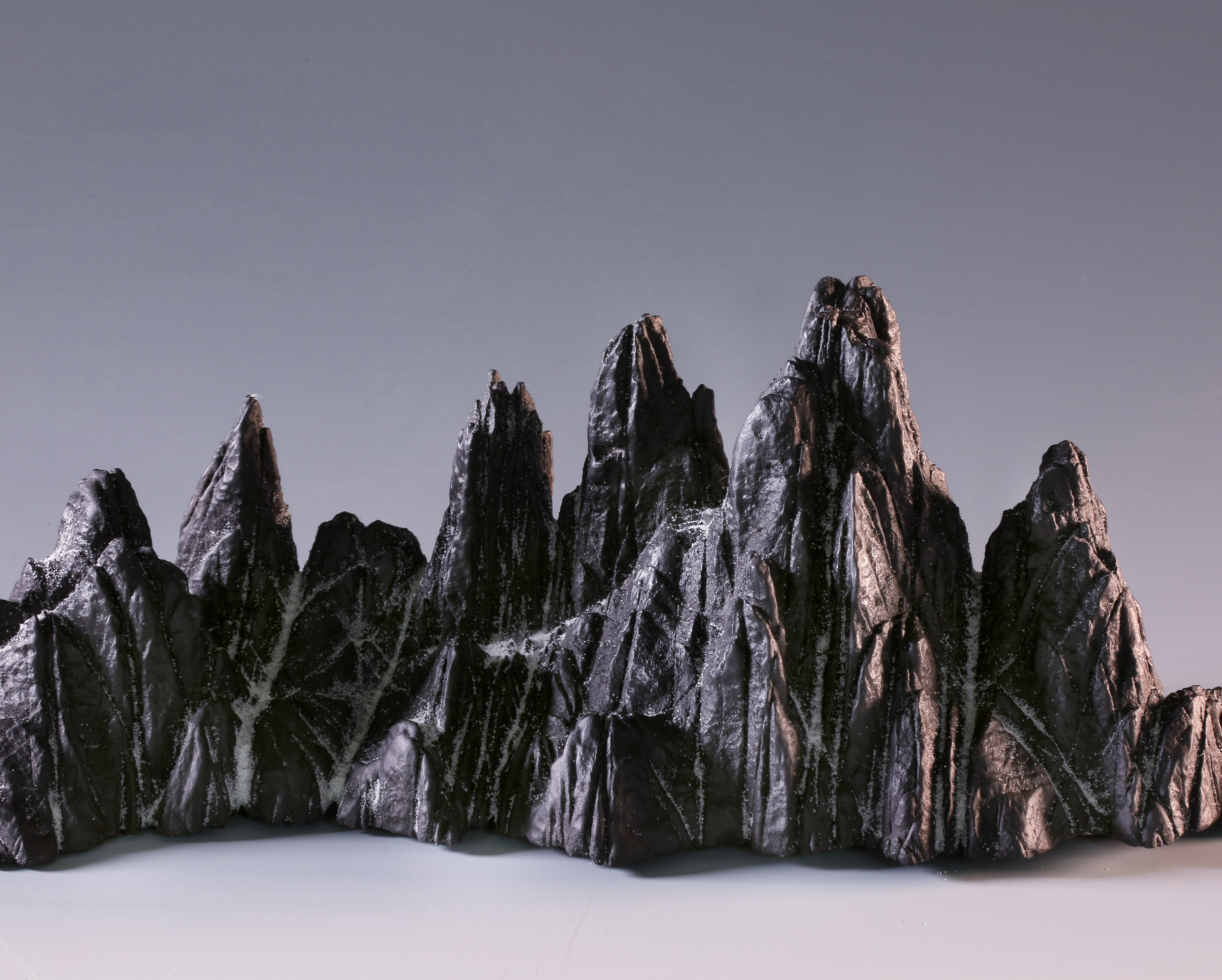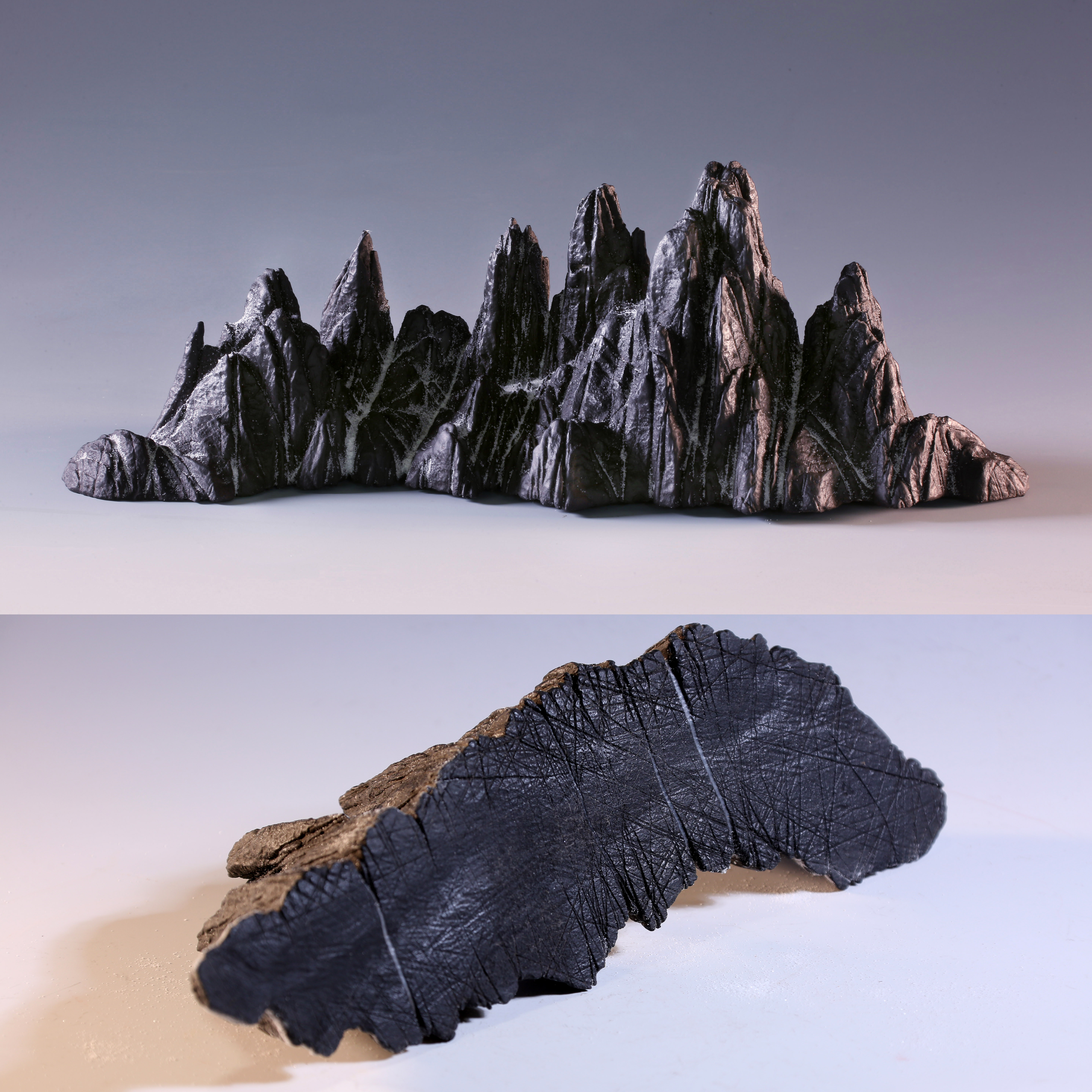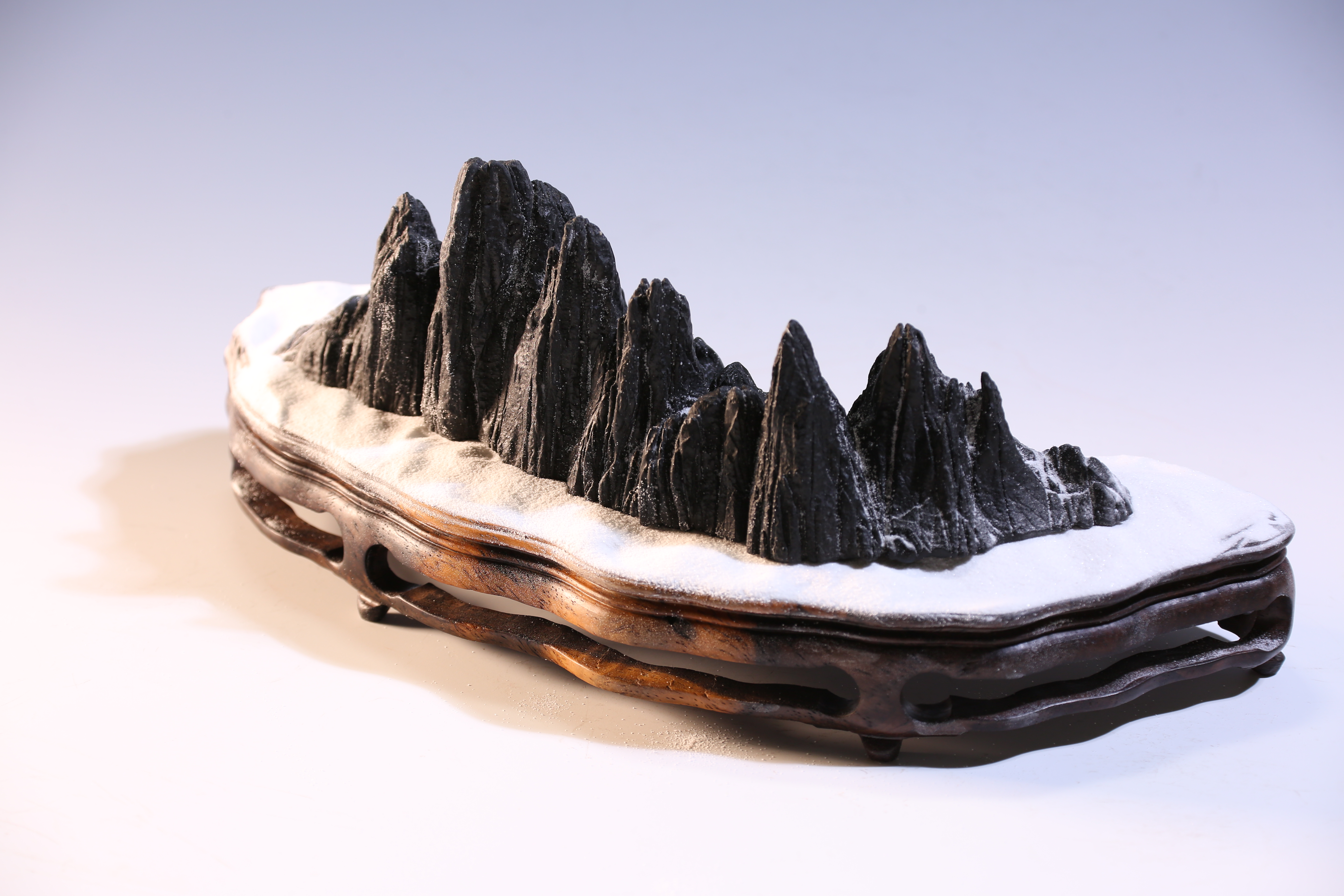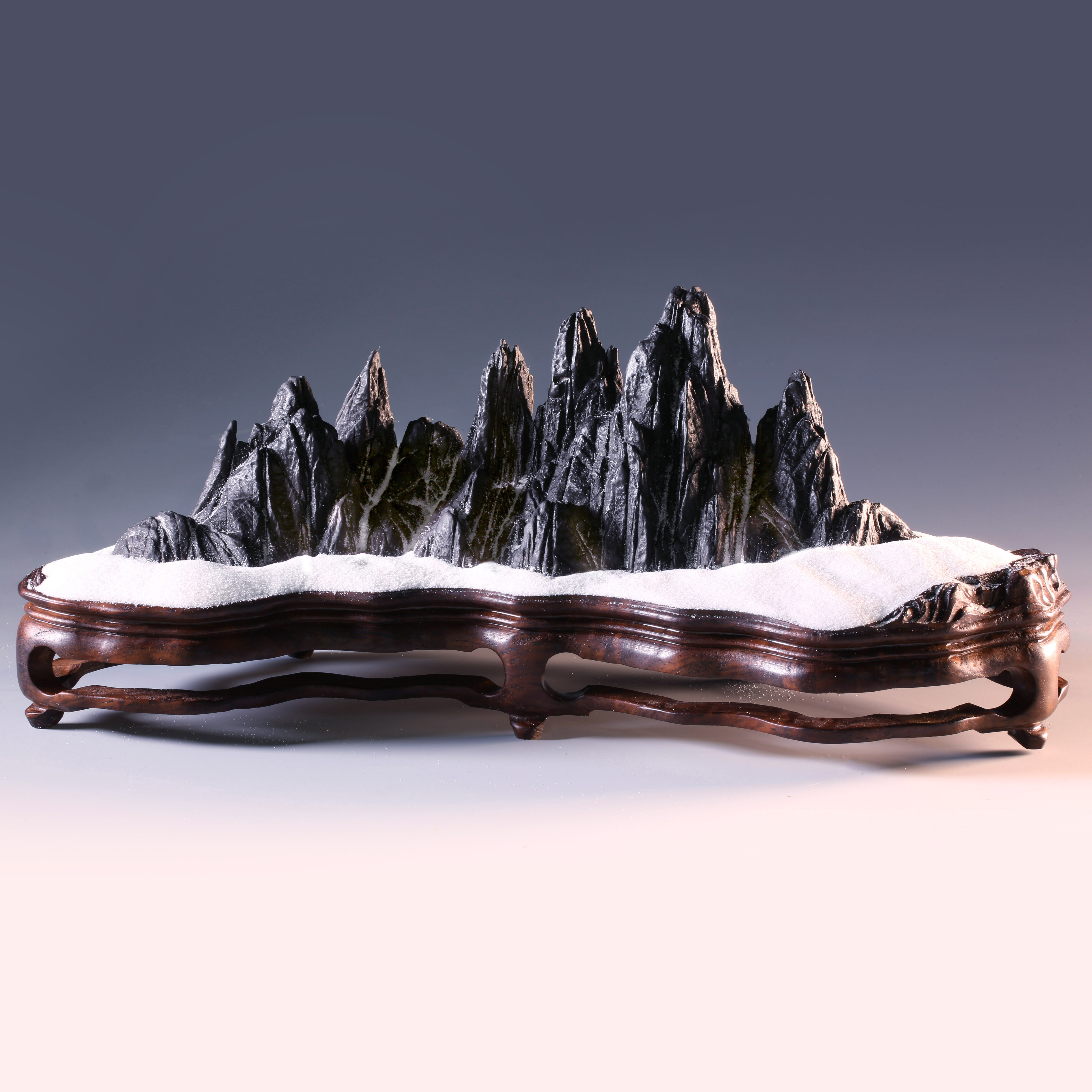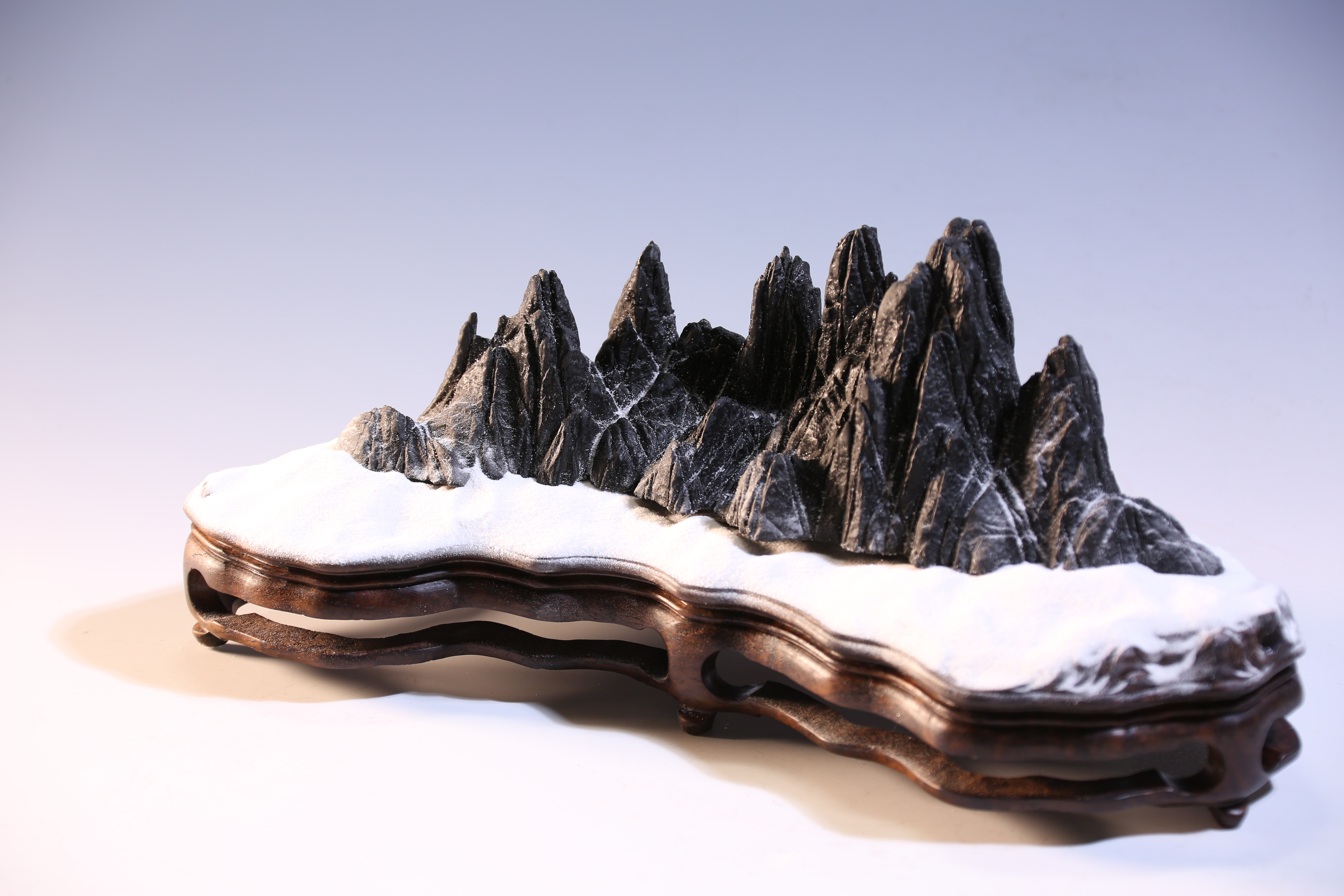 天设地造一方山子,地断裂形成的原底。连峰去天不盈尺,砯崖万壑倚绝壁。水冲幽兰石颜色黝黑、质地细润,抚之表浆如玉,平添高雅之趣。