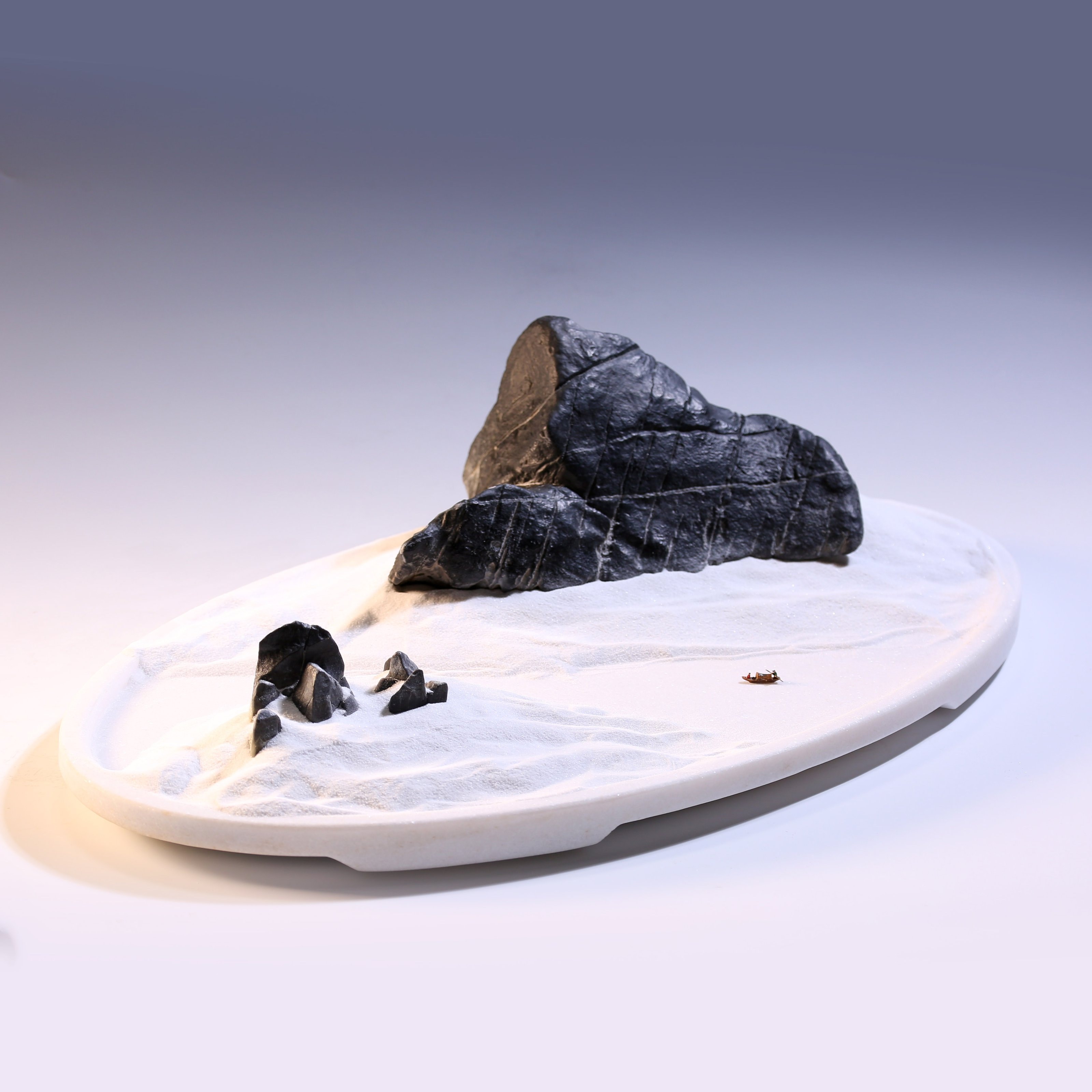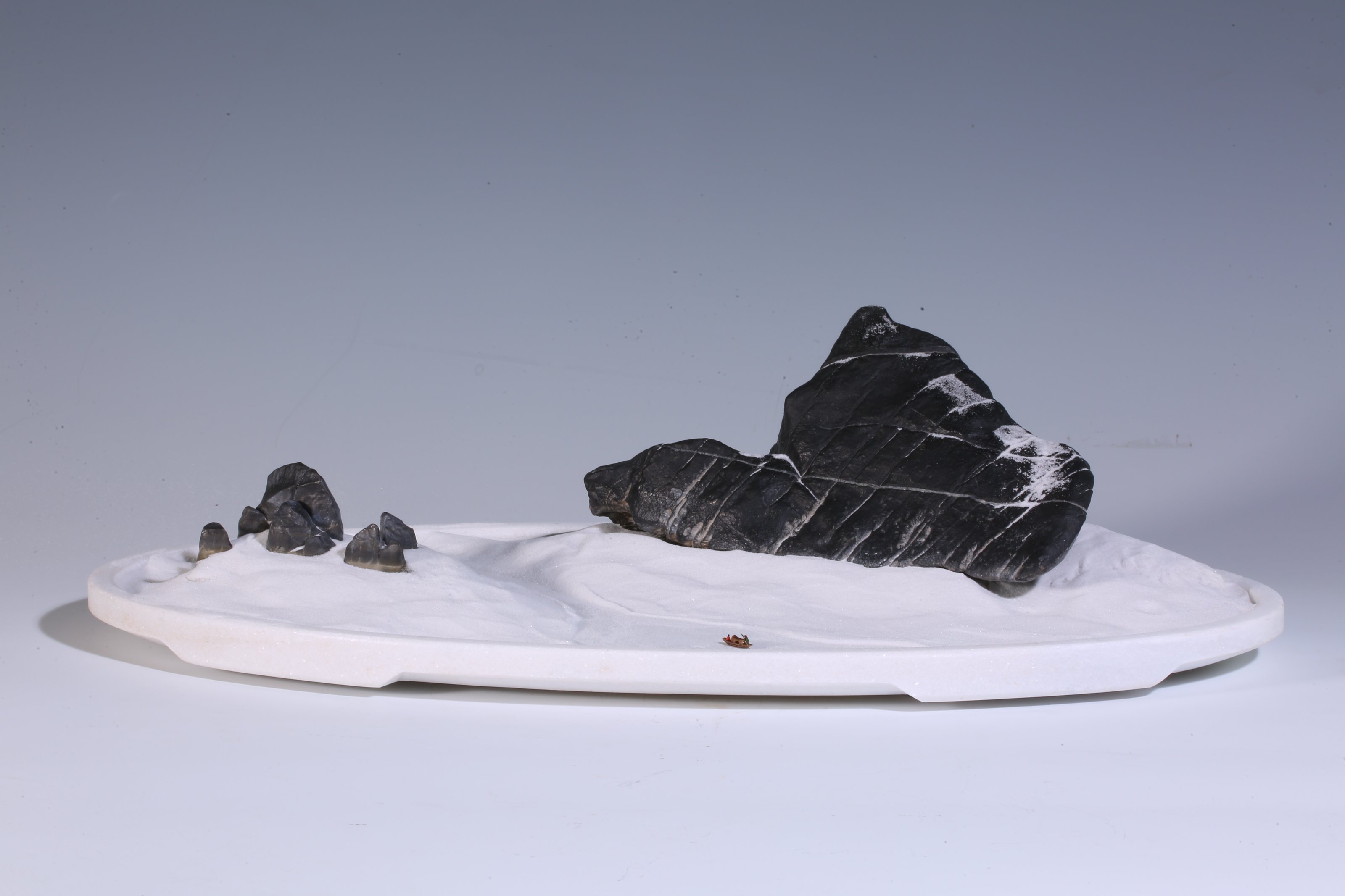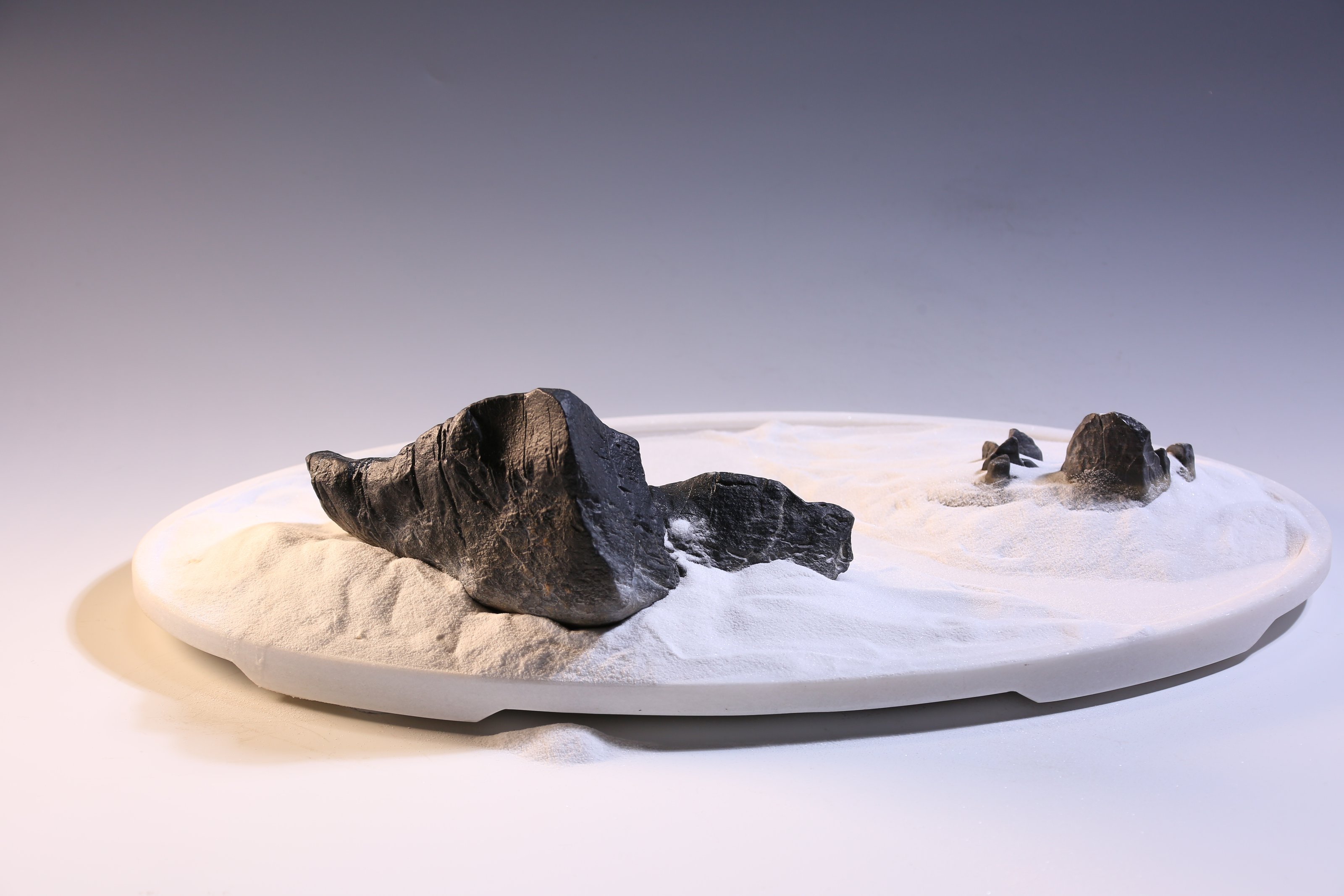 玄黑山峰耸立,崖壁料峭,雄浑之势,细白砂仿烟云缥缈,环峰而绕,周缘矮峰仅露峰顶,是谓“孤峰云天外”之意境。
