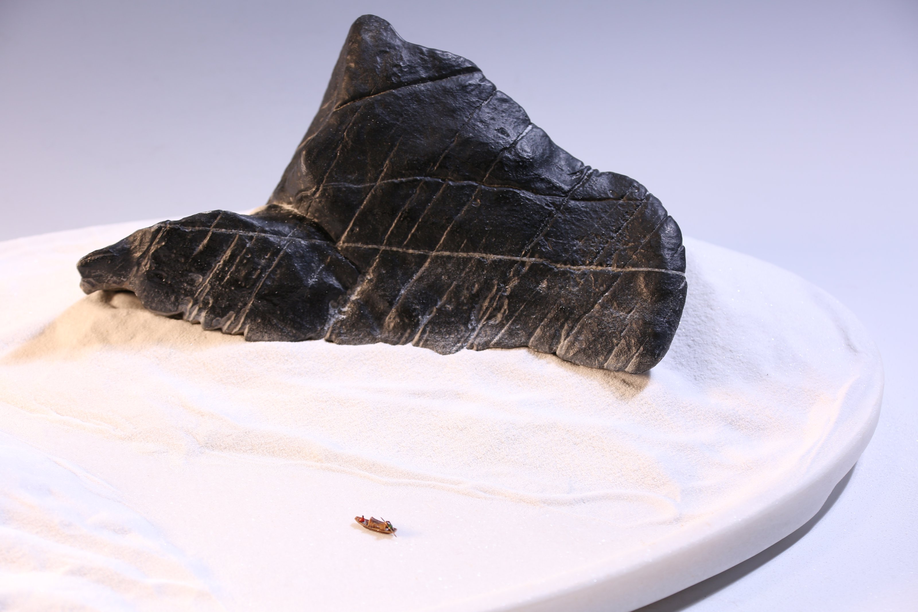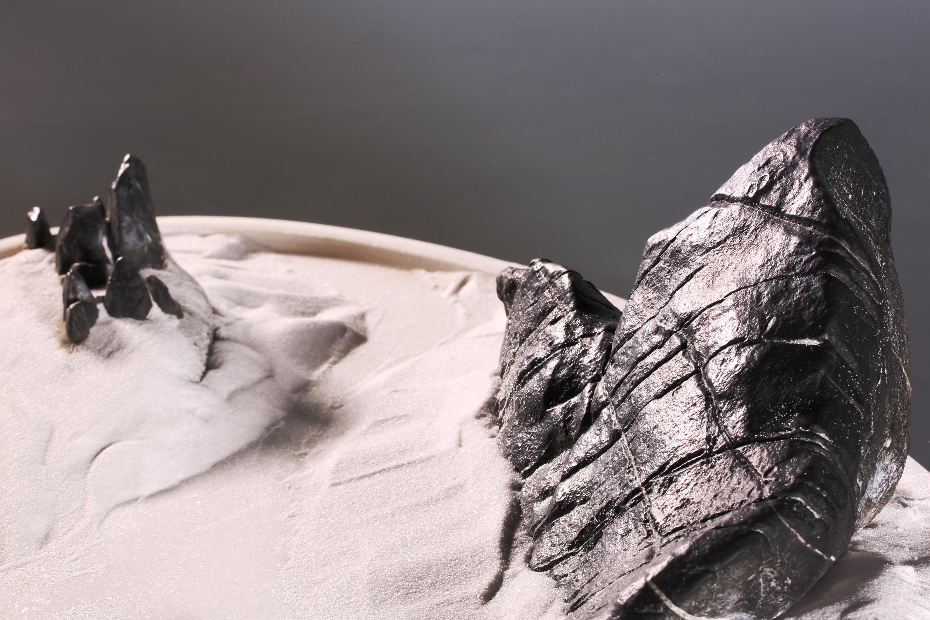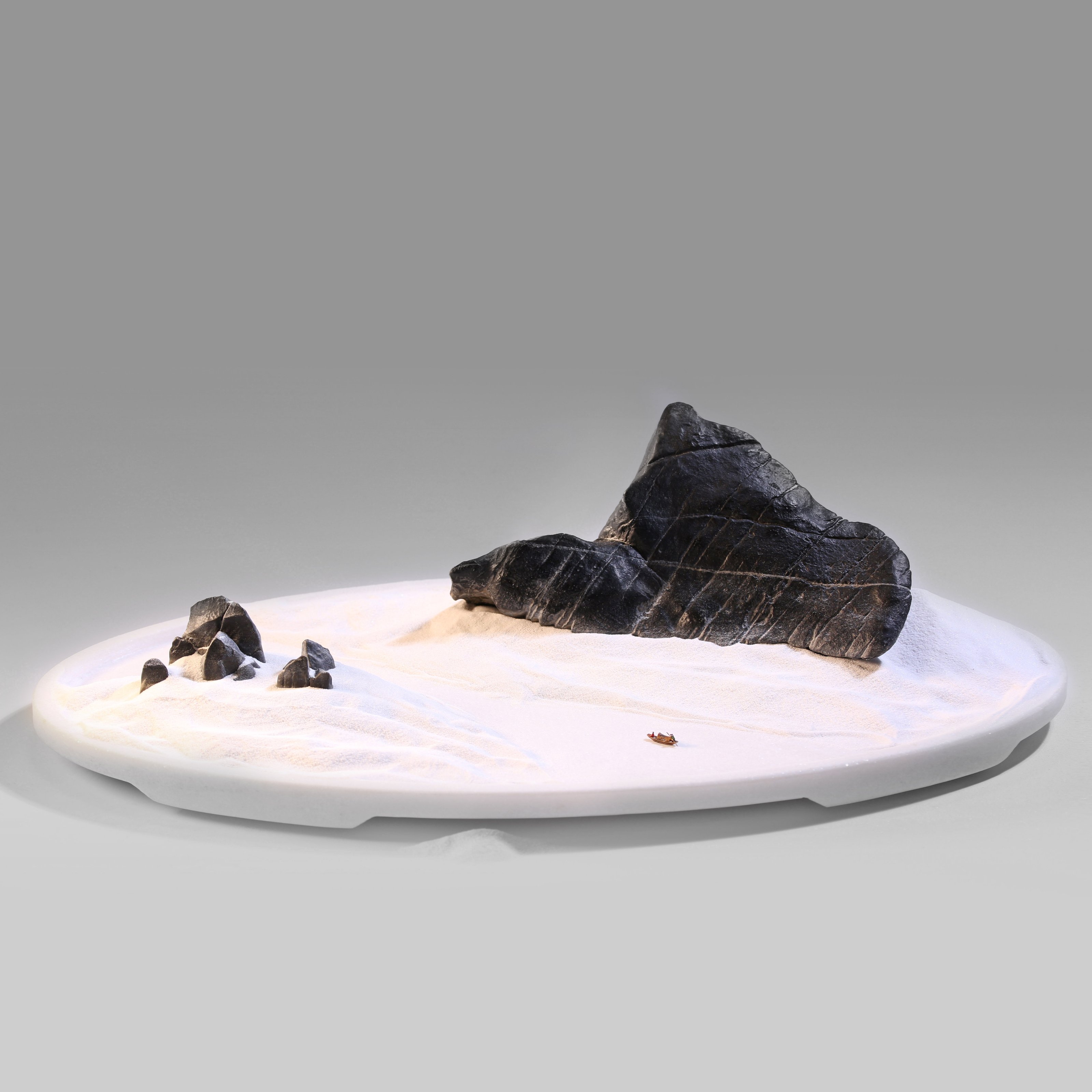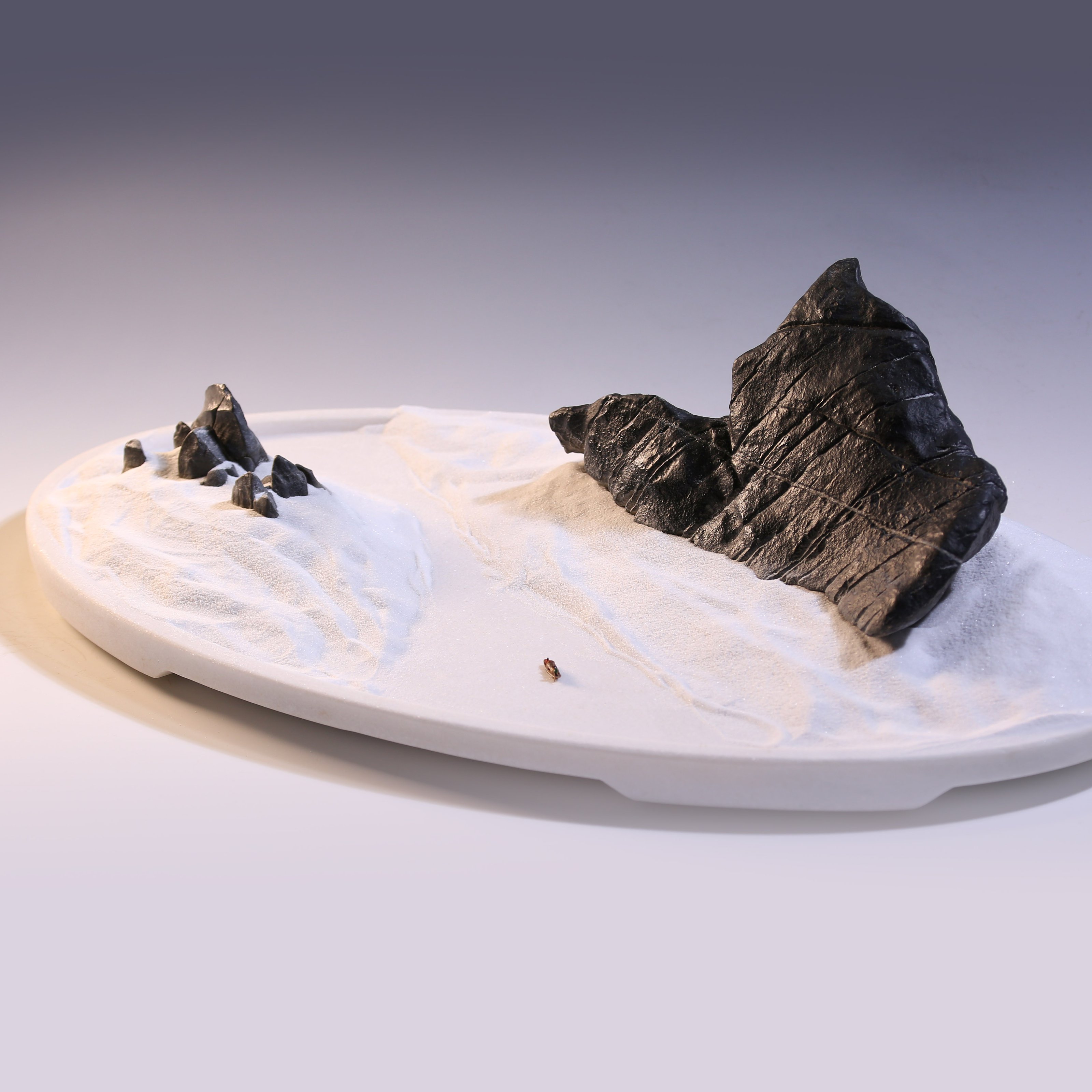 玄黑山峰耸立,崖壁料峭,雄浑之势,细白砂仿烟云缥缈,环峰而绕,周缘矮峰仅露峰顶,是谓“孤峰云天外”之意境。