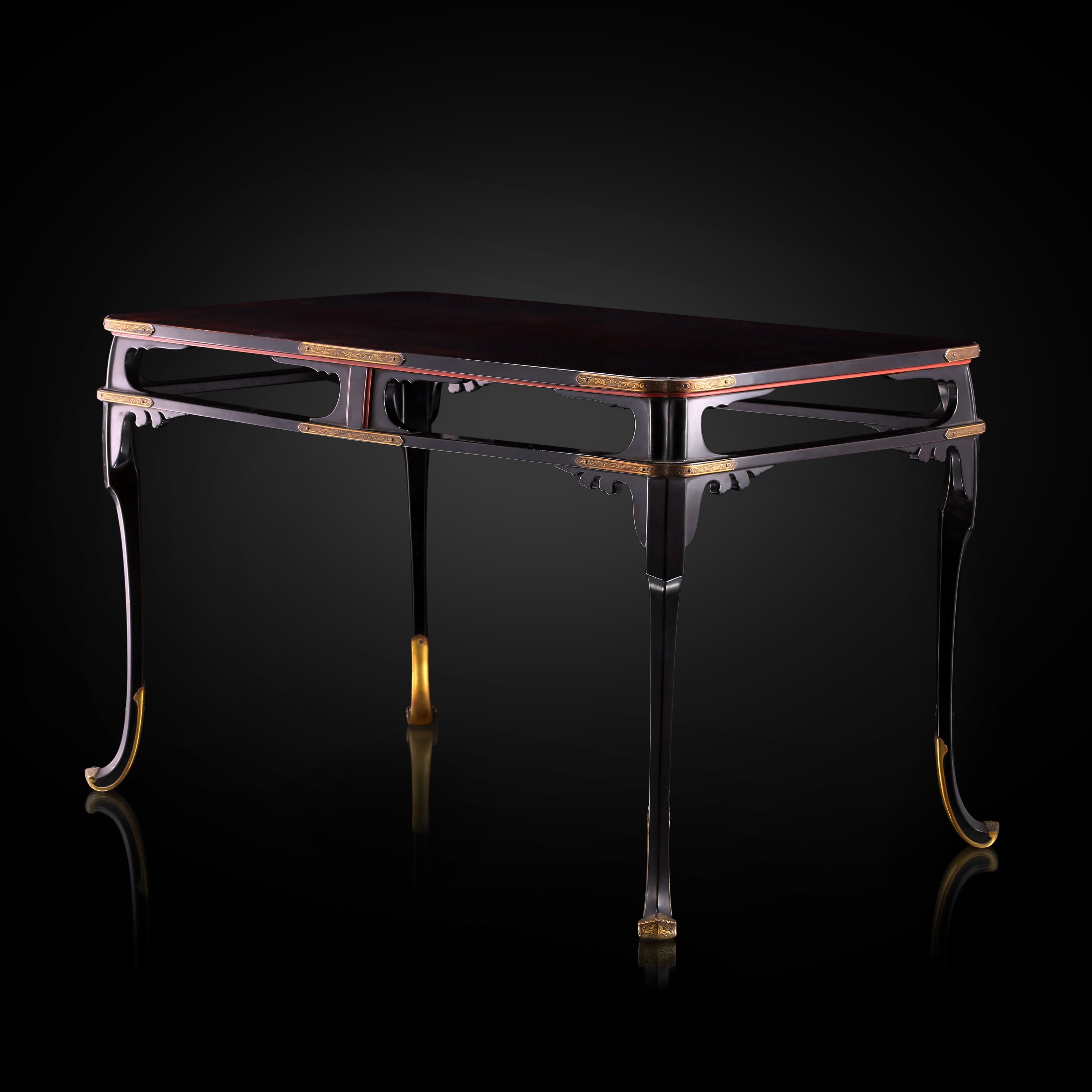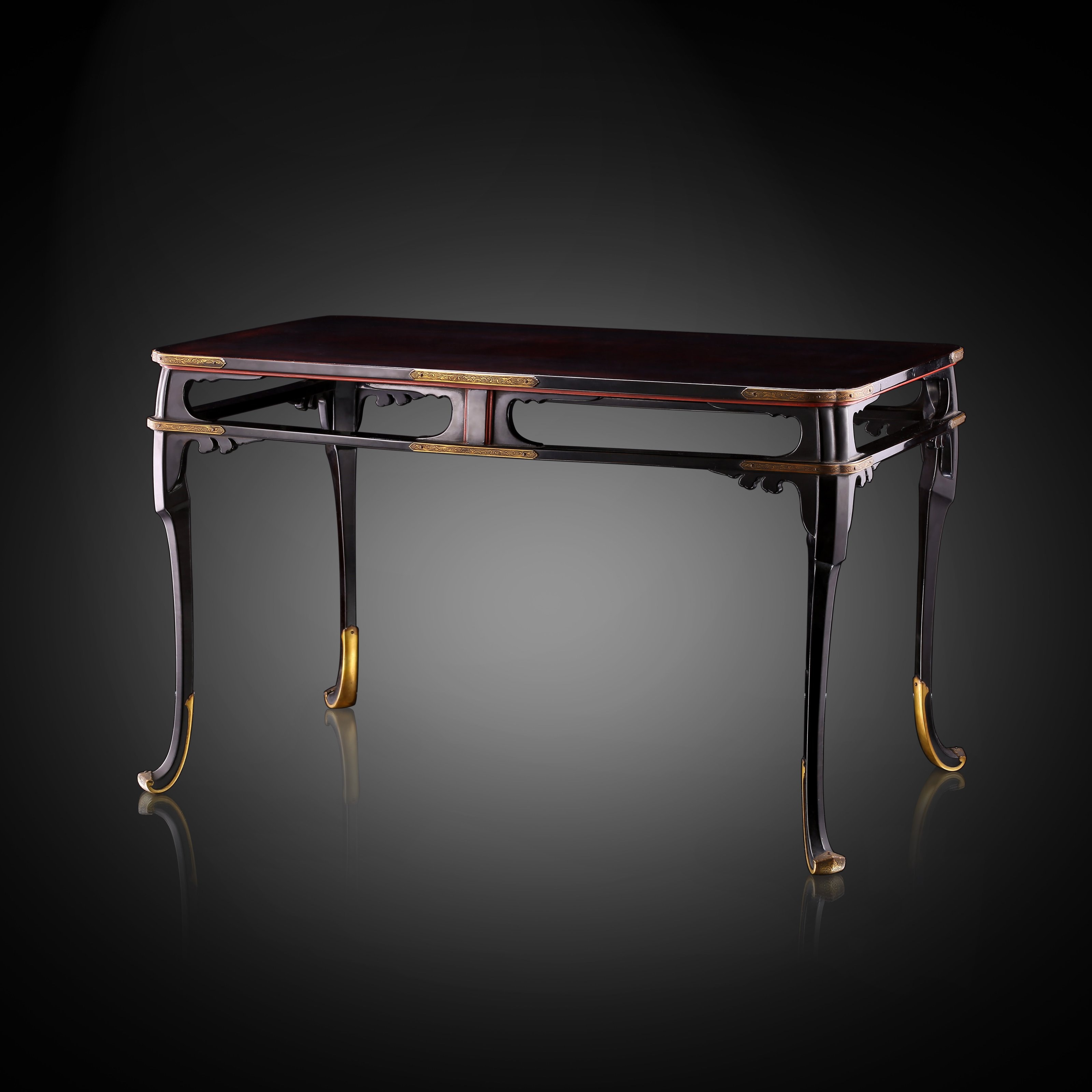 宋韵大漆长方香几 长:49cm 宽:28cm 高:30cm 宋韵大漆长方香几,木胎大漆,整髹黑漆漆色深沉,细处勾画古代朱,边沿四足饰鎏金雕花铜件,工艺极致精湛。香几造型古雅,四足挺拔俊逸,腰部壸门,颇具唐风宋韵。为书房茶室陈设之雅具。
