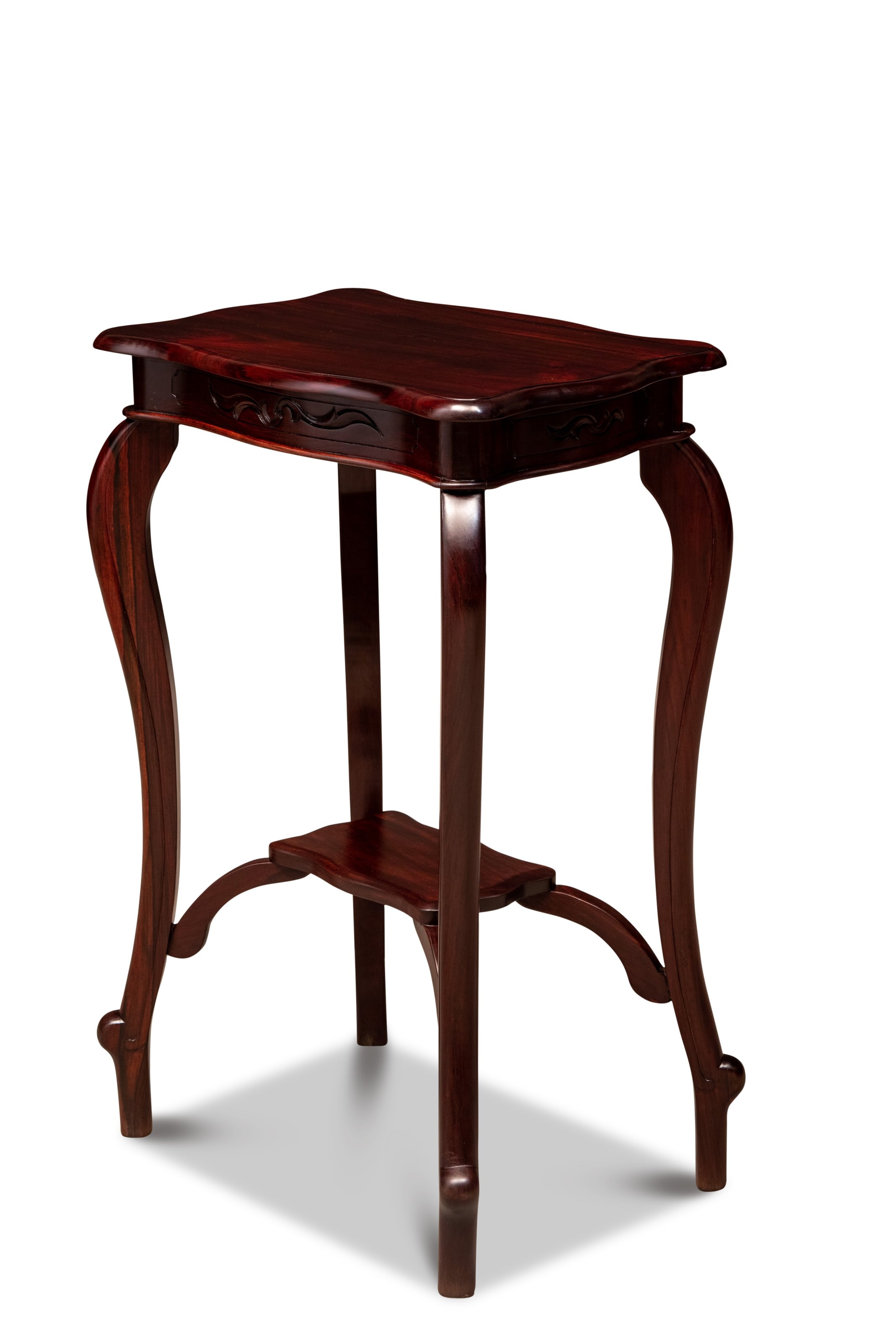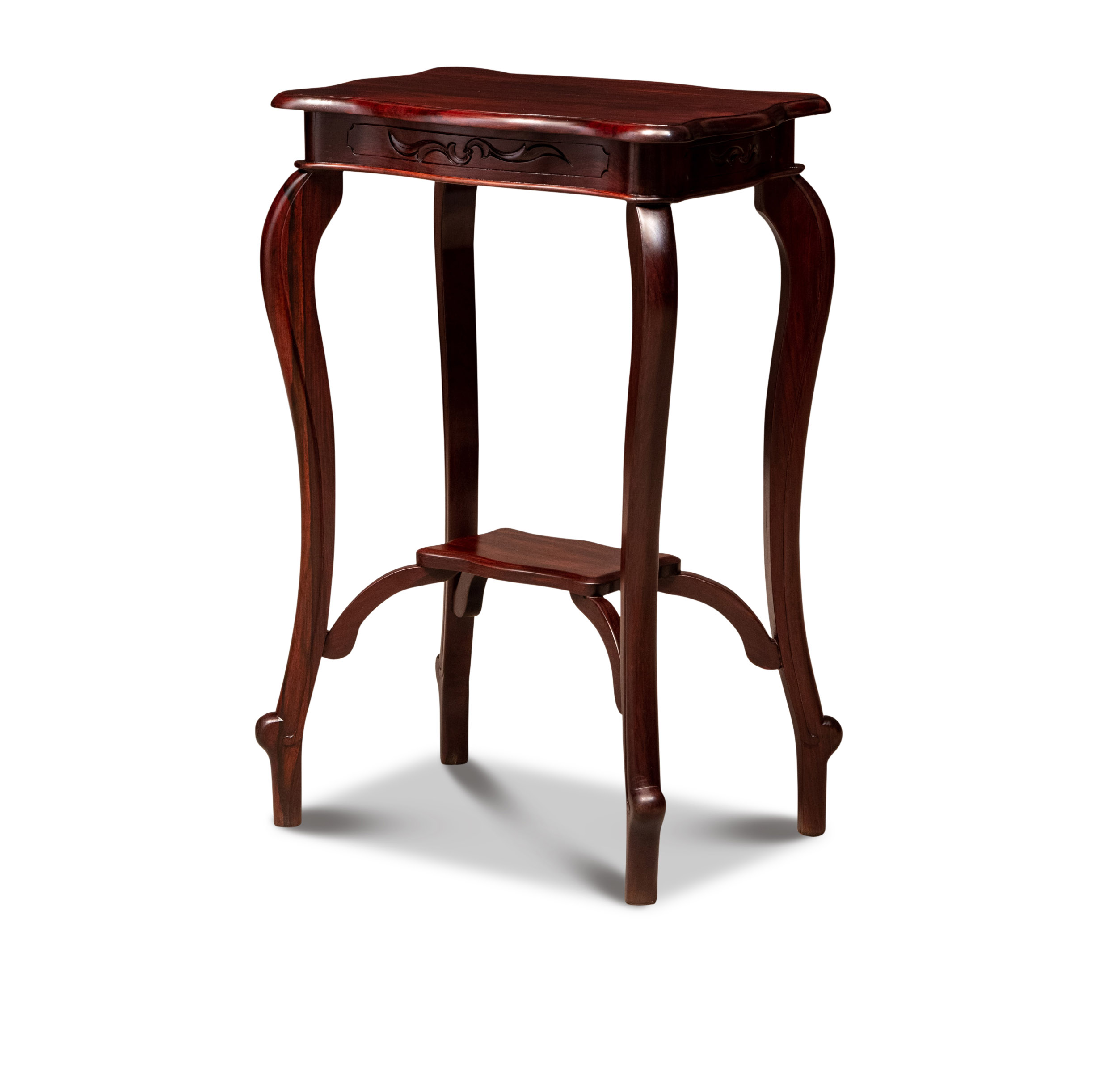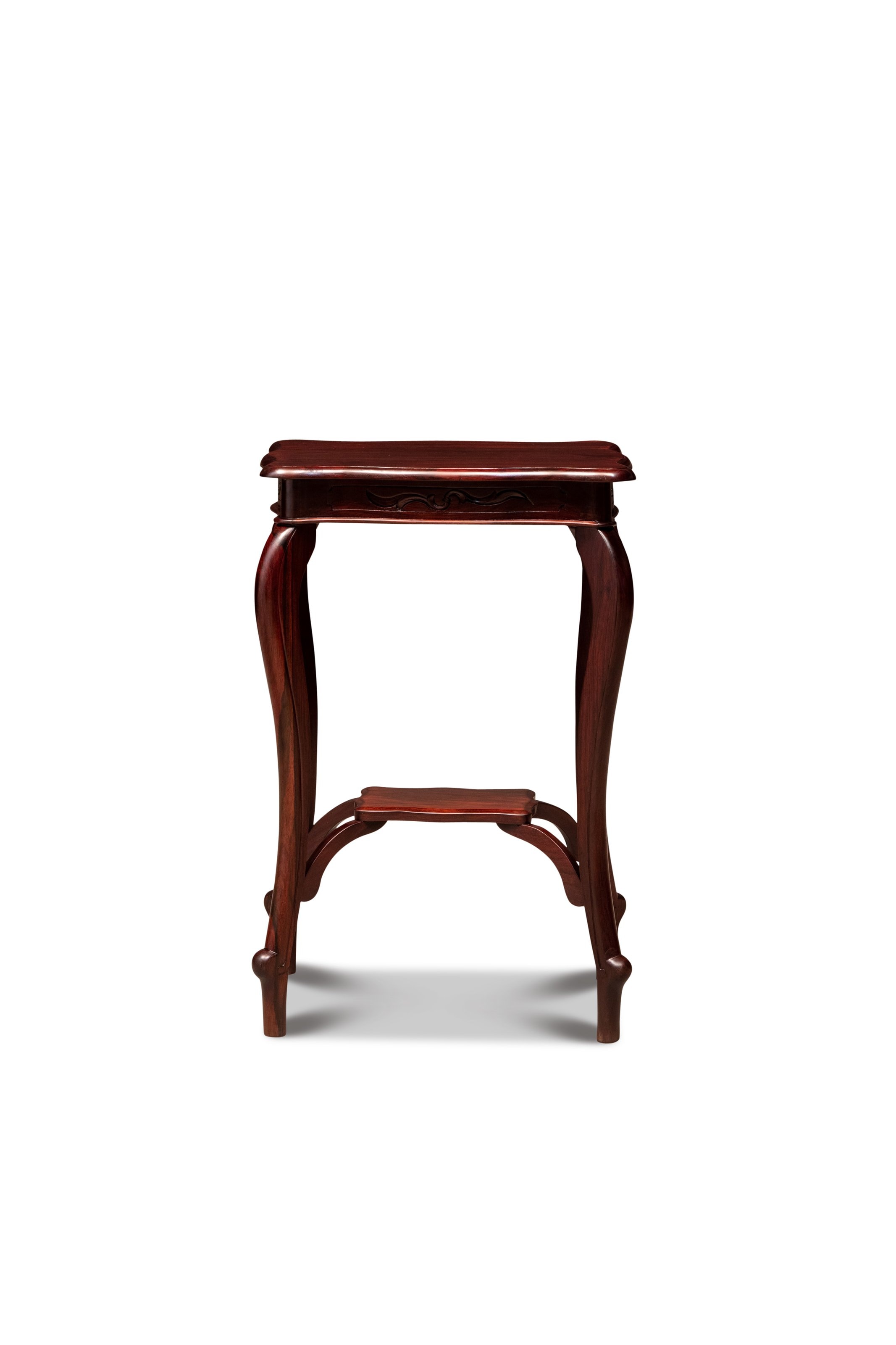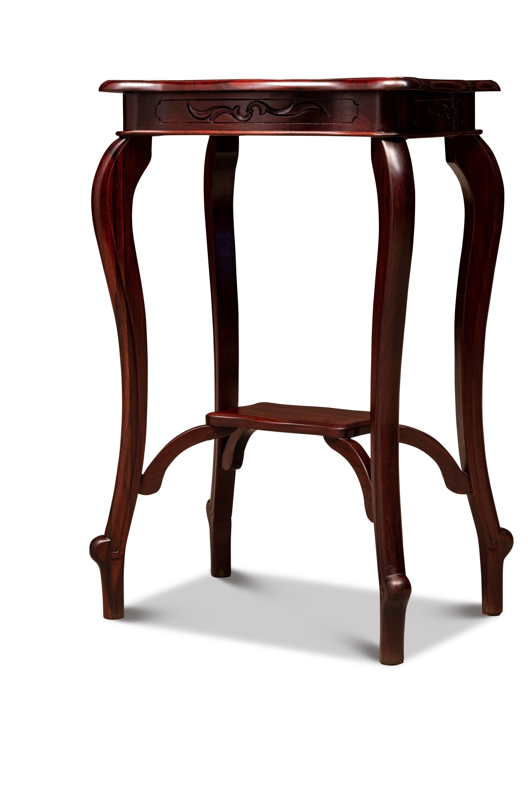 花几以红酸枝制,几面曲线形,高束腰,有托腮,四腿足三弯式,上粗下细,近足端有半球形凸起,腿足中下部设屉面,屉面与腿足间以弧形枨相连。