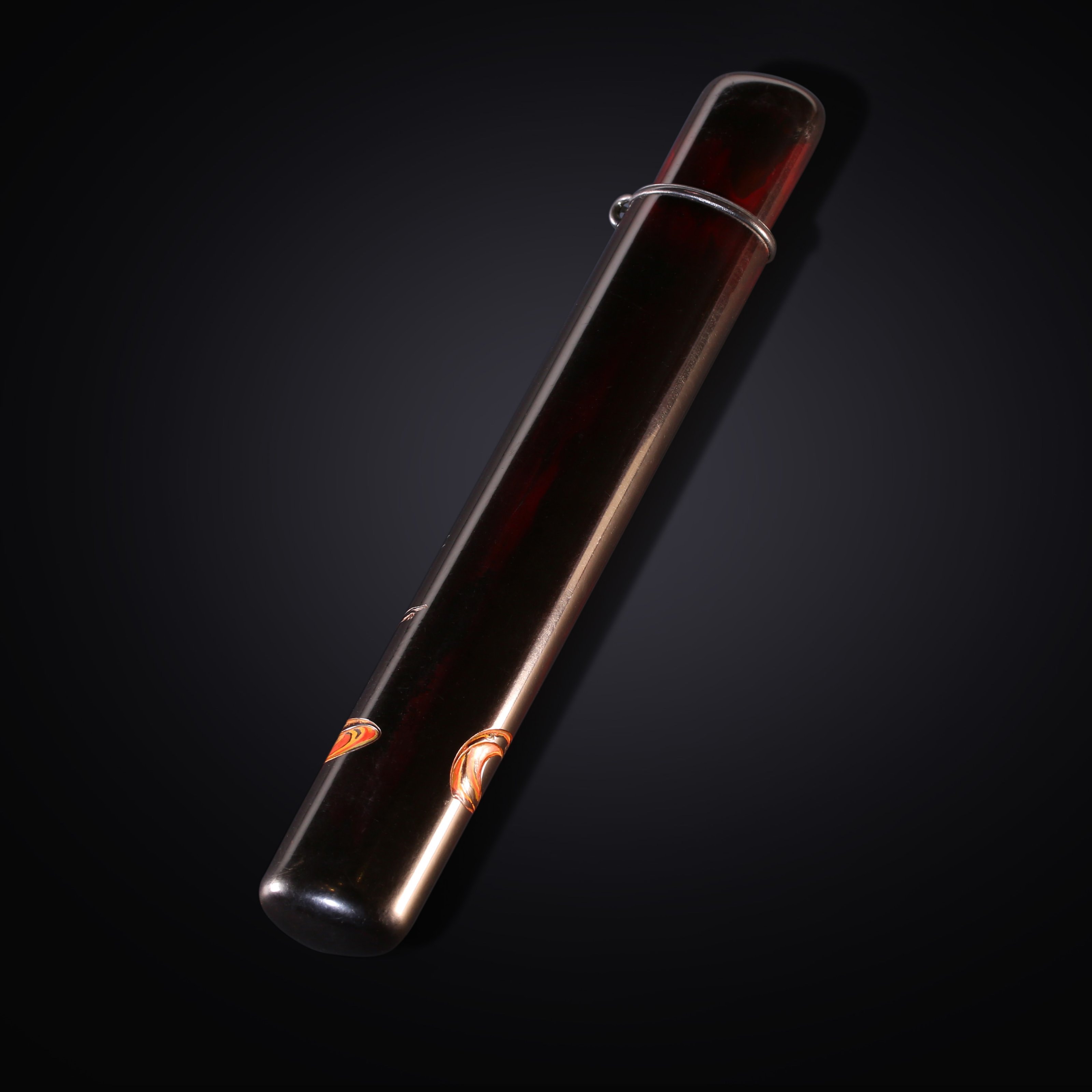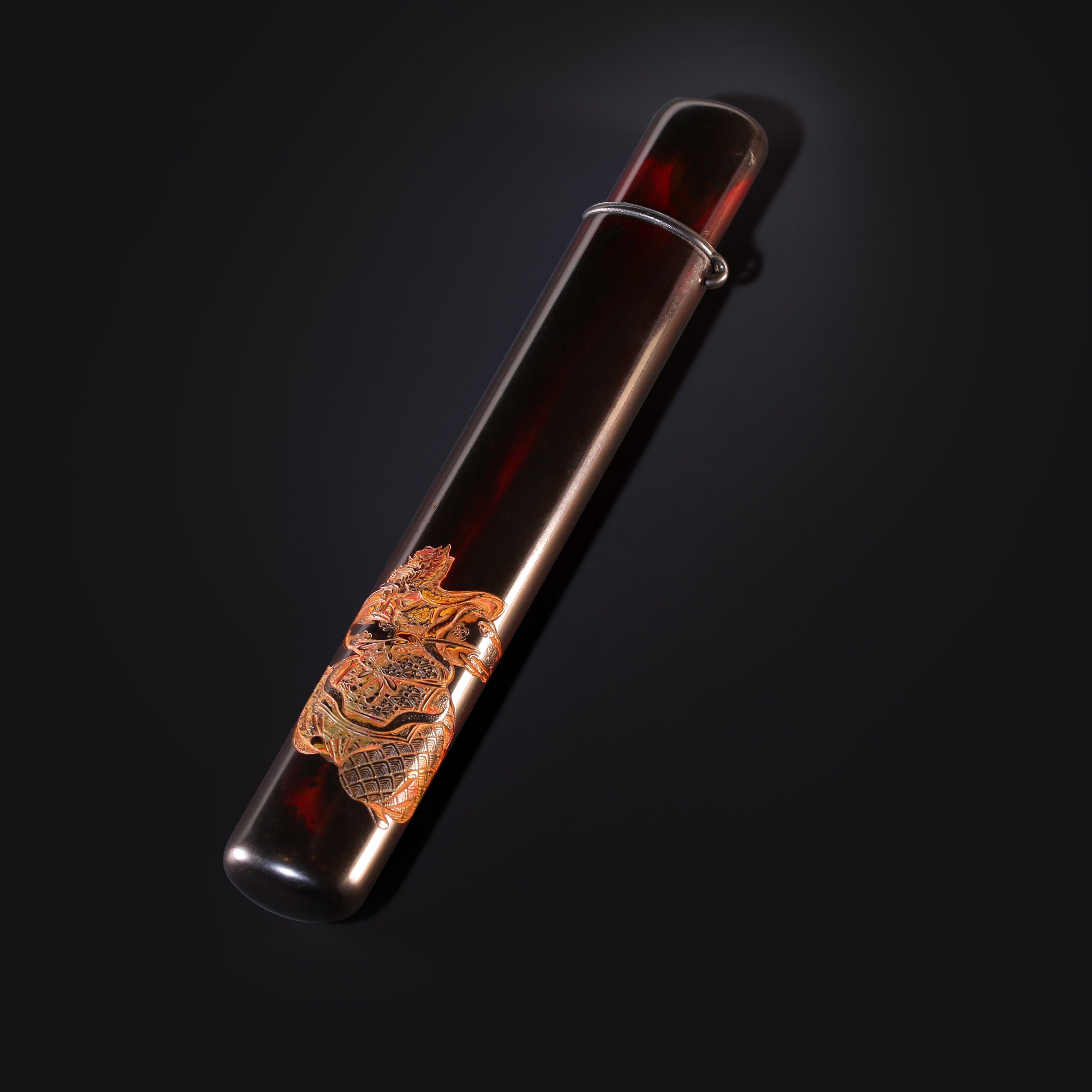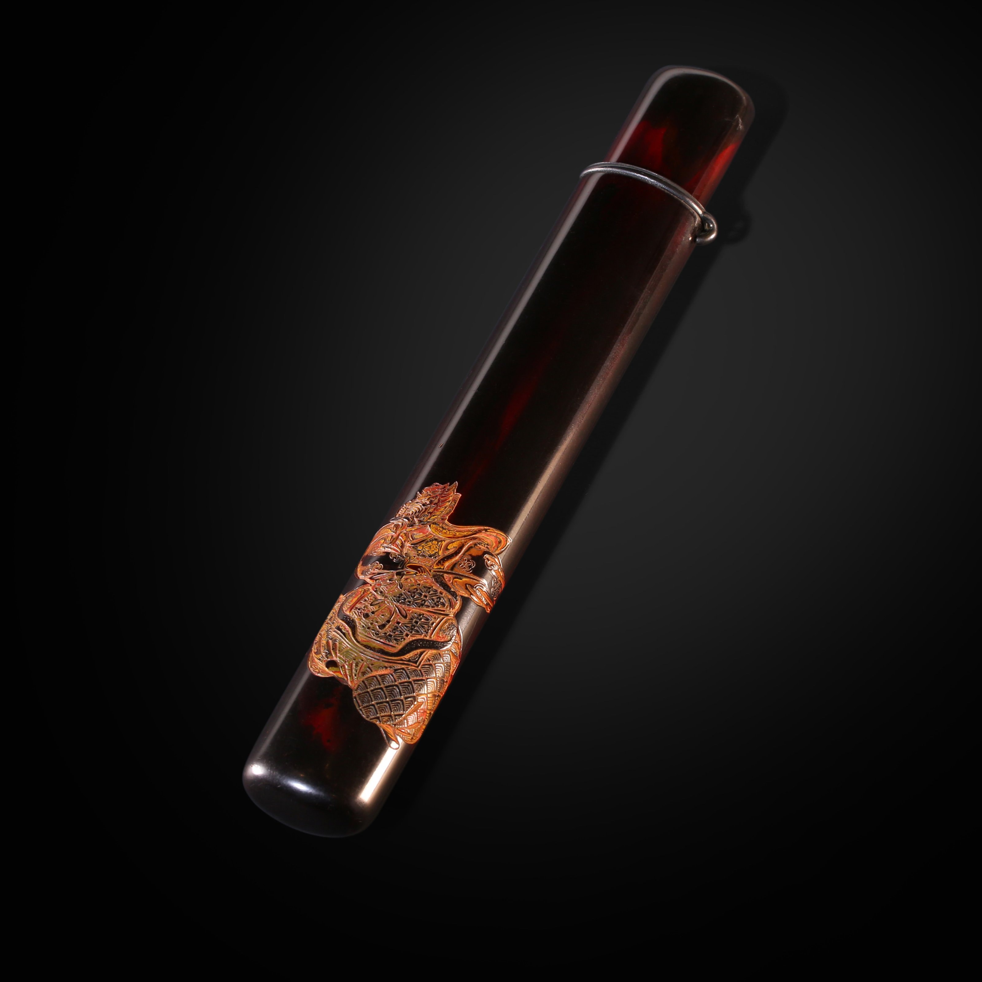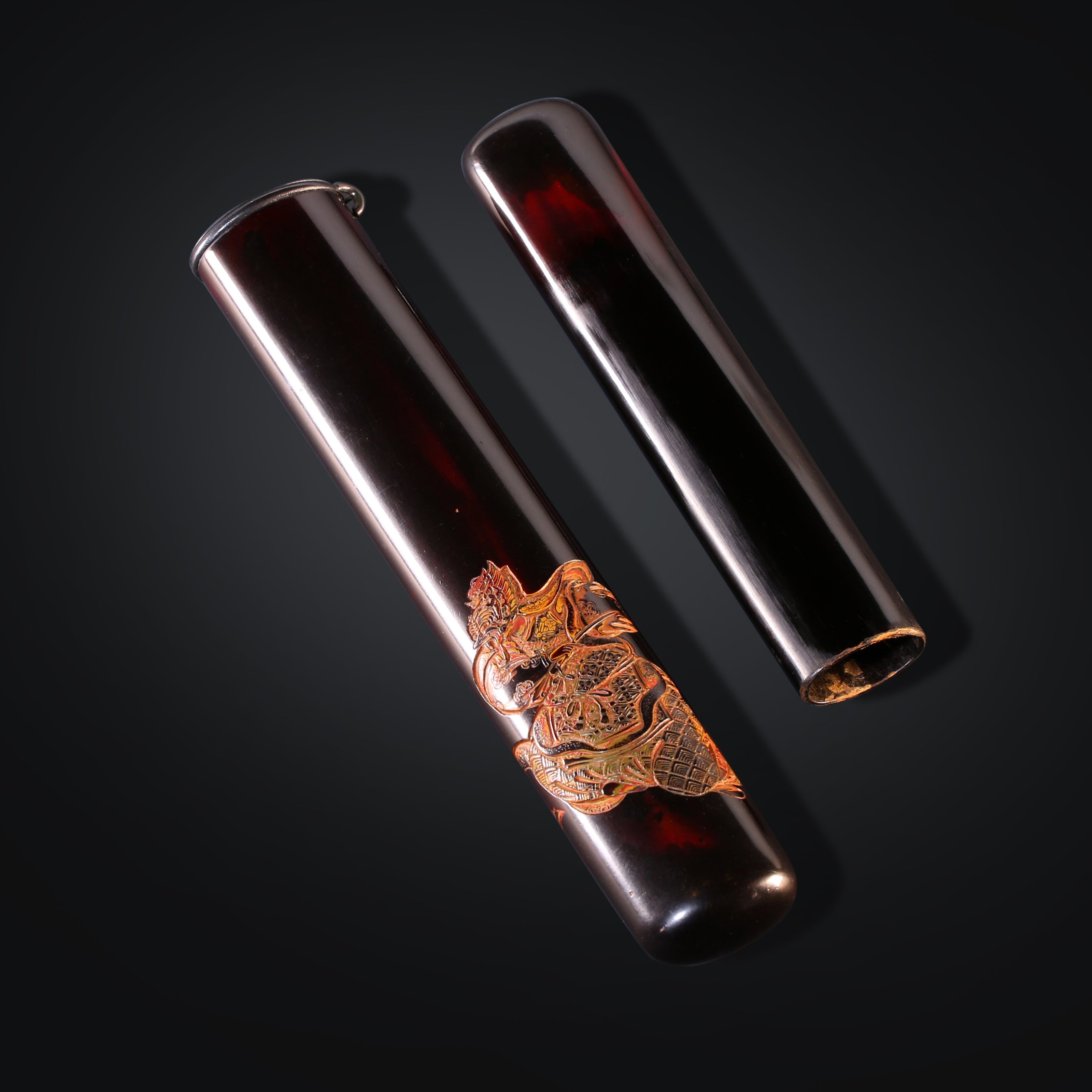 长:20.7cm,宽:3cm 大漆雕刻香筒 日本江户时期大漆雕刻香筒,香筒为茶席雅物,此件大漆雕刻,黑漆其外,朱画其内,此类技法制作时间岁计。外部唯一的装饰为一威武的神像,刀法流畅犀利,有吴带当风之感。