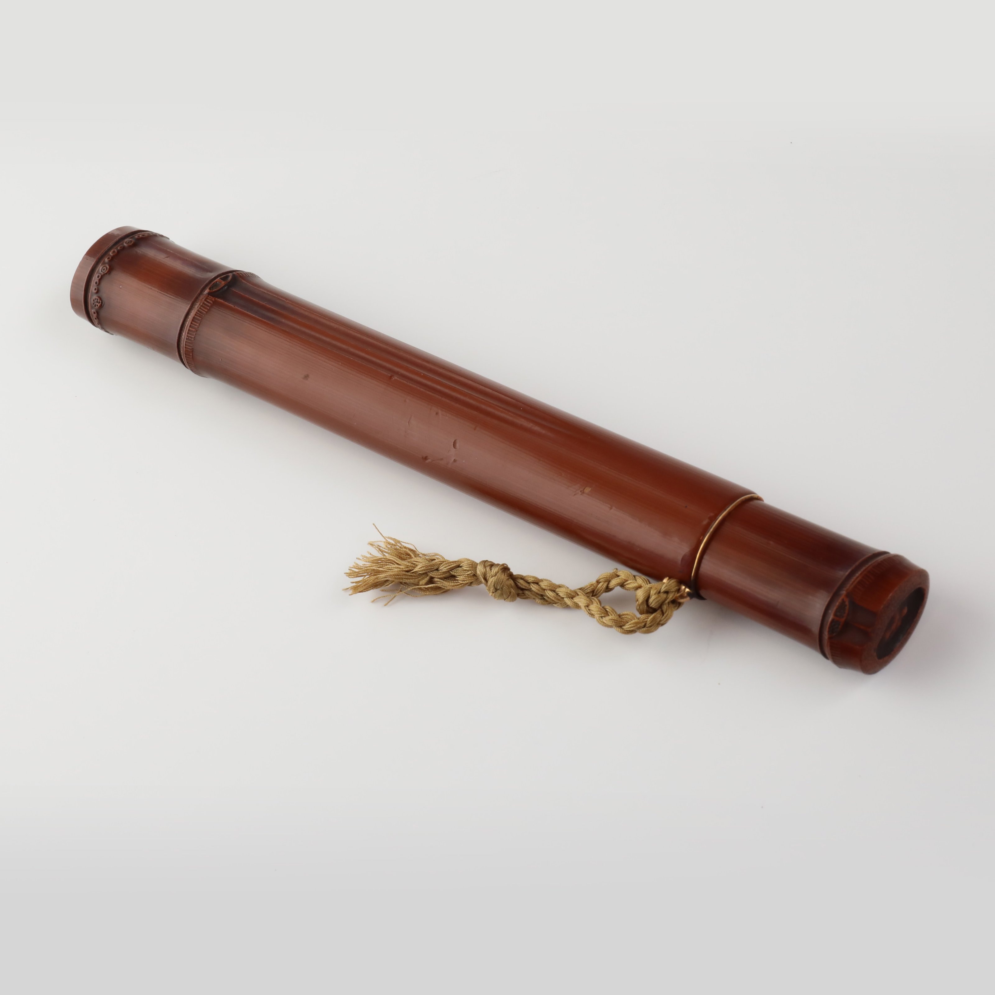长:21.5cm,宽:2.4cm 日本江户时期大漆仿竹形(木雕)香筒 日本江户时期大漆仿竹形木雕香筒,因极其逼真,初看以为竹制,细看为大漆仿竹形雕刻,造型比自然之物多了些提炼简洁,挺拔。国人爱竹,作为一脉。特别是用于茶道,因其自然气息与静谧之美而倍受推崇。