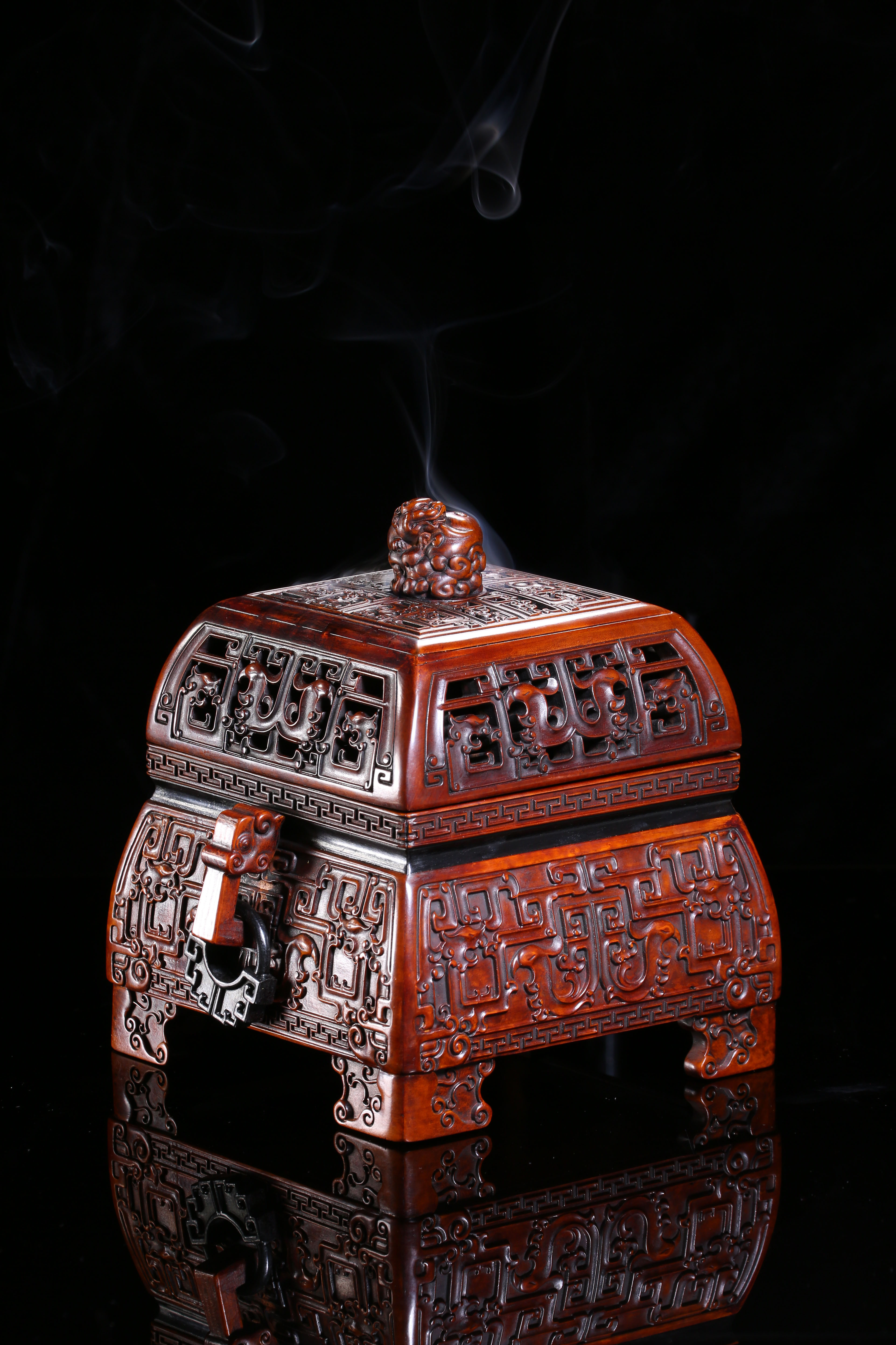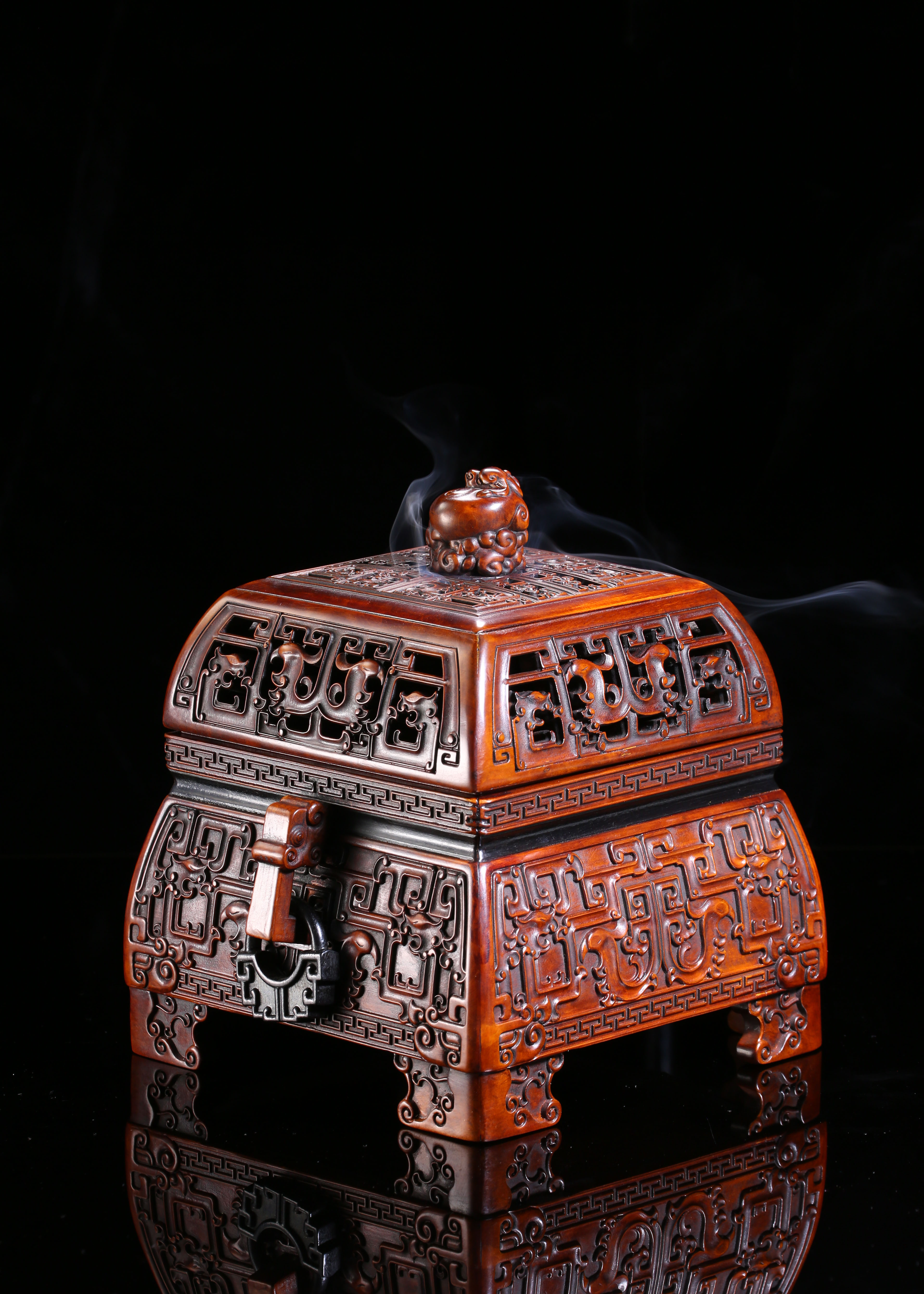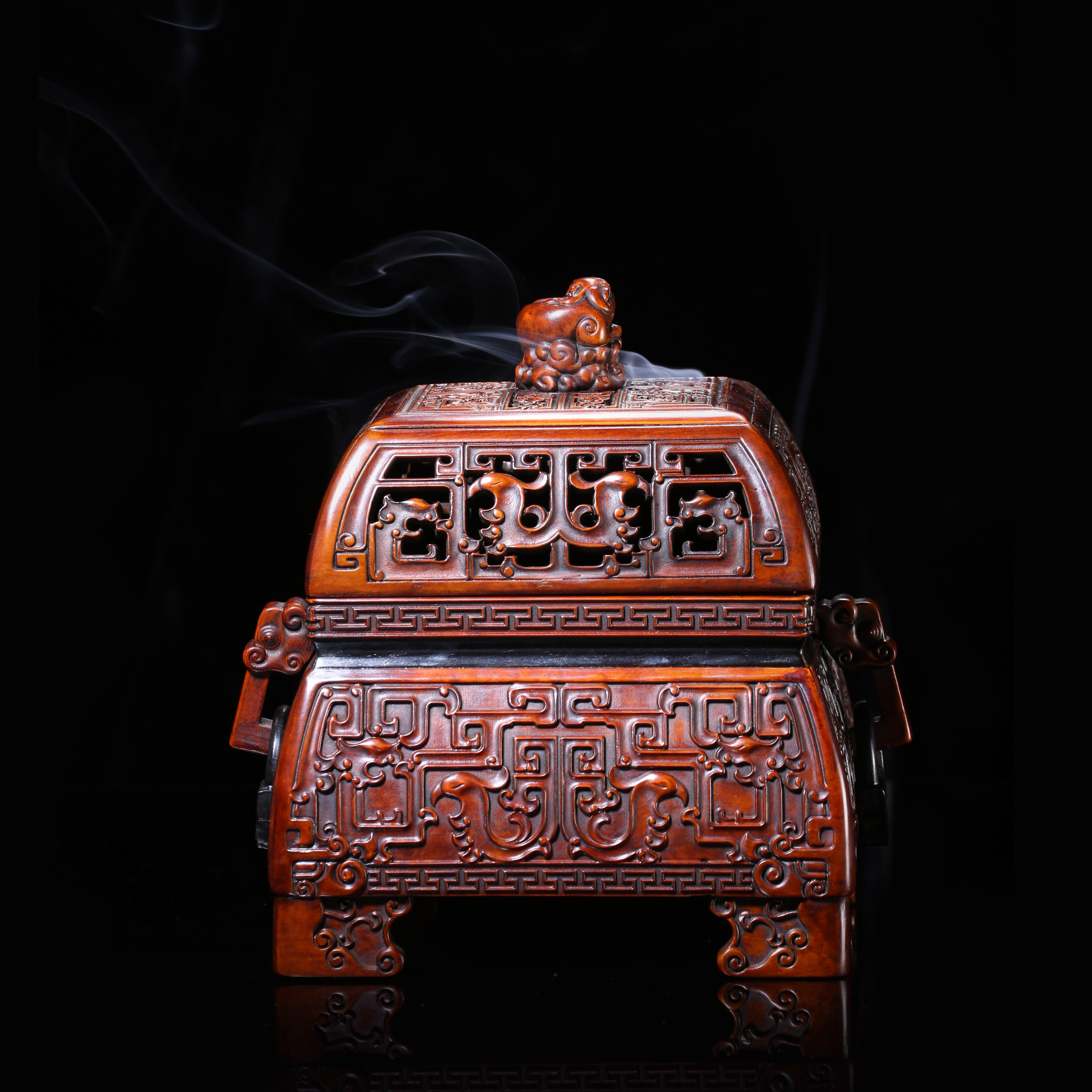 长:16cm宽:19.5cm高:19.5cm 老黄杨木狻猊钮四足香炉 黄杨木四足香炉,器形稳健,颇具张力,炉身浮雕先秦青铜器兽面纹为饰,两侧兽耳衔环,工艺精湛。炉盖镂雕,以便香气逸散,以狻猊瑞兽为钮,与传统相符。木色红润,质地细腻坚韧,整器悠悠古韵,尊贵端庄。