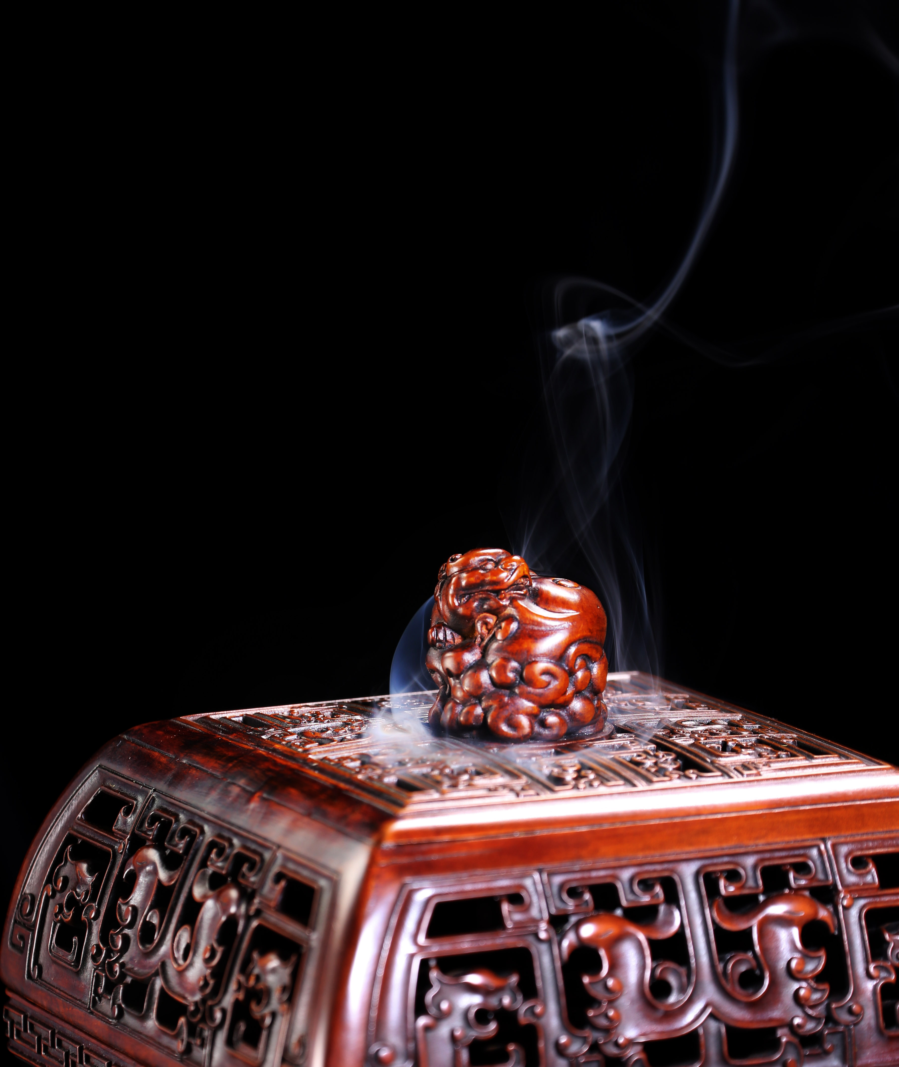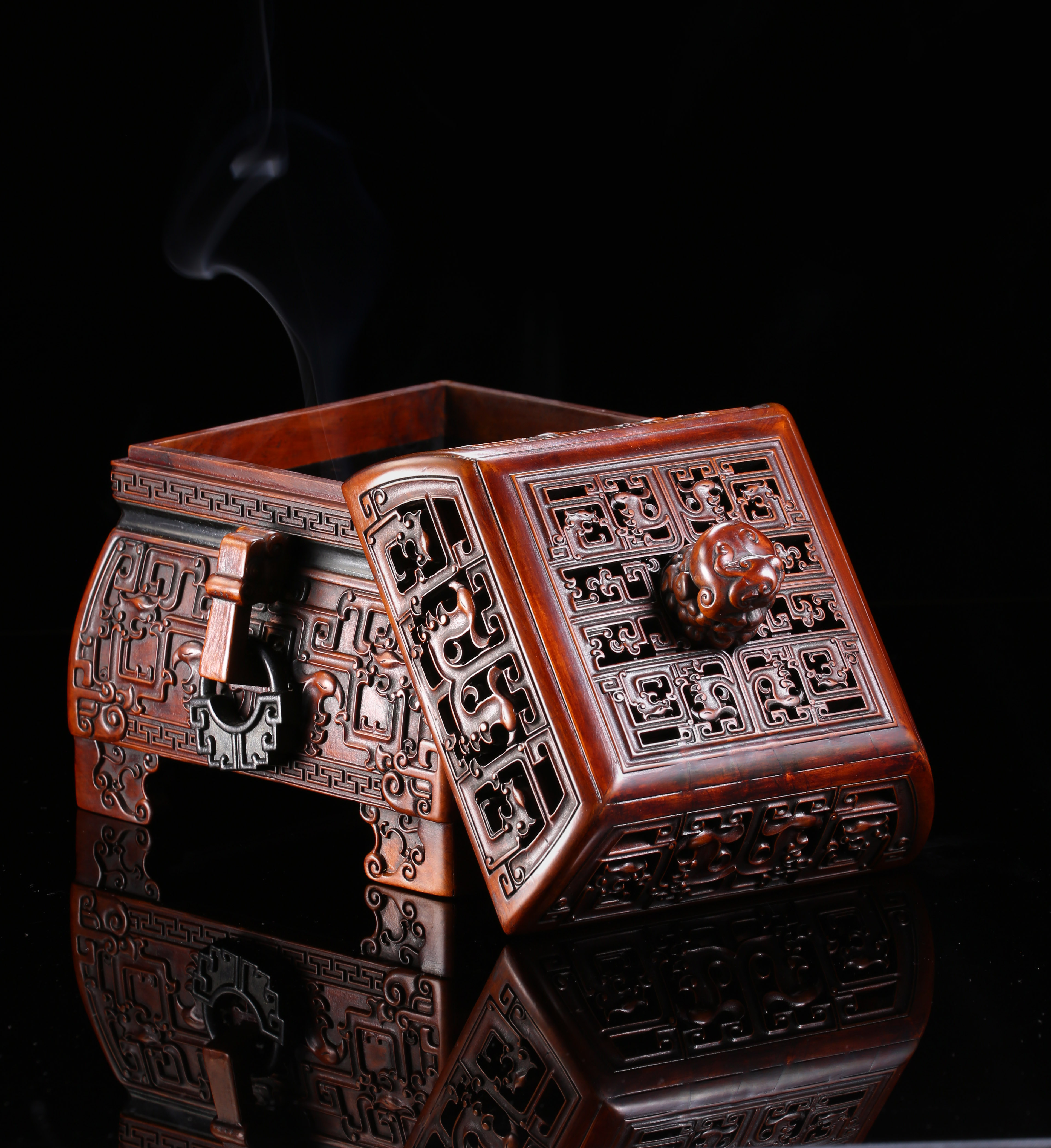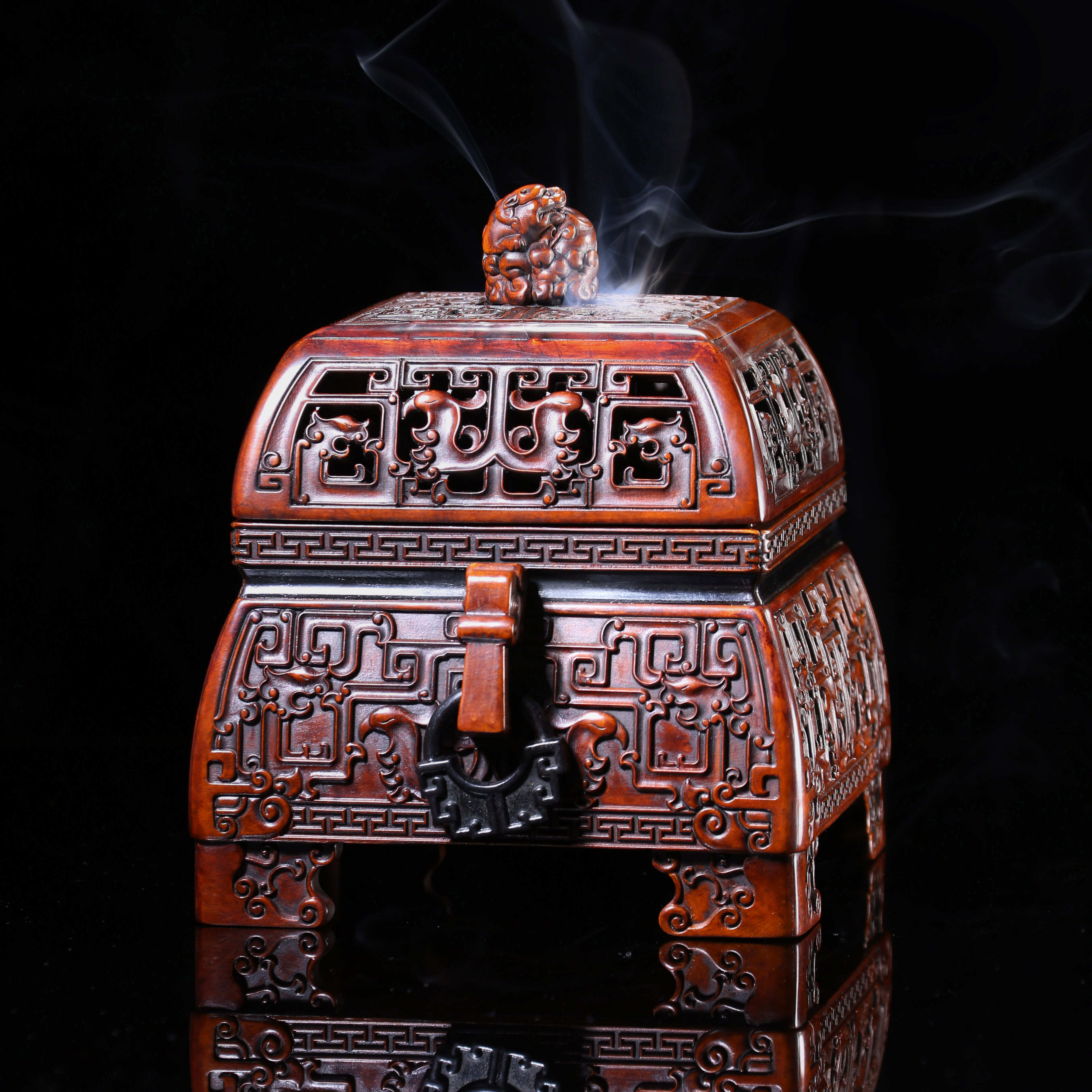 长:16cm宽:19.5cm高:19.5cm 老黄杨木狻猊钮四足香炉 黄杨木四足香炉,器形稳健,颇具张力,炉身浮雕先秦青铜器兽面纹为饰,两侧兽耳衔环,工艺精湛。炉盖镂雕,以便香气逸散,以狻猊瑞兽为钮,与传统相符。木色红润,质地细腻坚韧,整器悠悠古韵,尊贵端庄。