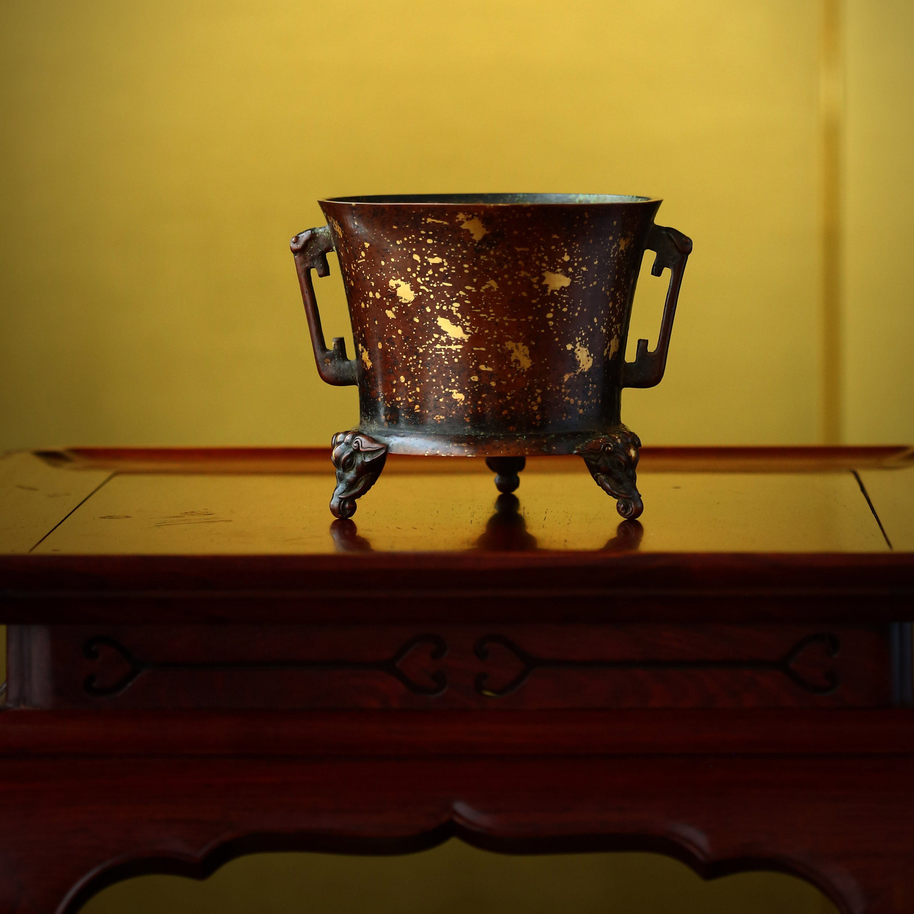 直径:13cm 高:12.5cm 三足铜炉 此铜炉做象首双耳三足,敞口造型经典,炉身嵌金,简约不失贵气。大象因其憨态可掬、诚实忠厚的形象成为全世界的吉祥物,而在中国传统文化里,“象”与“祥”字谐音,故象被赋予了更多吉祥的寓意。