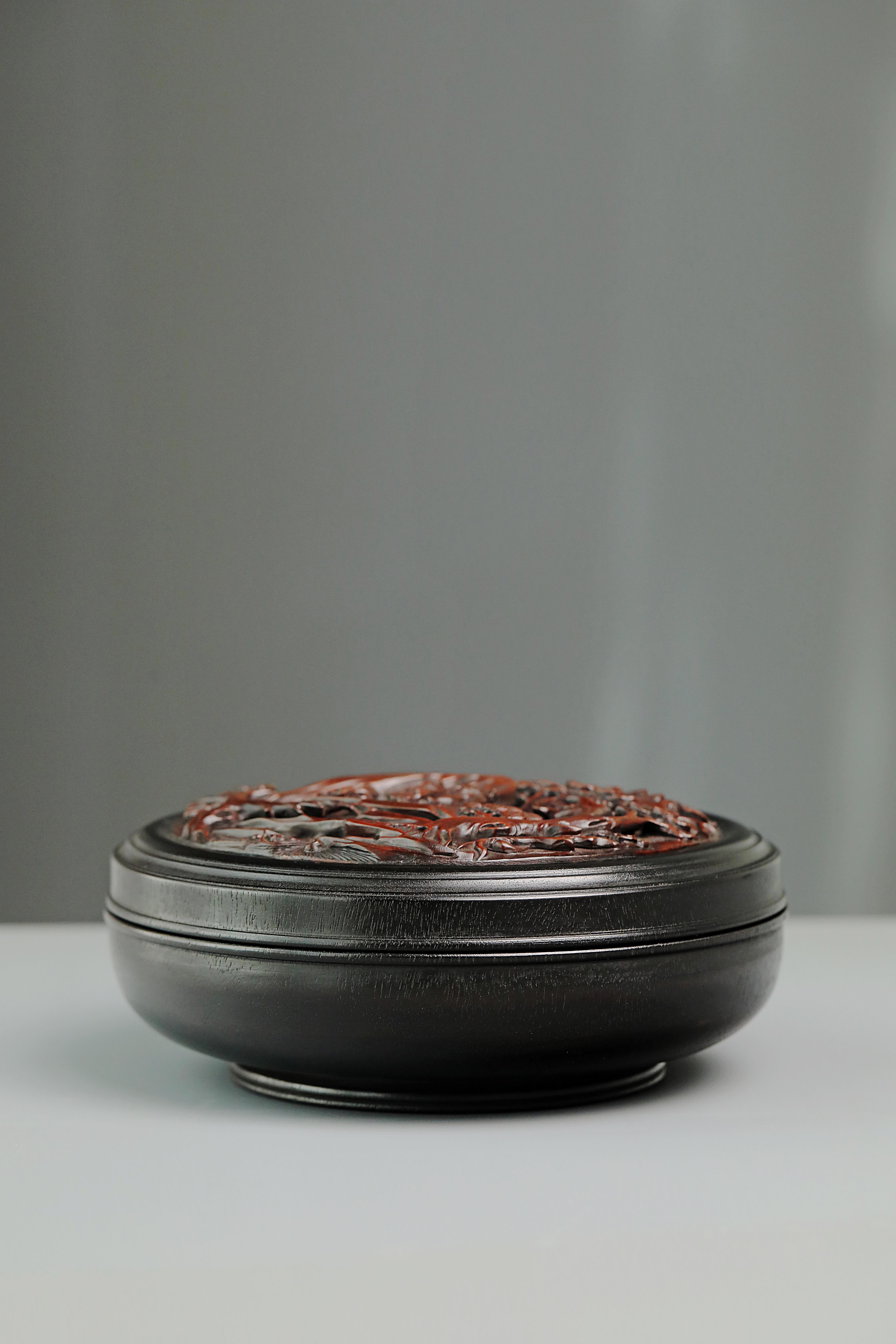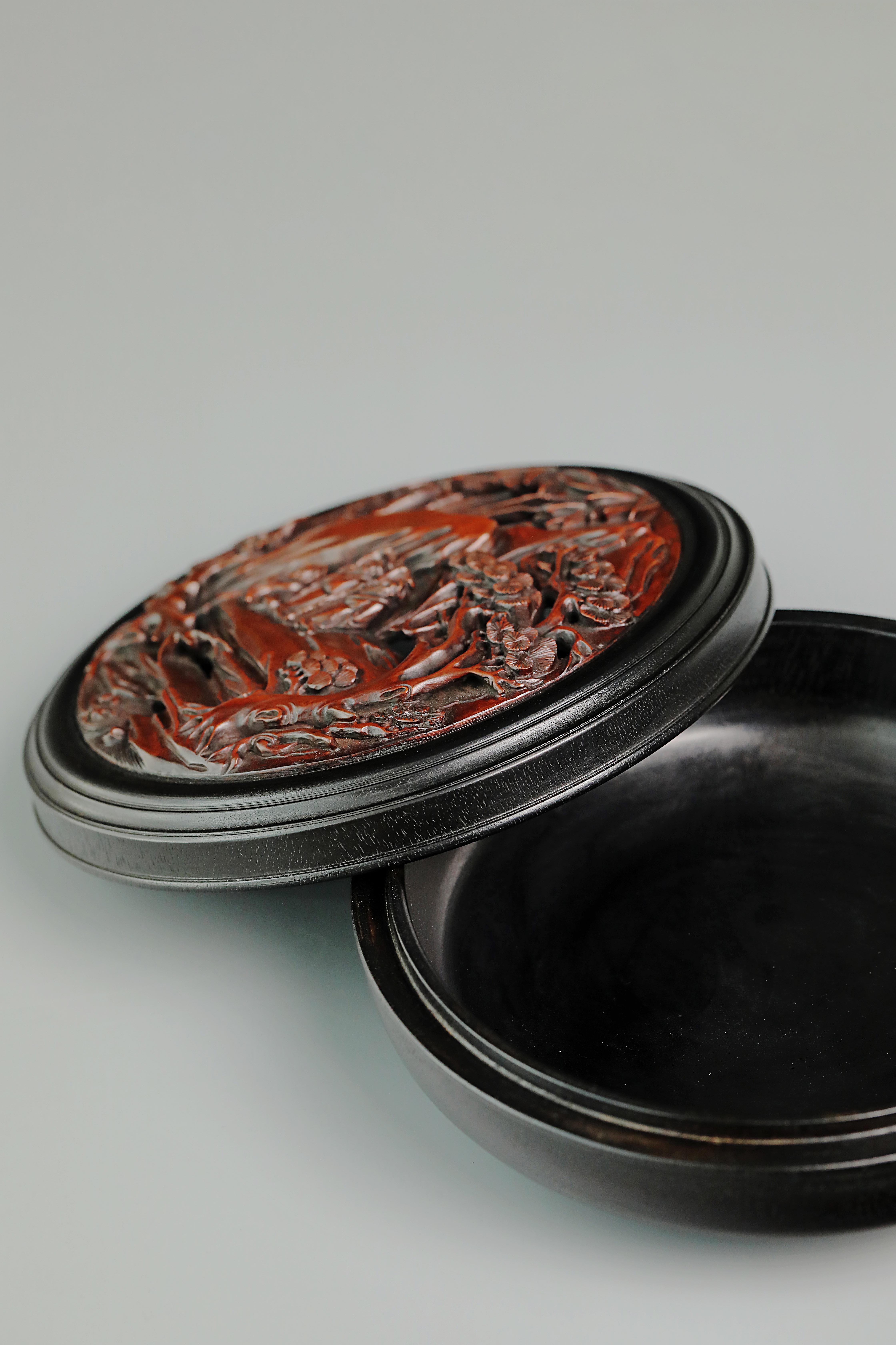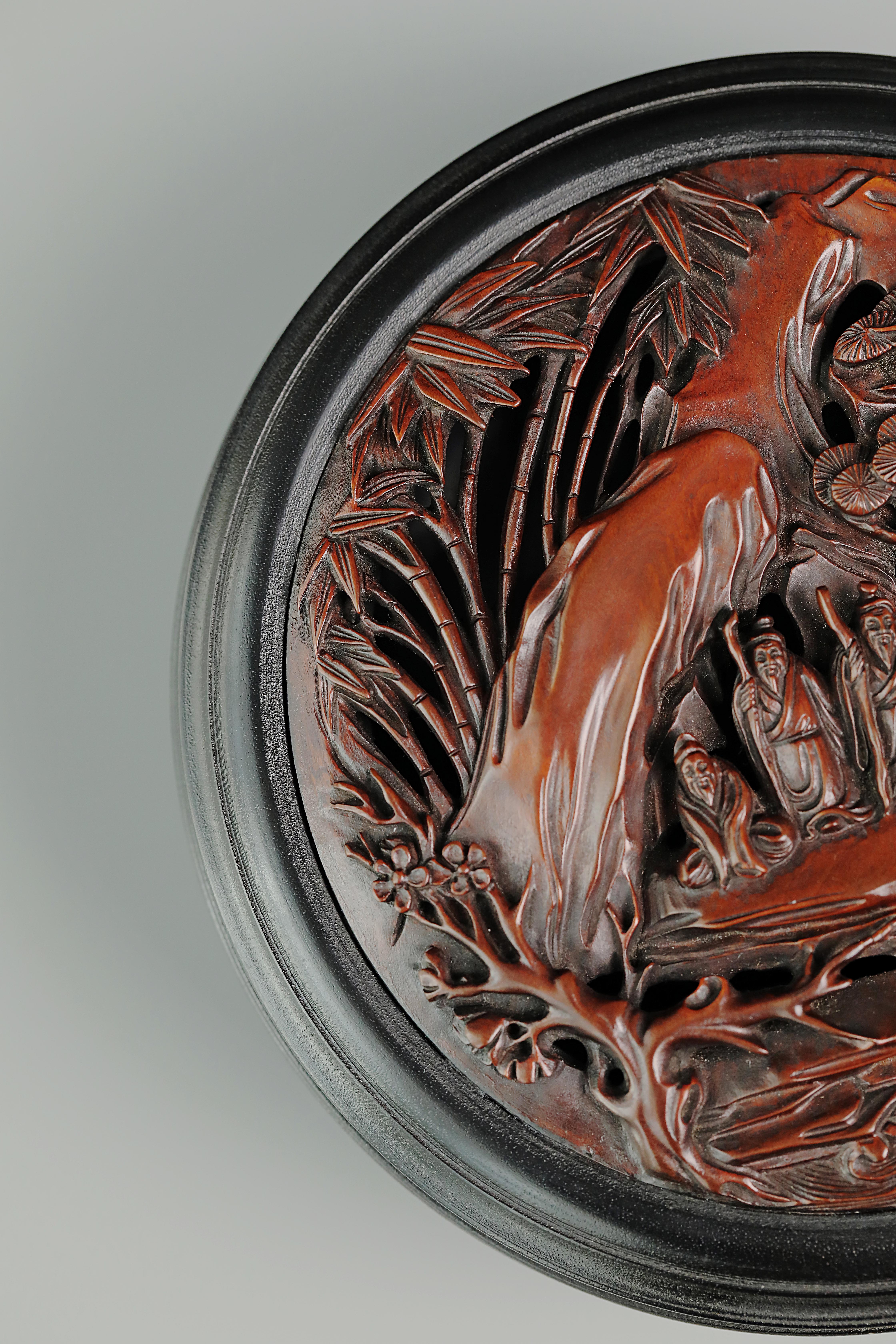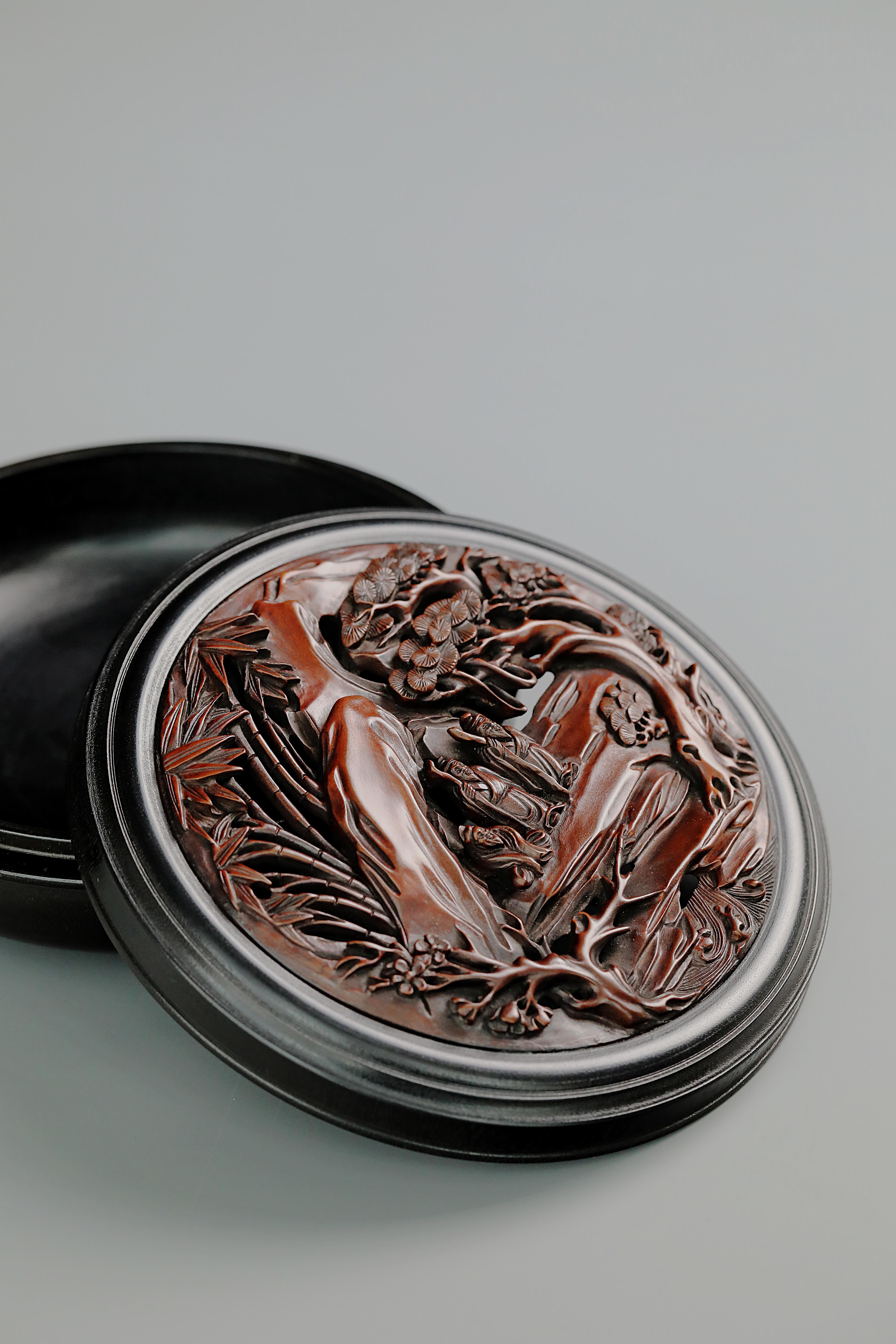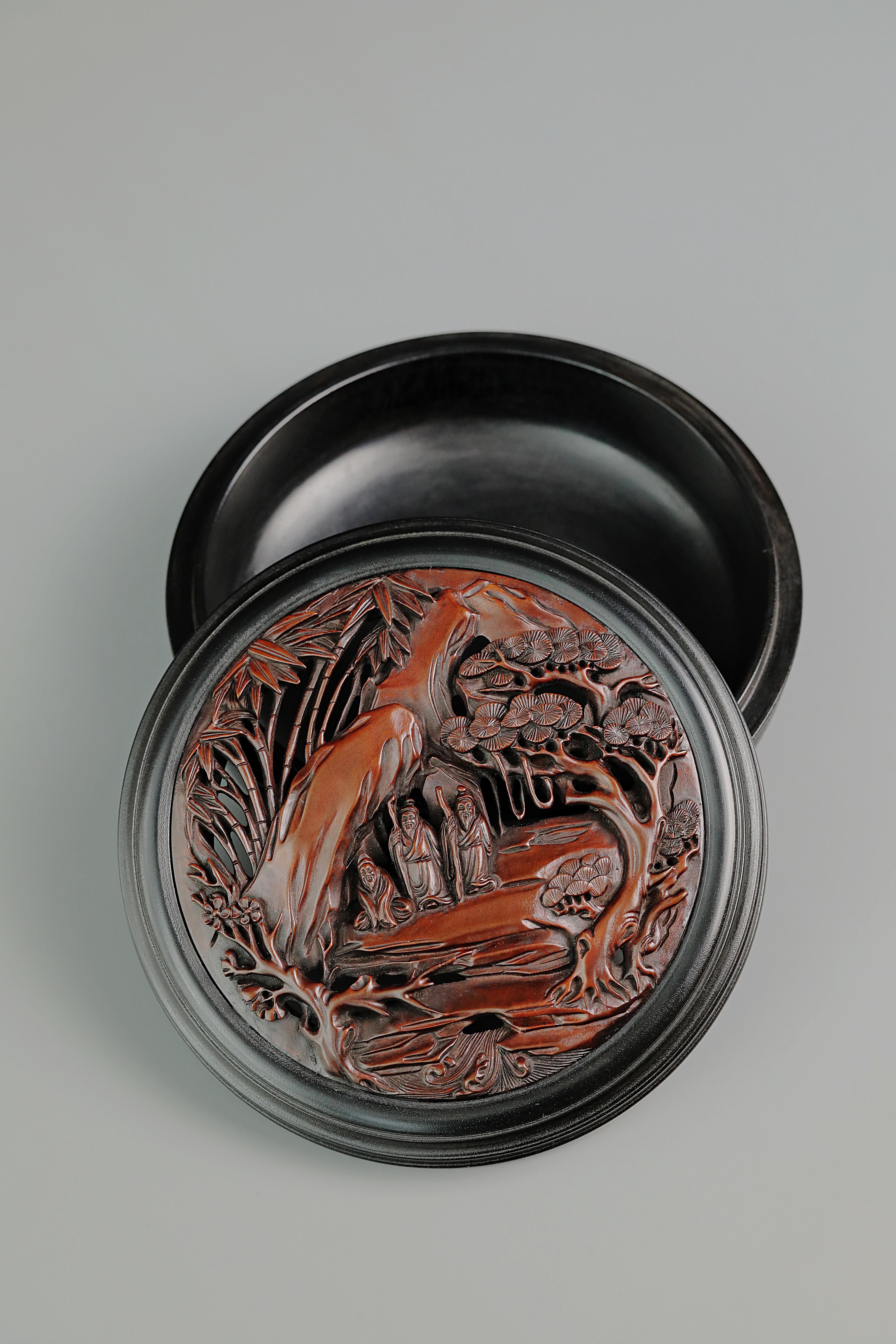 透雕岁寒三友人物圆香盒