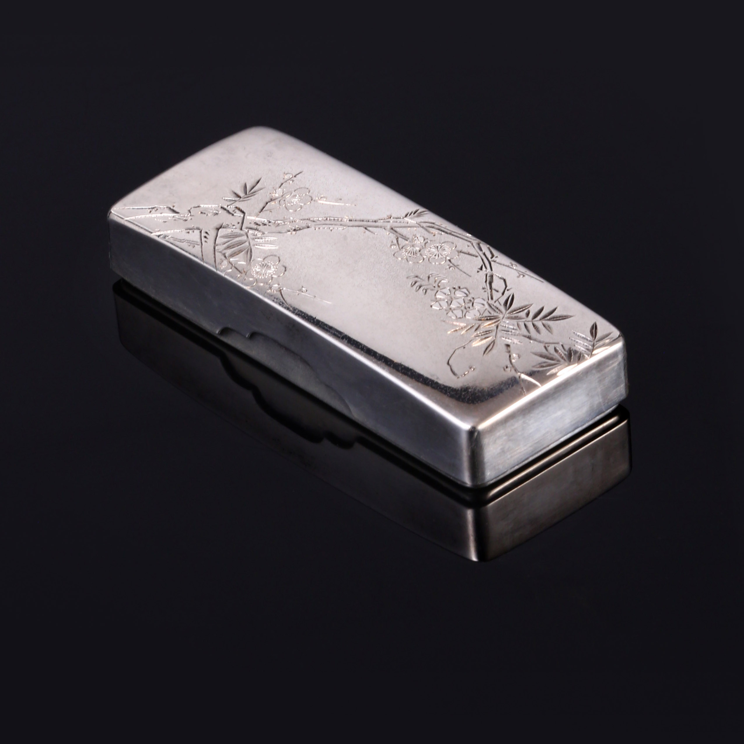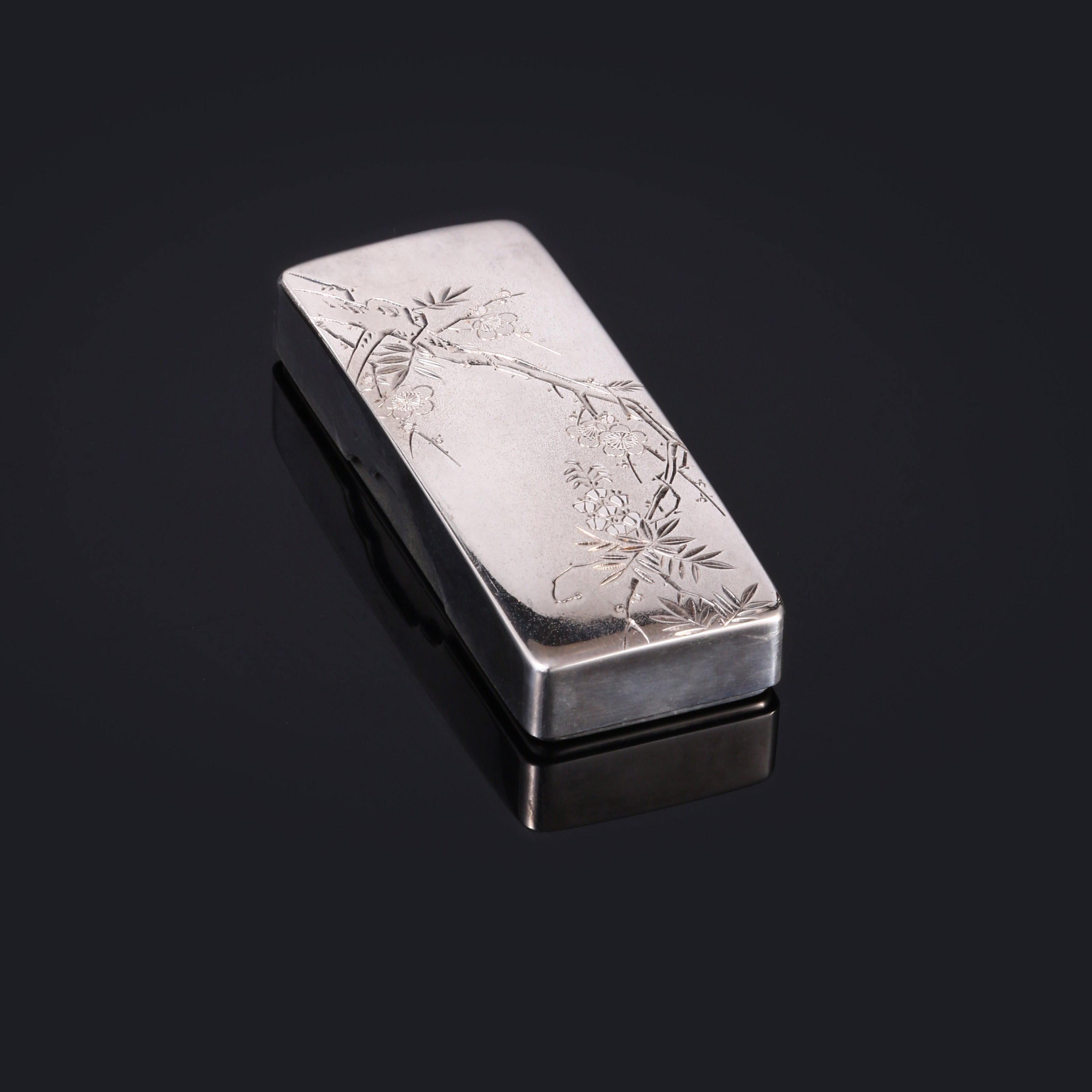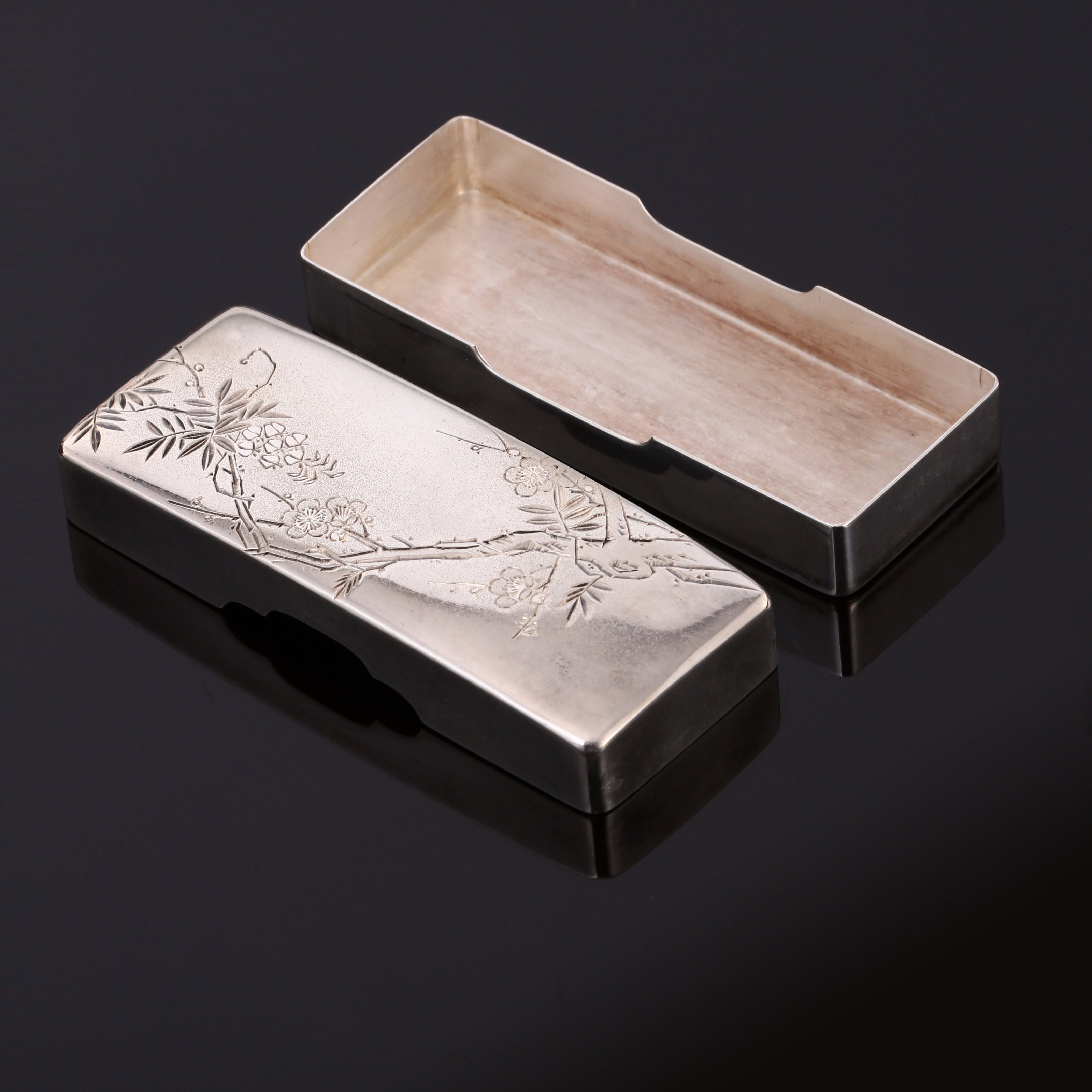 长:8cm,宽:3cm,厚:1.5cm 竹梅纯银沉香盒 香盒银质,规整长方形,盒面阴刻独枝梅树,梅枝苍劲,花朵绽放,紫藤缘木而上,条蔓纤结,披垂摇曳,刀法简洁,寥寥数笔,便勾勒出花叶娇嫩与质感遒劲之感。盒盖两侧镂祥云形,方便打开时着力,美观与实用兼具。