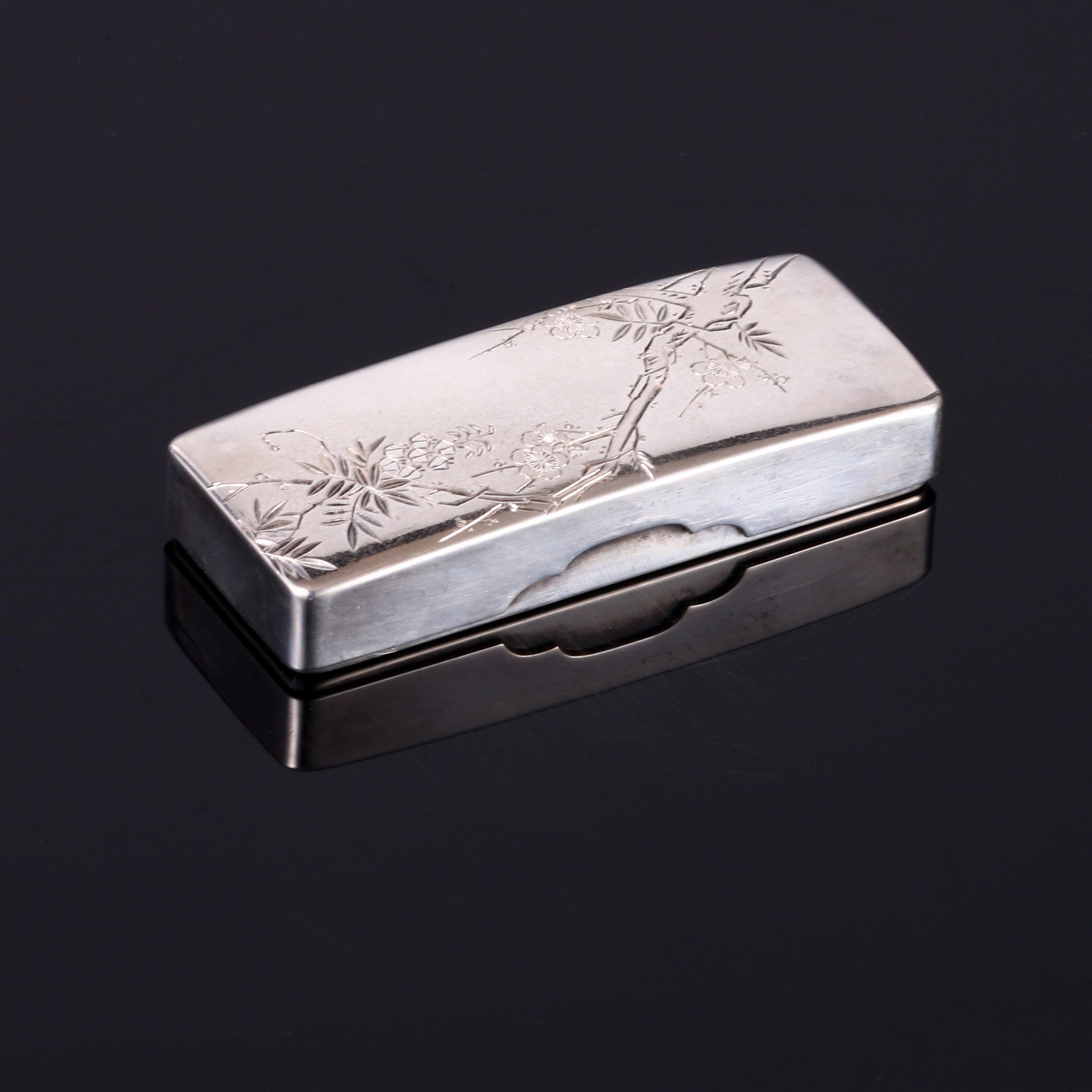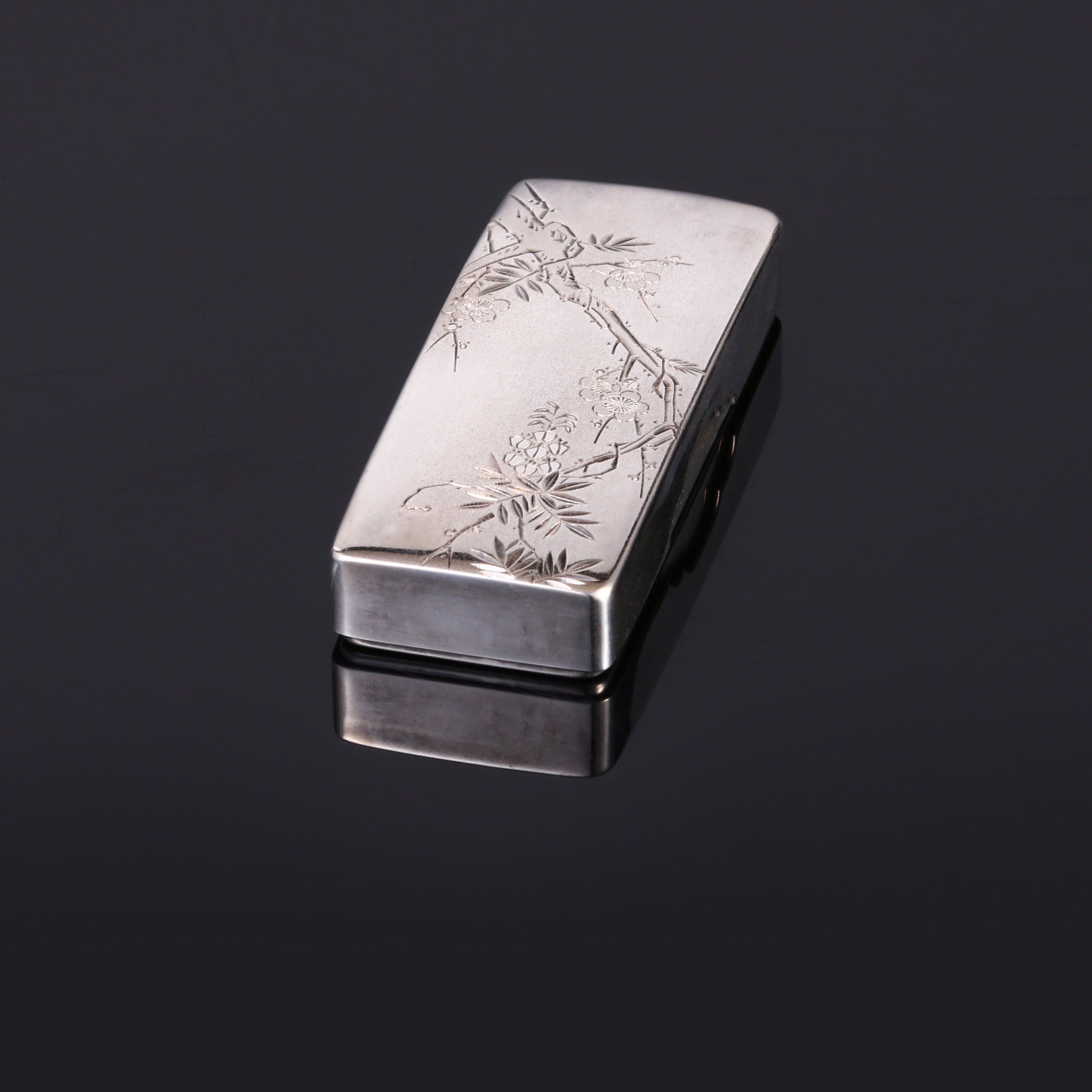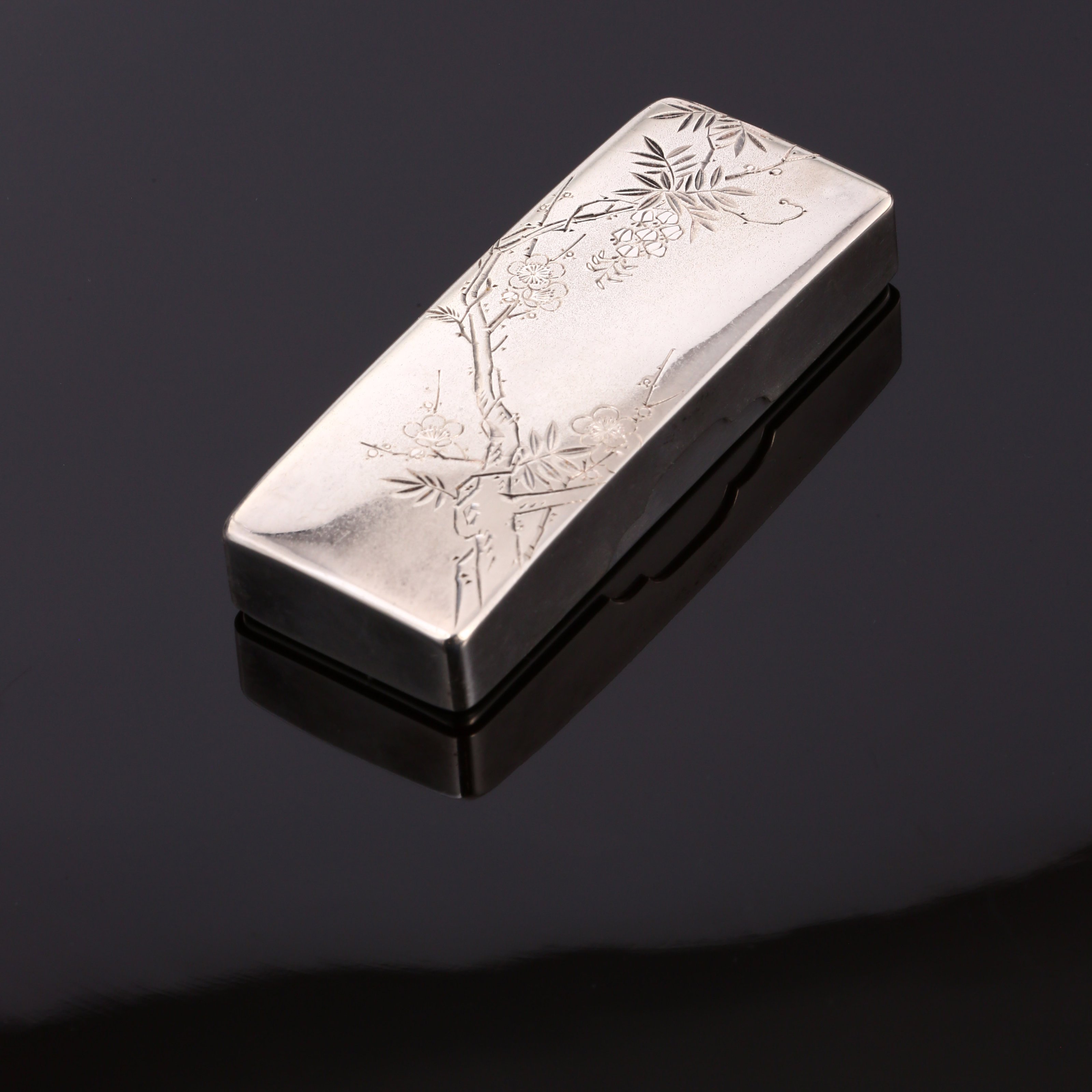 长:8cm,宽:3cm,厚:1.5cm 竹梅纯银沉香盒 香盒银质,规整长方形,盒面阴刻独枝梅树,梅枝苍劲,花朵绽放,紫藤缘木而上,条蔓纤结,披垂摇曳,刀法简洁,寥寥数笔,便勾勒出花叶娇嫩与质感遒劲之感。盒盖两侧镂祥云形,方便打开时着力,美观与实用兼具。