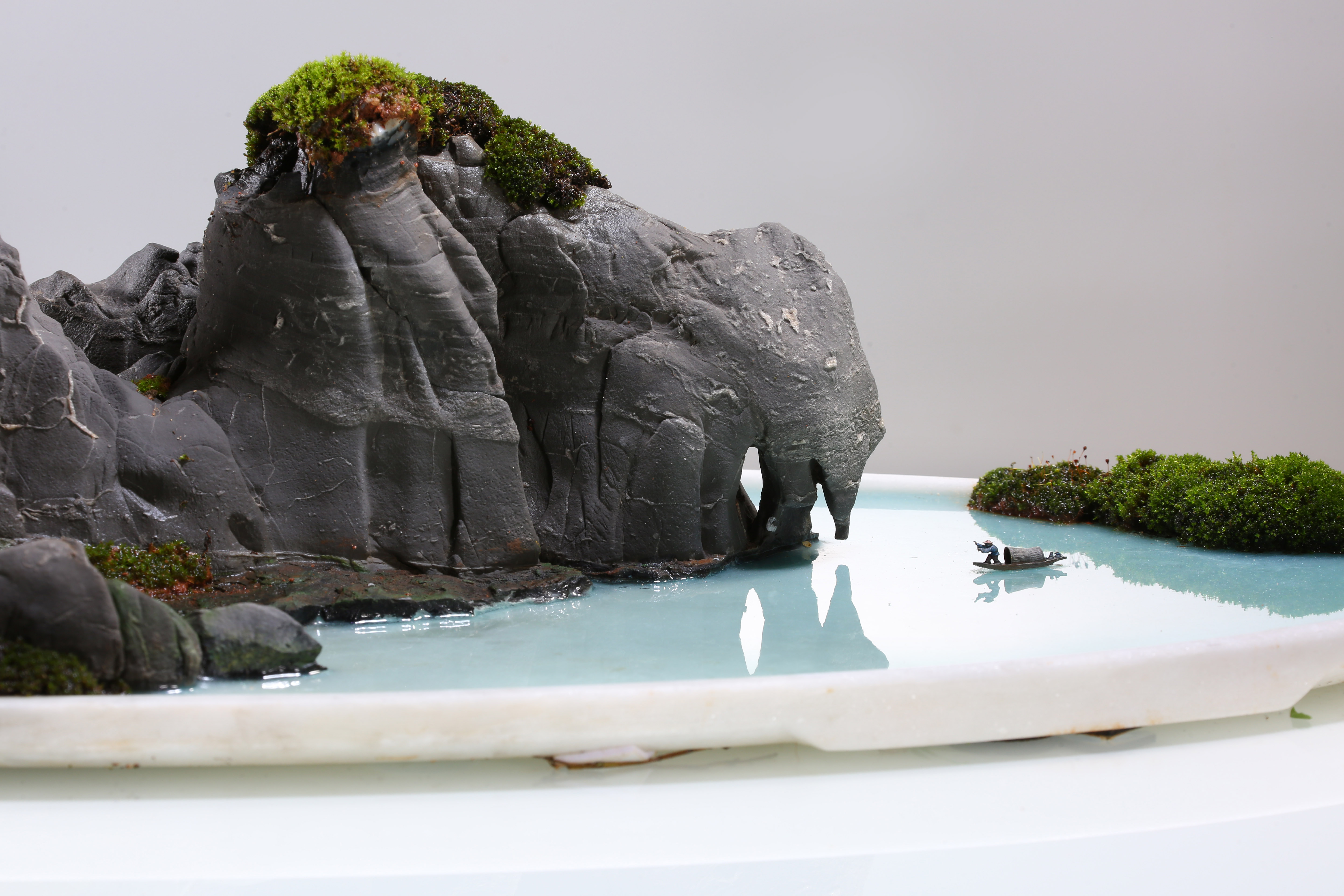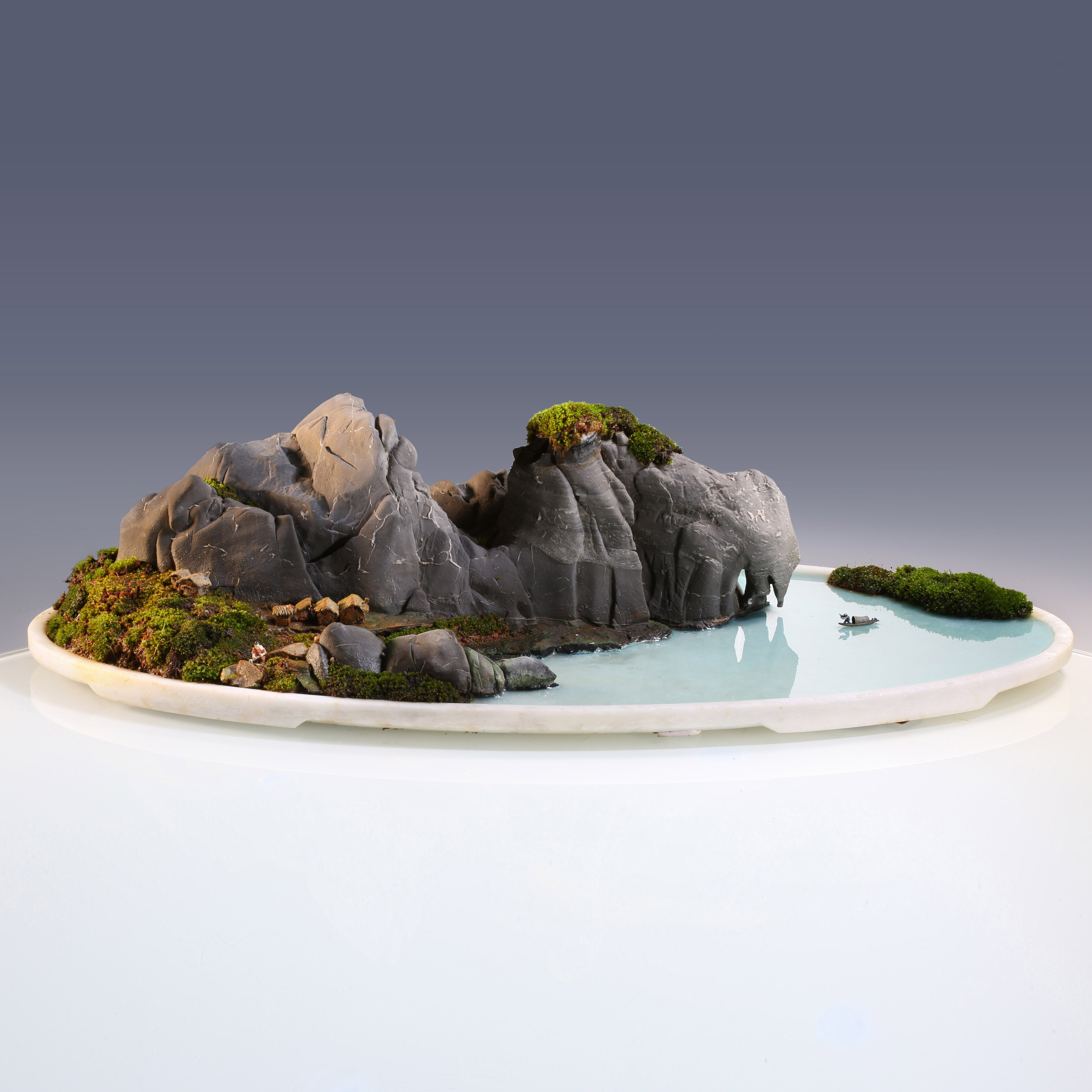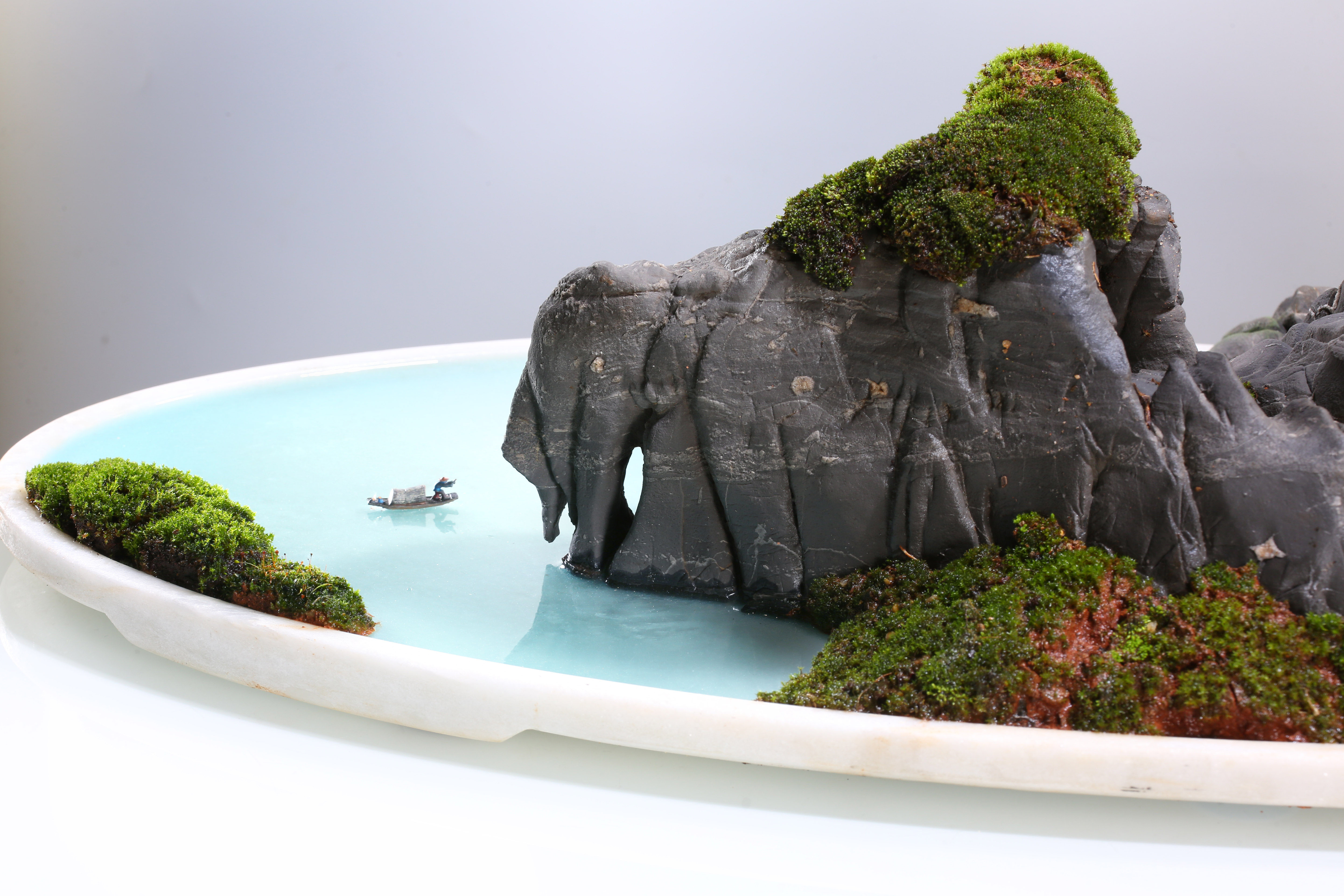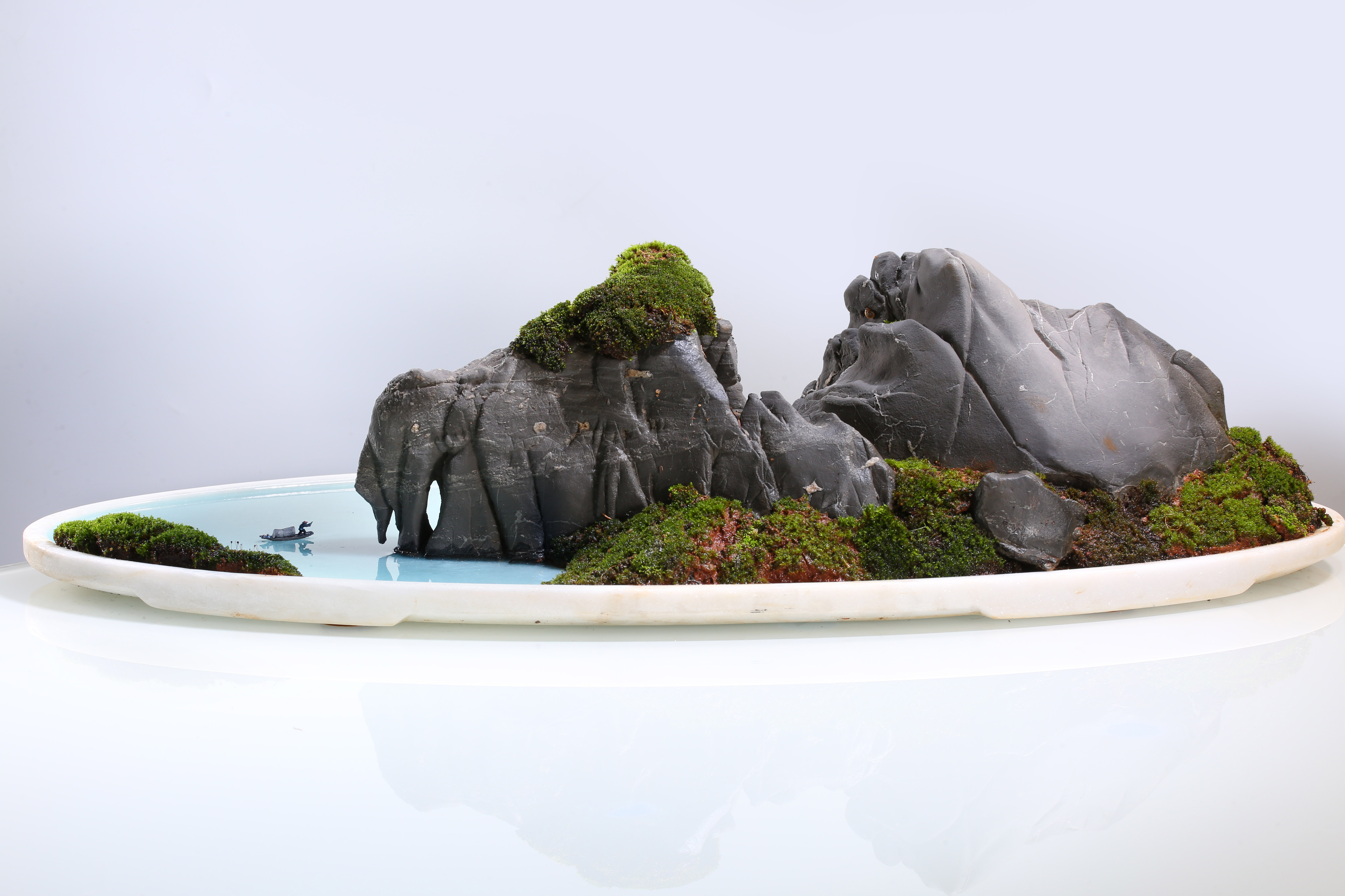 盆长:60cm宽:32cm石高:18cm 渔舟唱晚 山石盆景 主峰为一整块天然石头,有峡谷、有洞幽,有象鼻。石入盆中,绿水荡漾,夹岸苔藓为林为丘。船头渔翁撒网,船尾鱼鹰停歇。山脚下屋舍俨然,山民耕作。千万年来,人在天地间都如此生活,自有国家皇帝、战乱,淡泊成为奢望 ,宁静寄予方寸小盆。
