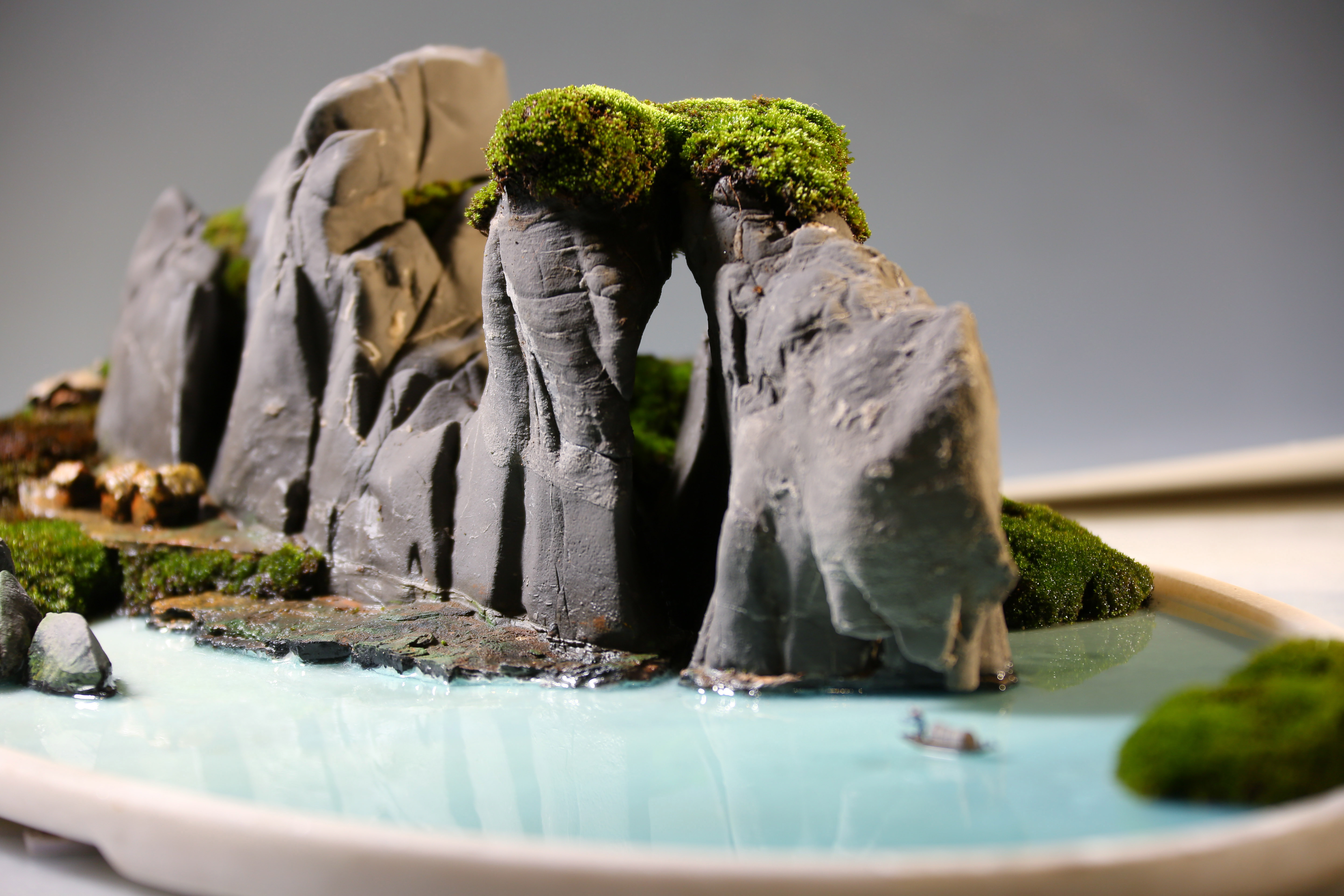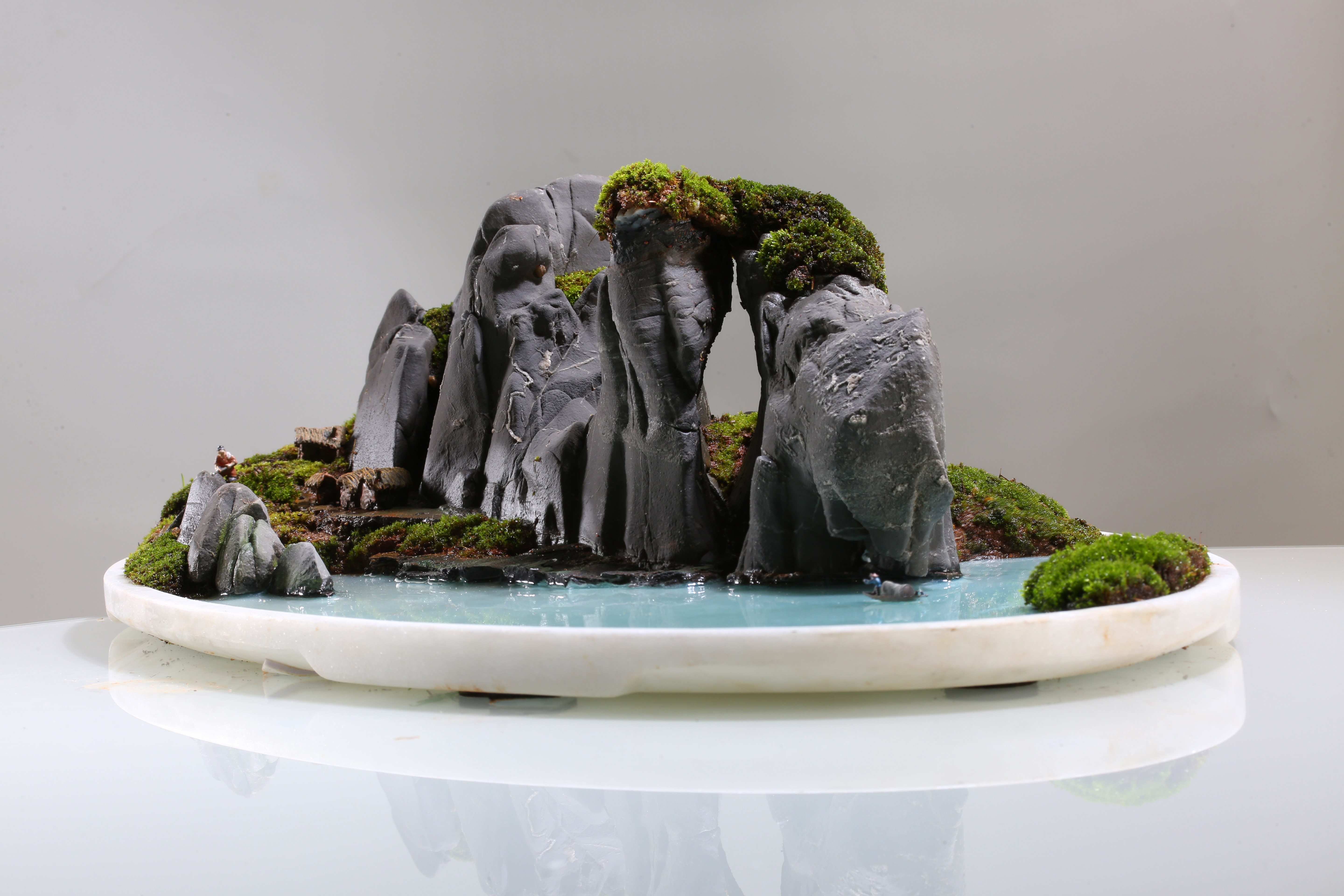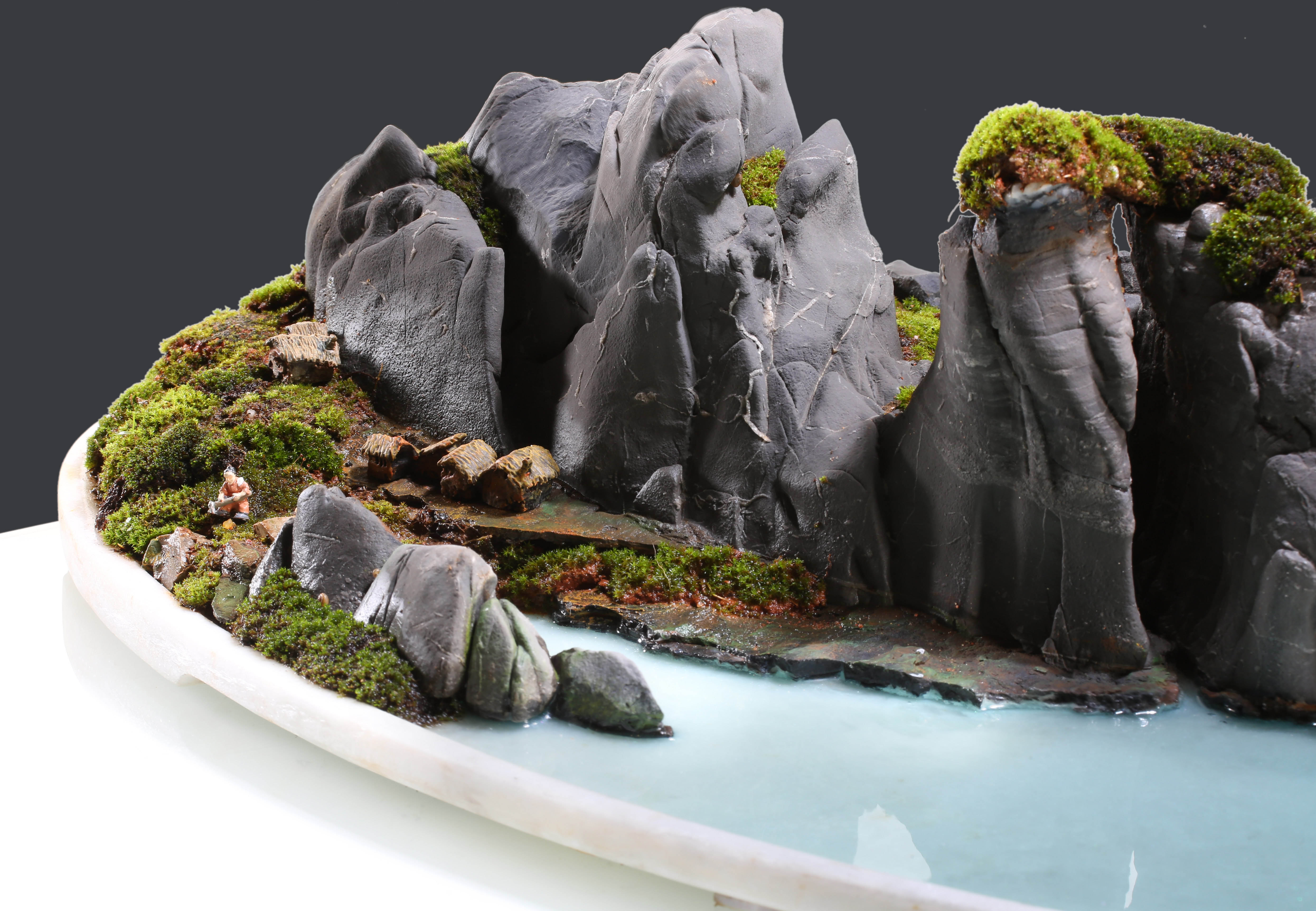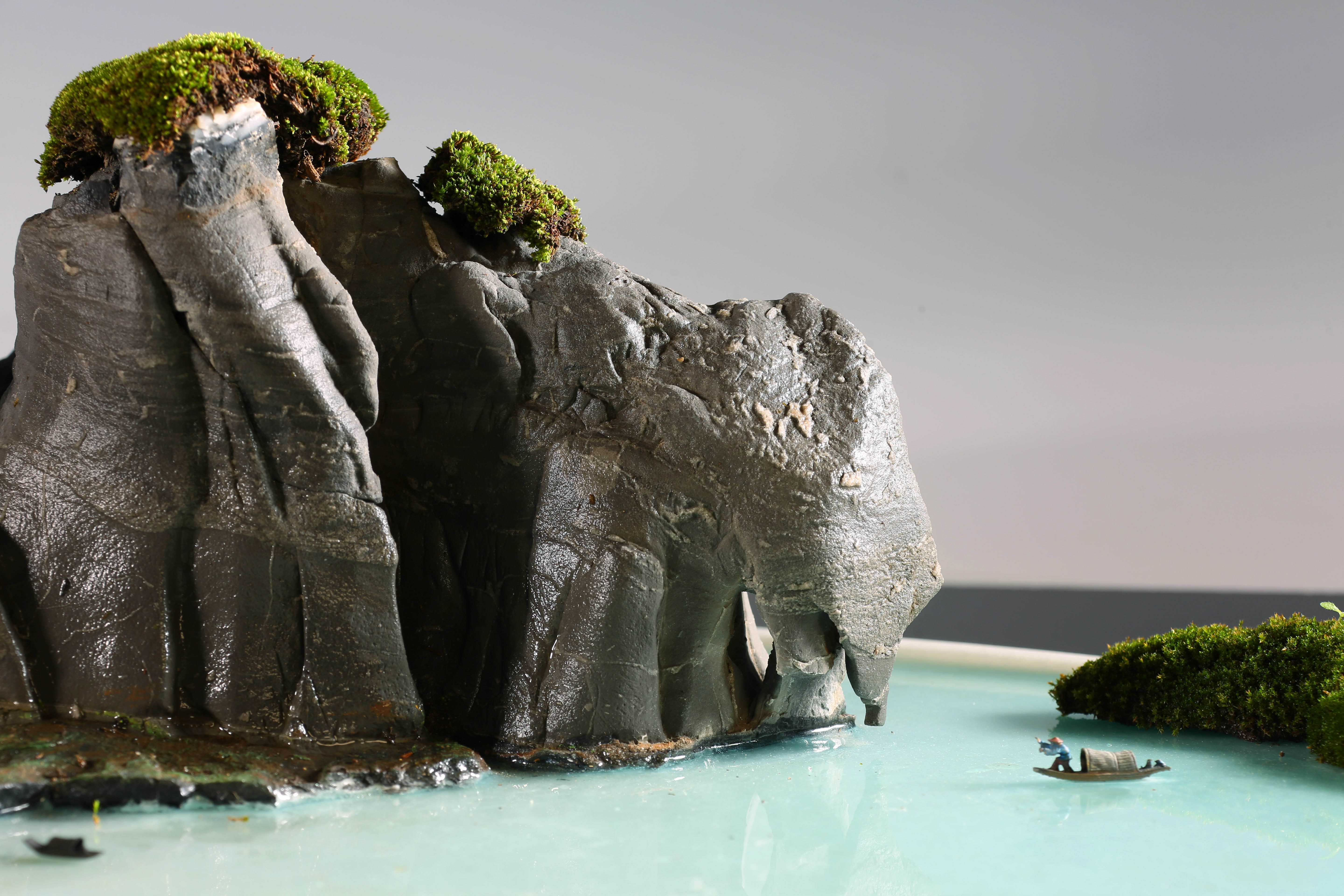 盆长:60cm宽:32cm石高:18cm 渔舟唱晚 山石盆景 主峰为一整块天然石头,有峡谷、有洞幽,有象鼻。石入盆中,绿水荡漾,夹岸苔藓为林为丘。船头渔翁撒网,船尾鱼鹰停歇。山脚下屋舍俨然,山民耕作。千万年来,人在天地间都如此生活,自有国家皇帝、战乱,淡泊成为奢望 ,宁静寄予方寸小盆。