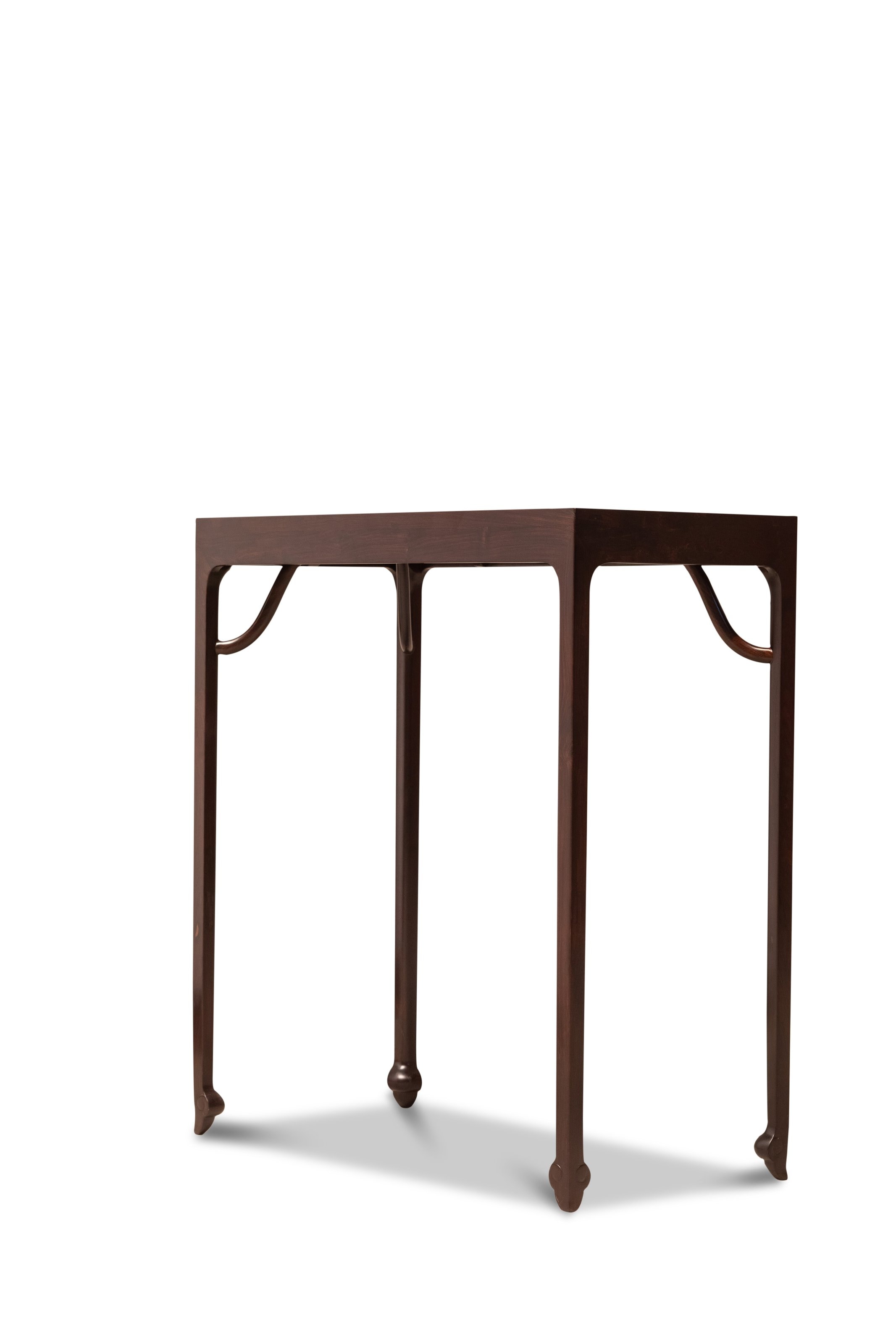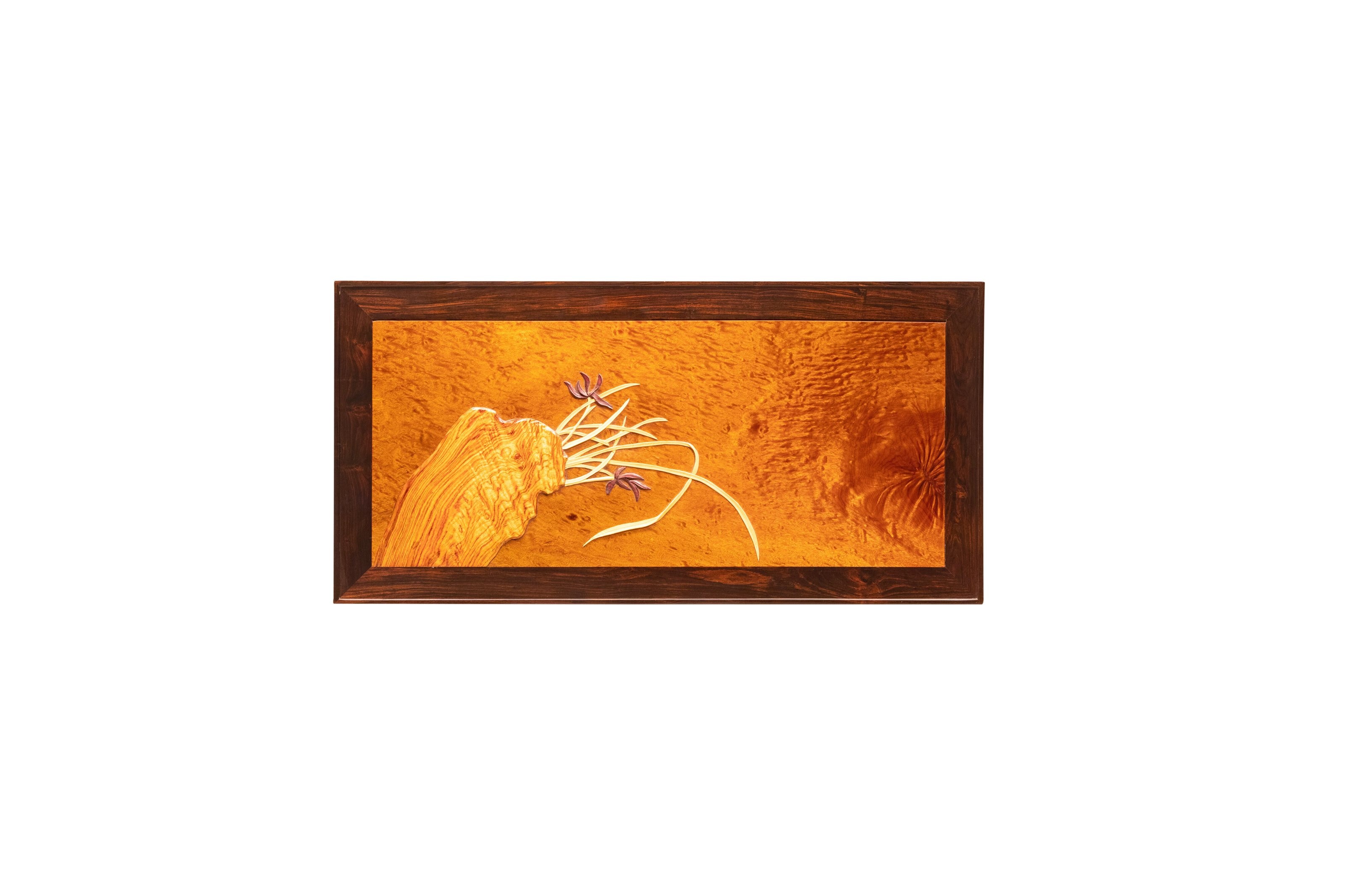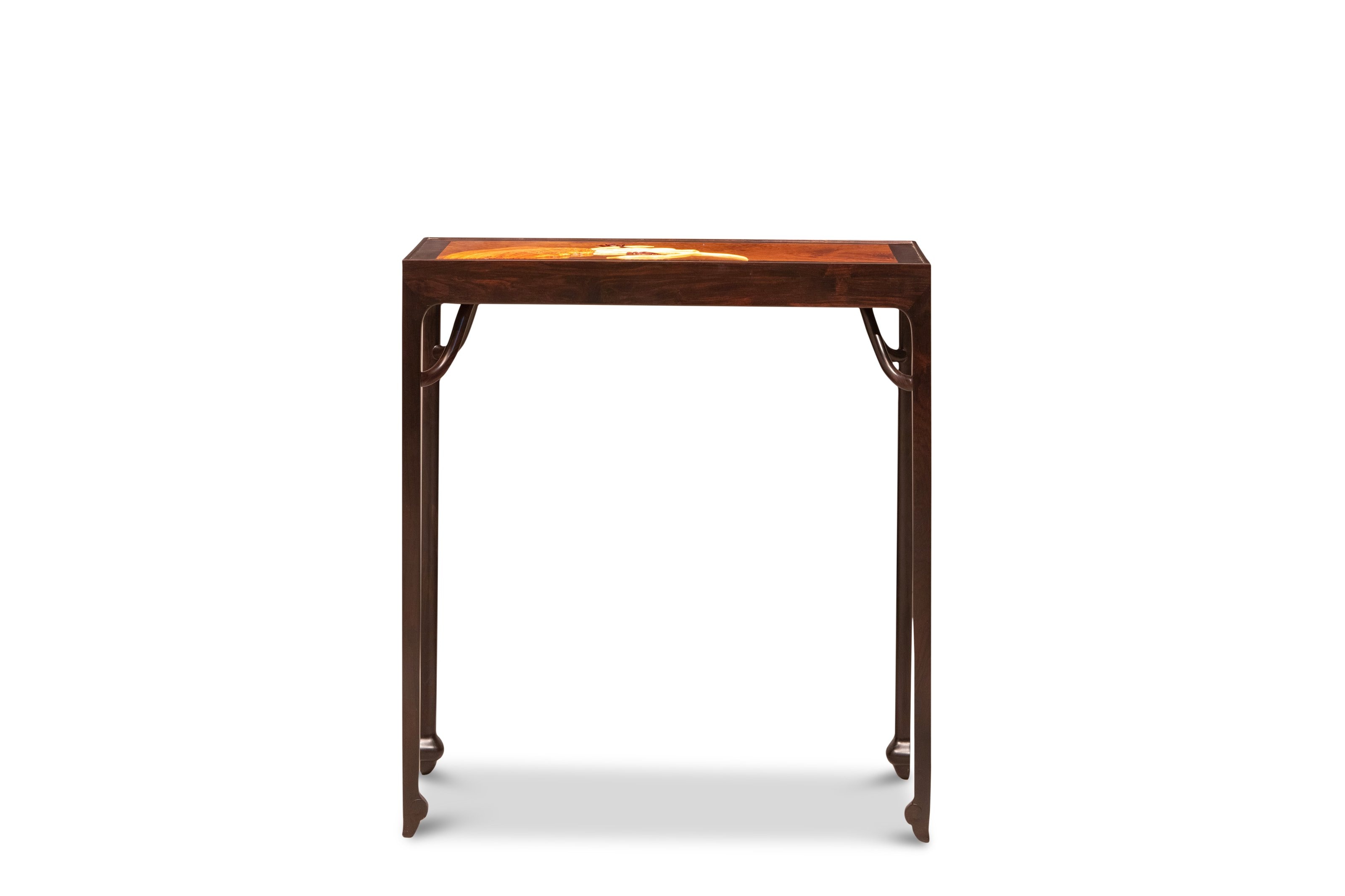 半桌以黑酸枝镶嵌金丝楠面心,桌面镶嵌兰石图,十分雅致。四面平式,腿足方材,直落于地,底收如意纹马蹄足,微外撇,桌面与腿足间设霸王枨。