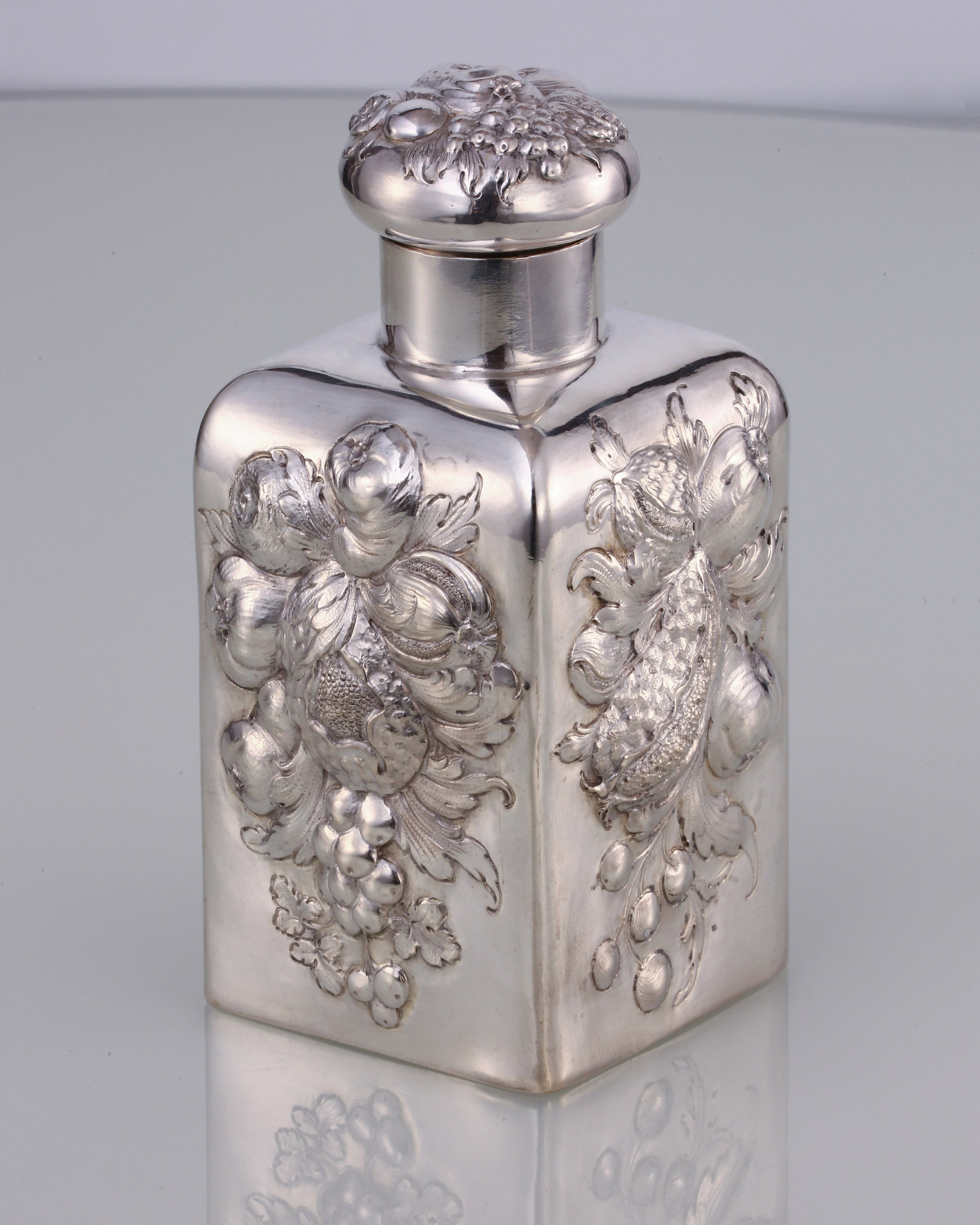 高15.5cm, 宽:8cm, 重:288g 硕果——纯银高浮雕19世纪茶叶罐 年代:19世纪 城市:德国 材质:800银 银质方形壶,束颈小口,圆帽,腹身四面与帽顶皆高浮雕花果纹,富丽雅致,果叶卷舒,清新自然。底部戳印,依传统记录制作者信息。