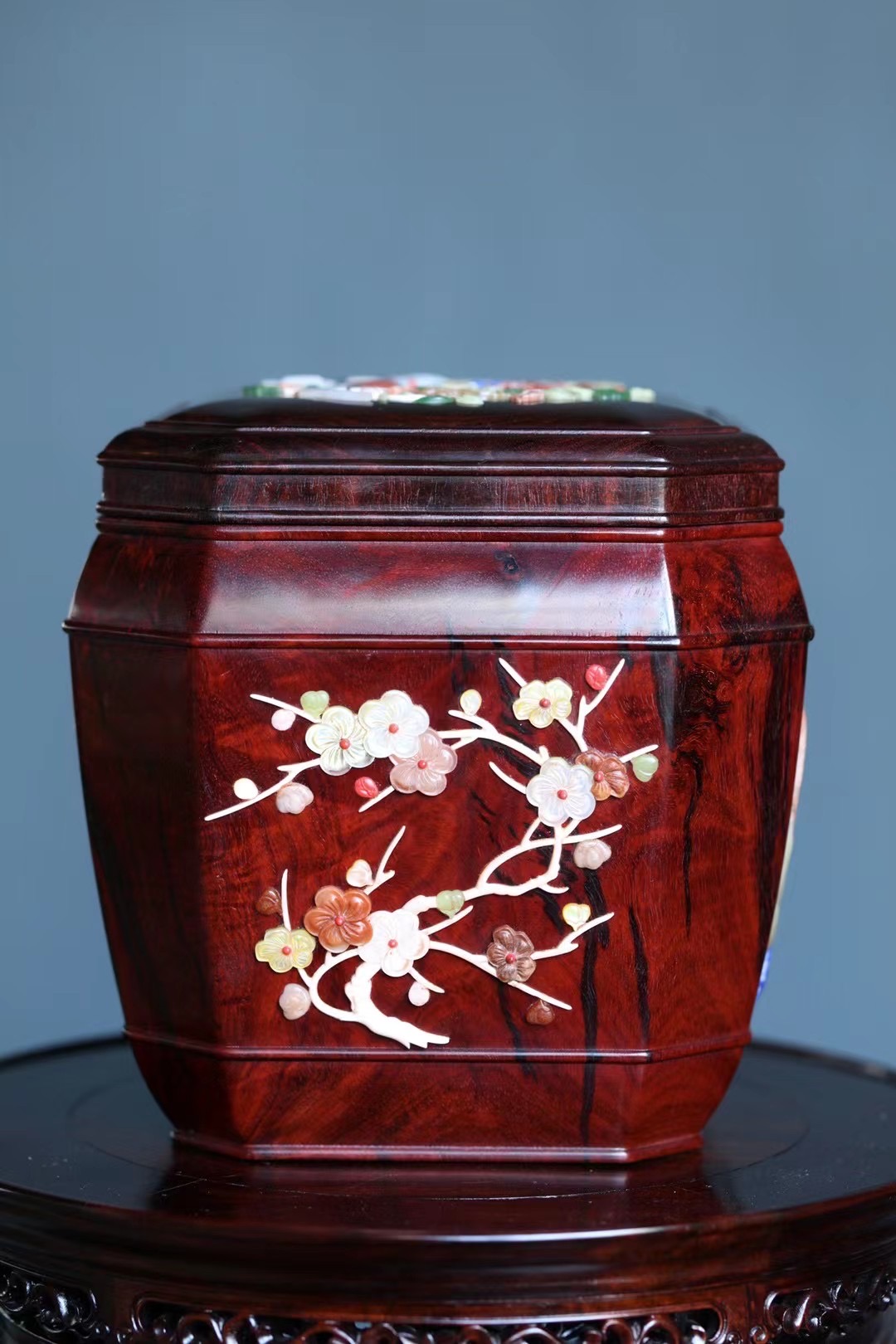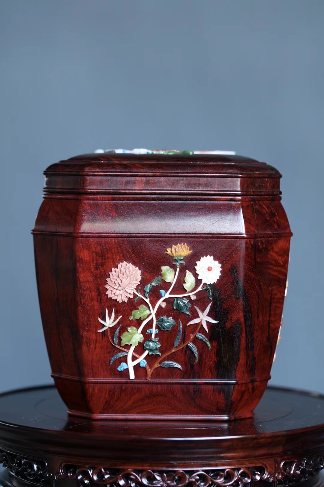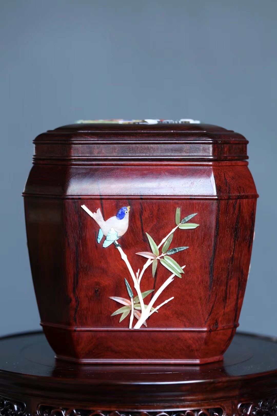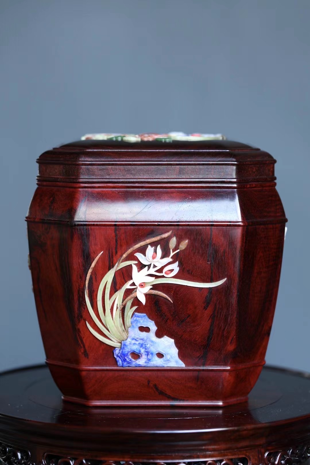 高:17.5cm 宽:17.5cm 高:17.5cm 重量:1899g 小叶紫檀四季吉祥茶罐 整木制器,形韵端方文雅。面嵌梅兰竹菊,各具清雅风姿,盖作绶带鸟一双,更添吉祥佳寓。 高17.5cm 宽17.5cm 高17.5cm 重量 1899g 高17.5cm 宽17.5cm 高17.5cm 重量 1899g