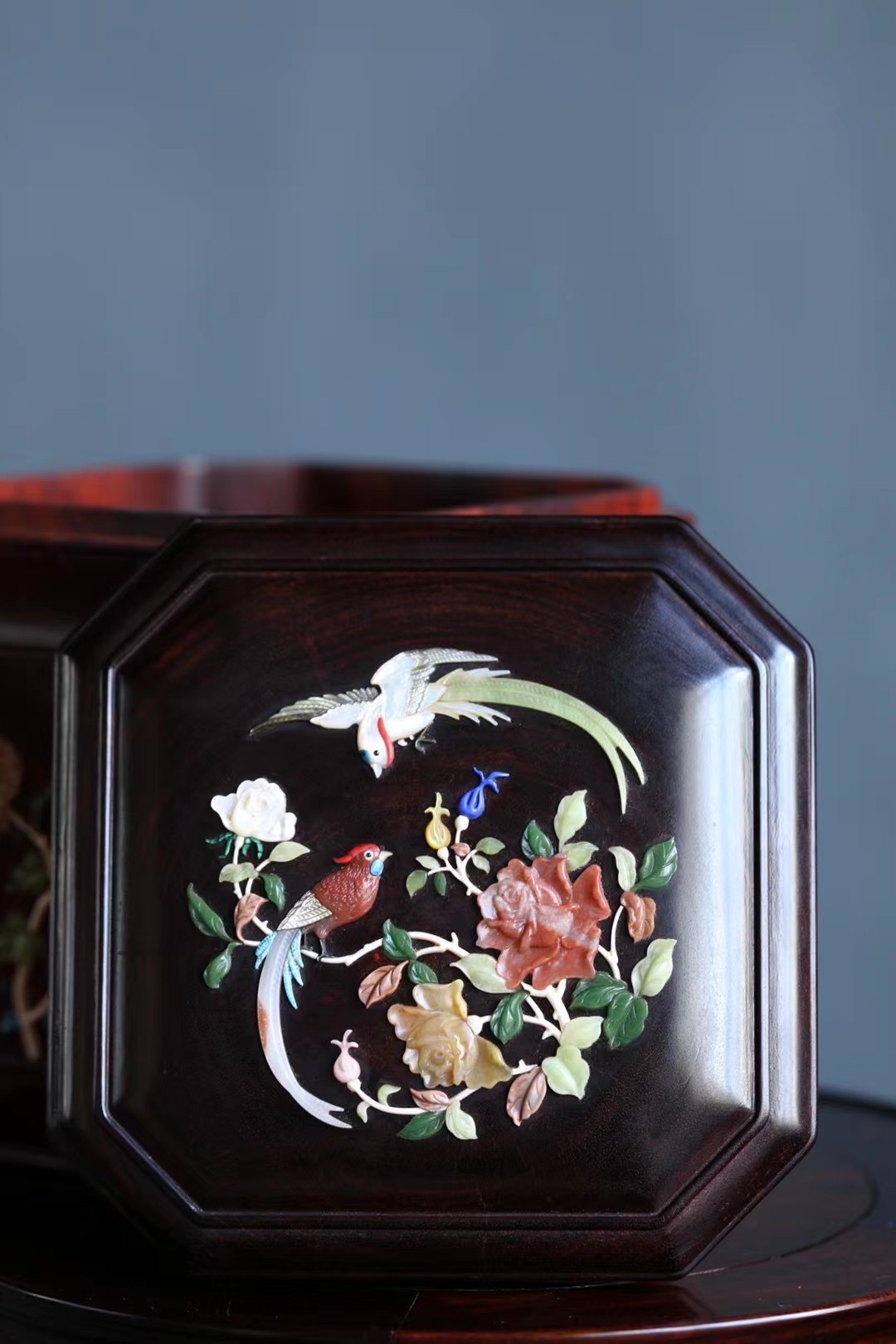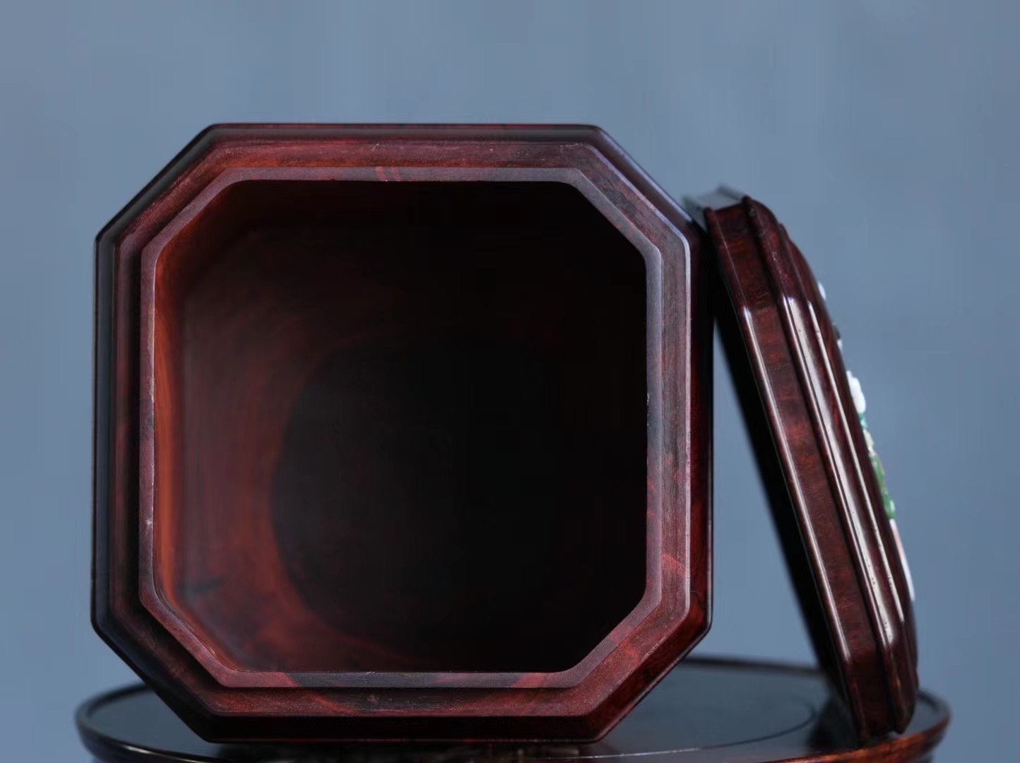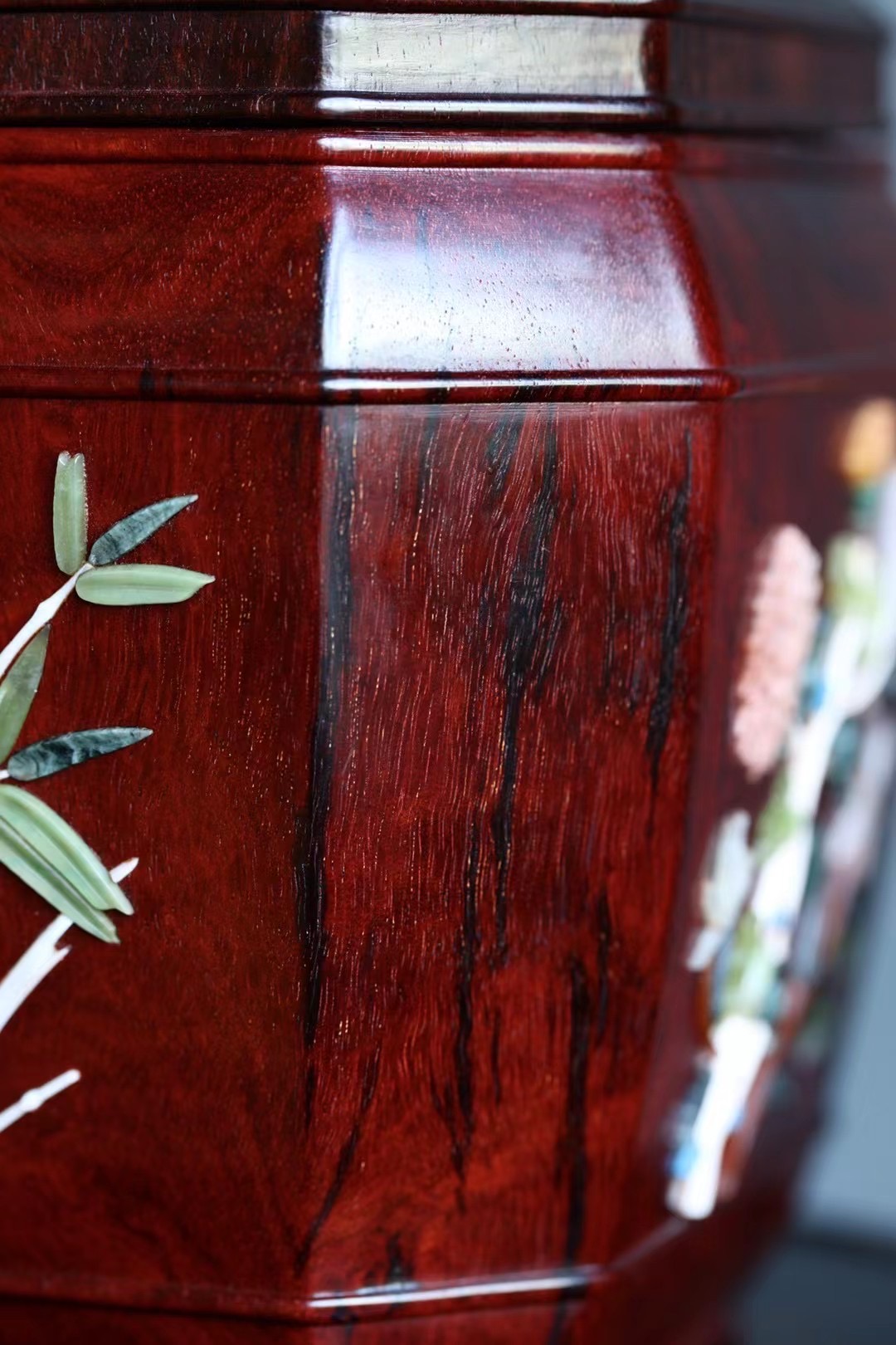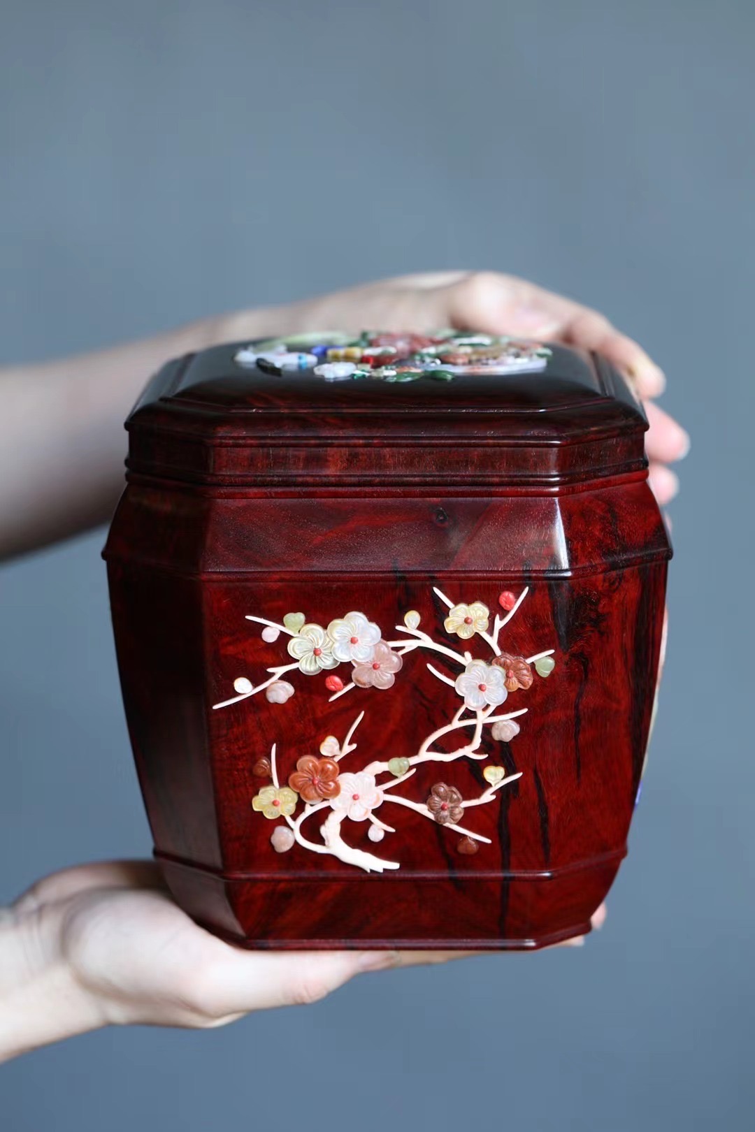 高:17.5cm 宽:17.5cm 高:17.5cm 重量:1899g 小叶紫檀四季吉祥茶罐 整木制器,形韵端方文雅。面嵌梅兰竹菊,各具清雅风姿,盖作绶带鸟一双,更添吉祥佳寓。 高17.5cm 宽17.5cm 高17.5cm 重量 1899g 高17.5cm 宽17.5cm 高17.5cm 重量 1899g