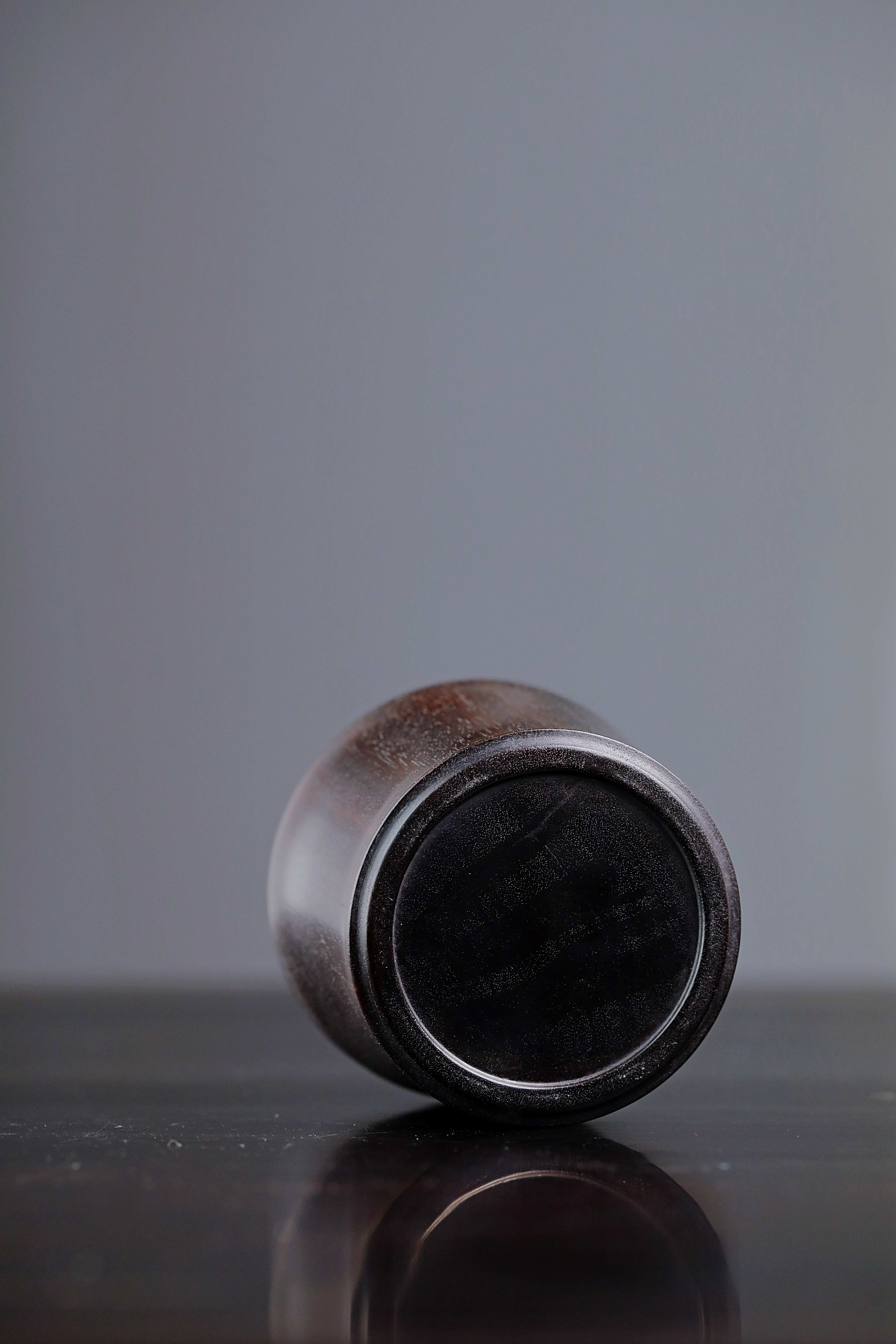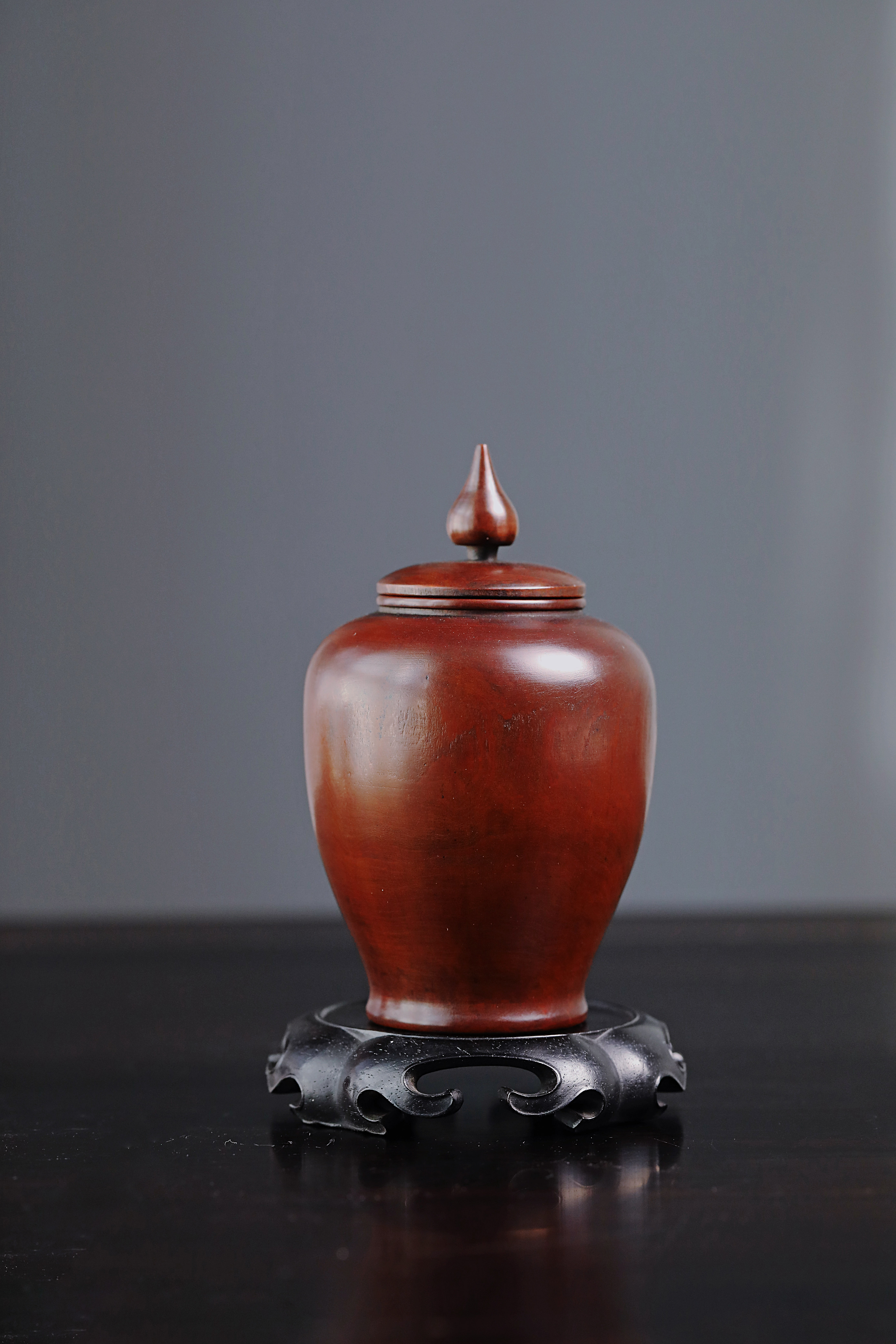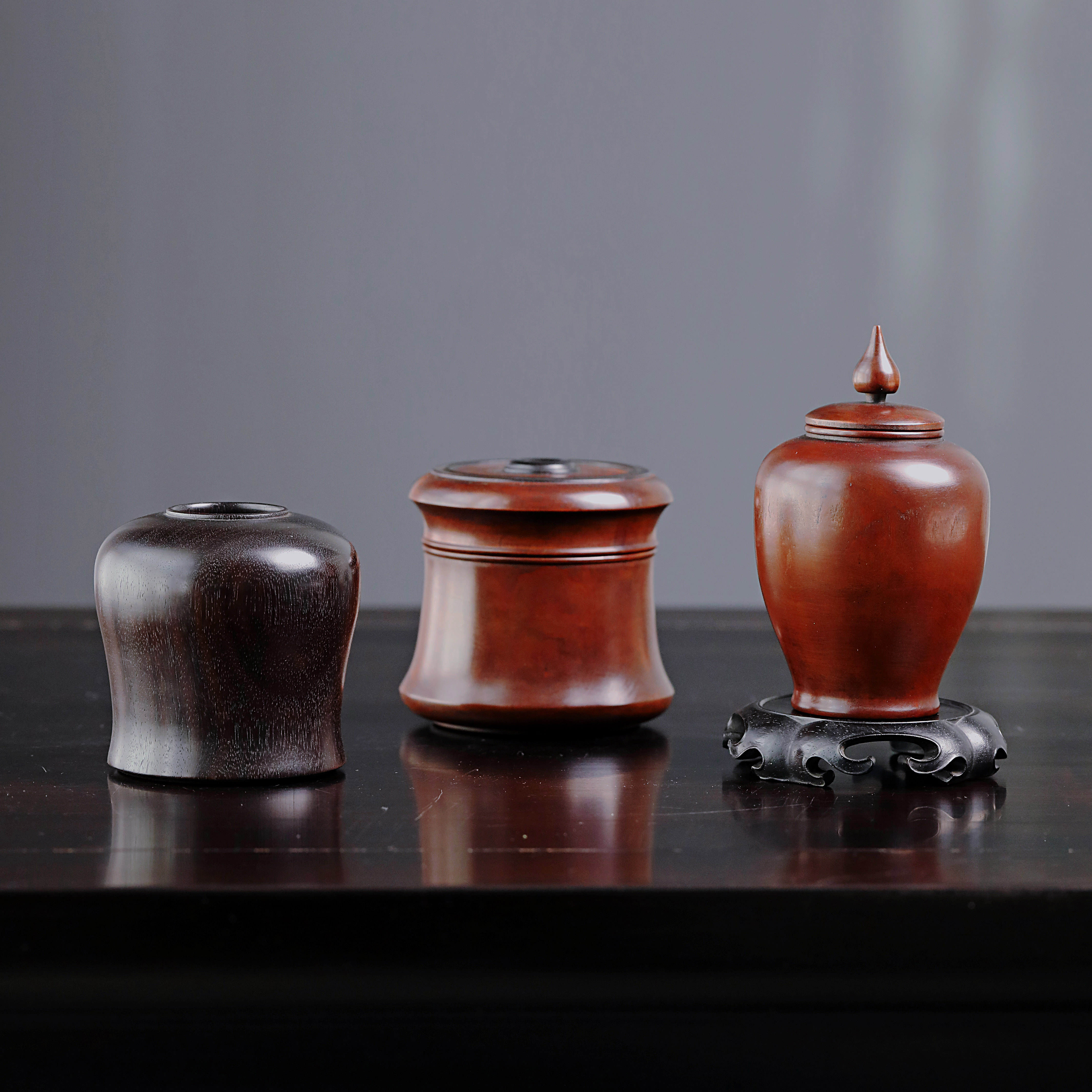 最大直径:8.5cm 高:8cm 最大直径:7.5cm 高:7cm 最大直径:6.5cm 高:11.5cm 血檀水盂钟铃之形,周身光素,小口微唇,丰肩弧腹,造型饱满圆润;亚腰茶罐,皮壳红润,口沿上下起线,造型优雅;罐式茶仓,水滴式钮,颇为别致,丰肩弧腹,底足外撇,承卷草式座,形制考究。