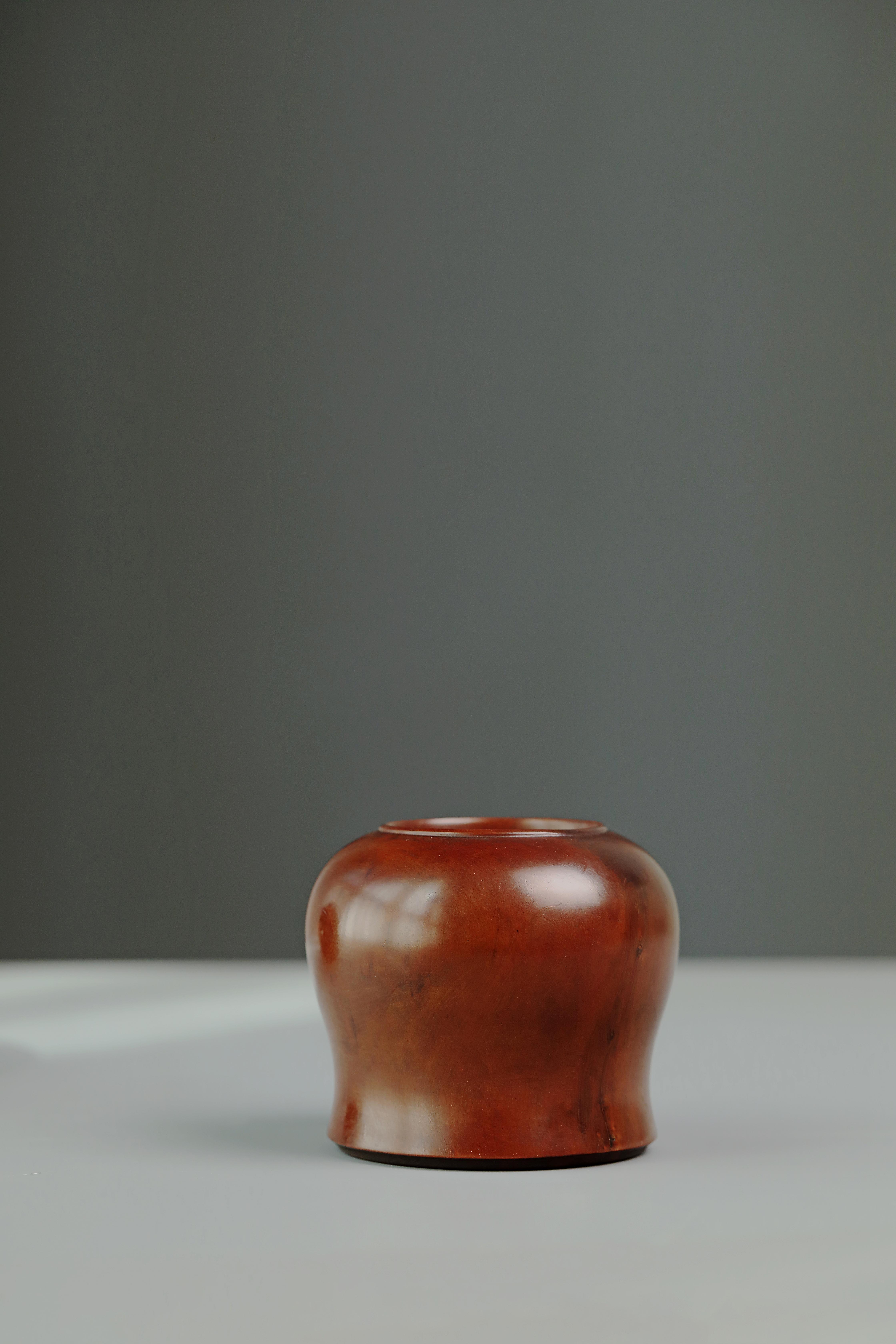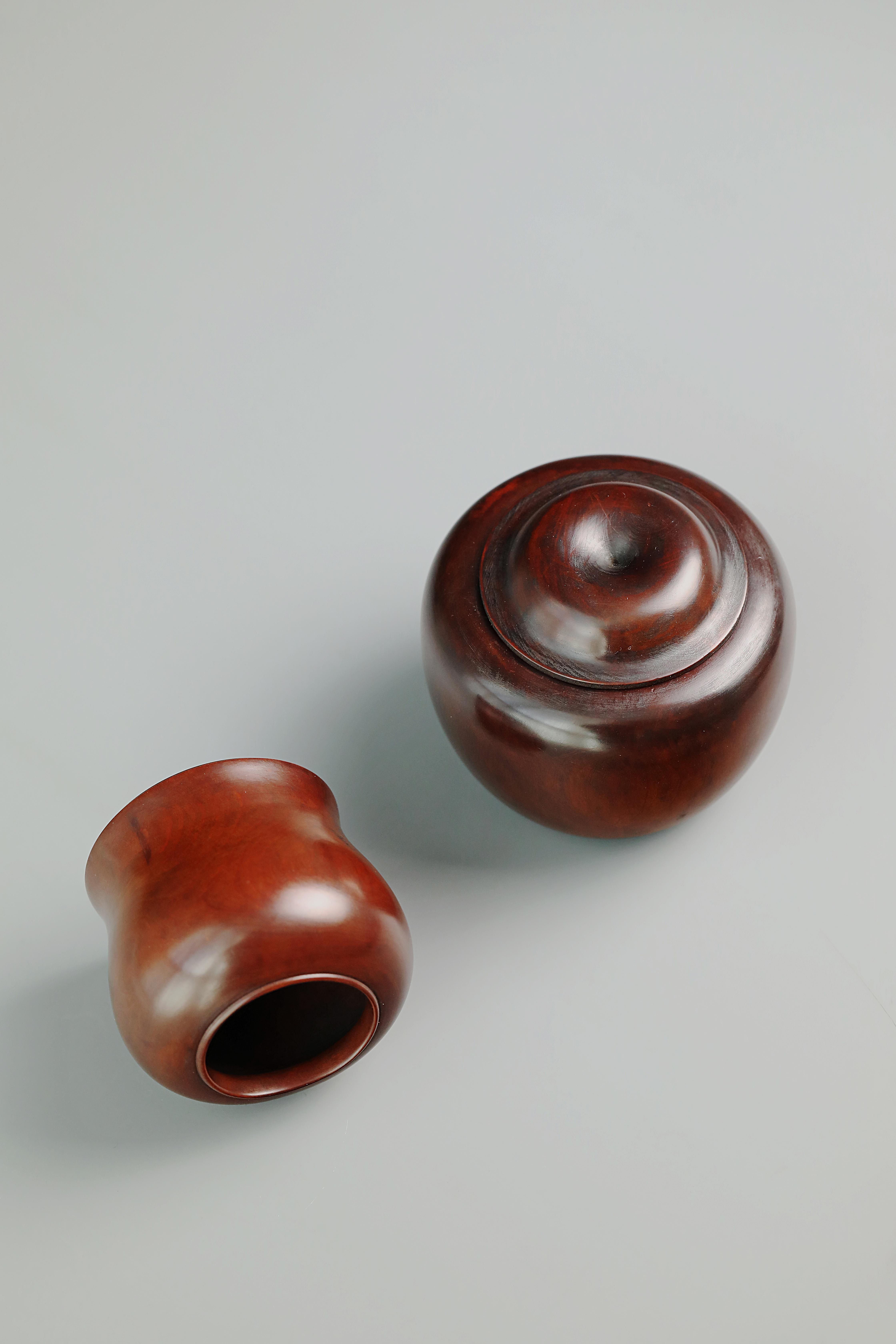 最大直径:9.5cm高:8.5cm最大直径:7.5cm高:6cm 文房雅韵水盂/茶罐 老黄杨木水盂钟铃之形,周身光素,小口微唇,丰肩弧腹,造型饱满圆润;带盖黄杨茶罐,皮壳红润,丰肩弧腹,底足内收,形制考究。
