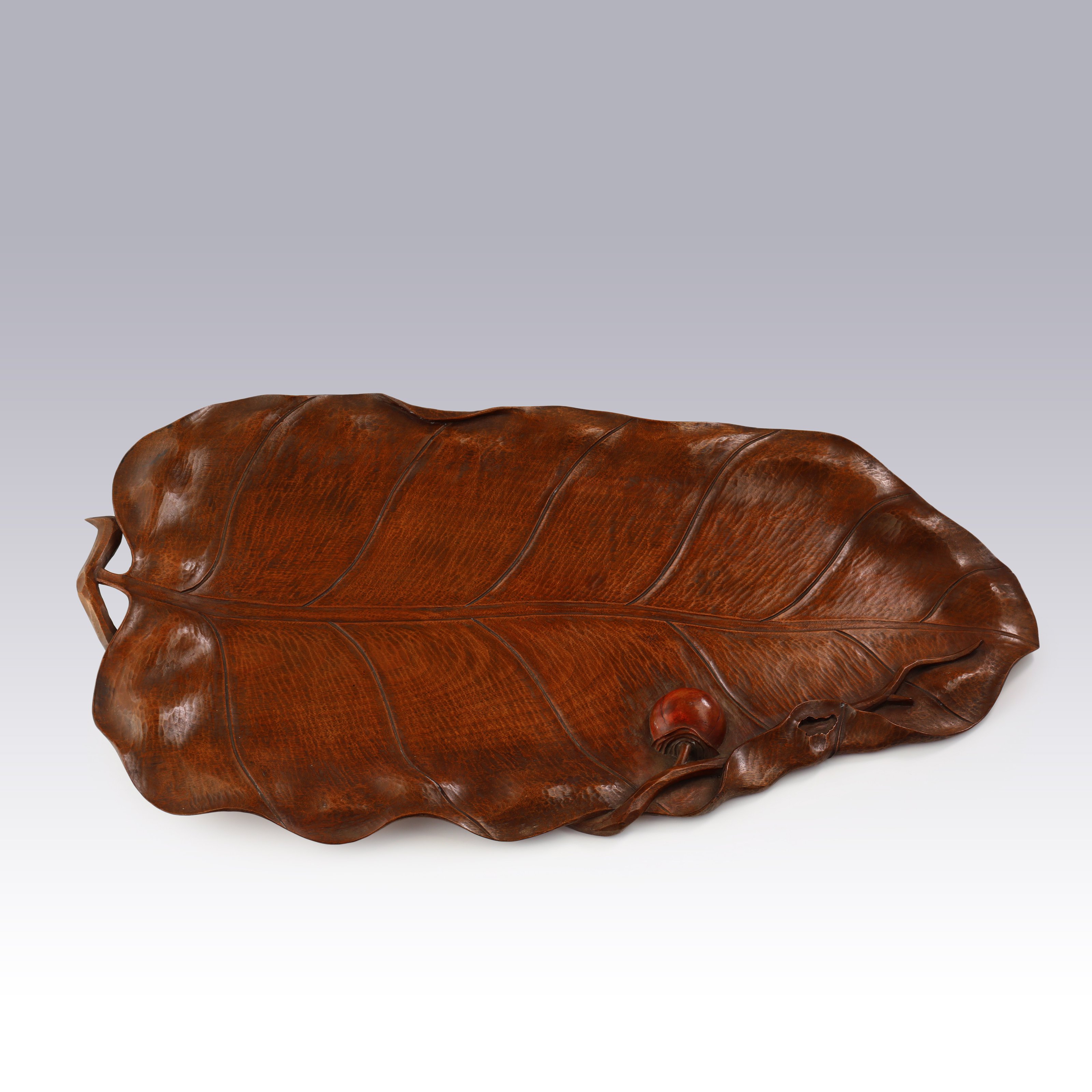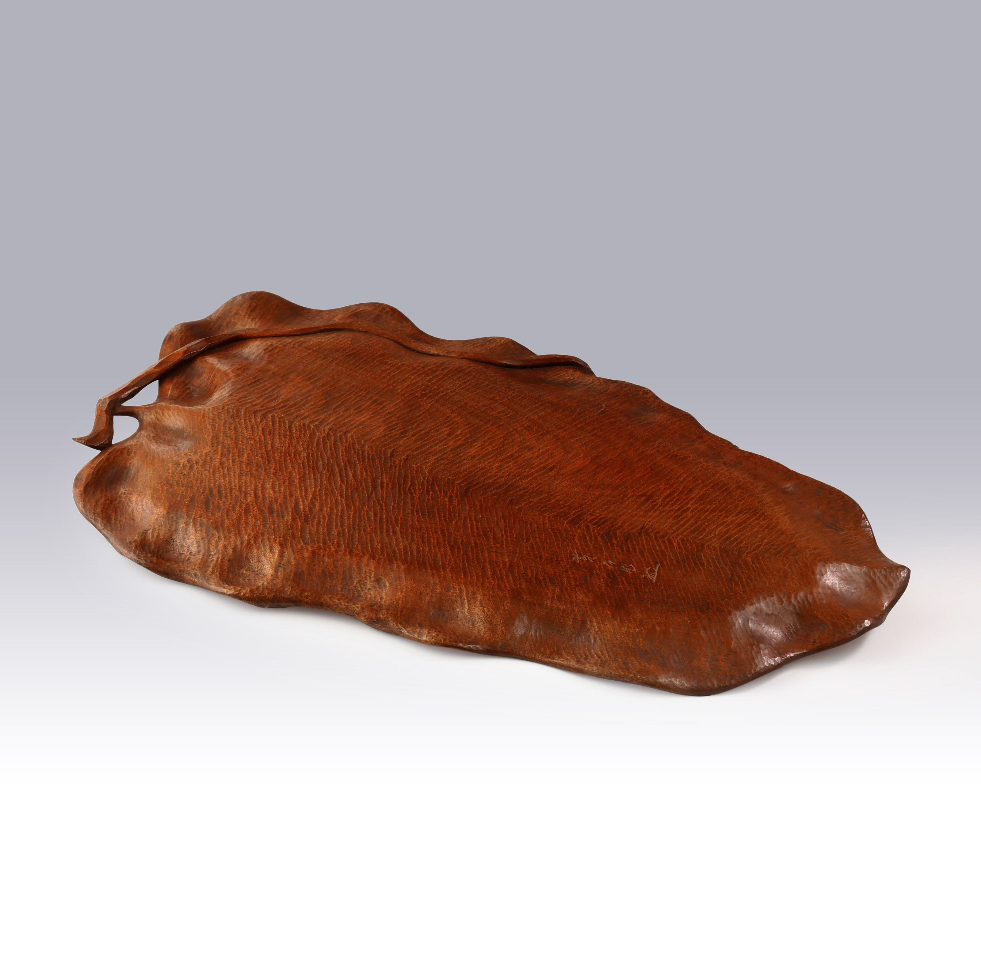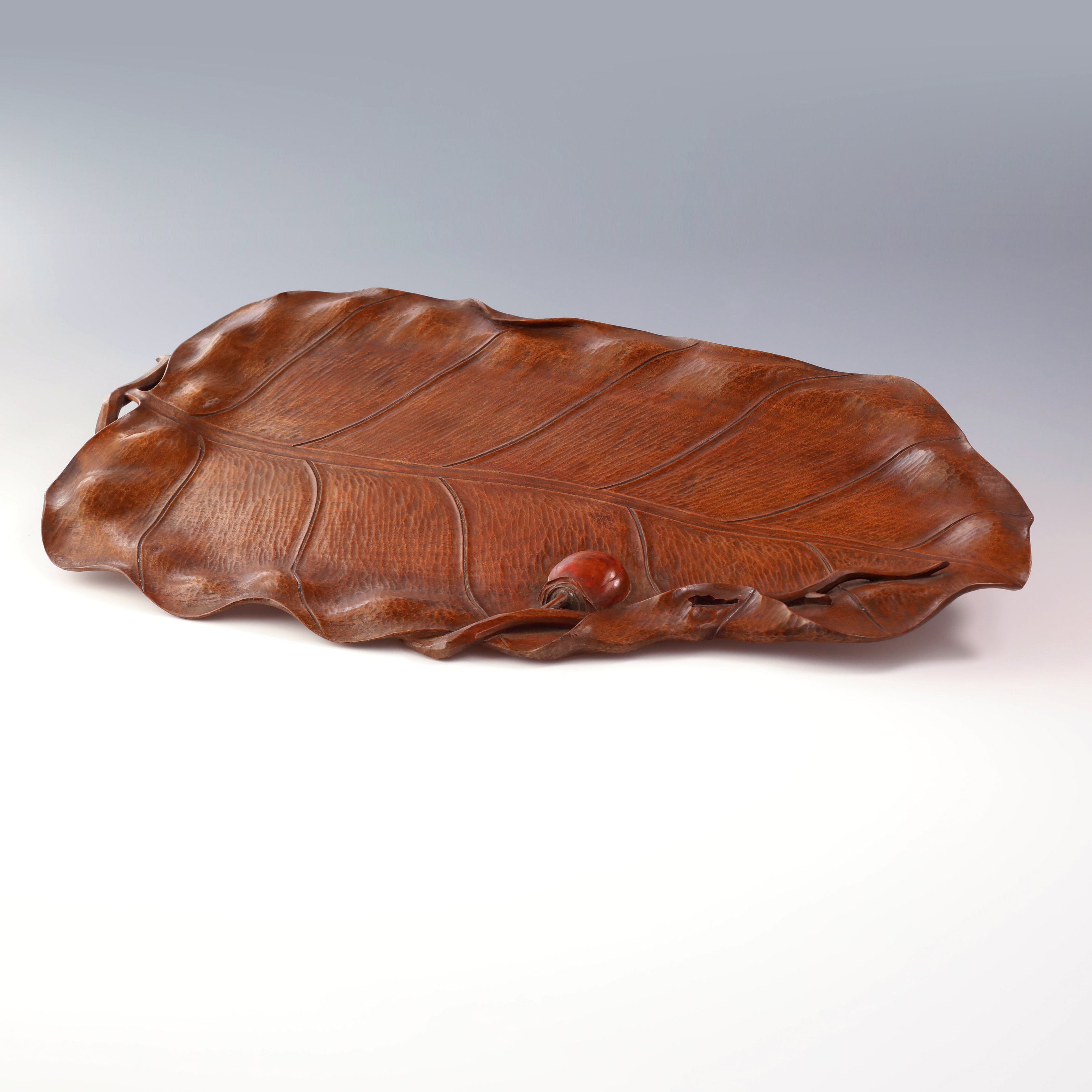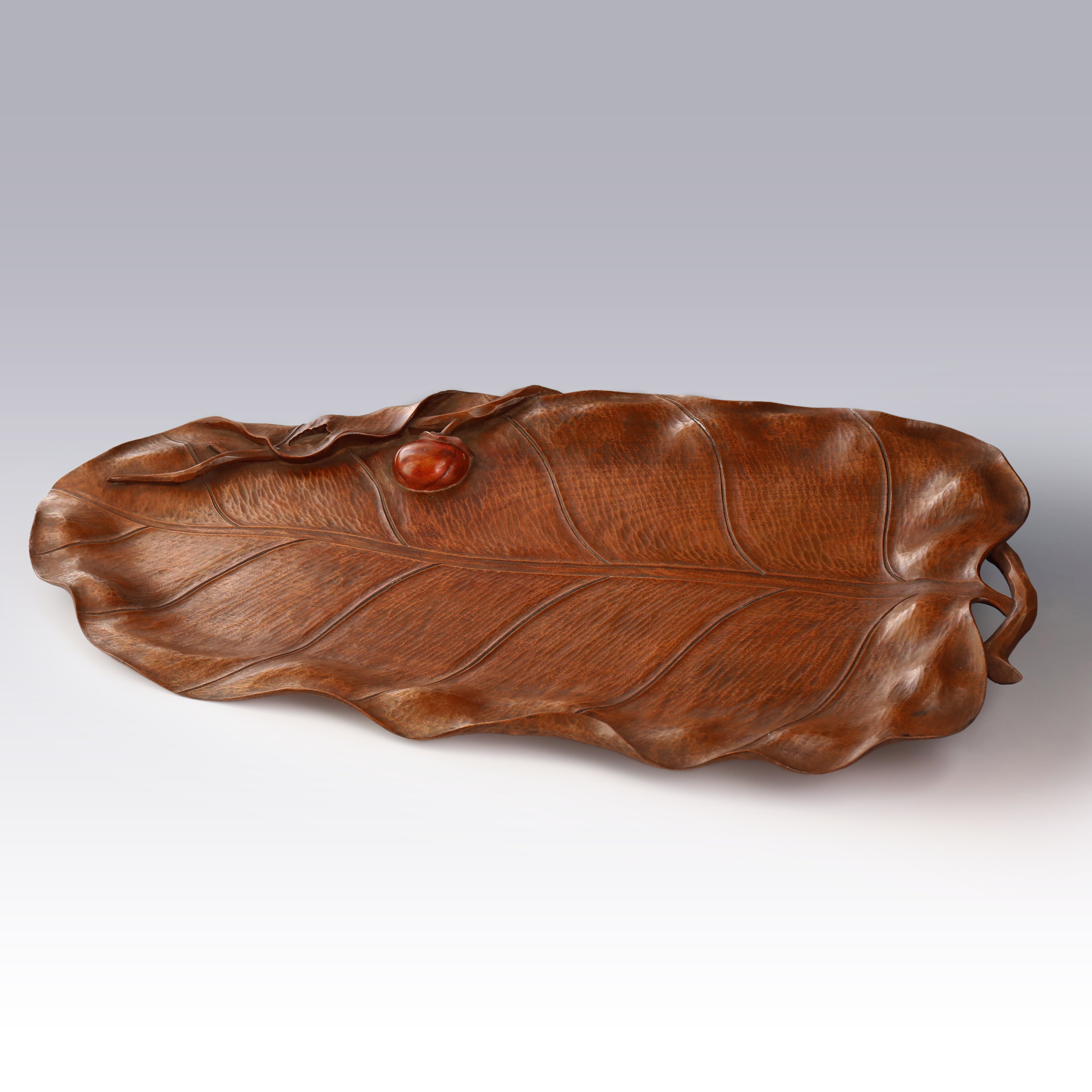 长:57cm,宽:30cm 整木雕蕉叶形茶盘 日本明治时期整木雕蕉叶形茶盘,以整木雕成,蕉叶形,木纹美观。造型生动,可见蕉叶筋脉,边缘叶子起伏形象,为象生一脉的作品。尤其一侧的秋果,分外可爱。整器包浆温润,色泽美好,置于茶台,增加自然之美。