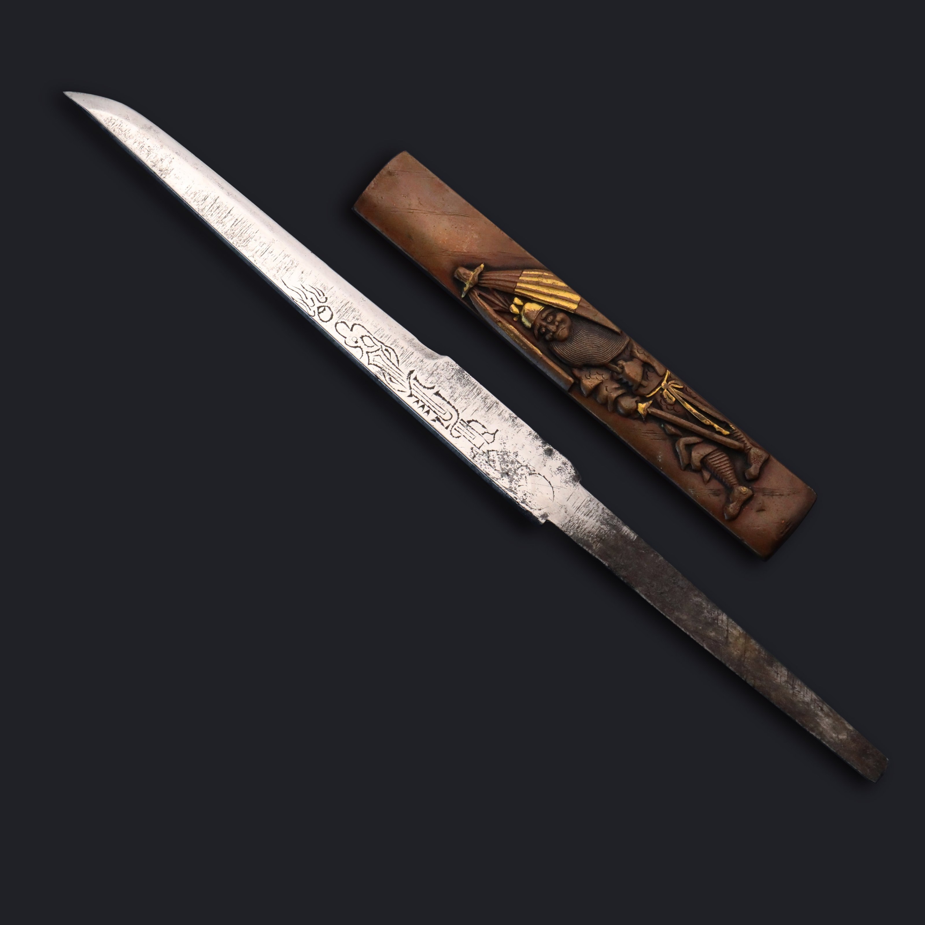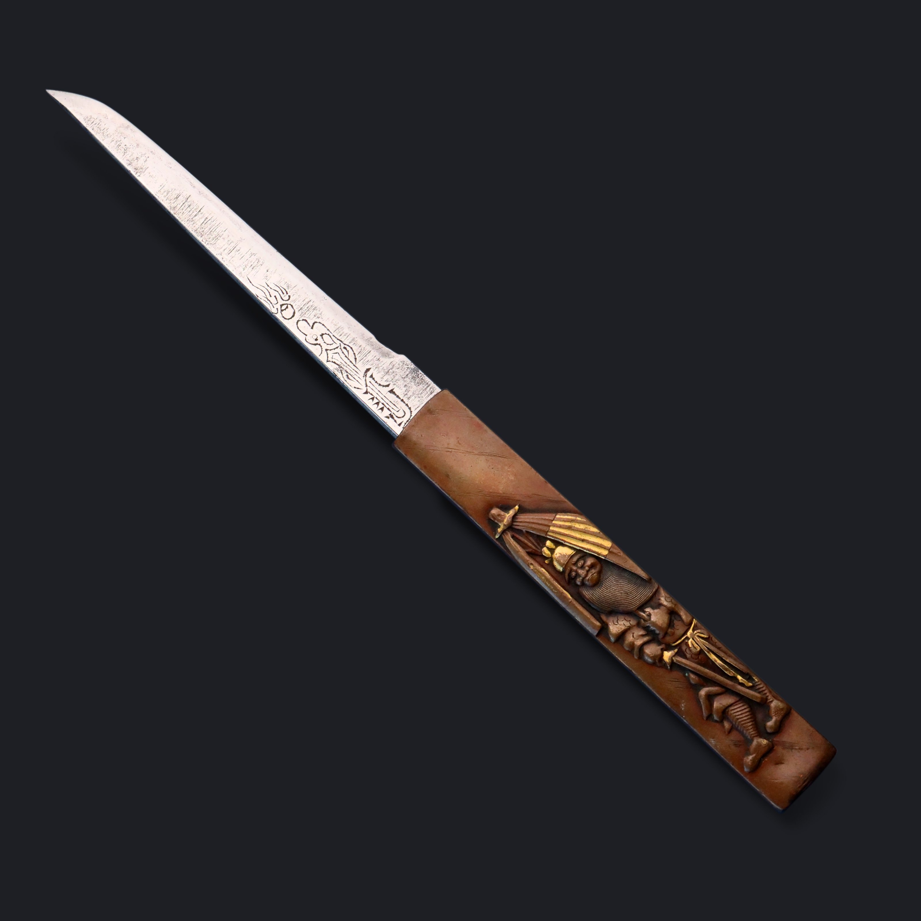 长:19cm,宽1.5㎝ 钟馗图小刀 钟馗寓意着驱邪避灾、保佑平安,象征着驱赶邪恶的正义感。金与紫铜镶嵌华美,日本金工之美举世罕见。刀与把为分体,与普通茶刀相比较,此件虽小小尺寸,触手则有寒气逼人的内在气韵。
