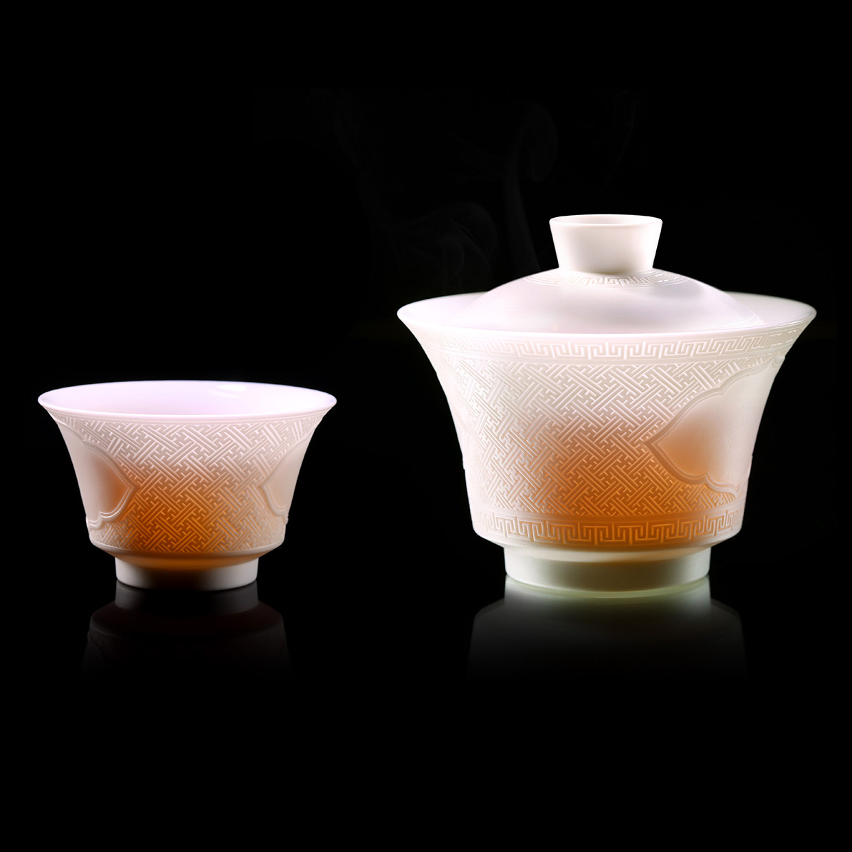 这只素瓷盖碗,周身满雕万字纹,与海棠纹饰相衬,象征满堂平安,寓意不凡。