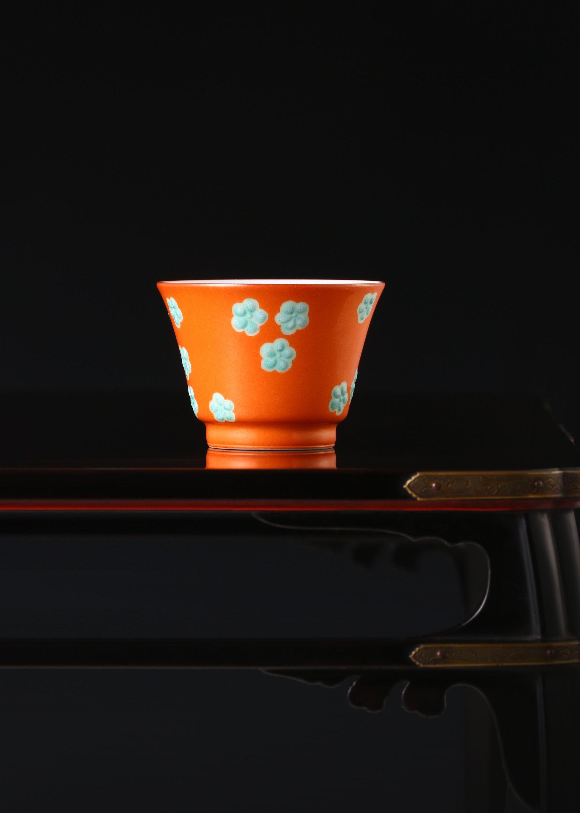 高:4.8cm 口直径:6.4cm 矾红青梅马蹄杯 矾红青梅马蹄杯 矾红青梅马蹄杯:温雅的珊瑚红映衬朵朵青梅,梅花中点出凸起浮雕一样的质感,釉面整洁,梅花点点,笔法挥洒。每只杯构图不拘一格。 矾红青梅马蹄杯